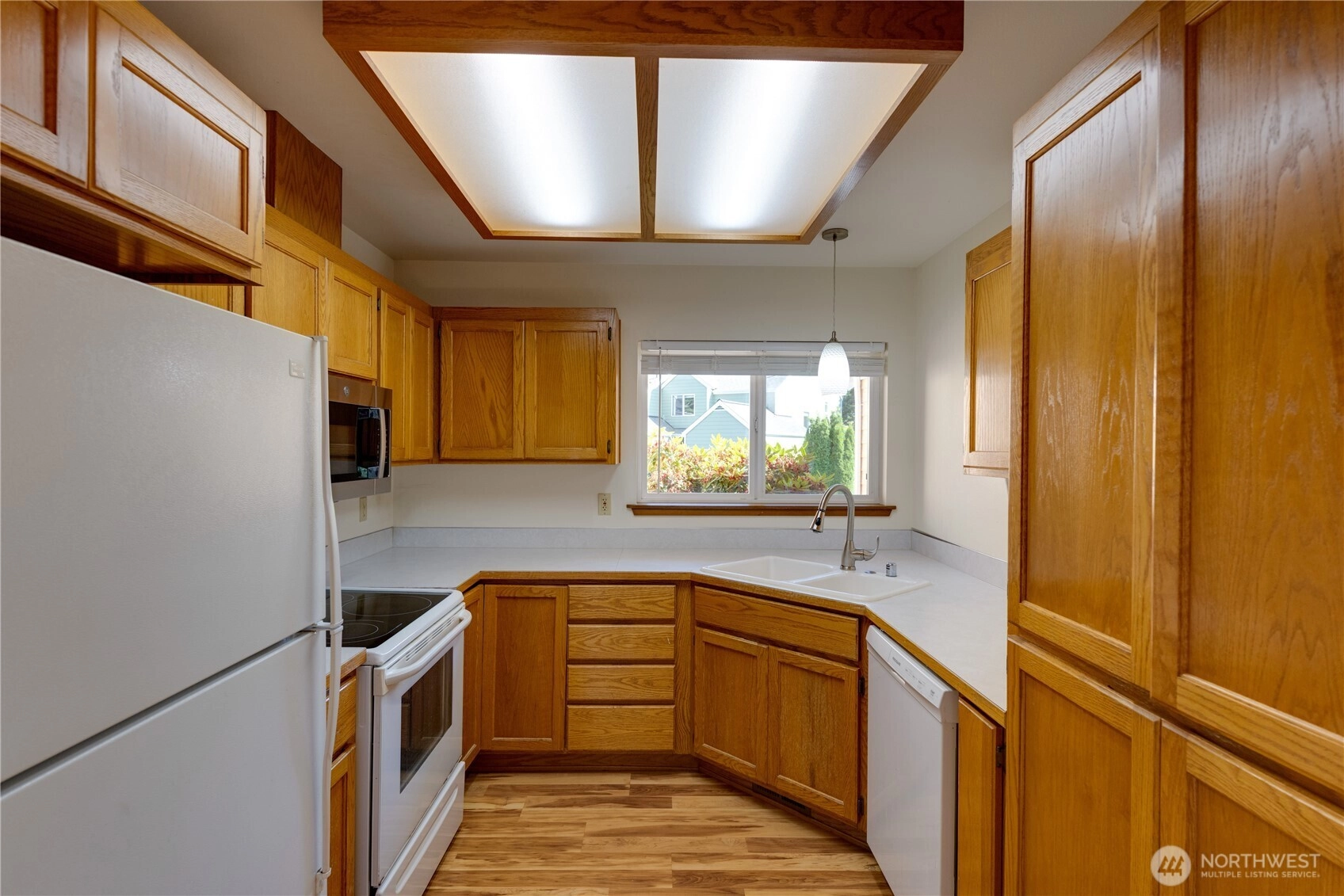 Well-maintained townhouse-style condo in the desirable Birch Tree community. This spacious home features an open-concept living and dining area with durable laminate flooring, a cozy gas fireplace, and access to a private back deck—ideal for relaxing or entertaining. The kitchen offers generous cabinet and counter space. Upstairs, the primary suite includes a full bath and walk-in closet. Attached garage and additional parking in front add convenience. Enjoy low-maintenance living in a quiet setting just minutes from NAS Whidbey, schools, shopping, and downtown Oak Harbor. Perfect for full-time living or a lock-and-leave lifestyle.