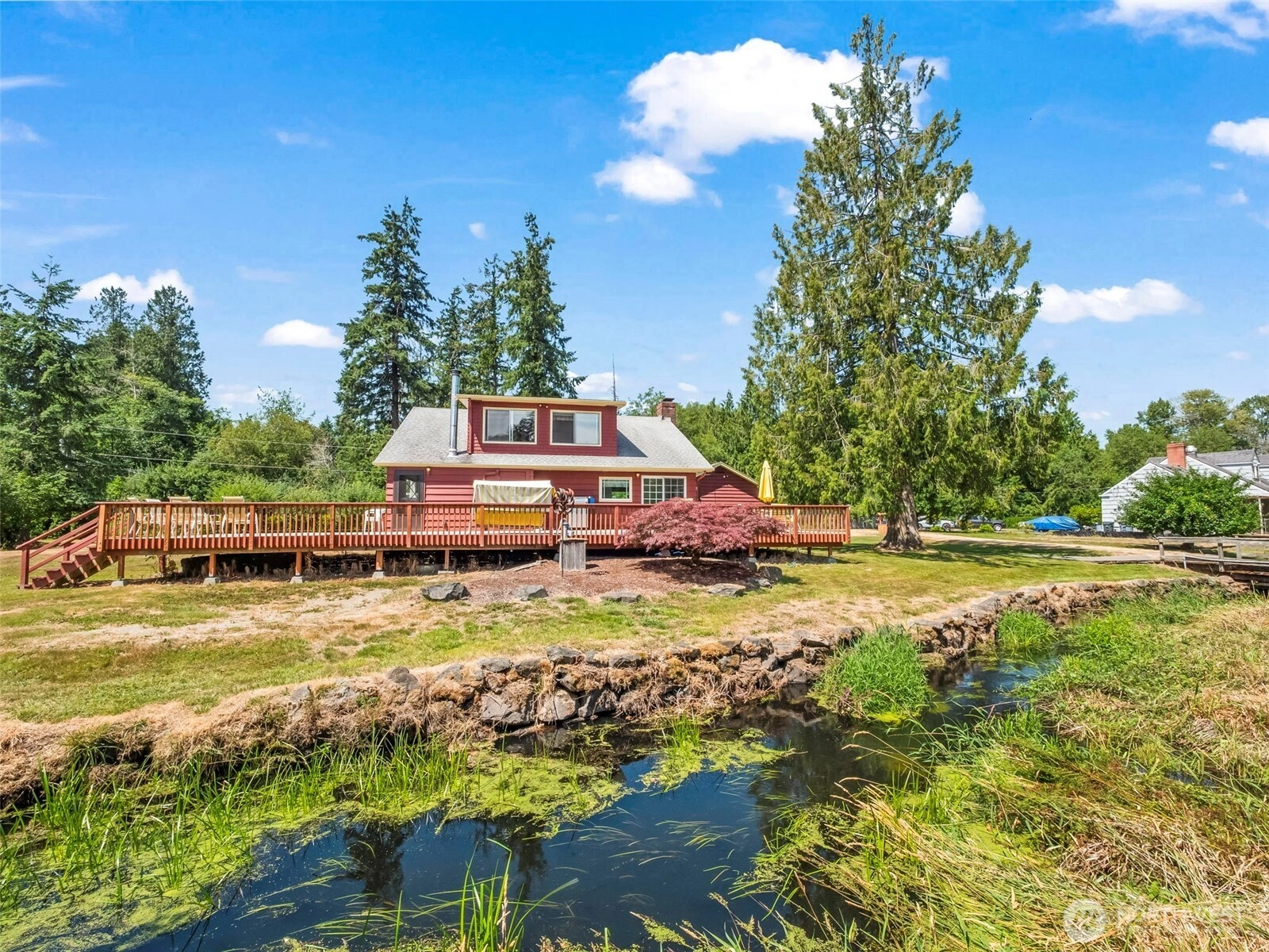 Discover a rare opportunity in the heart of University Place—a peaceful rural retreat with over 250 feet of creek frontage. Relax on the expansive deck as you enjoy the sights and sounds of nature. Inside, the cozy country kitchen offers lovely views, opening to a spacious living room with brick fireplace and a warm family room with a wood-burning stove. All bedrooms are generously sized with ample storage. A two-car garage includes a large attic, while a sizable barn across the creek offers space for hobbies—or even a horse or two. Enjoy your personal orchard, fruit trees, and multiple garden areas. A one-of-a-kind property with easy access to shopping, transportation and entertainment. Rural, peaceful and beautiful.