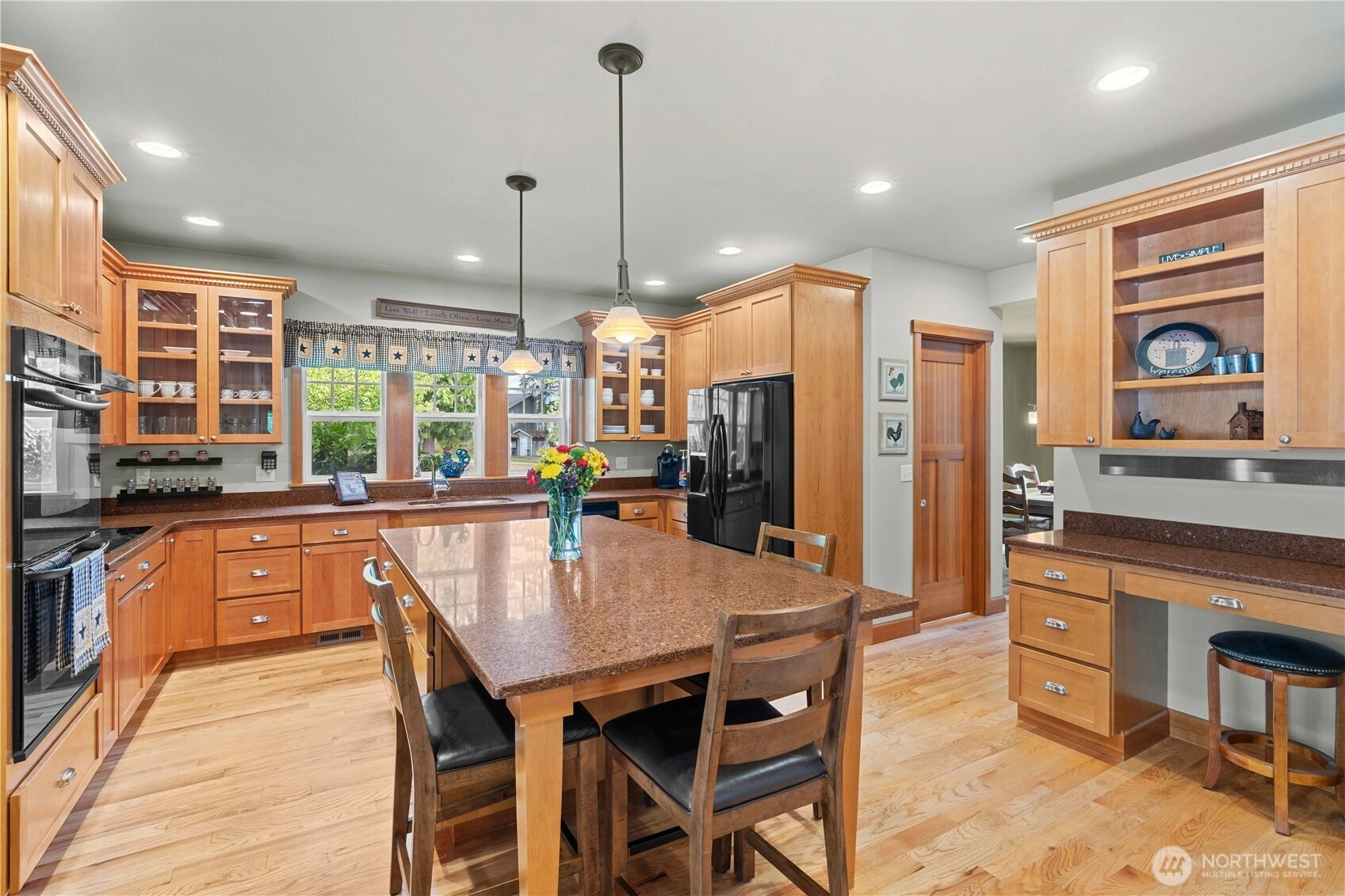 Luxury country living just 20 minutes from Bonney Lake or Enumclaw! This stunning Craftsman home offers an open floor plan with hardwood floors, solid wood doors, wainscoting, crown molding, and wrought iron details. Chef's kitchen features an oversized island, flowing into a bright dining area and generous living room with a wood-burning fireplace. Enjoy a perfect work from home den on the main floor. The elegant primary suite includes a spa-like bath. Set on 5 private acres that are flat and usable with plenty of space for bonfires or wildlife watching from the back patio. Enjoy elk, deer and eagles in your own yard. And can we talk about the 2000 square foot shop? Enjoy 12 foot high ceilings, unfinished loft 13.6' by 22X3', 4 roll up garage doors, 2 man doors, auto lift, plenty of outlets for power tools, and air compressor lines throughout. Bring your air compressor. Work benches, cabinets and shelving as well. Also featuring covered RV Parking  13' w x 40' L and 15'3" H clearance and covered 12' x 40' off the back of the garage for wood/tractor/mower etc. Even wired for a back up generator and NO RTA tax! The back patio under the trees is charming and overlooks the back of the property inviting you to sit and relax. Covered front porch with a soothing waterfall feature is welcoming and overlooks the entire front yard. This is elegance, privacy, and space at its best!