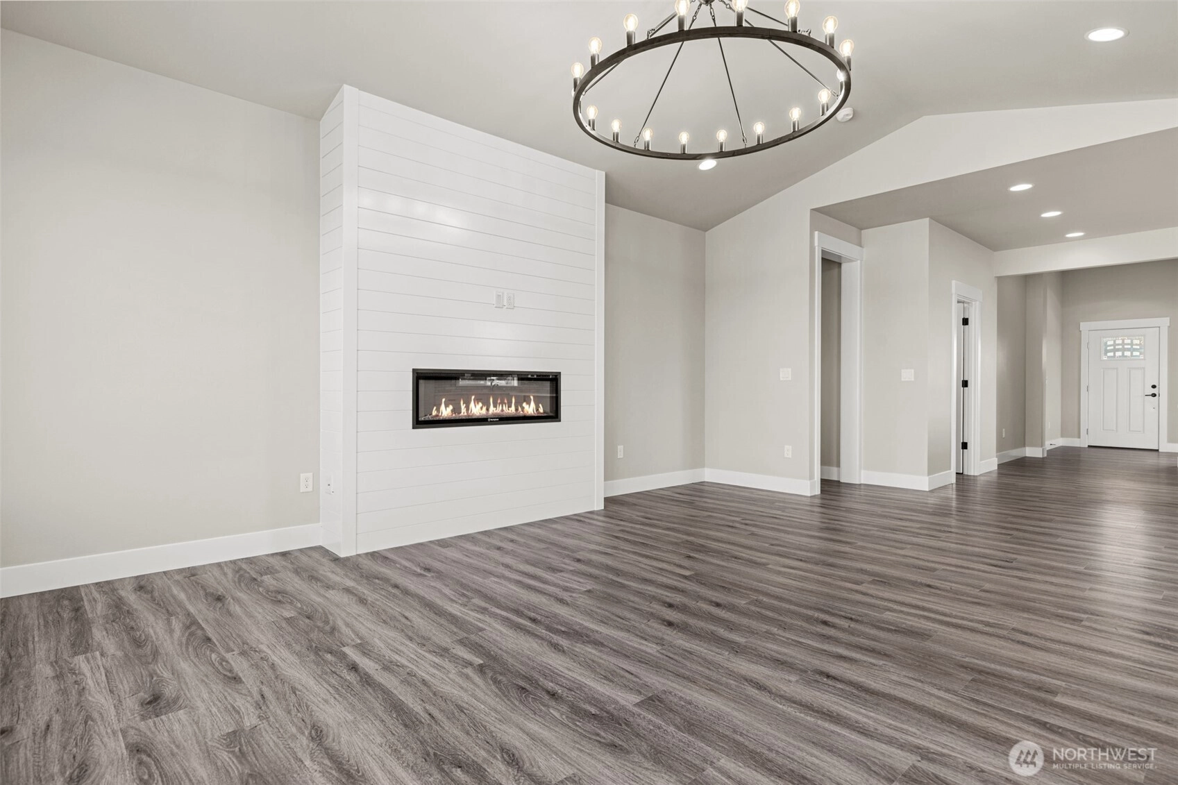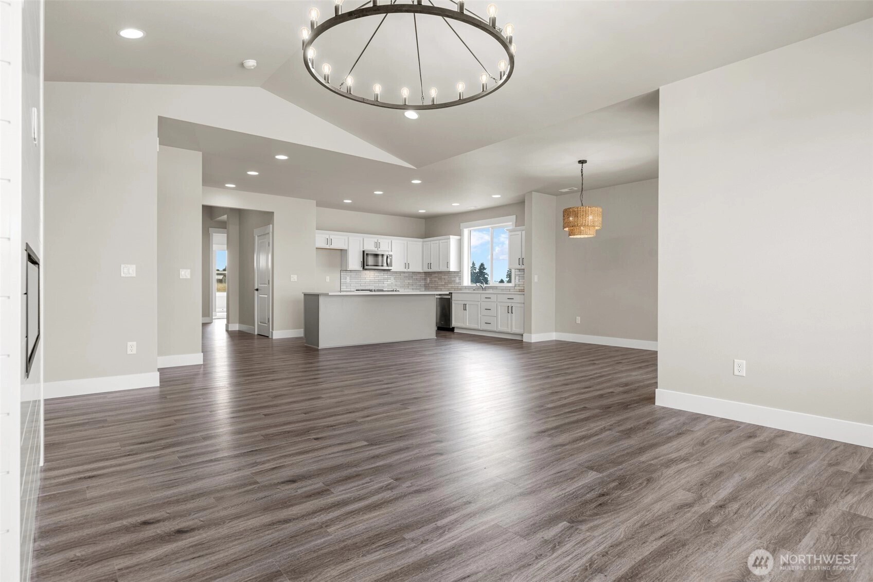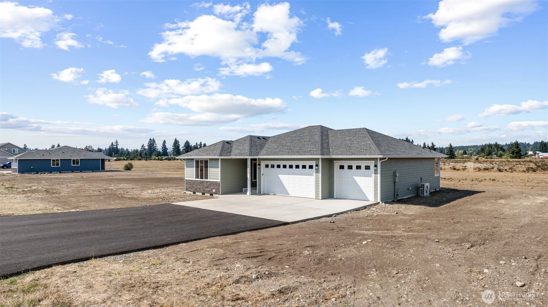 Brand new rambler on nearly 5 acres— MOVE IN READY! This open-concept home features vaulted ceilings, durable LVP flooring, and a sleek linear fireplace. The chef’s kitchen offers quartz countertops, stainless appliances, a spacious island, ample cabinetry, and a walk-in pantry. Dining area opens to a covered outdoor living space. French doors lead to a luxurious primary suite with a 5-piece bath, oversized tile shower, soaking tub, and walk-in closet. Complete with a 3-car fully insulated garage, energy-efficient heat pump with A/C, and high-end finishes throughout—perfect for entertaining, working from home, or simply relaxing.