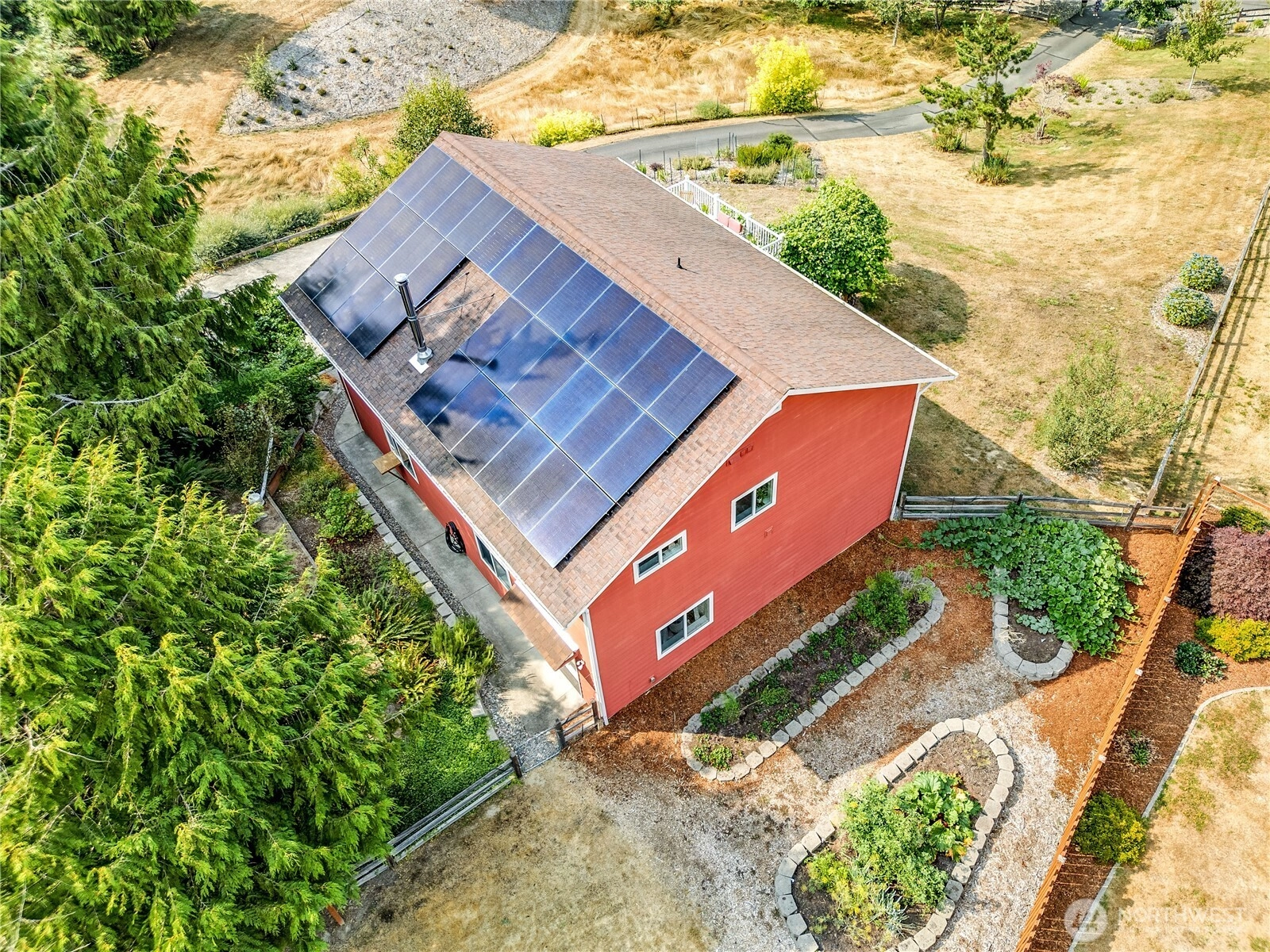 Enter Natures Garden with beautiful Olympic Mtn view from picture windows or upper deck. Self-sustainable designed Solar panel system, car charger. Large windows open up the living, dining, and kitchen area with its vaulted ceiling. Free standing wood fireplace, water resistant luxury vinyl plank flooring, plush carpet. Primary bedrm with walk in closest, full bathrm. Another full bath and guest/office space. Two more bedrms, half bath and family room on lower floor. Take a hike on this 4.32 acres to the south part of the property where you will find the perfect location, to sit/camp and enjoy the sounds of the creek, surrounded by nature. A little orchard, herb garden, fenced garden and the chicken coop for the self-sustainable scheme.