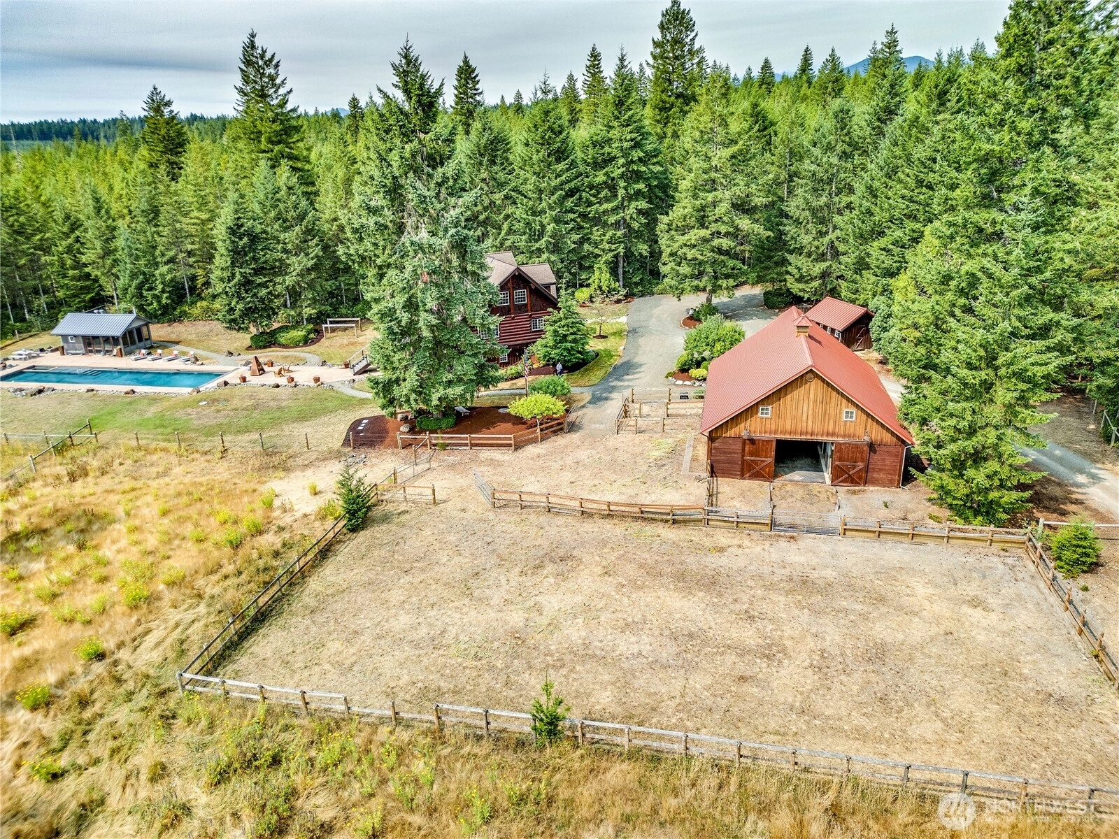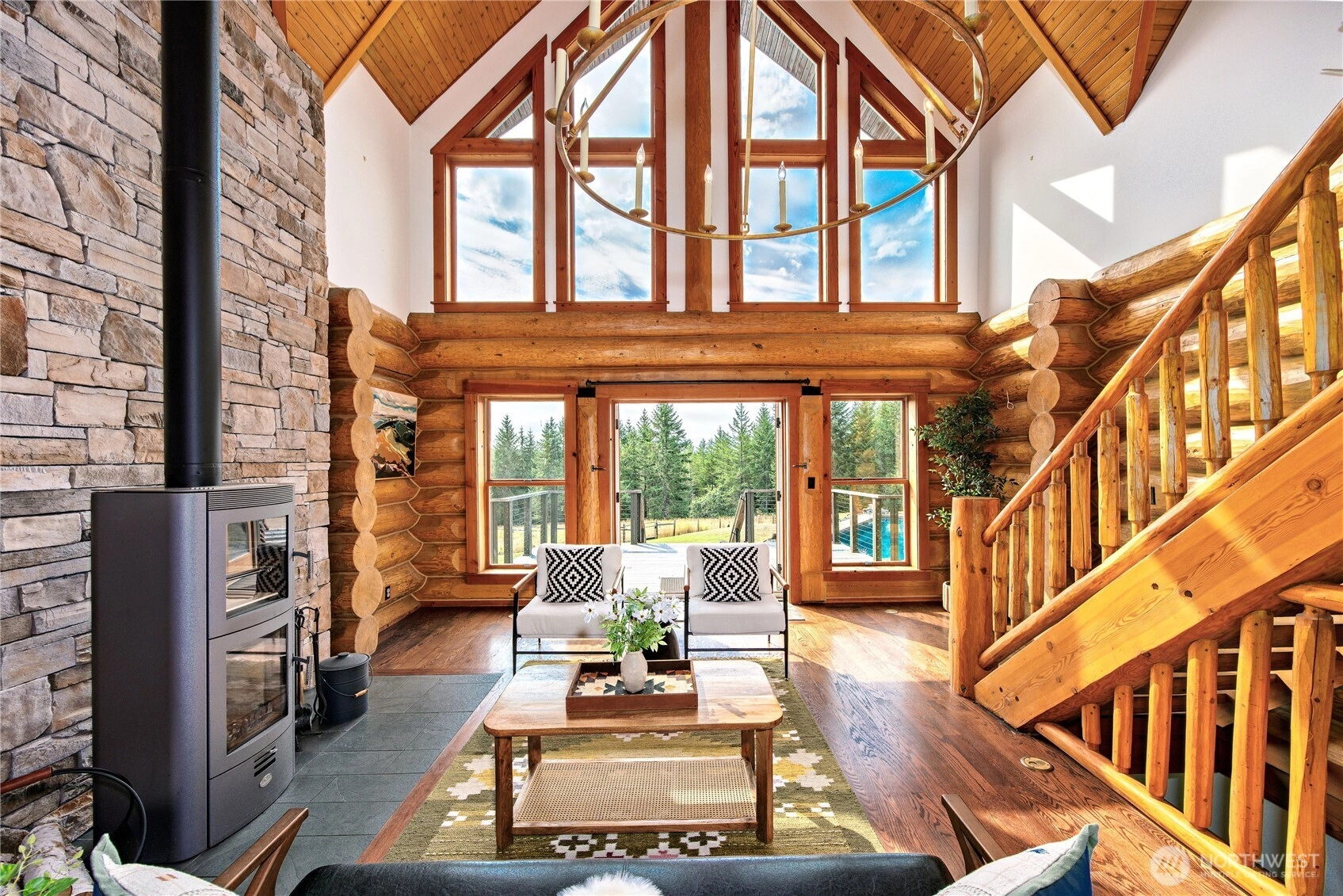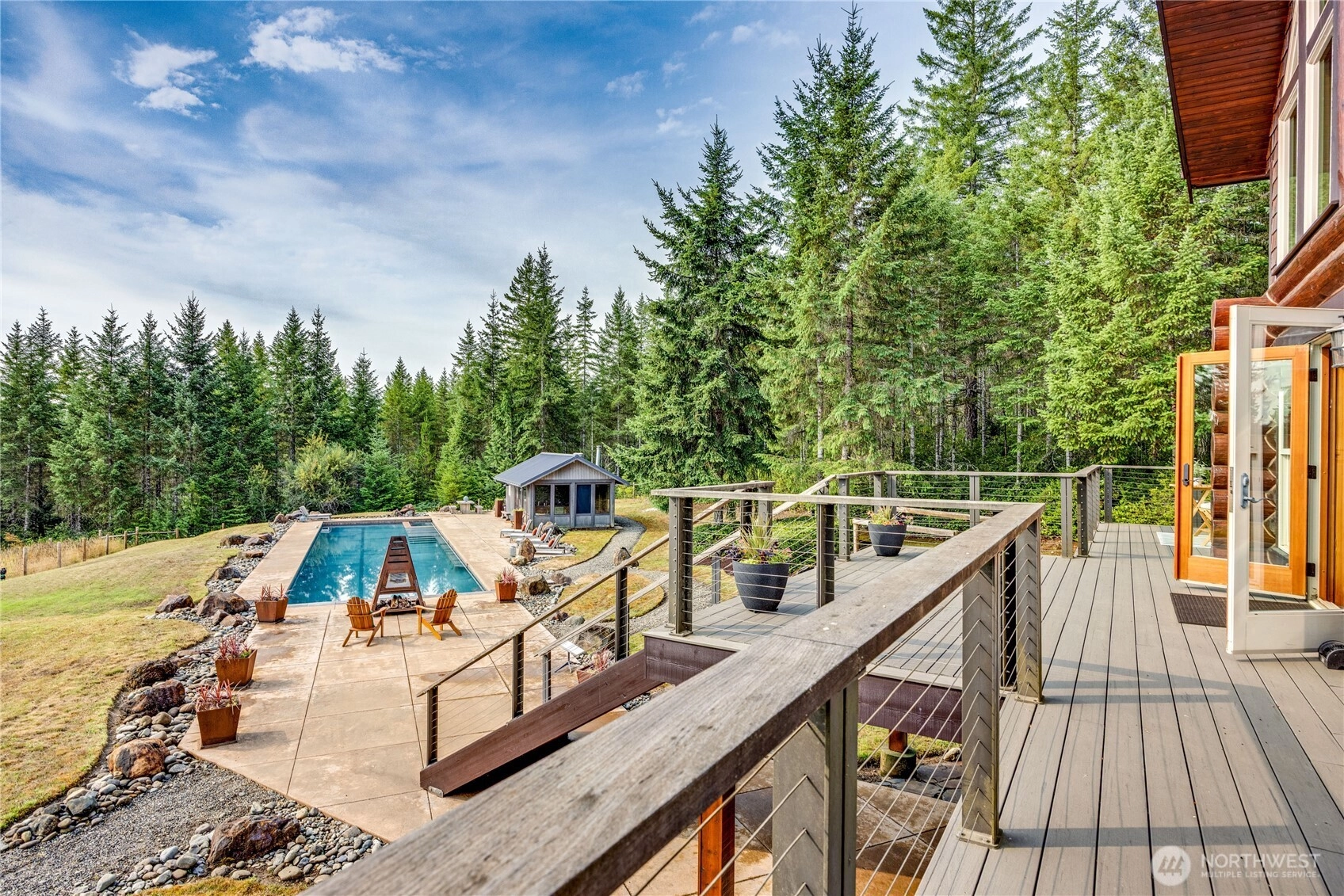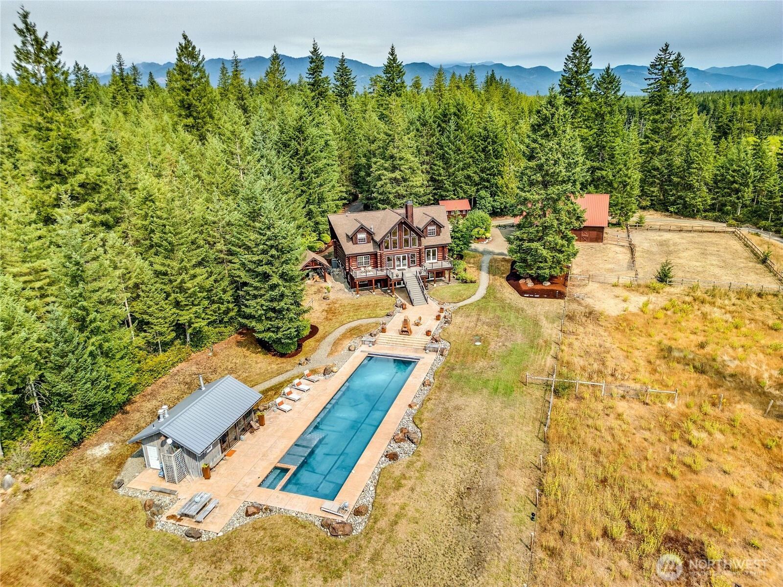 Discover breathtaking Northwest living on this peaceful and private, 19-acre estate. Custom craftsmanship and rustic elegance blend seamlessly in the stunning log home, with wood, slate, stone, and tile finishes. Soaring ceilings and walls of windows flood the home with natural light and sweeping views. The great room opens to a gourmet kitchen featuring SS appliances, Viking range, and a walk-in pantry with Viking standing freezer. The dining area and great room both feature French doors that open to an expansive deck overlooking your heated saltwater pool & spa, and charming pool house. A stately six-stall barn opens to fenced pastures. Enjoy the scenic drive and leave the stress of the big city behind. Your personal retreat awaits!