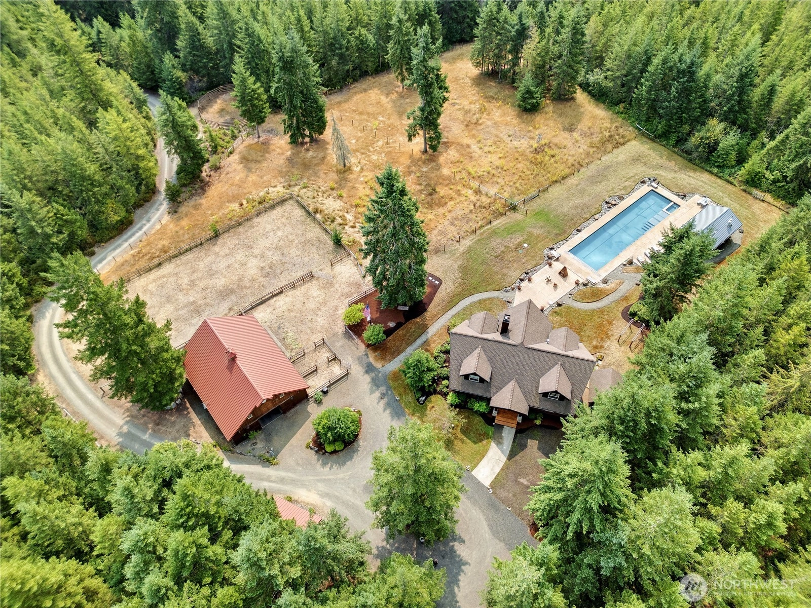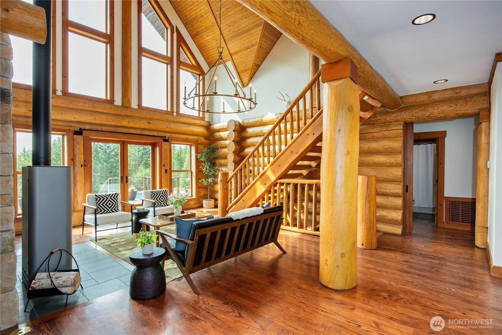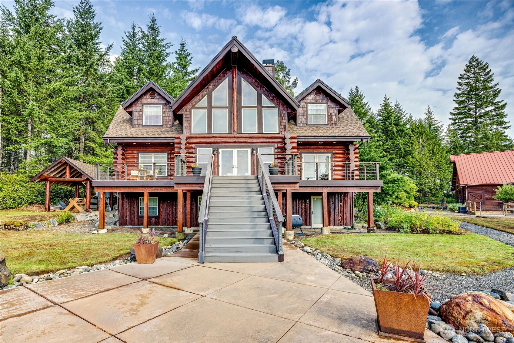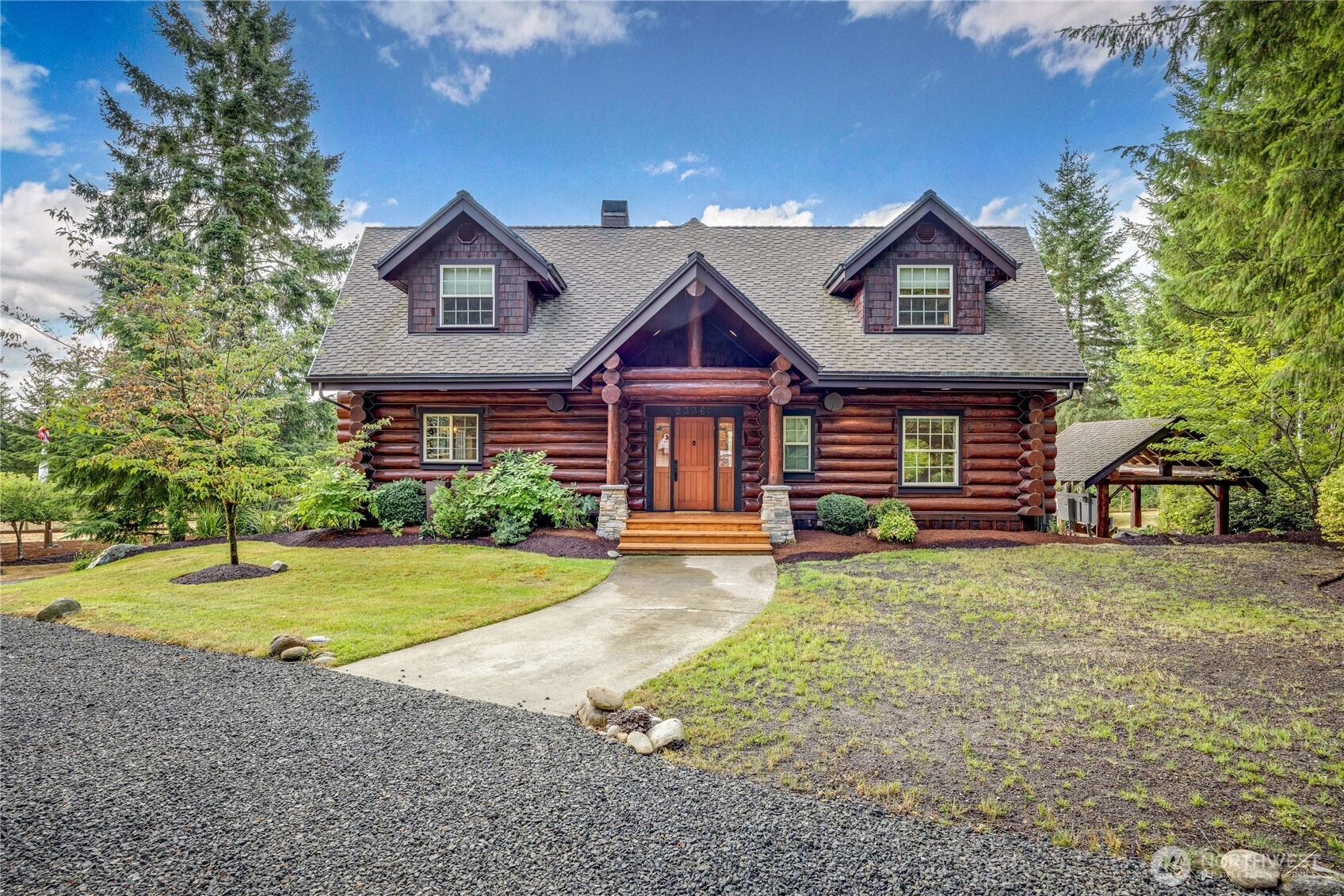 Discover breathtaking Northwest living on this peaceful and private, 19-acre estate. Custom craftsmanship and rustic elegance blend seamlessly in the stunning log home, with wood, slate, stone, and tile finishes. Soaring ceilings and walls of windows flood the home with natural light and sweeping views. The great room opens to a gourmet kitchen featuring SS appliances, Viking range, and a walk-in pantry with Viking standing freezer. The dining area and great room both feature French doors that open to an expansive deck overlooking your heated saltwater pool & spa, and charming pool house. A stately six-stall barn opens to fenced pastures. Enjoy the scenic drive and leave the stress of the big city behind. Your personal retreat awaits!