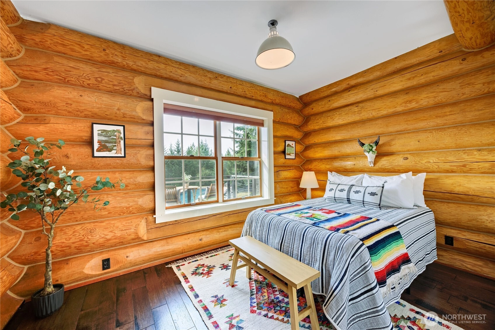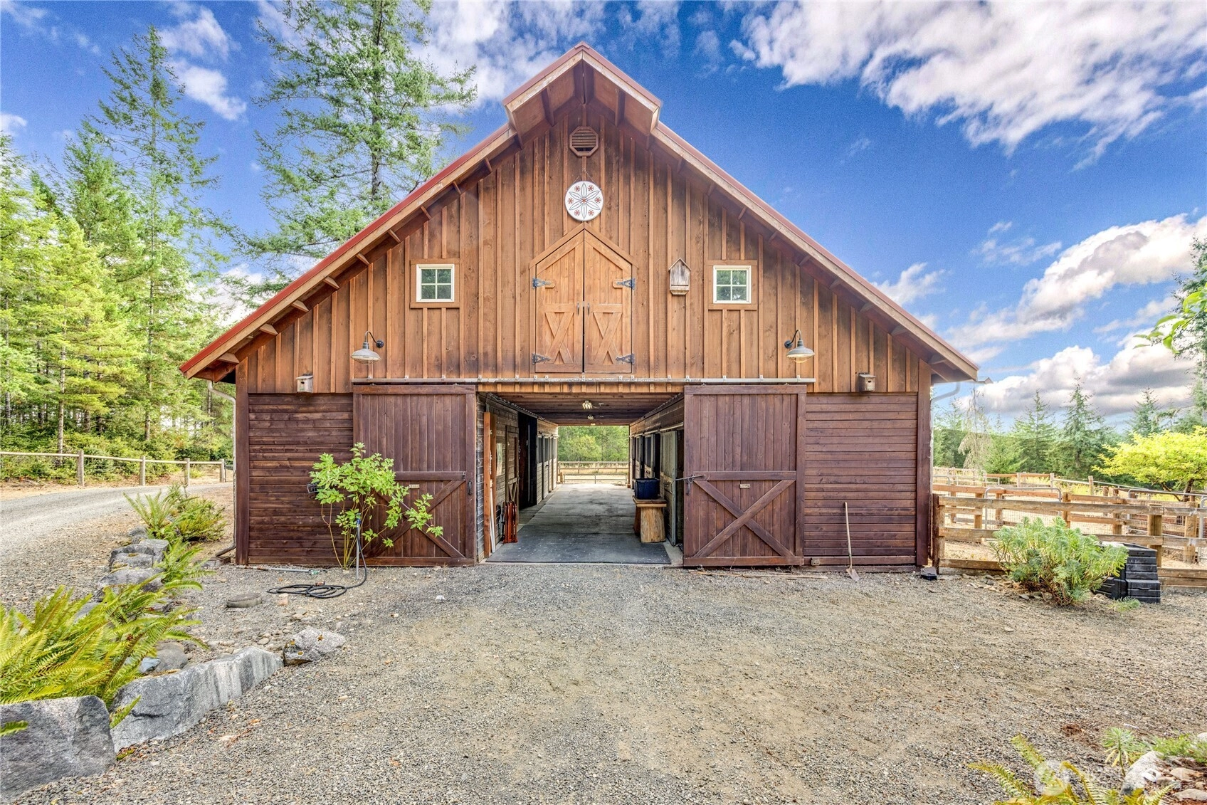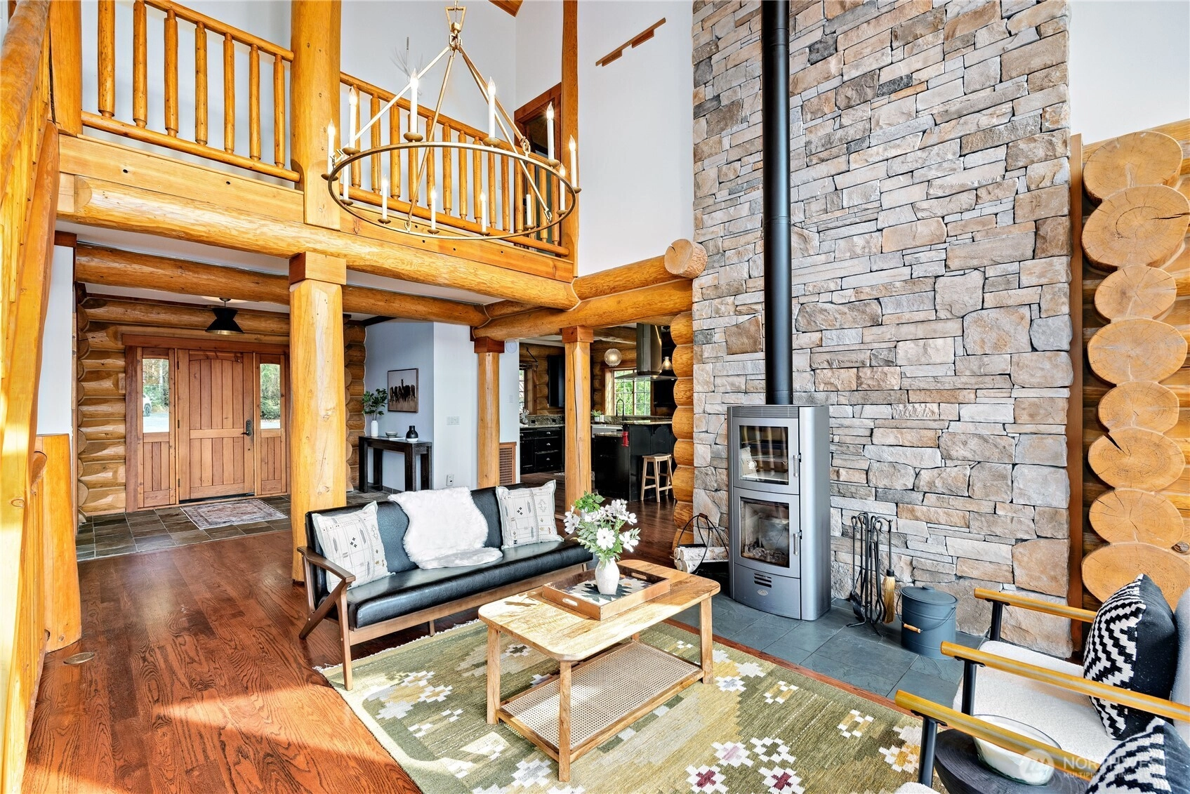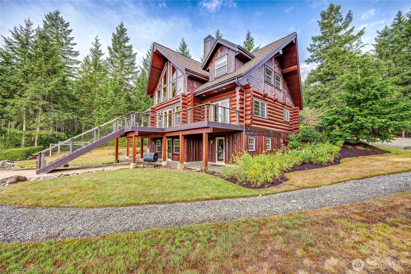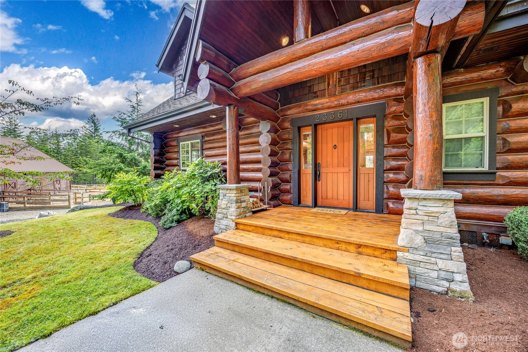 Discover breathtaking Northwest living on this peaceful and private, 19-acre estate. Custom craftsmanship and rustic elegance blend seamlessly in the stunning log home, with wood, slate, stone, and tile finishes. Soaring ceilings and walls of windows flood the home with natural light and sweeping views. The great room opens to a gourmet kitchen featuring SS appliances, Viking range, and a walk-in pantry with Viking standing freezer. The dining area and great room both feature French doors that open to an expansive deck overlooking your heated saltwater pool & spa, and charming pool house. A stately six-stall barn opens to fenced pastures. Enjoy the scenic drive and leave the stress of the big city behind. Your personal retreat awaits!