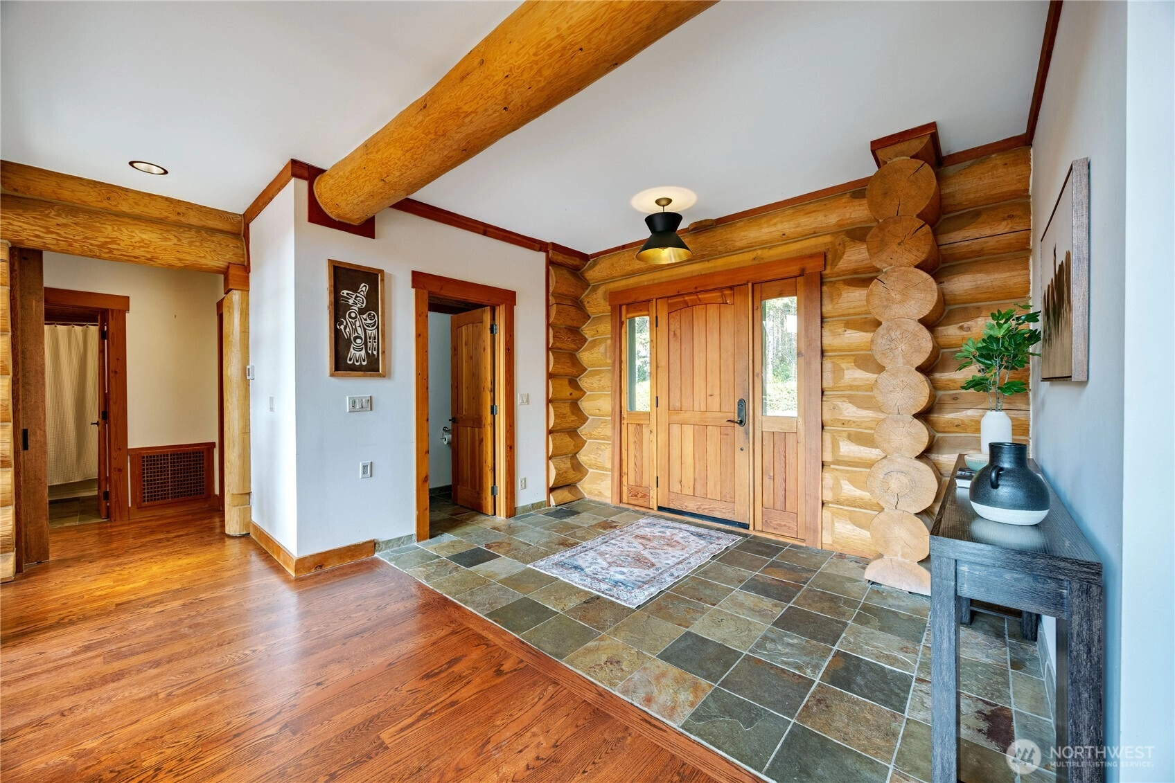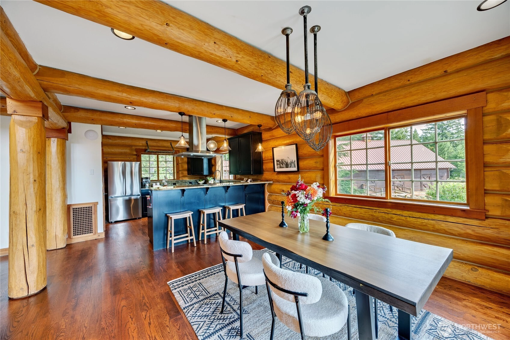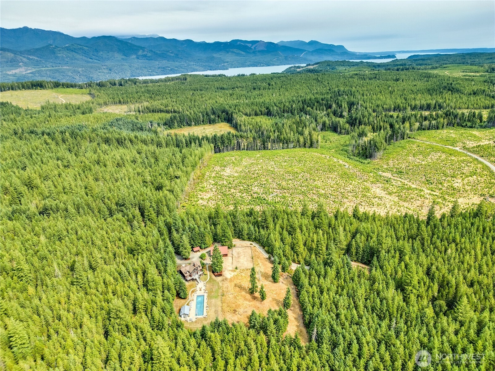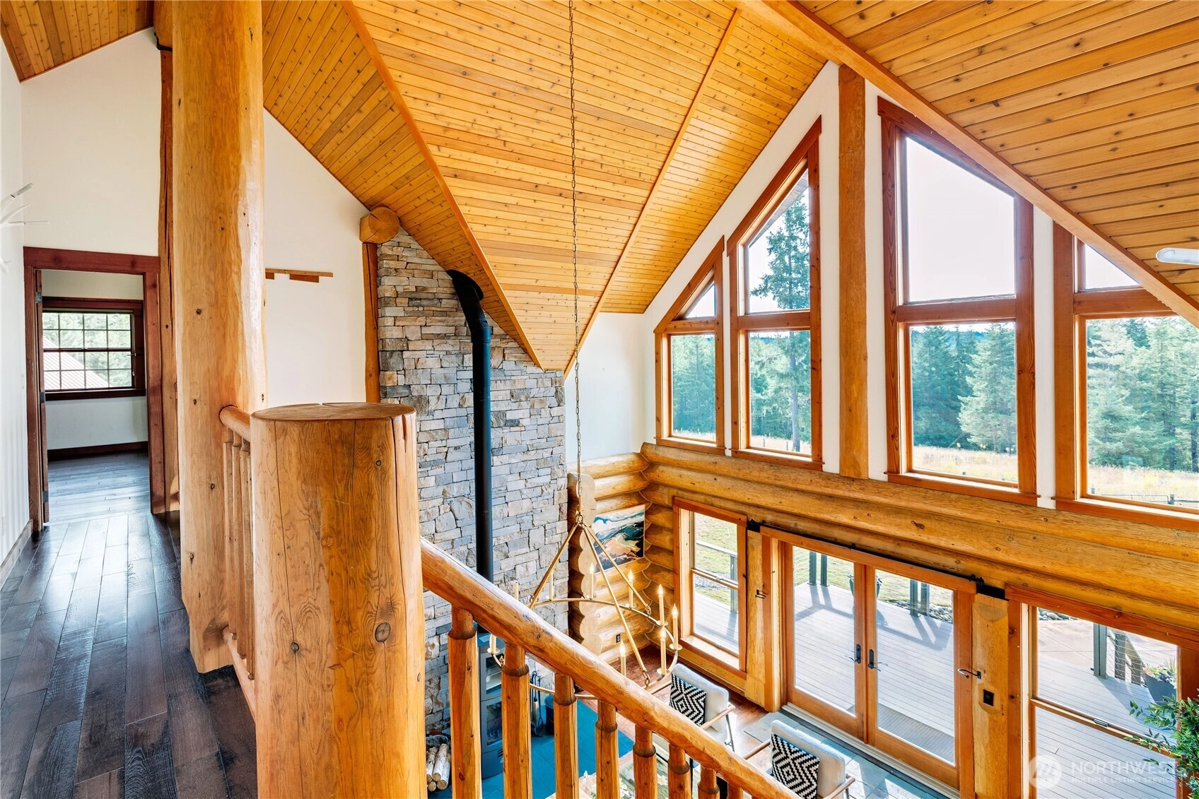Discover breathtaking Northwest living on this peaceful and private, 19-acre estate. Custom craftsmanship and rustic elegance blend seamlessly in the stunning log home, with wood, slate, stone, and tile finishes. Soaring ceilings and walls of windows flood the home with natural light and sweeping views. The great room opens to a gourmet kitchen featuring SS appliances, Viking range, and a walk-in pantry with Viking standing freezer. The dining area and great room both feature French doors that open to an expansive deck overlooking your heated saltwater pool & spa, and charming pool house. A stately six-stall barn opens to fenced pastures. Enjoy the scenic drive and leave the stress of the big city behind. Your personal retreat awaits!