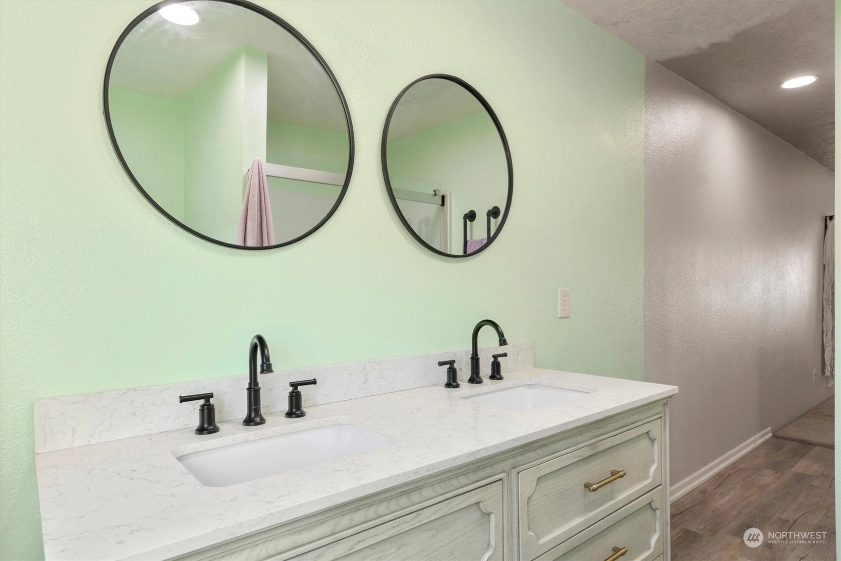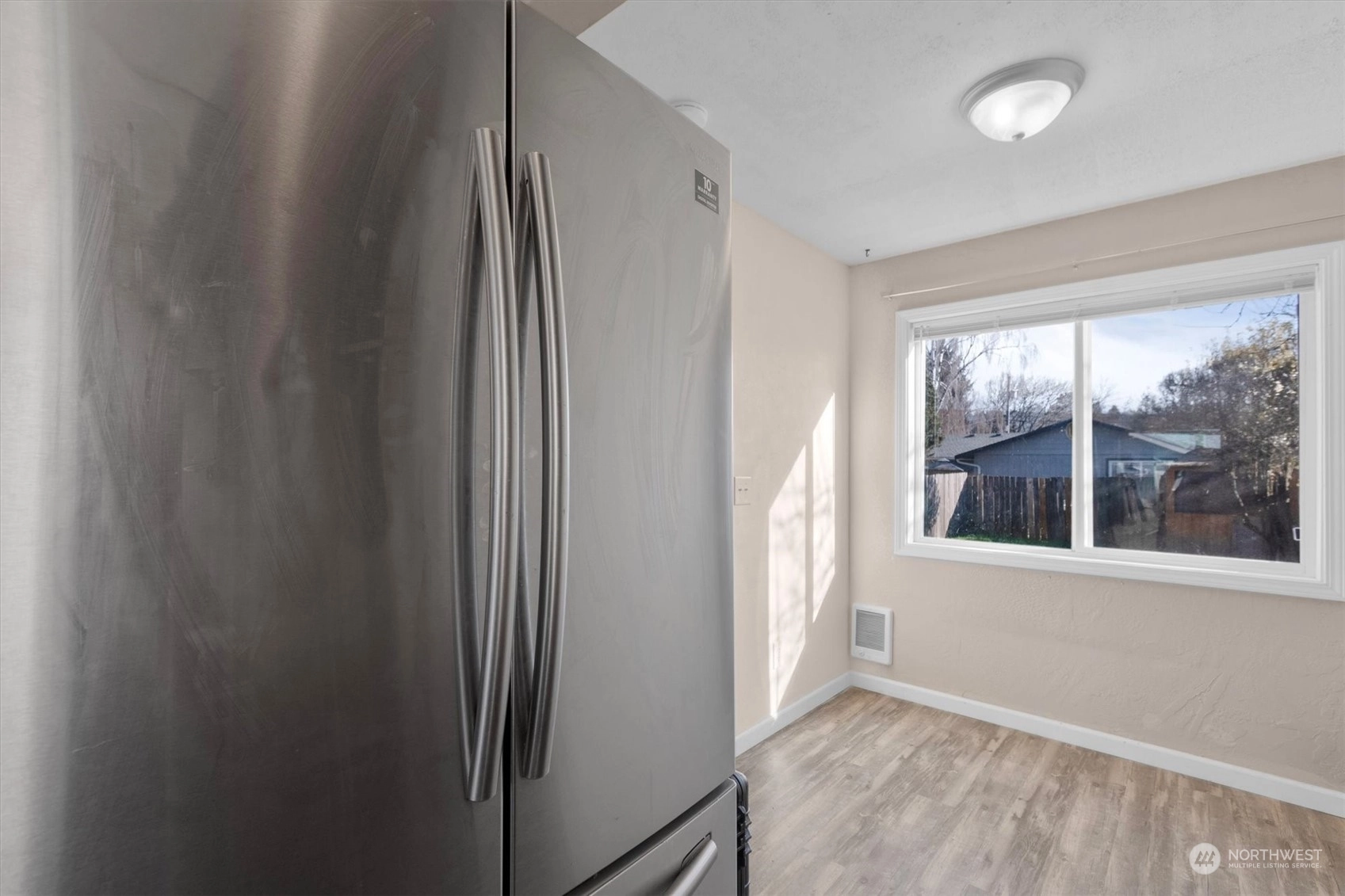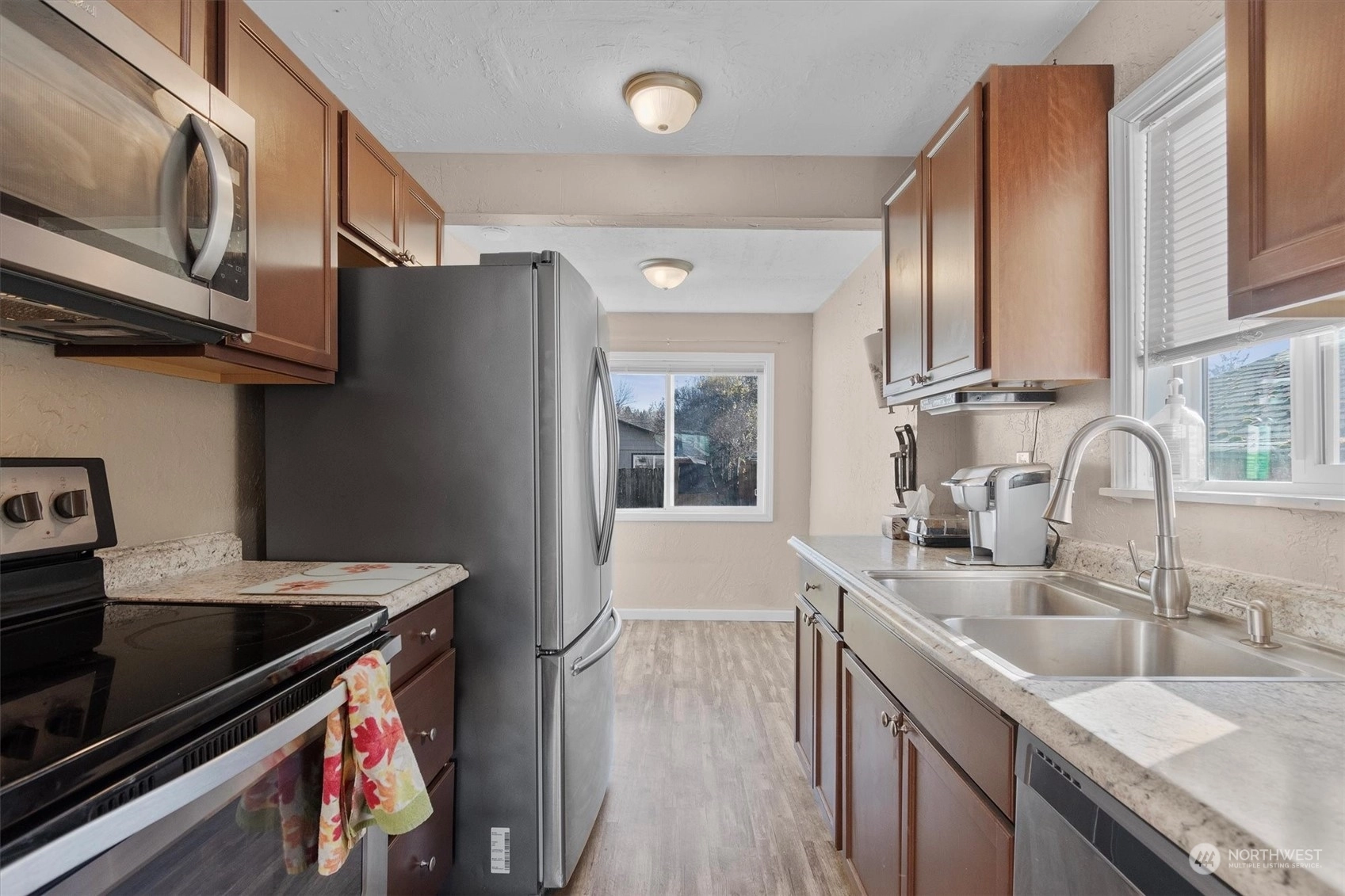 This updated 4-bedroom home features an extra-large detached garage. It includes double-pane storm windows, updated cabinets, countertops, doors, flooring, and fixtures, along with an added bathroom and closet in the main bedroom. The large driveway provides ample space for RV parking. The low-maintenance yard has a separate fenced area behind the garage. This home offers plenty of space and is conveniently located near shopping and Interstate 5.