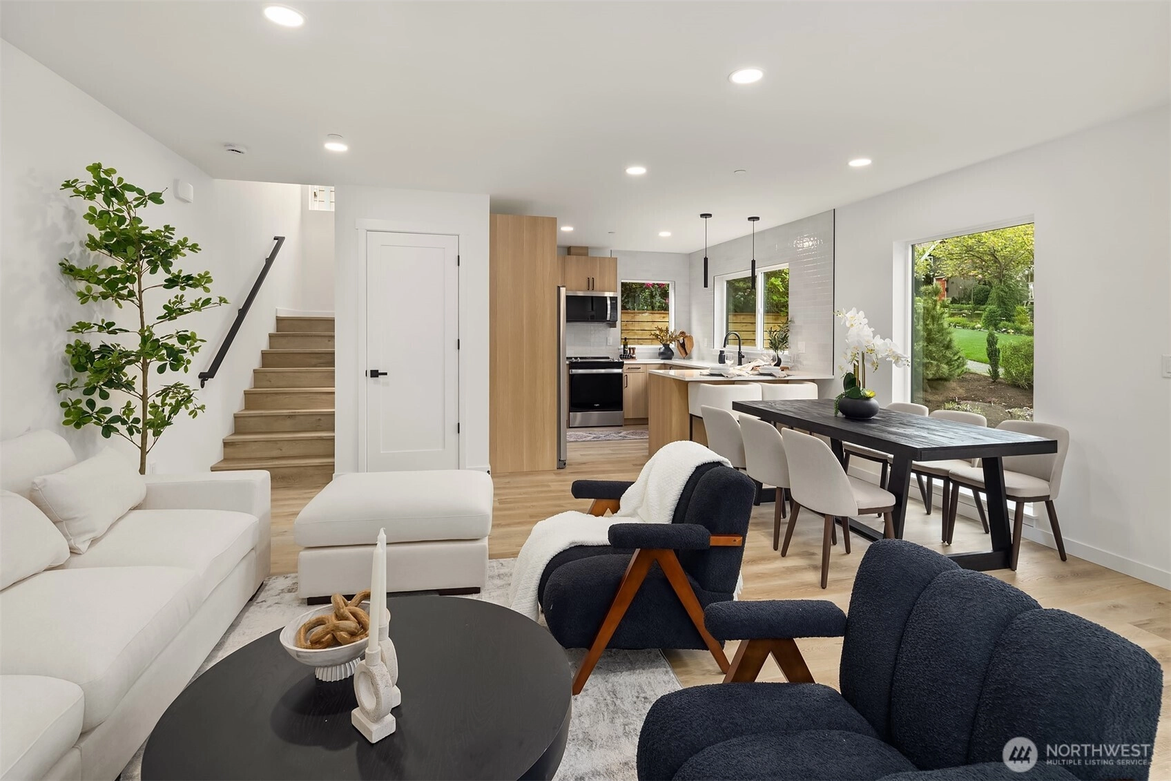 From United Seattle, a furnished new construction Ballard home near the Brewery District. Main floor hosts your functional kitchen with complete appliance package & quartz counters, plus room for dedicated dining. Easy flow into living room for entertaining, complemented by powder room, ideal for guests. Second floor includes two spacious bedrooms with walk-in closets plus full bath + laundry. Your penthouse primary suite offers spacious bath and walk-in closet. Roof deck provides low maintenance outdoor space with expansive Olympics, Lake WA Ship canal & city views of Queen Anne. Ample mini splits throughout for zoned comfort. Conveniently located near the many amenities downtown Ballard and Phinney Ridge. Assigned off-street parking.