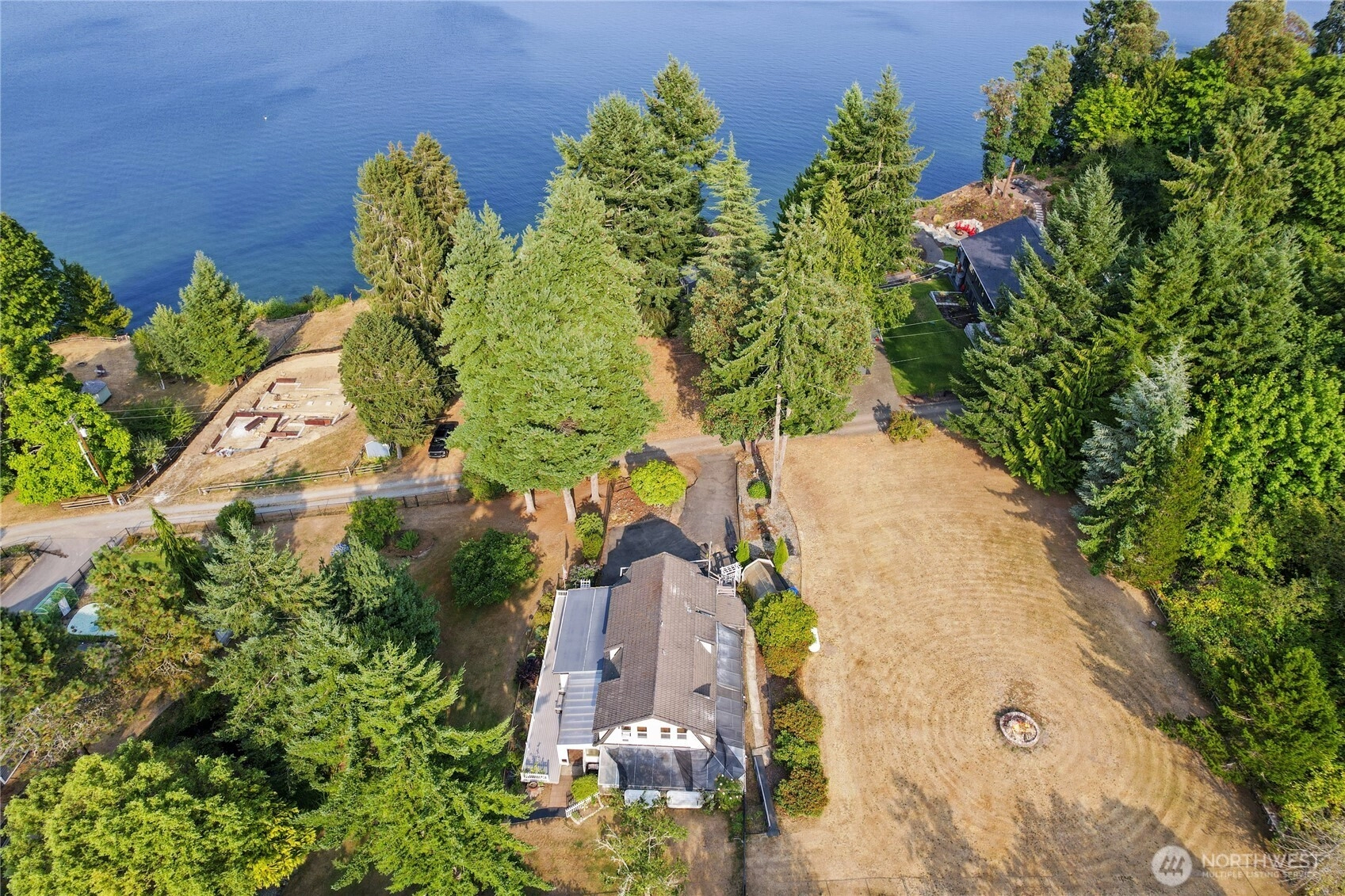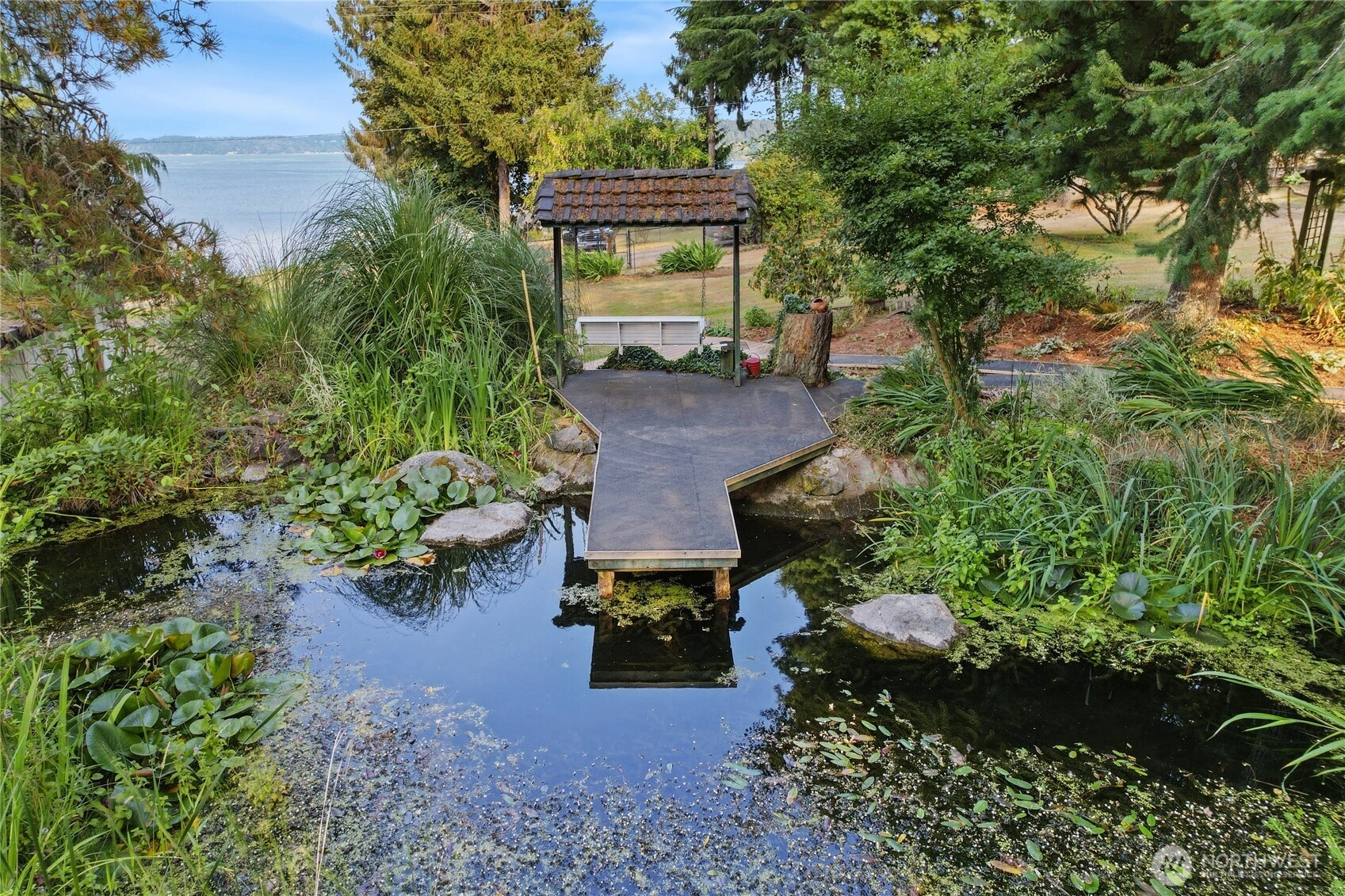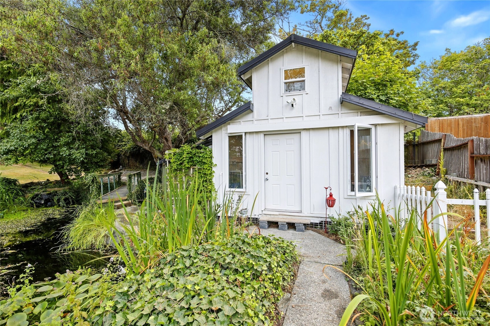 Storybook home in charming gated enclave offers breathtaking sunsets & stunning views of Puget Sound, Mt. Rainier, & pastoral serenity. Full of creativity, charm, & whimsy, truly one-of-a-kind. In home elevator offers unrestricted accessibility. Main floor w/large family room, wet bar, plus rooms & storage to suit your lifestyle. Brick grotto leads into greenhouse, reminiscent of a Tuscan wine tasting room - unforgettable! Upstairs a well-appointed kitchen, office & expansive primary w/deck to enjoy sweeping water & garden views. Explore the magical curated gardens that include a pond w/foot bridge, garden shed & bonus detached studio w/ loft - ideal for guests or creative escape. Incl adjacent lot for ADU,shop, build or just more space!