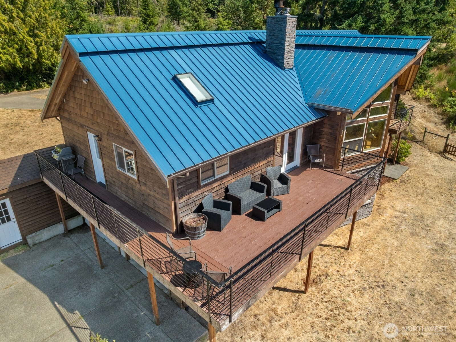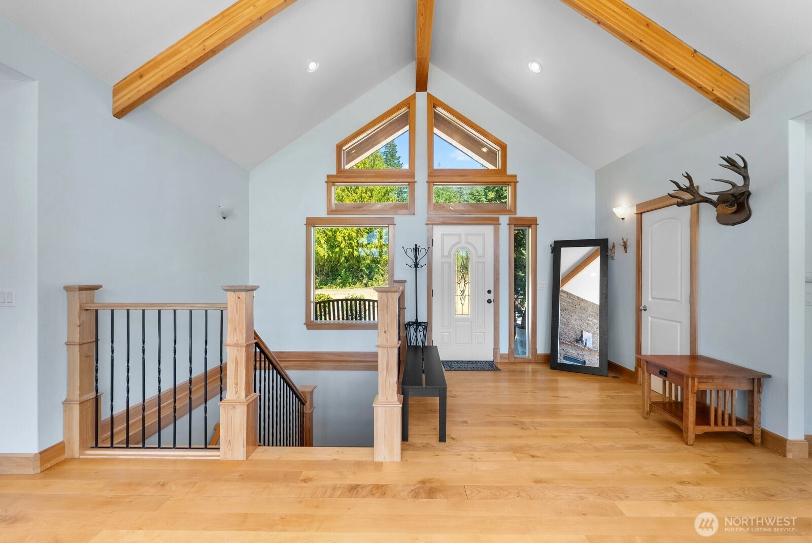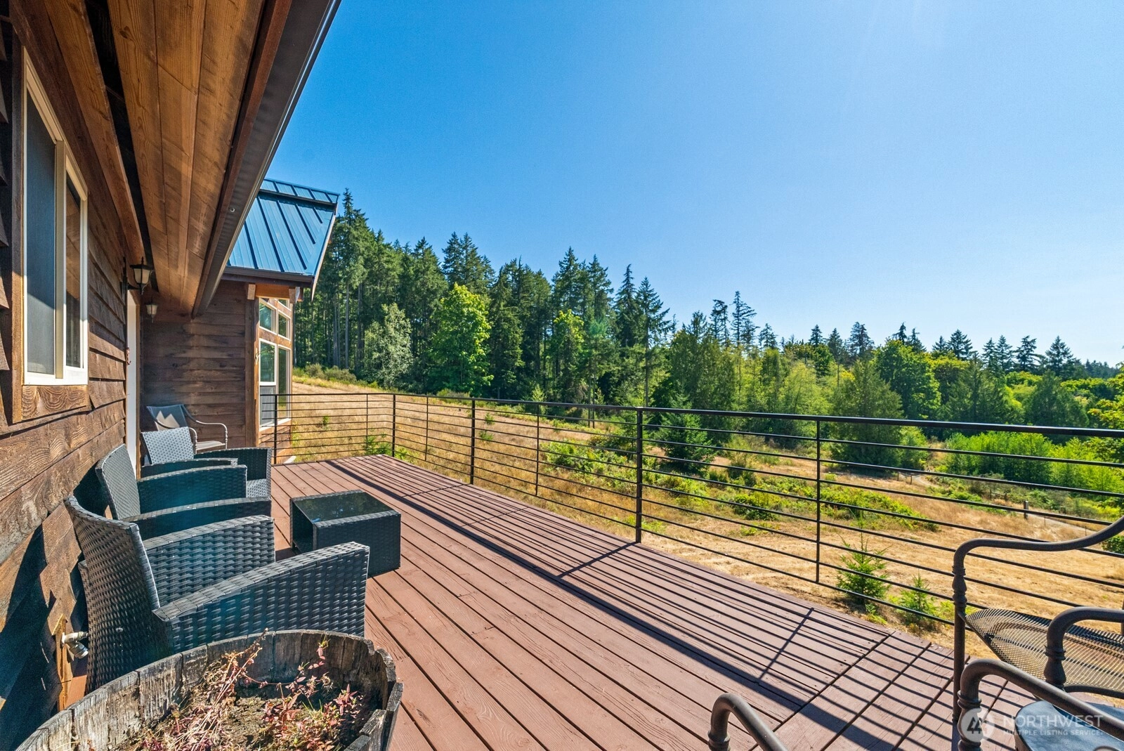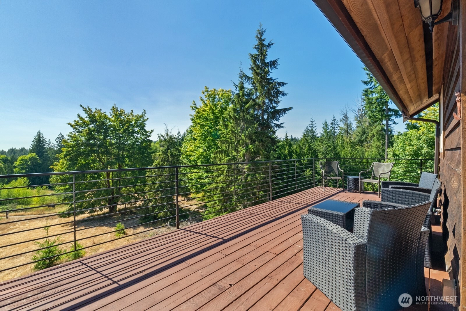 Serene privacy on 6.1 Acre property offering a harmonious blend of natural beauty and modern comfort. A gated entrance leads to a meandering drive through lush woods, unveiling a home perched on a hill with breathtaking open vistas. The property features two fenced pastures for livestock, 30x48 det garage for additional vehicle/equip storage w/ loft, and attached two-car garage. A 3 Bed 2.5 bath home boasts a gorgeous primary suite on the main level, expansive decks for outdoor enjoyment, and stunning Maple floors paired with granite finishes. Amazing kitchen with beautiful upgraded cabinets. The exterior siding, was harvested from the property. Cathedral like laminated beam ceilings and large windows flood the spacepastoral views. with