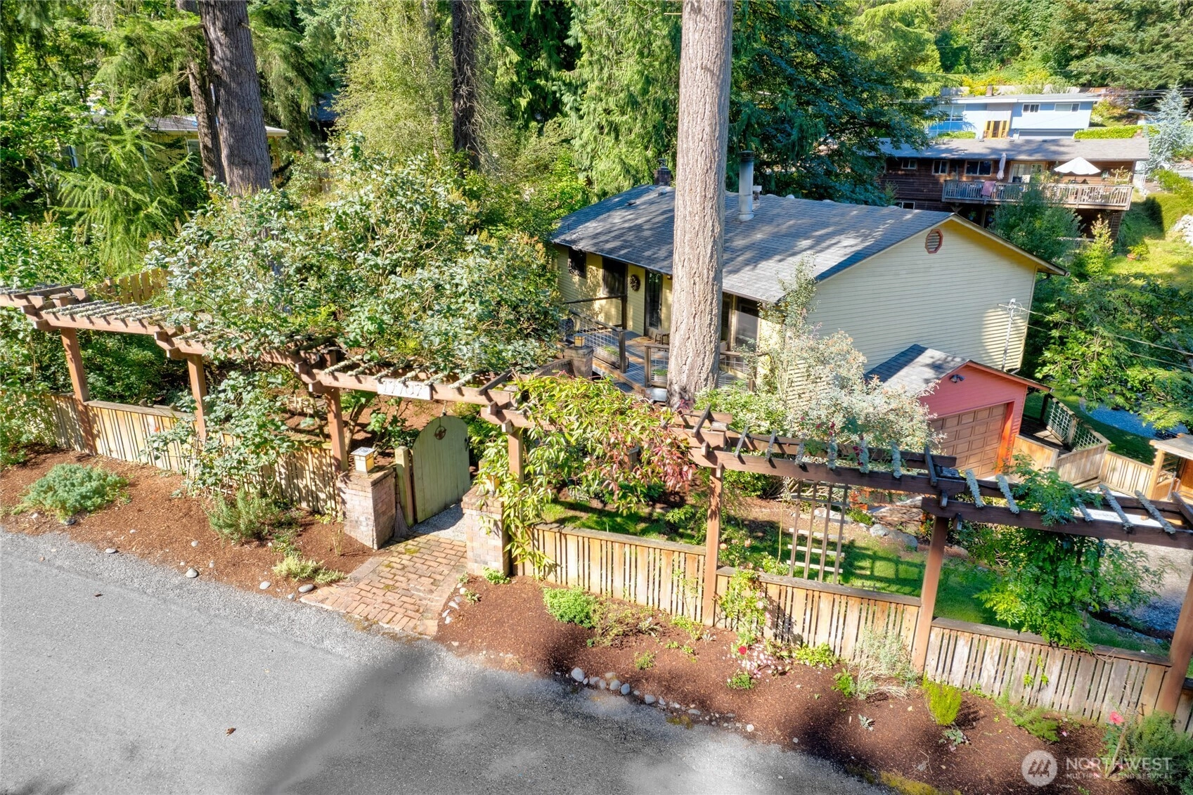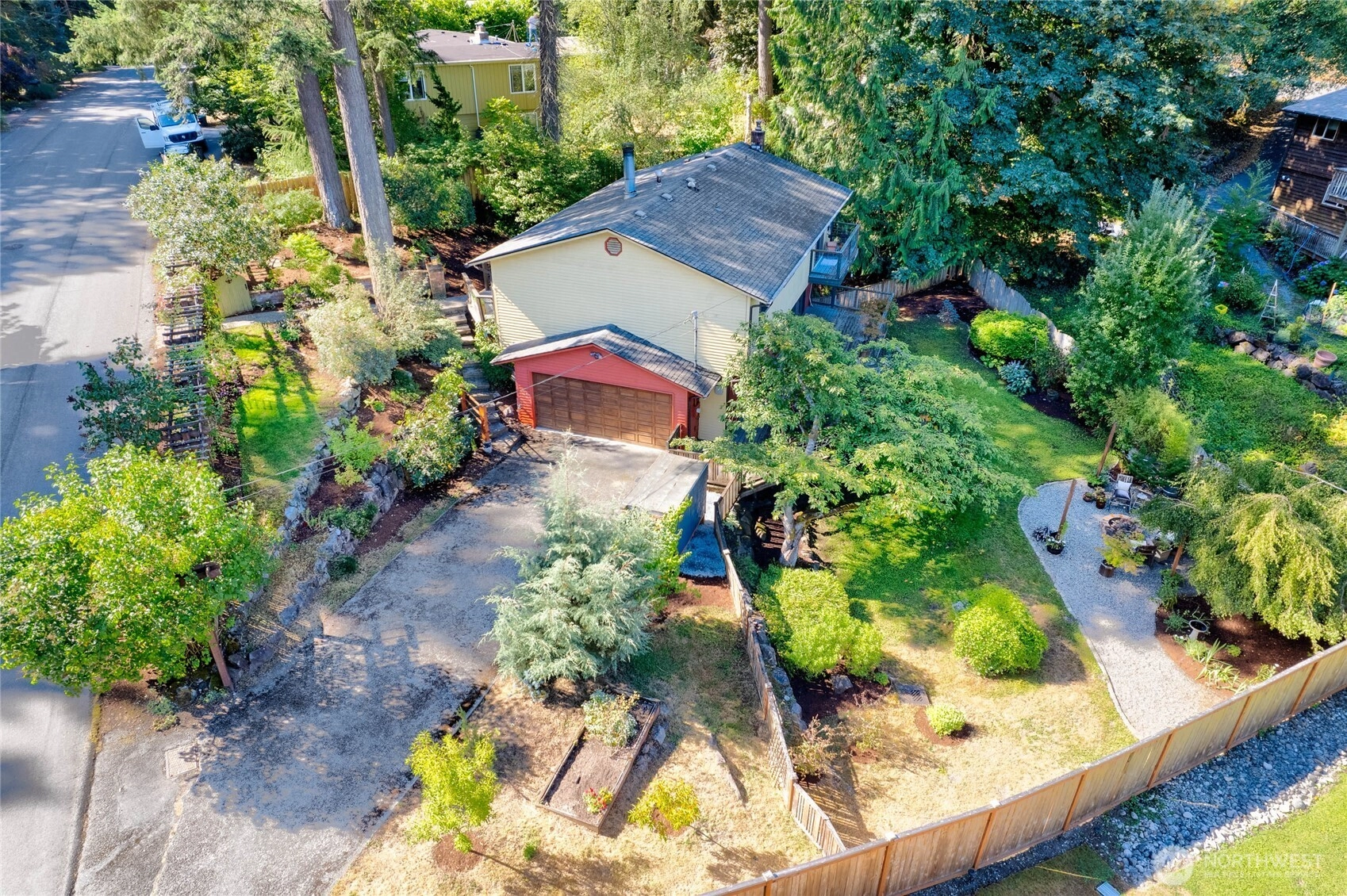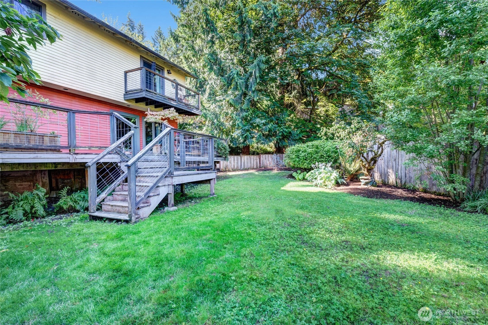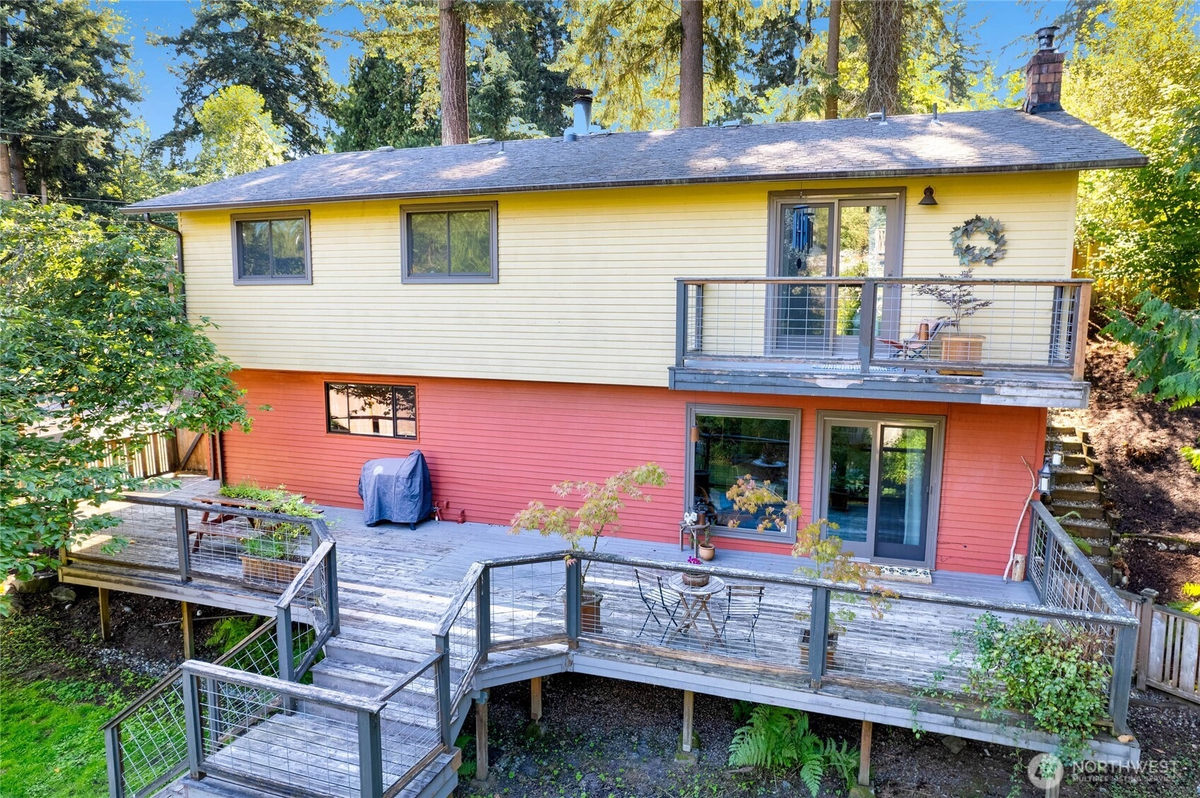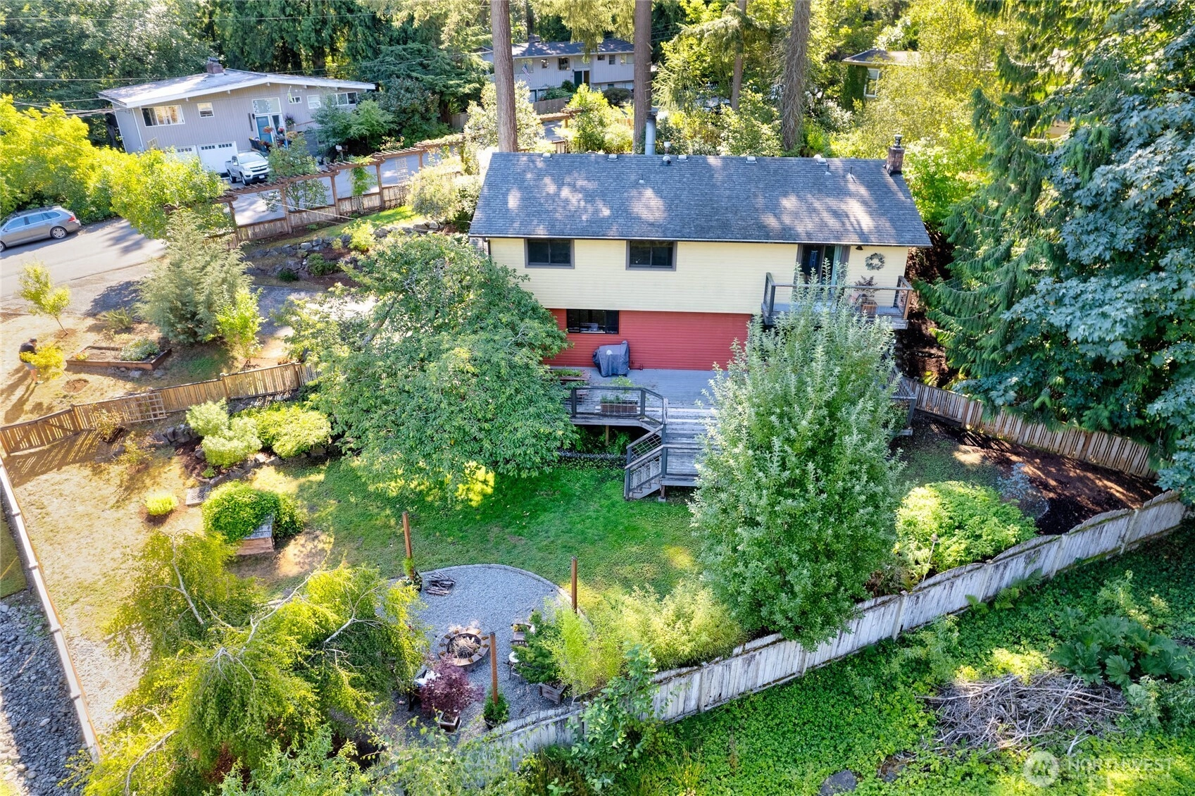 From the moment you open the gate and walk towards your front deck entry, you'll appreciate how special this beautiful home on a large and gorgeous lot is. The main floor features a spacious living room with a cozy fireplace, an updated kitchen with stainless steel appliances, a master suite with its own private balcony and two more bedrooms. Downstairs, a huge family room with a wood stove and a flexible fourth bedroom, hobby room, or home office offers flexible options. An easy 15 minute walk to revitalized downtown Kenmore- breweries, restaurants, and cafes! The fully fenced yard with a firepit is perfect for outdoor entertaining. Fantastic Northshore School District - welcome home!