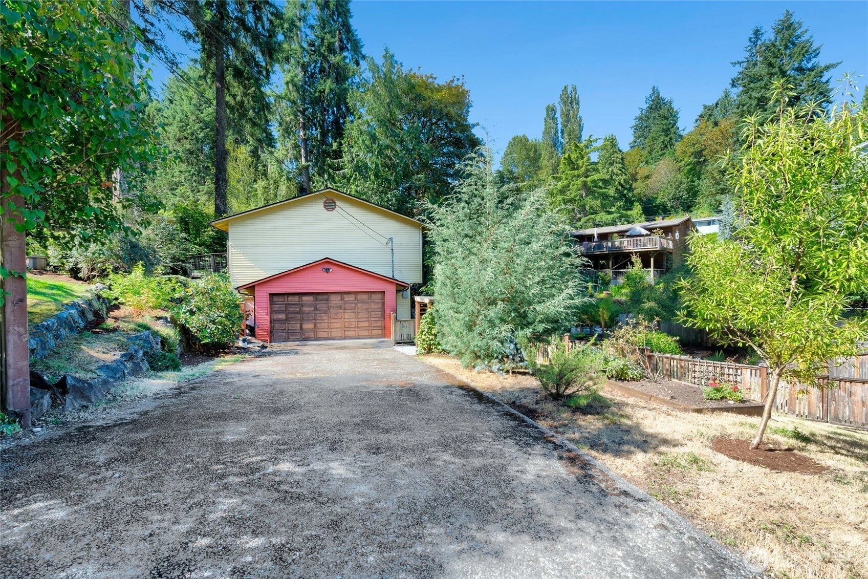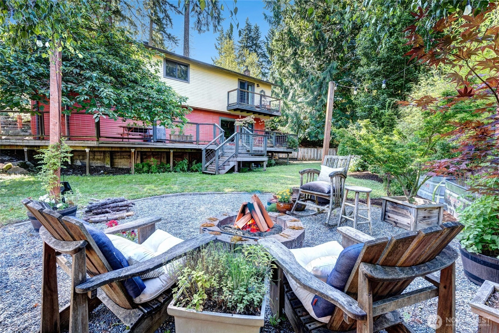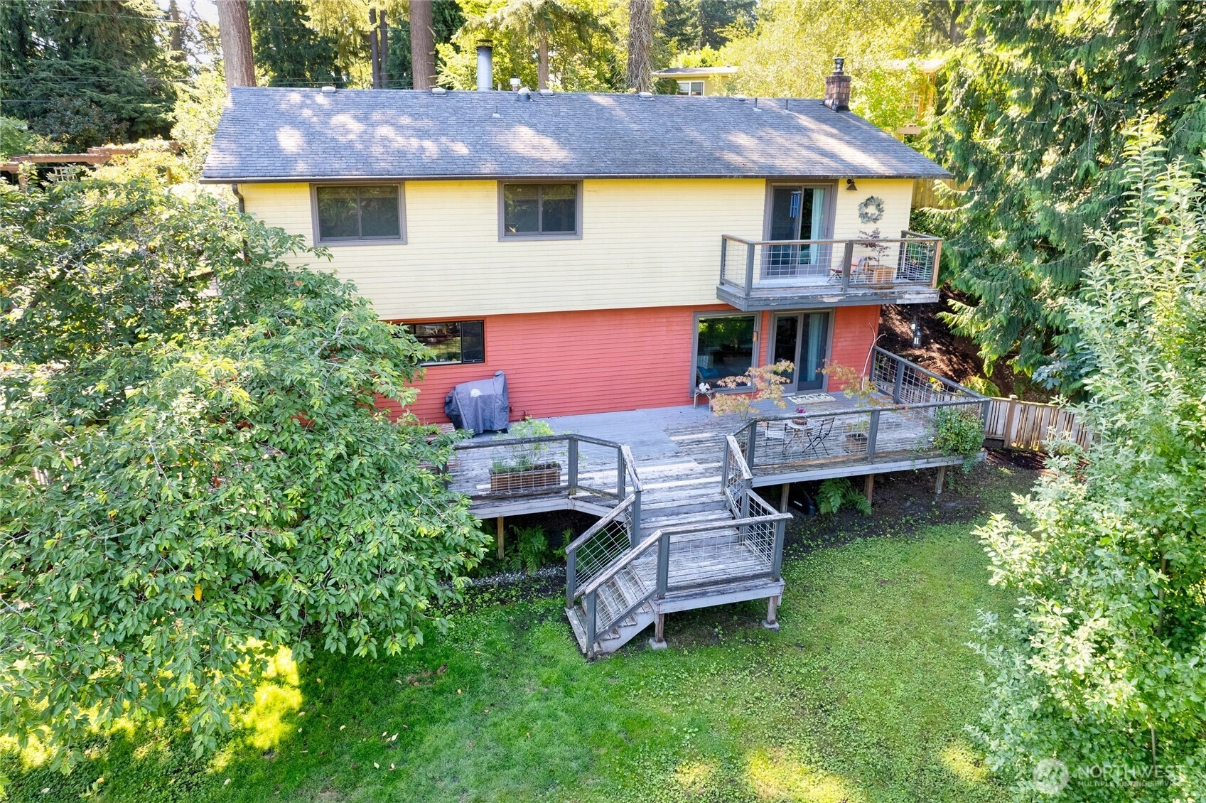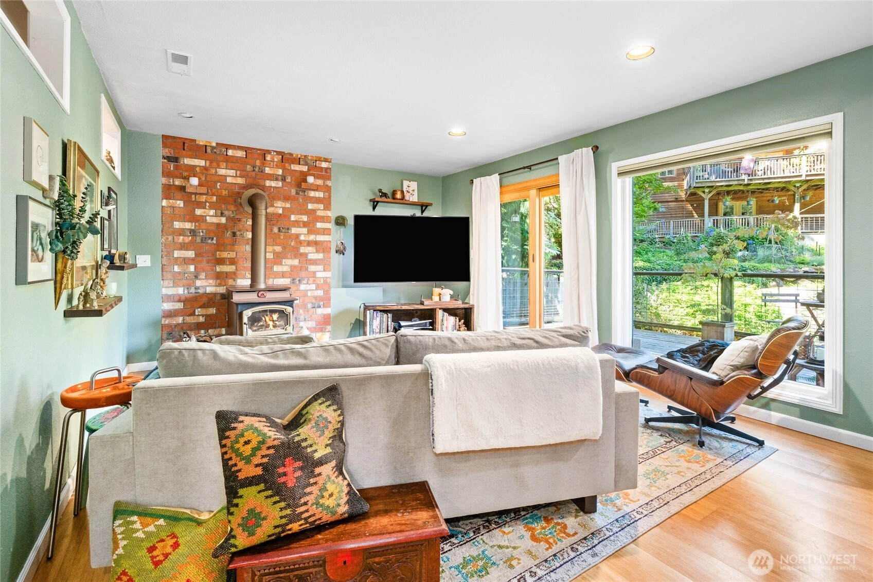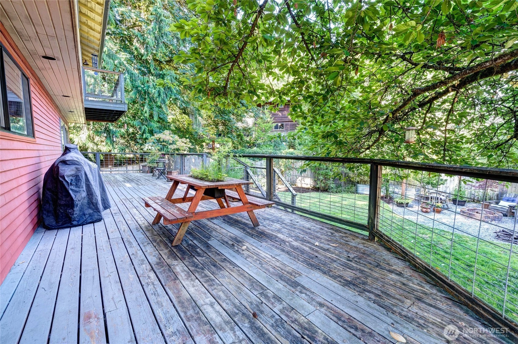 From the moment you open the gate and walk towards your front deck entry, you'll appreciate how special this beautiful home on a large and gorgeous lot is. The main floor features a spacious living room with a cozy fireplace, an updated kitchen with stainless steel appliances, a master suite with its own private balcony and two more bedrooms. Downstairs, a huge family room with a wood stove and a flexible fourth bedroom, hobby room, or home office offers flexible options. An easy 15 minute walk to revitalized downtown Kenmore- breweries, restaurants, and cafes! The fully fenced yard with a firepit is perfect for outdoor entertaining. Fantastic Northshore School District - welcome home!