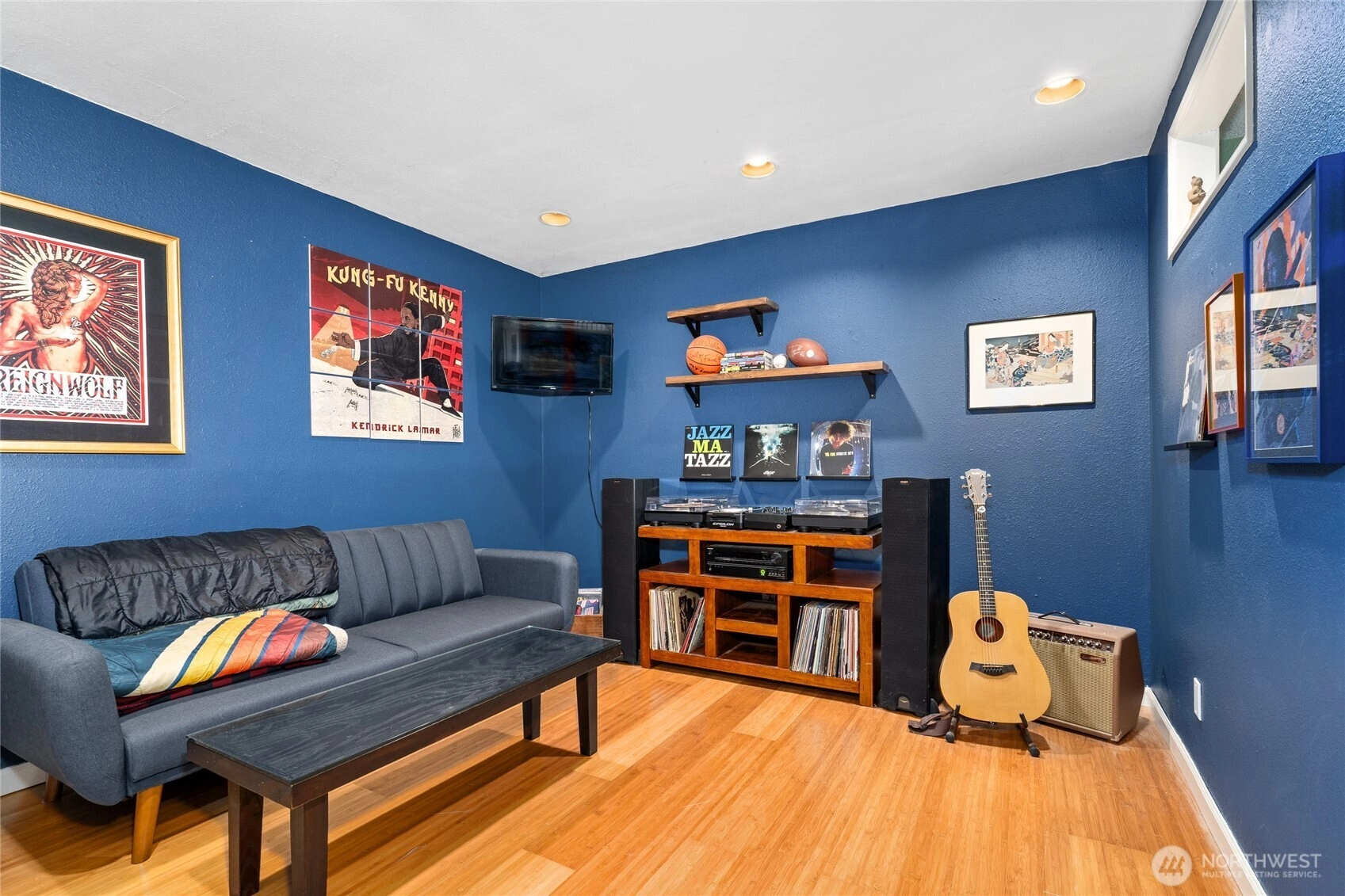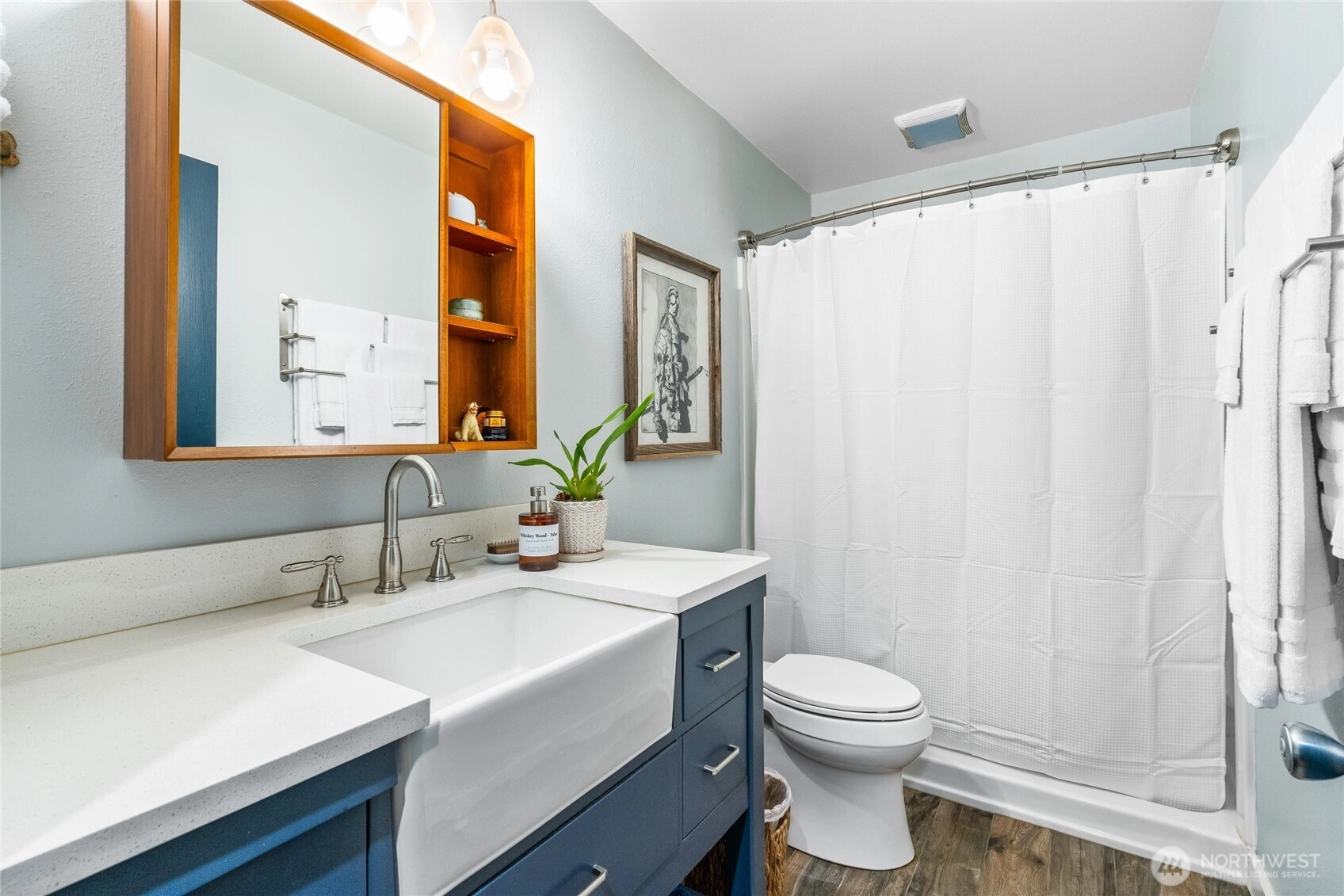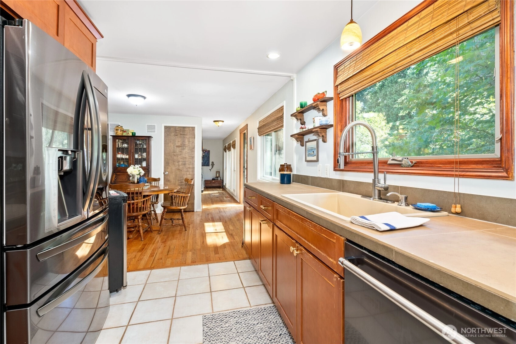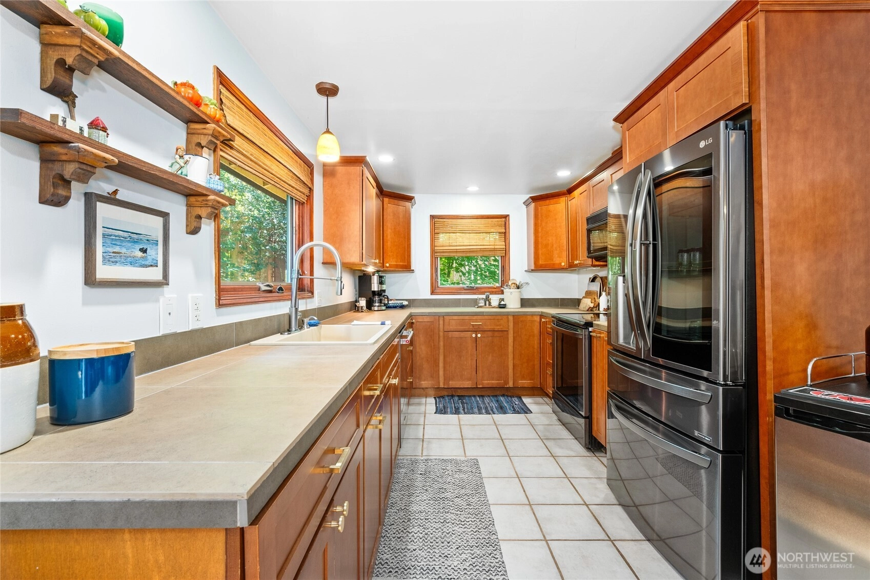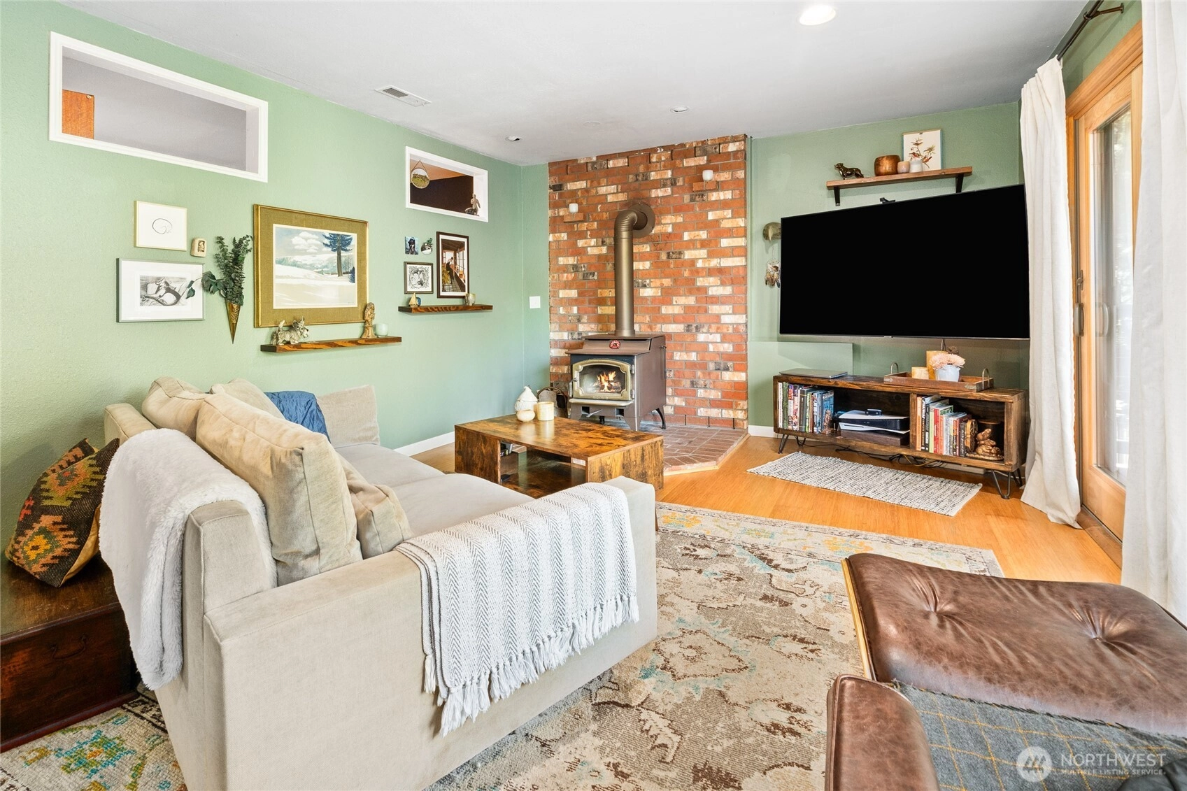 From the moment you open the gate and walk towards your front deck entry, you'll appreciate how special this beautiful home on a large and gorgeous lot is. The main floor features a spacious living room with a cozy fireplace, an updated kitchen with stainless steel appliances, a master suite with its own private balcony and two more bedrooms. Downstairs, a huge family room with a wood stove and a flexible fourth bedroom, hobby room, or home office offers flexible options. An easy 15 minute walk to revitalized downtown Kenmore- breweries, restaurants, and cafes! The fully fenced yard with a firepit is perfect for outdoor entertaining. Fantastic Northshore School District - welcome home!