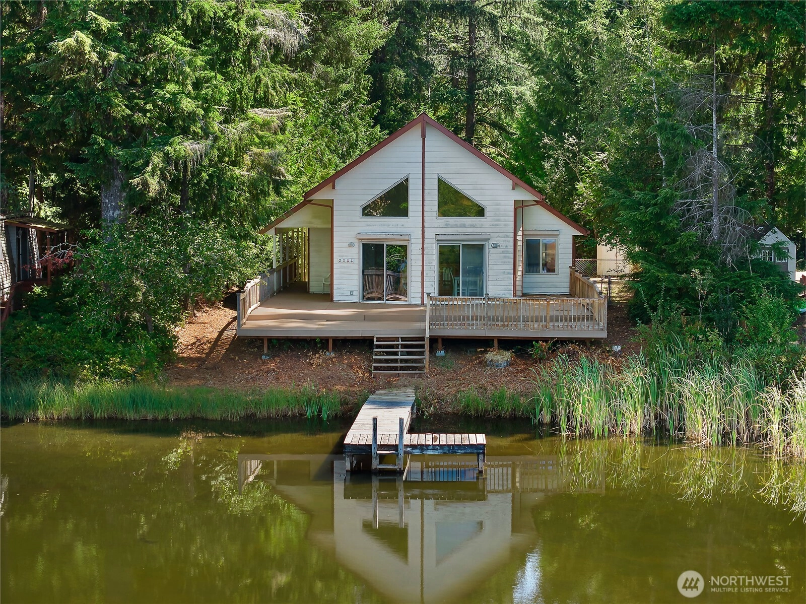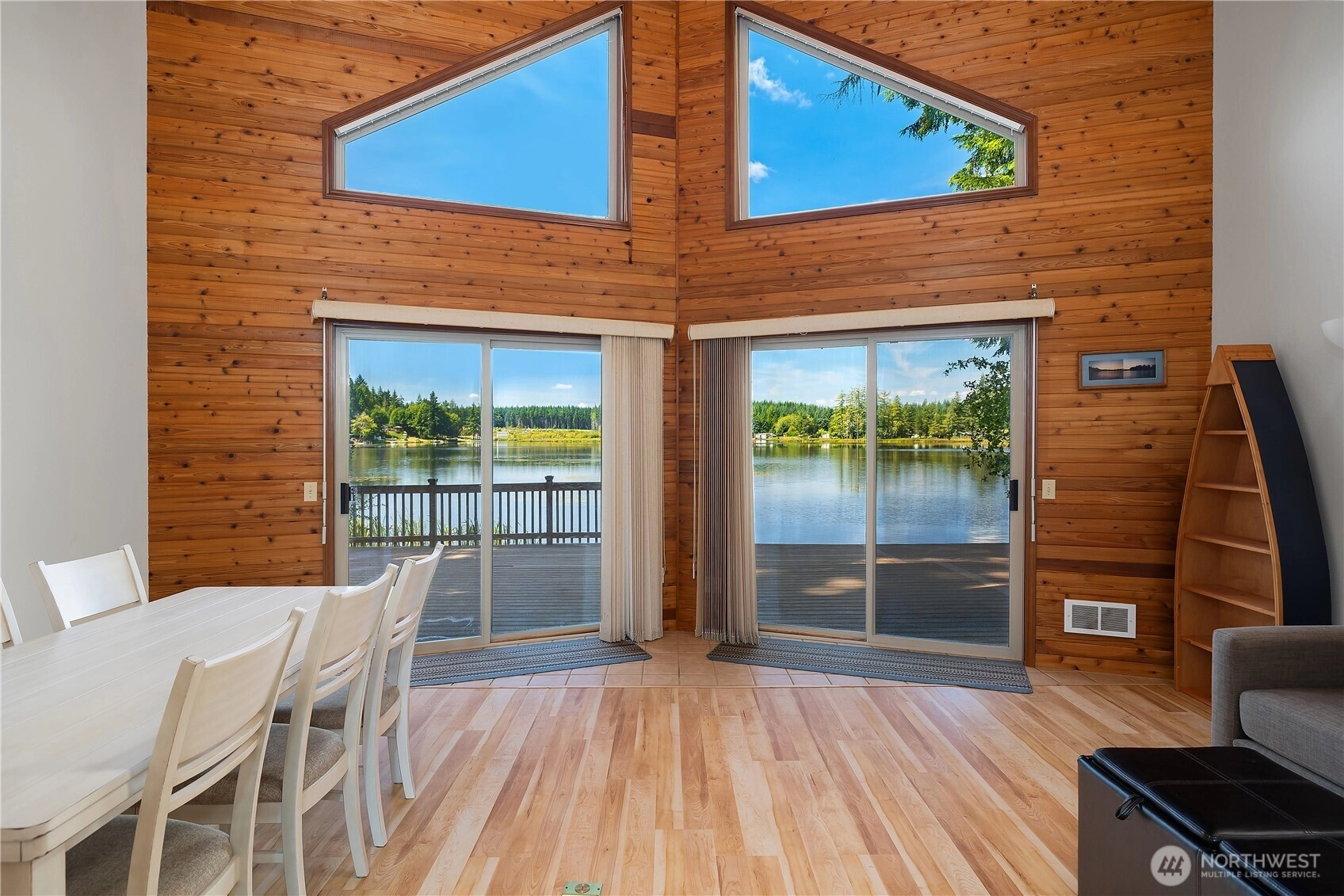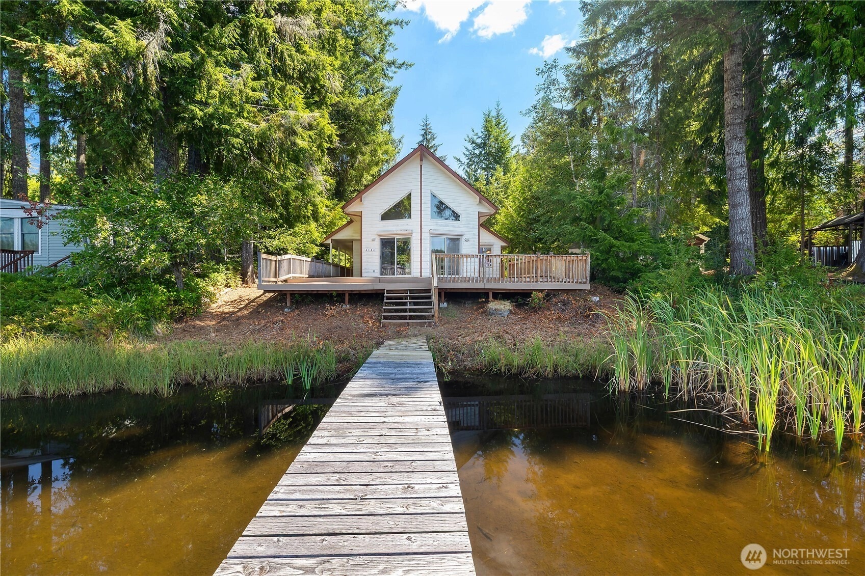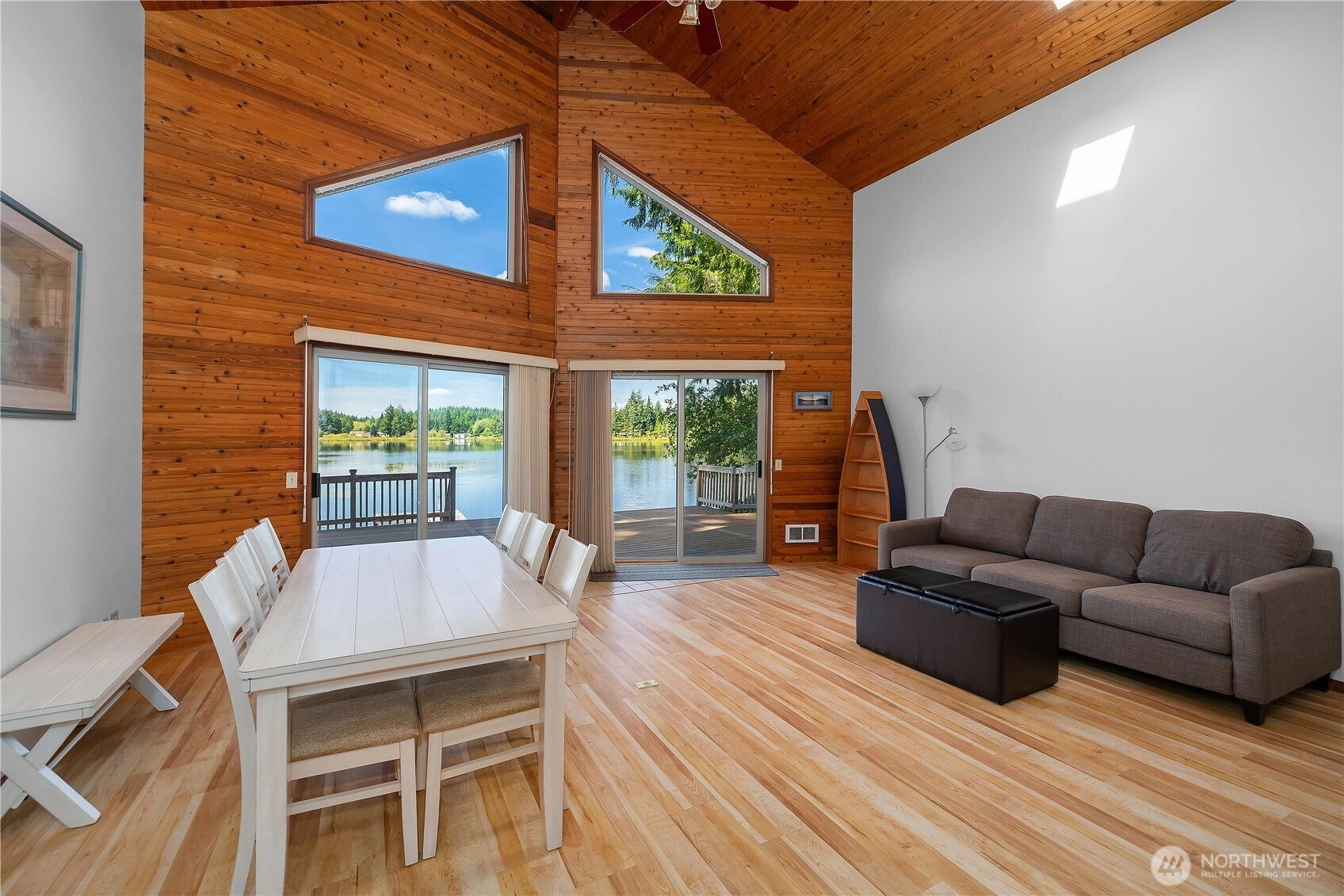Welcome to your serene lakeside getaway! Nestled on a generous .52-acre lot, this beautifully crafted 2-bedroom, 1.5-bath home offers 1,204 sq ft of inviting living space that perfectly balances rustic charm with modern comfort. Step inside and be greeted by soaring vaulted ceilings, rich wood paneling, and an abundance of natural light pouring through striking angular windows and a skylight above. The open-concept living and dining area flows effortlessly out onto an expansive deck, offering unobstructed water views your front-row seat to nature’s beauty, just steps from your private dock. This property is designed for both relaxation and peace of mind, featuring metal roll-up doors that provide additional security and storm protection.