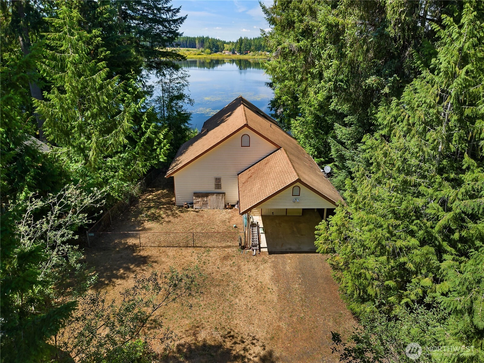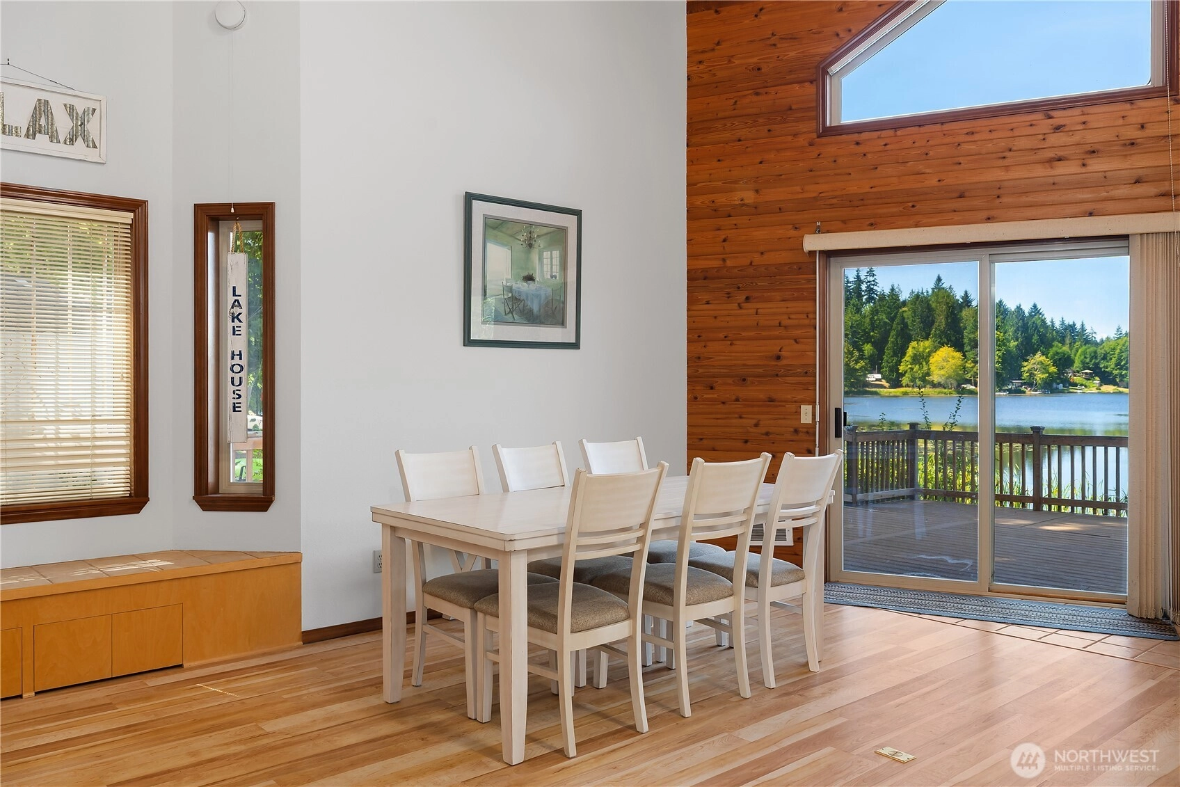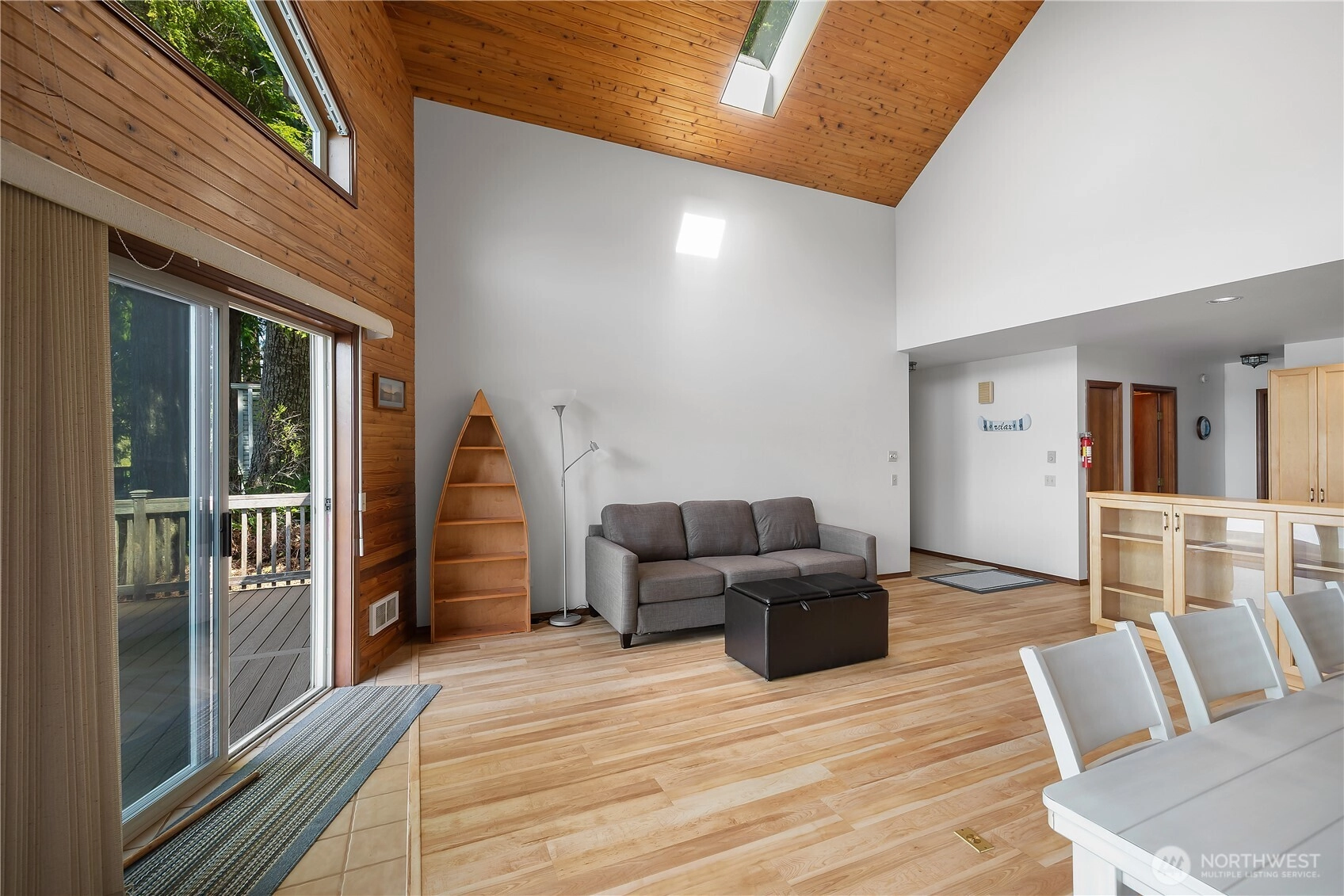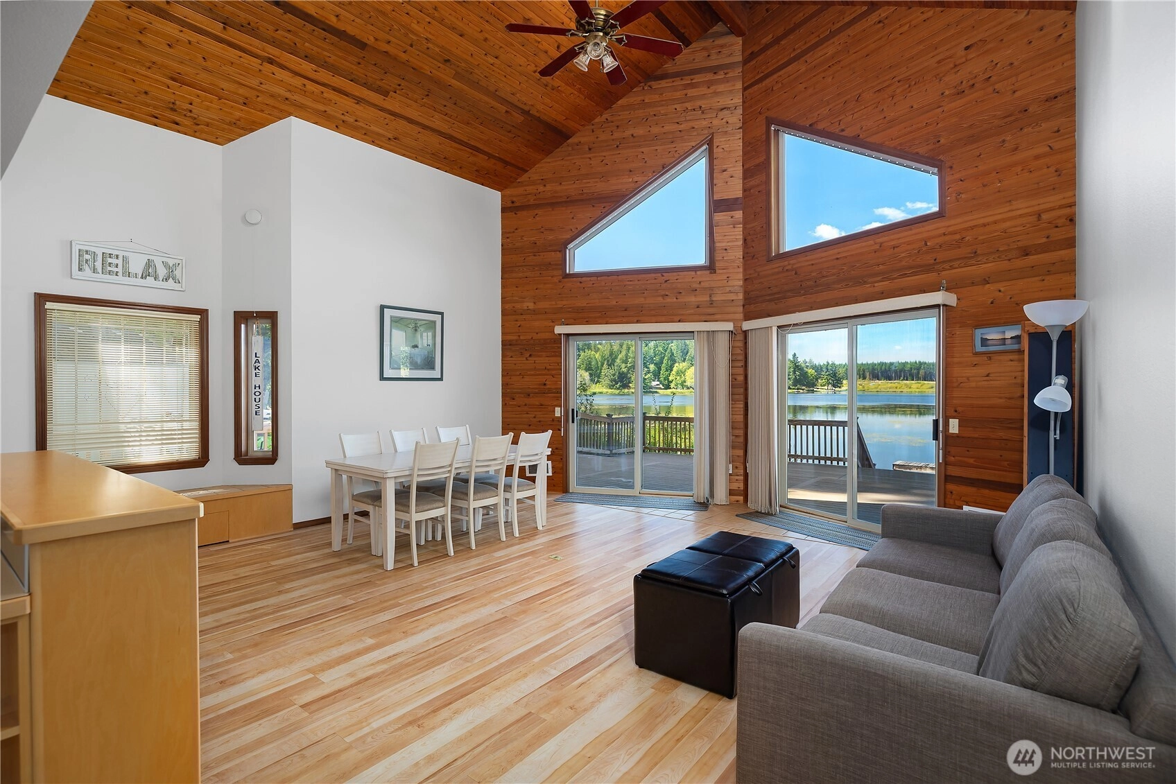 Welcome to your serene lakeside getaway! Nestled on a generous .52-acre lot, this beautifully crafted 2-bedroom, 1.5-bath home offers 1,204 sq ft of inviting living space that perfectly balances rustic charm with modern comfort. Step inside and be greeted by soaring vaulted ceilings, rich wood paneling, and an abundance of natural light pouring through striking angular windows and a skylight above. The open-concept living and dining area flows effortlessly out onto an expansive deck, offering unobstructed water views your front-row seat to nature’s beauty, just steps from your private dock. This property is designed for both relaxation and peace of mind, featuring metal roll-up doors that provide additional security and storm protection.