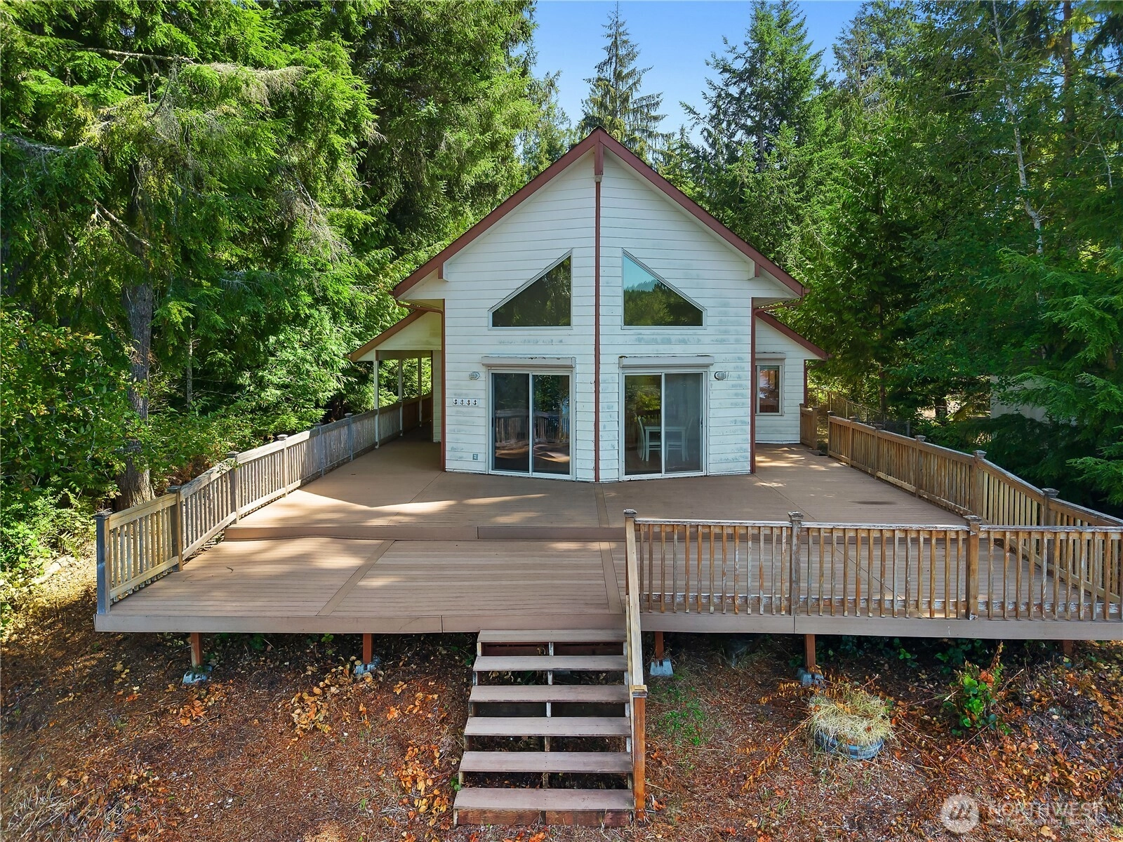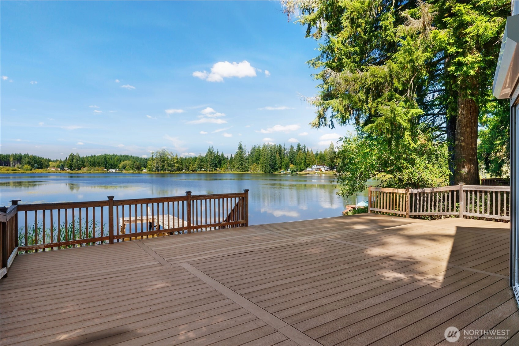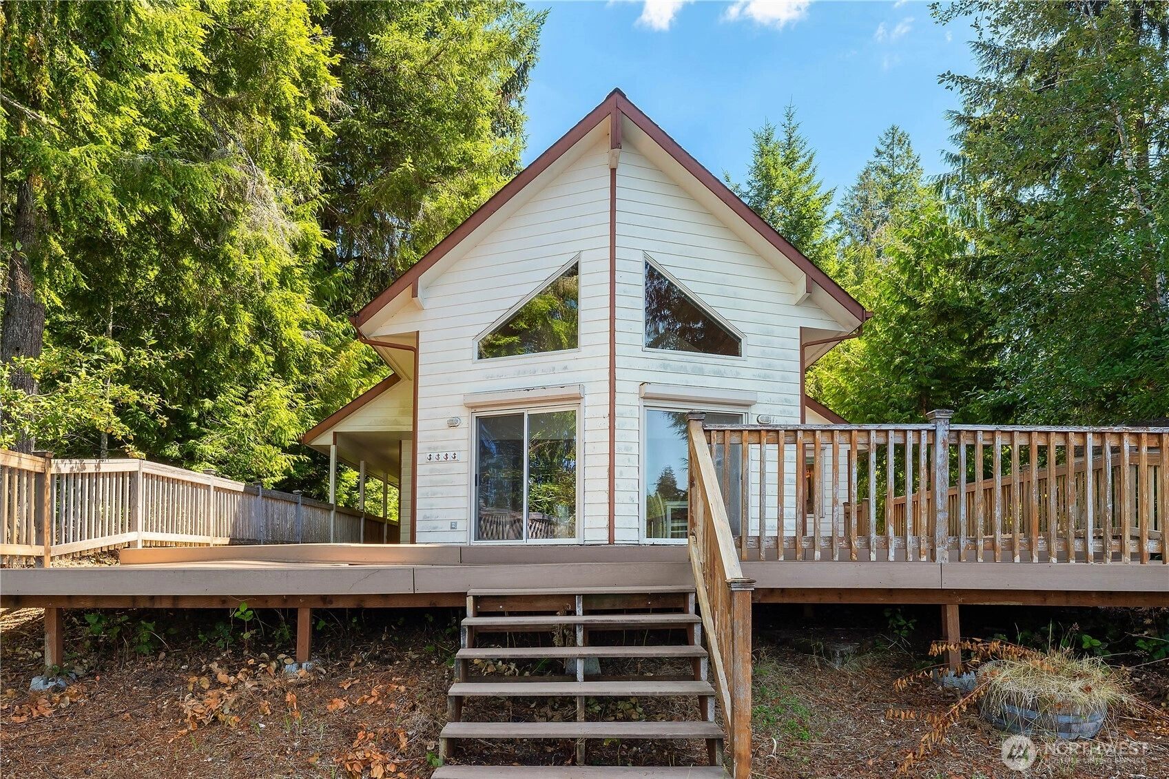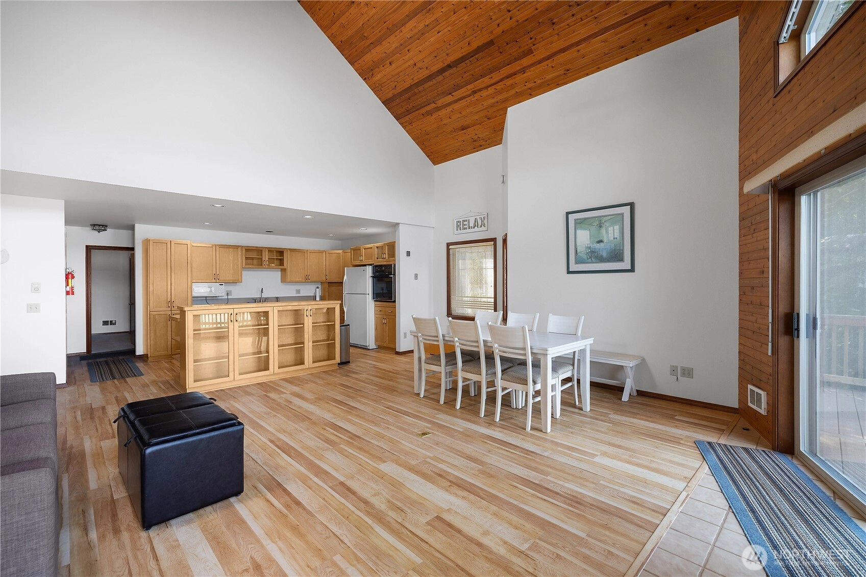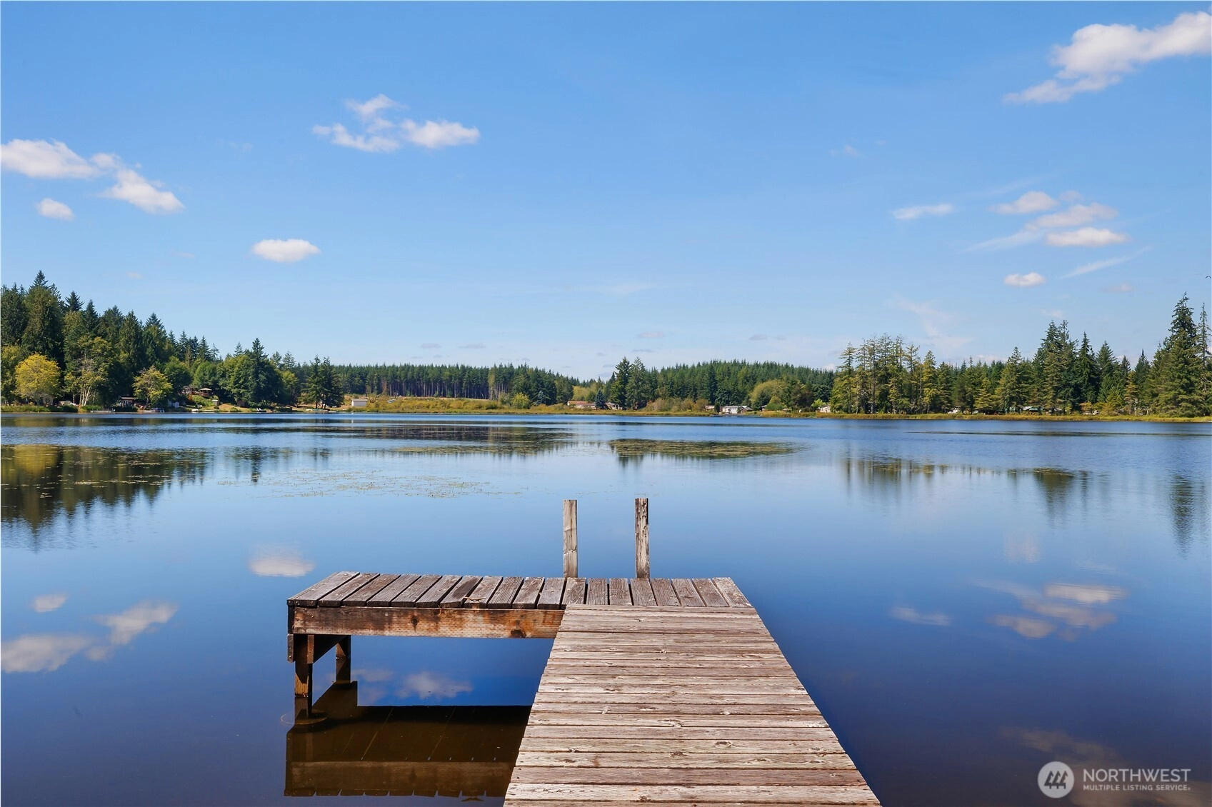 Welcome to your serene lakeside getaway! Nestled on a generous .52-acre lot, this beautifully crafted 2-bedroom, 1.5-bath home offers 1,204 sq ft of inviting living space that perfectly balances rustic charm with modern comfort. Step inside and be greeted by soaring vaulted ceilings, rich wood paneling, and an abundance of natural light pouring through striking angular windows and a skylight above. The open-concept living and dining area flows effortlessly out onto an expansive deck, offering unobstructed water views your front-row seat to nature’s beauty, just steps from your private dock. This property is designed for both relaxation and peace of mind, featuring metal roll-up doors that provide additional security and storm protection.