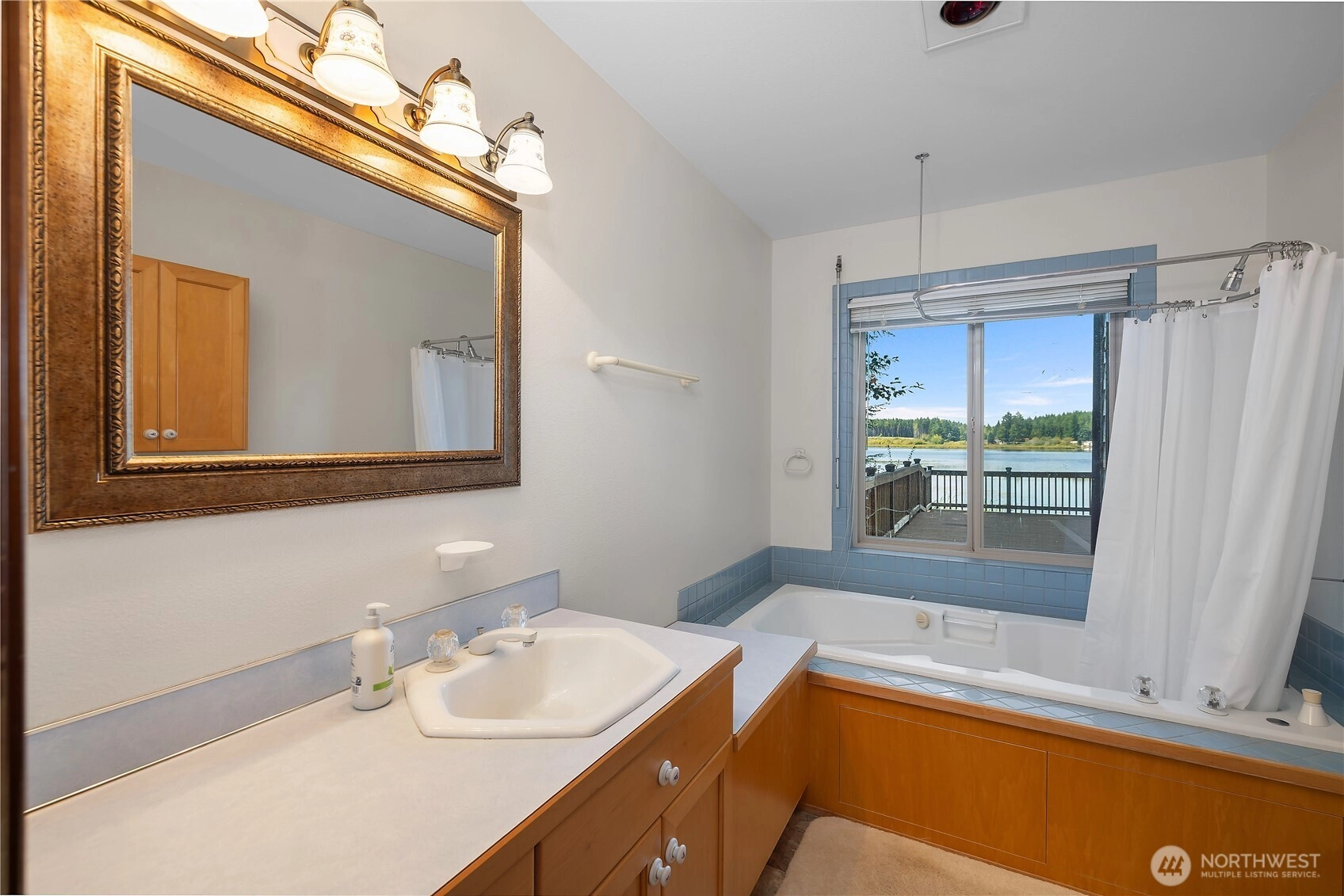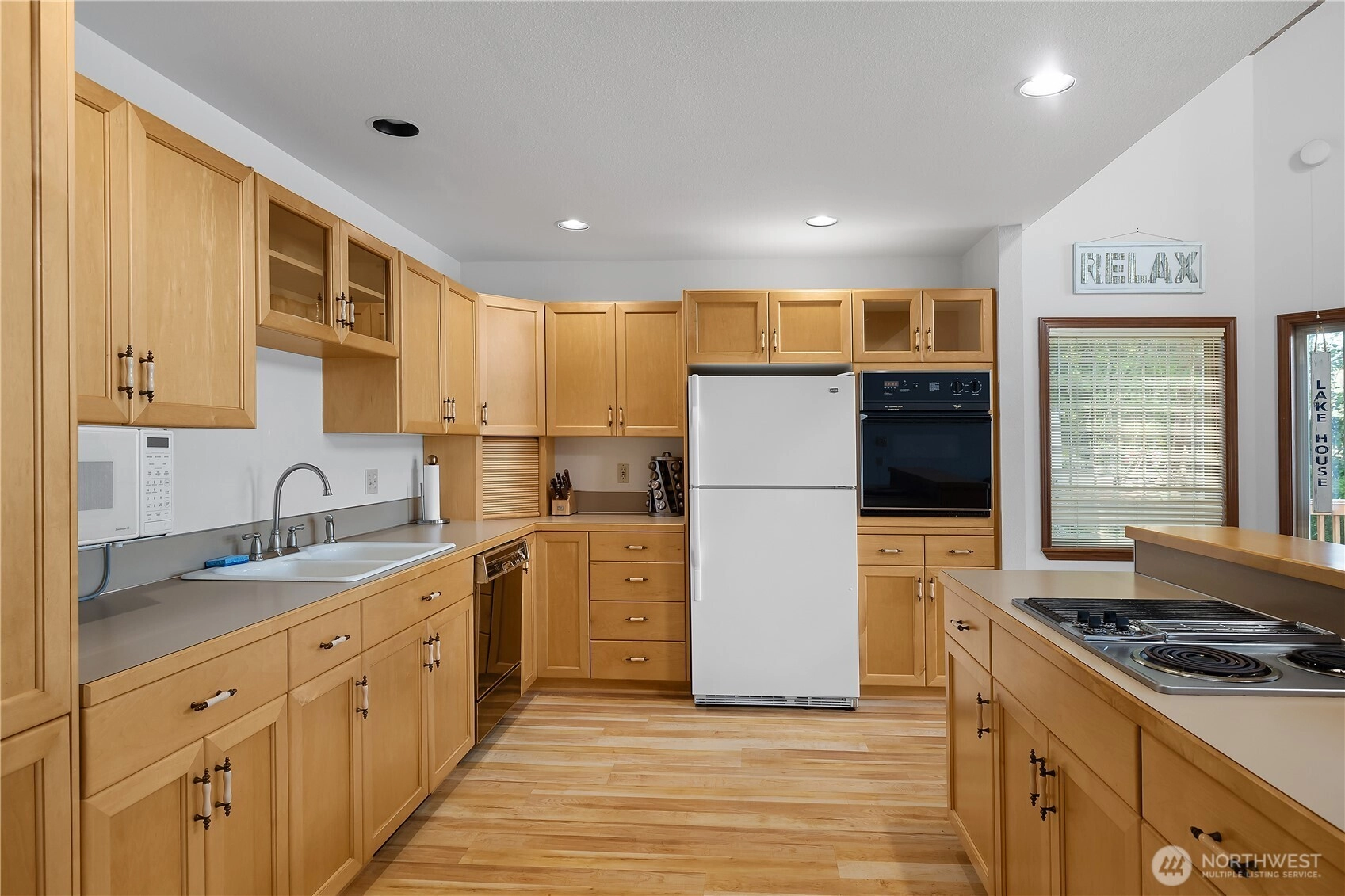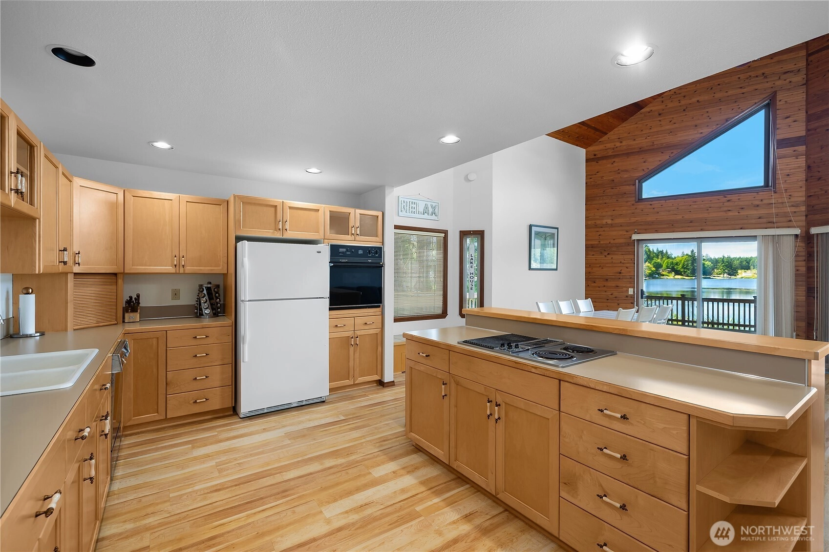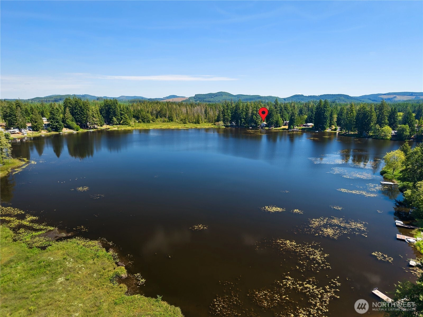 Welcome to your serene lakeside getaway! Nestled on a generous .52-acre lot, this beautifully crafted 2-bedroom, 1.5-bath home offers 1,204 sq ft of inviting living space that perfectly balances rustic charm with modern comfort. Step inside and be greeted by soaring vaulted ceilings, rich wood paneling, and an abundance of natural light pouring through striking angular windows and a skylight above. The open-concept living and dining area flows effortlessly out onto an expansive deck, offering unobstructed water views your front-row seat to nature’s beauty, just steps from your private dock. This property is designed for both relaxation and peace of mind, featuring metal roll-up doors that provide additional security and storm protection.