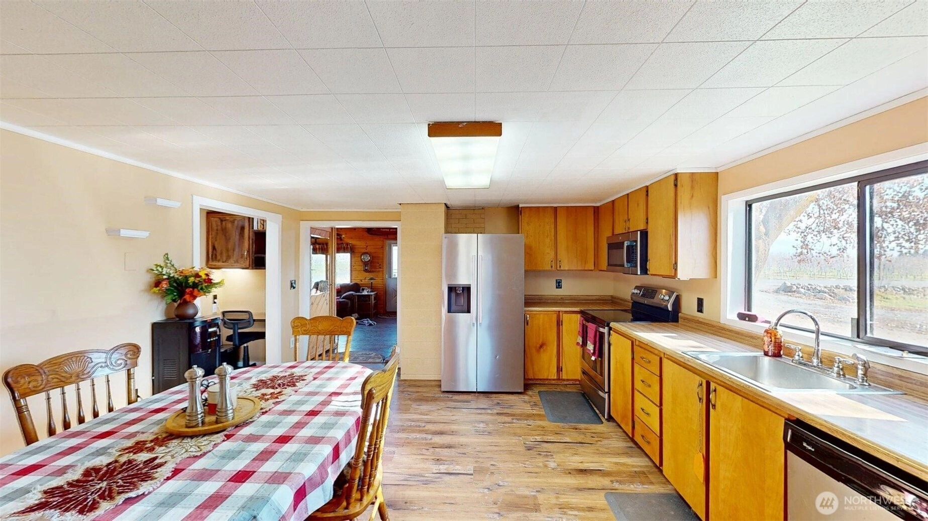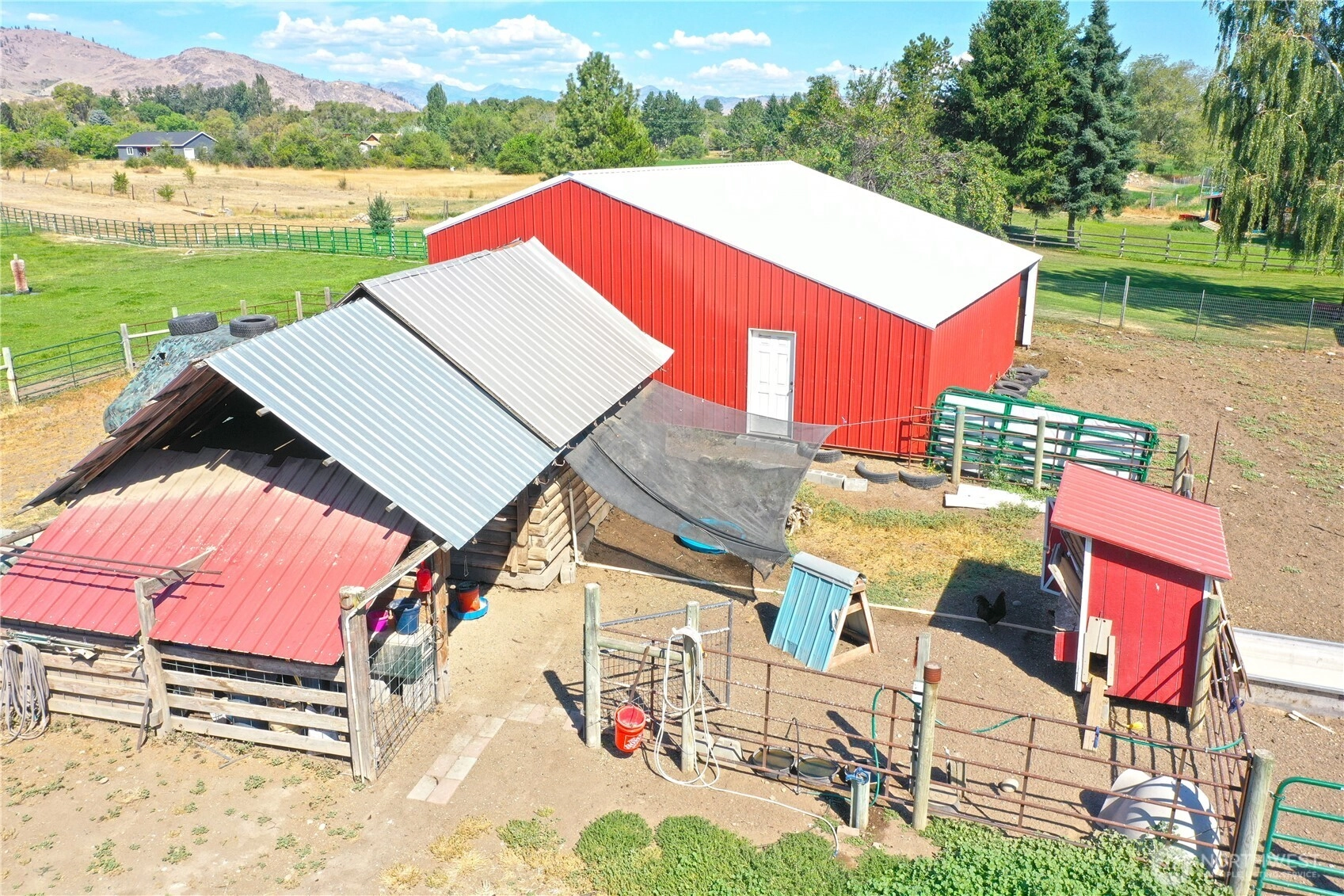 Welcome to this working mini farm just minutes from Omak. Set on nearly 5 acres of fenced land, this 3-bedroom, 2.5-bath home offers 2,304 sq ft of charm with thoughtful updates. A Lopi wood-burning fireplace anchors the living room, while wood floors, cathedral ceilings, and natural wood trim add warmth throughout. The kitchen is ideal for gatherings, and the covered porch plus rooftop deck showcase mountain and sunset views. Recent updates include plumbing, a tankless water heater, and stained concrete flooring in the partially finished basement. Outbuildings include a historic chicken house, machine shed, powered workshop, hay storage, & a 24’ x 30’ x 20’ barn. Ample parking features a two-car detached garage w/ workspace, and RV space.