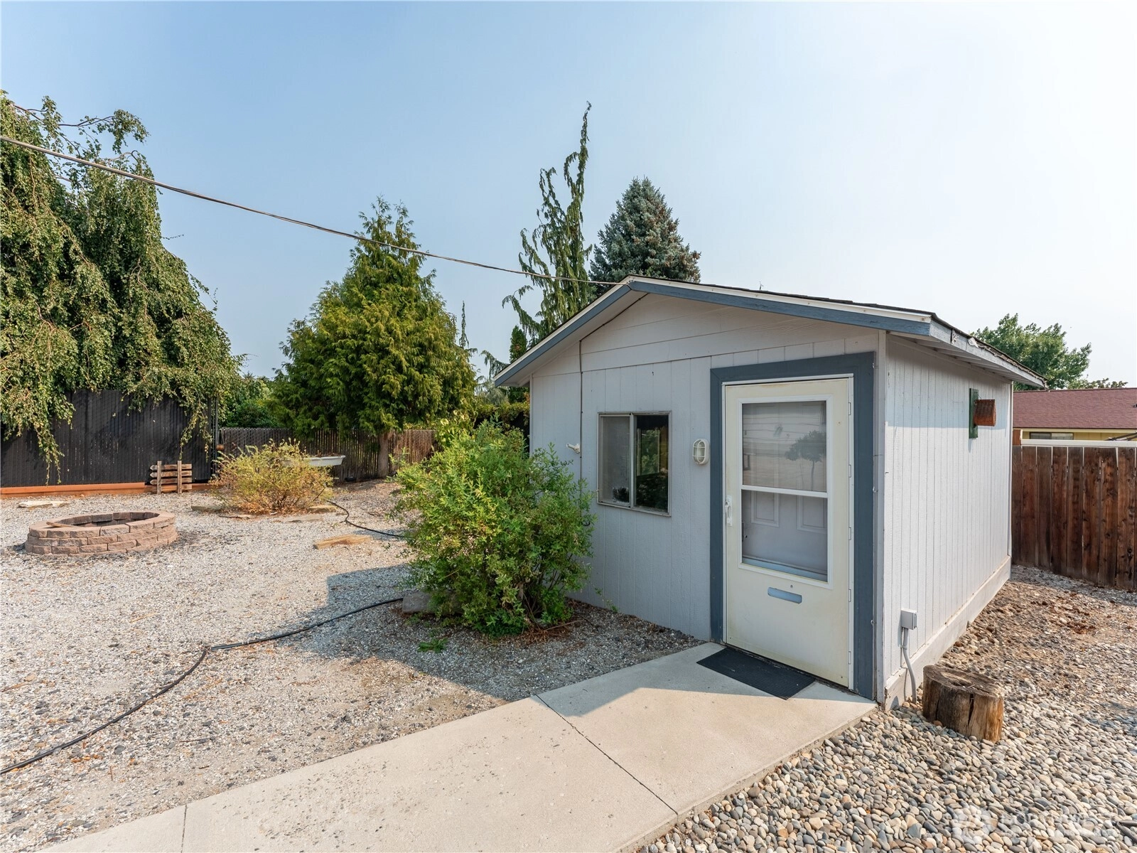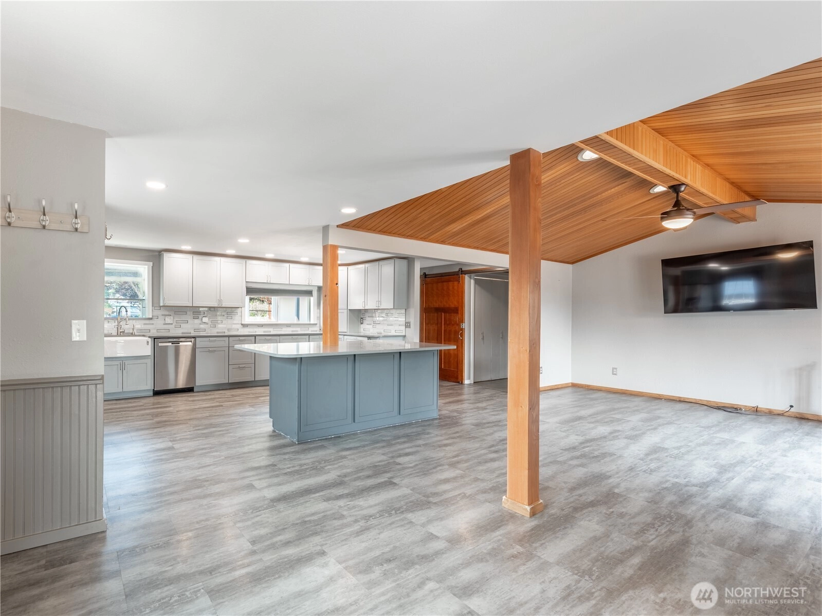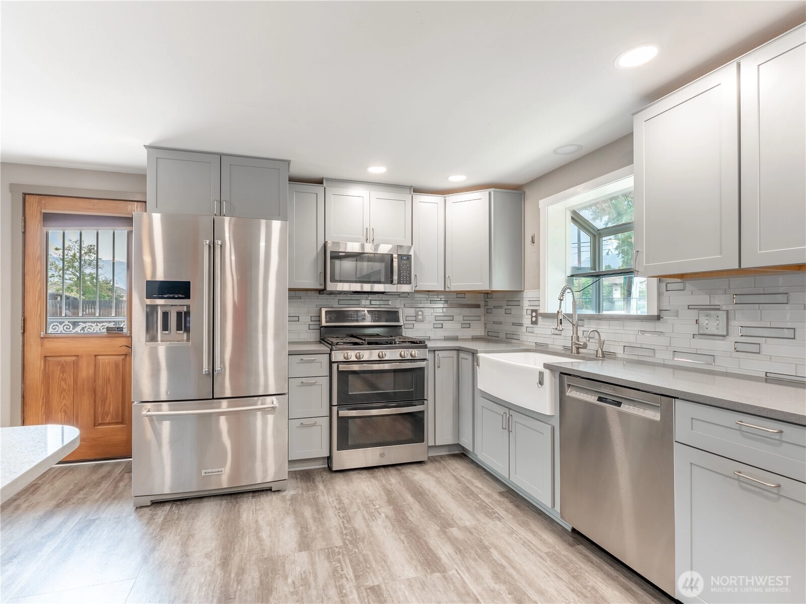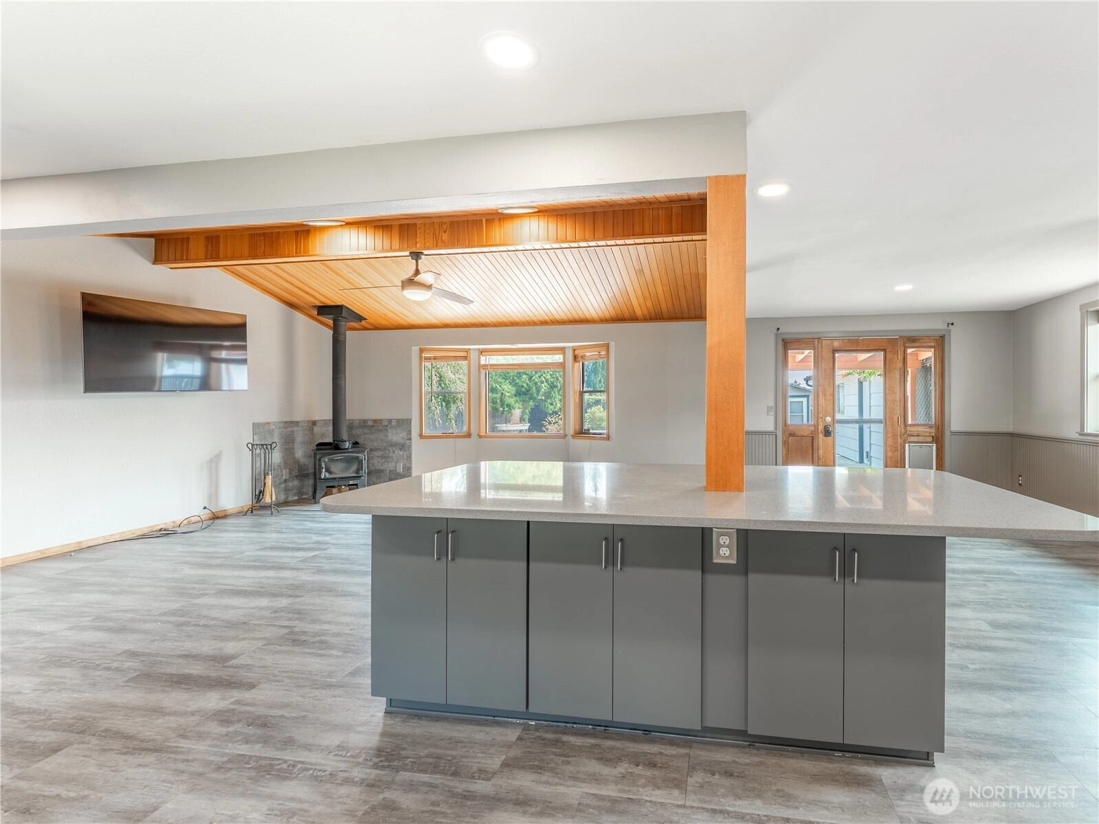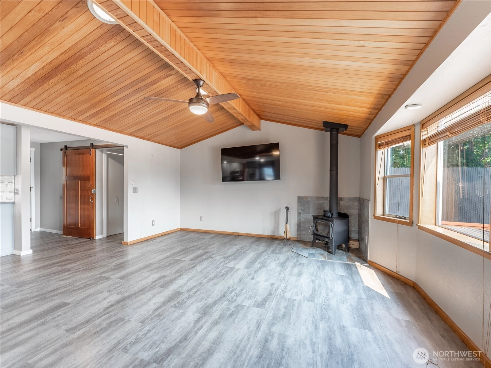 This beautifully remodeled 1,666 sq ft rambler sits on a 1/3-acre lot. The open-concept layout features vaulted ceilings, a cozy wood-burning fireplace, and durable LVP flooring—perfect for entertaining. The kitchen boasts stainless steel appliances, a gas cooktop, and plenty of counter space, complemented by quartz surfaces throughout. The spacious primary suite includes built-in closets, while the laundry room offers dual access from both the primary bathroom and hallway. Enjoy a private backyard for entertaining, along with RV parking with a 50-amp outlet, a detached 2+ car garage, separate office, multiple sheds, and a fully fenced yard with an electric gate for ultimate privacy.