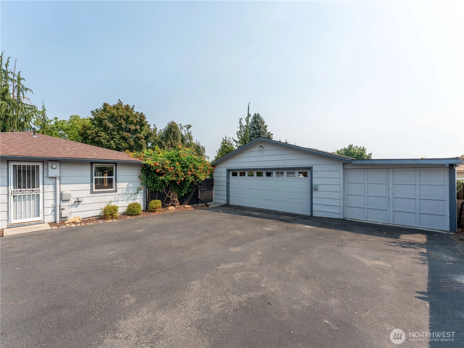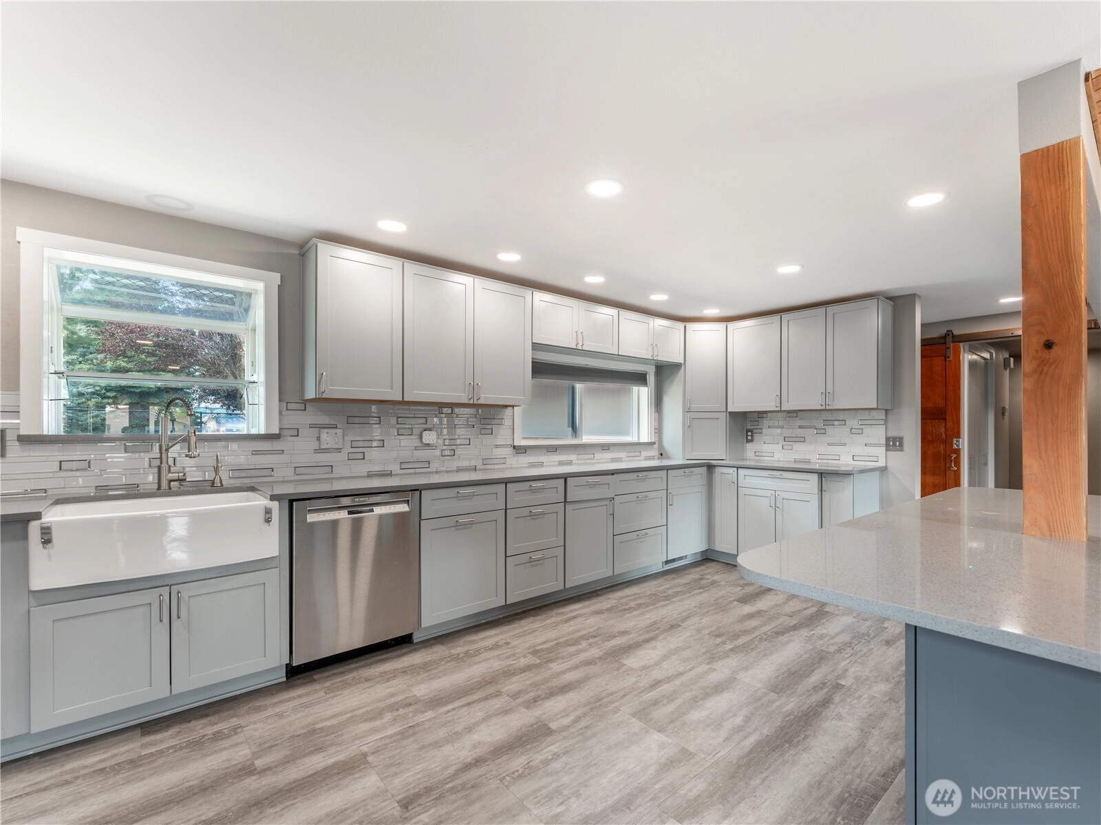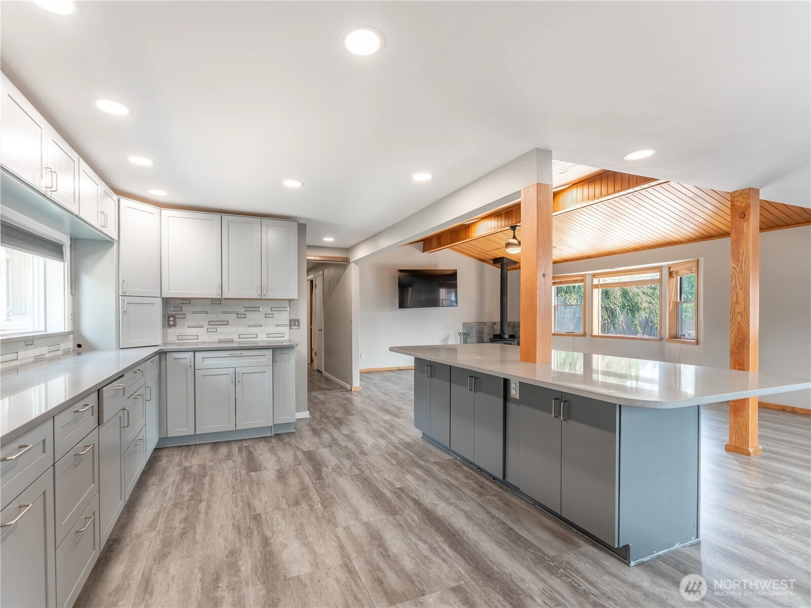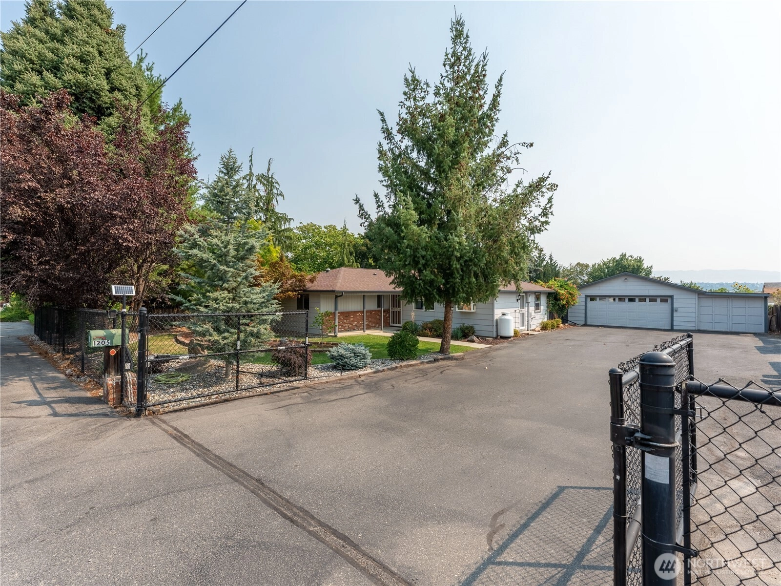 This beautifully remodeled 1,666 sq ft rambler sits on a 1/3-acre lot. The open-concept layout features vaulted ceilings, a cozy wood-burning fireplace, and durable LVP flooring—perfect for entertaining. The kitchen boasts stainless steel appliances, a gas cooktop, and plenty of counter space, complemented by quartz surfaces throughout. The spacious primary suite includes built-in closets, while the laundry room offers dual access from both the primary bathroom and hallway. Enjoy a private backyard for entertaining, along with RV parking with a 50-amp outlet, a detached 2+ car garage, separate office, multiple sheds, and a fully fenced yard with an electric gate for ultimate privacy.