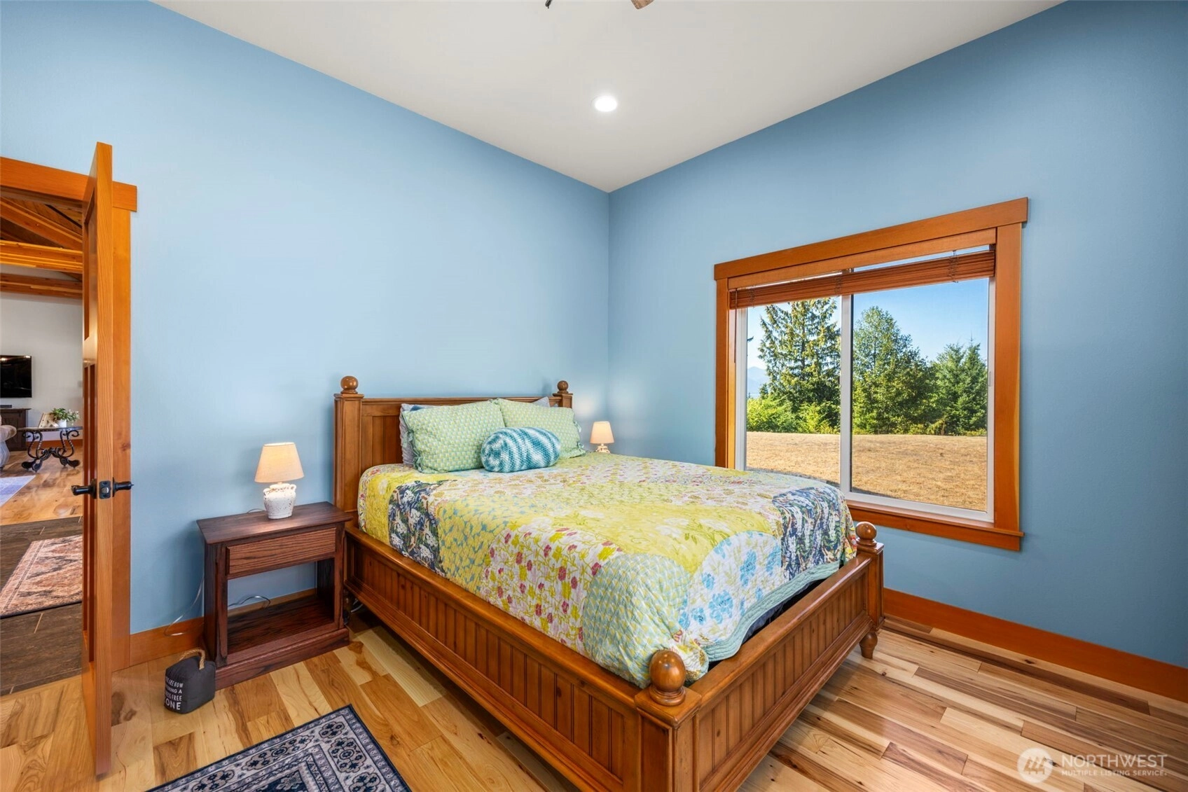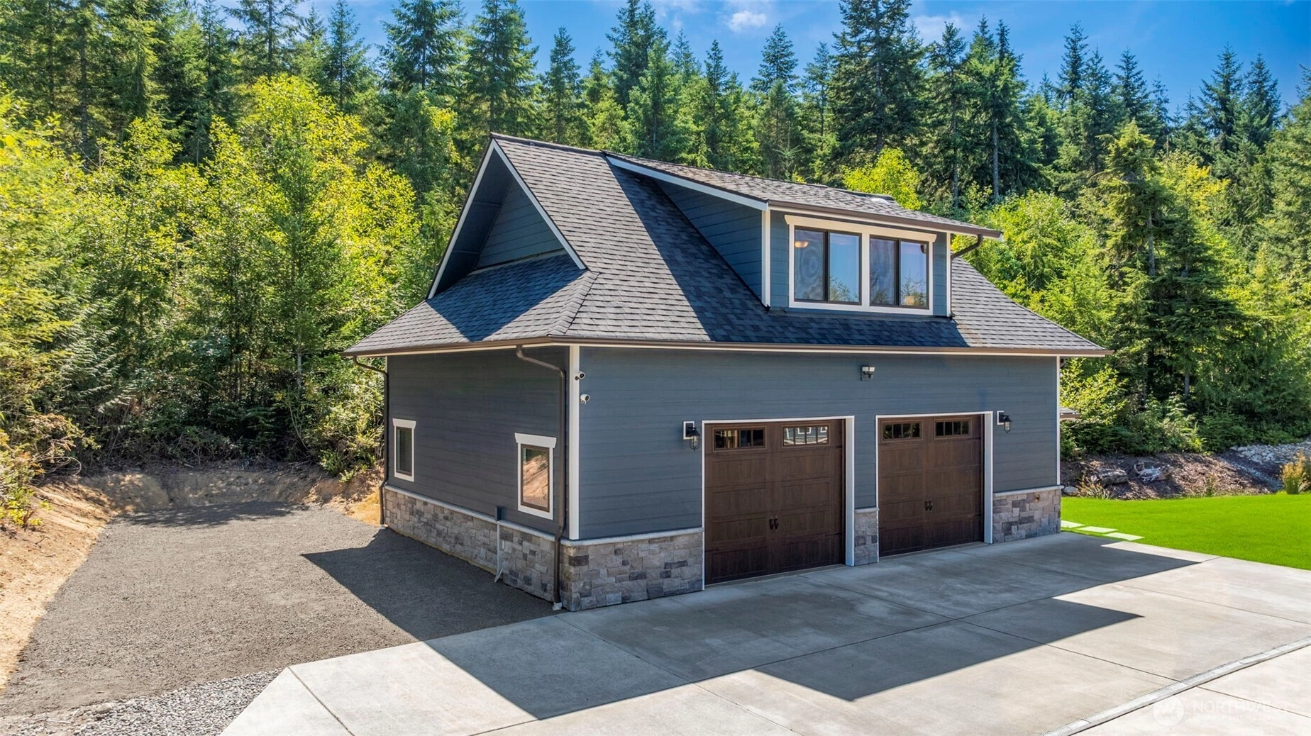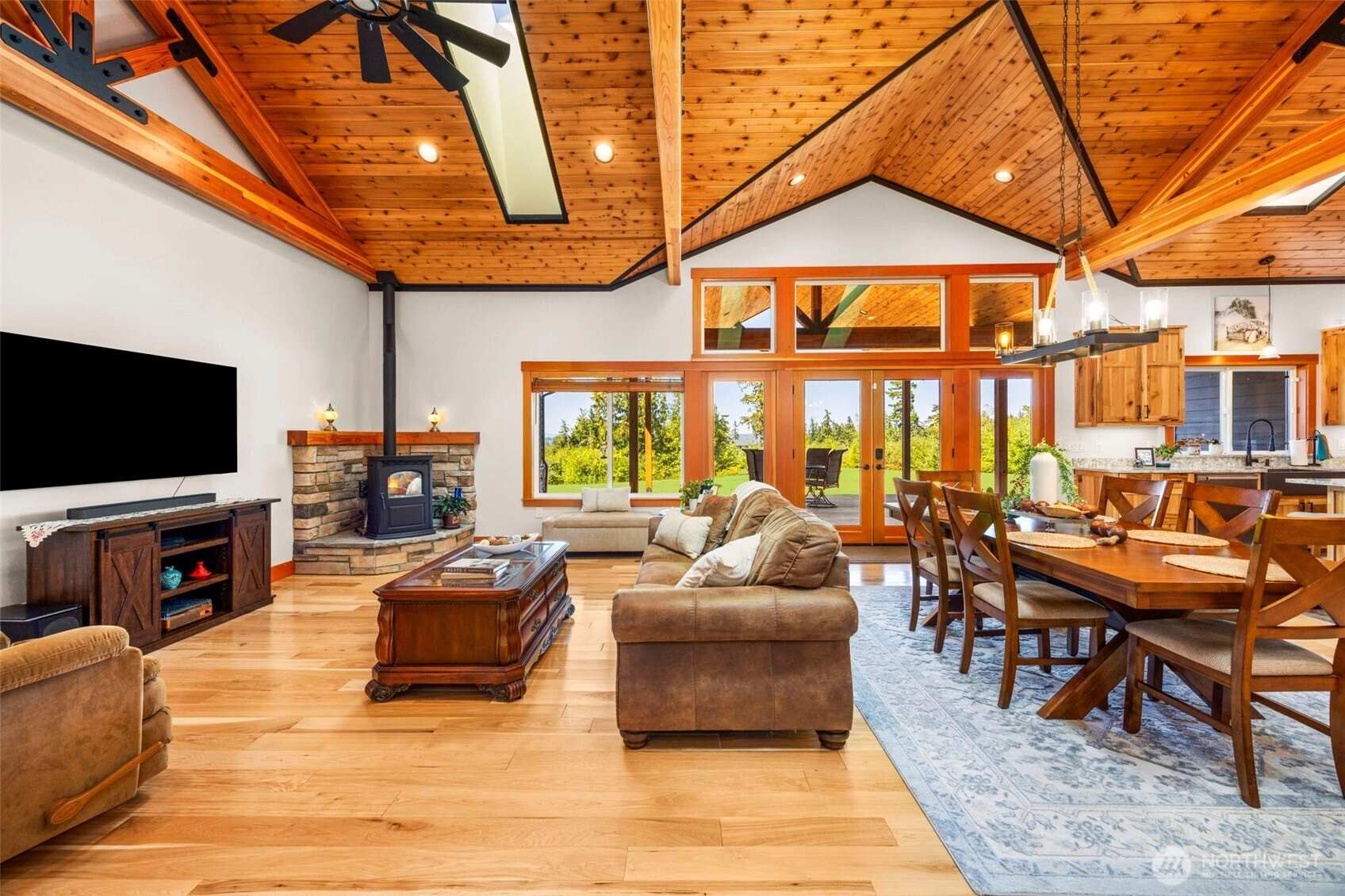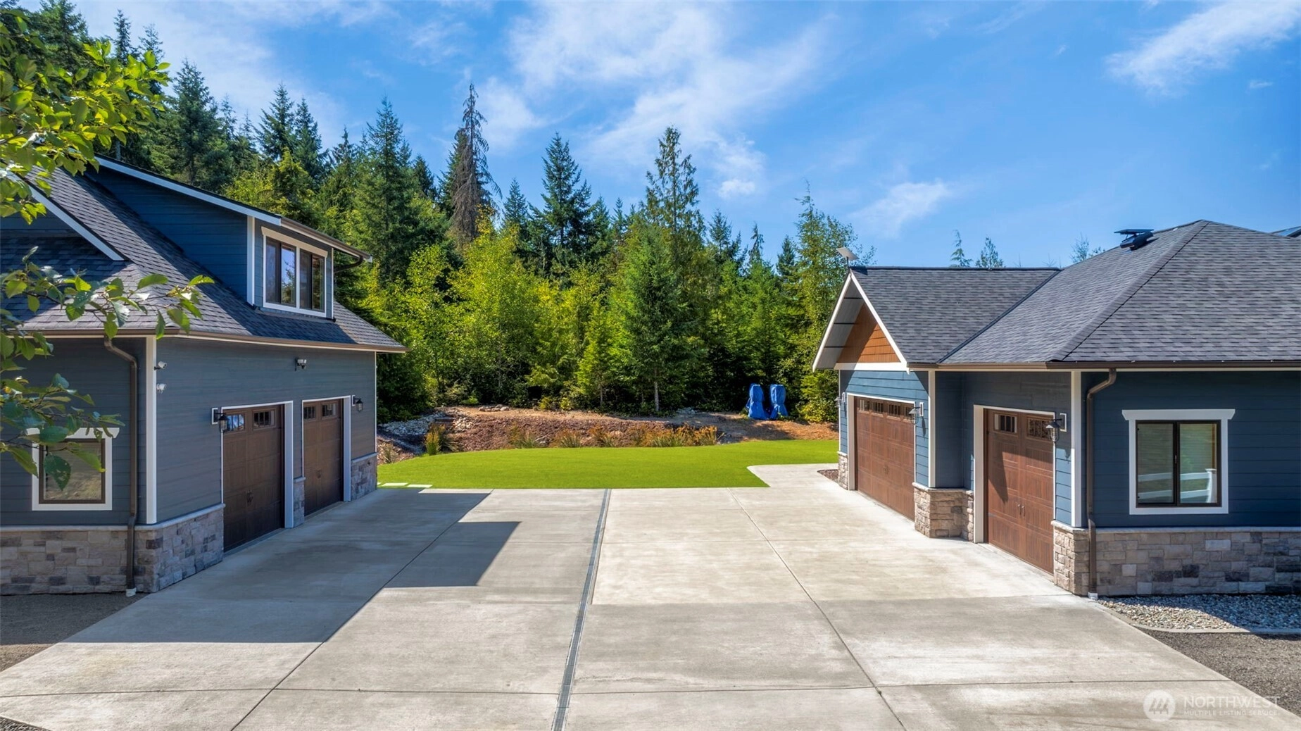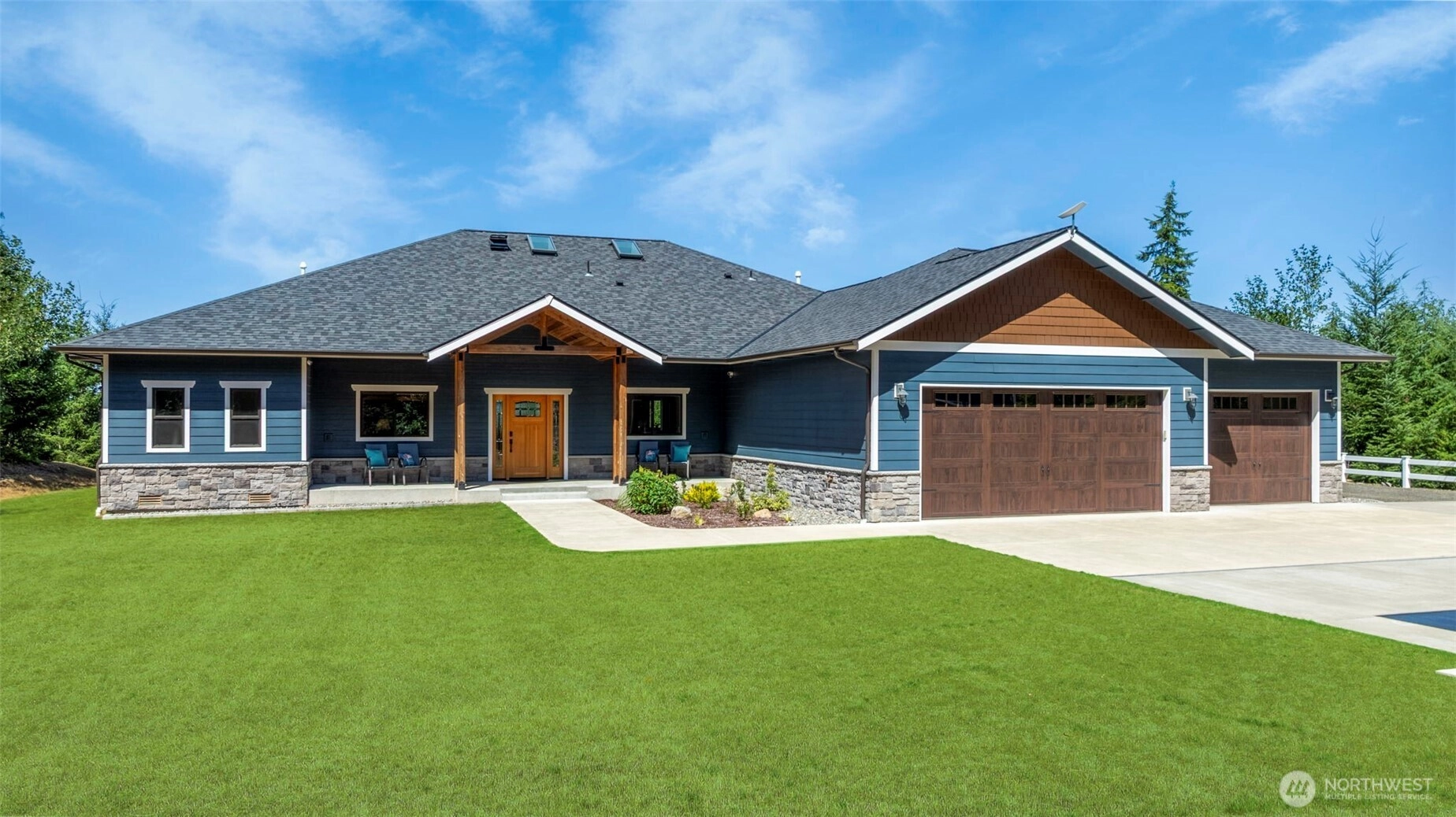 Meticulously crafted single-level home PLUS detached shop w/ guest quarters on 5 PRIVATE ACRES. Surrounded by picturesque water & mountain views. MAIN HOME consists of 3 bedrooms + office. Vaulted ceilings. French doors that open to covered patio - seamless indoor-outdoor living. Chef's kitchen equipped w/ Wolf appliances, custom cabinetry, double oven & spacious island, perfect for culinary creations. Retreat to the luxurious primary room complete w/ sunroom & gas fireplace. Spa-like ensuite bath w/ soaking tub, tile shower & extraordinary closet. Opposite side of the home you'll find two additional bedrooms w/ connected bathroom. Beautiful guest space sits atop the detached shop, complete w/ bathroom & bedroom. See attached video tour!