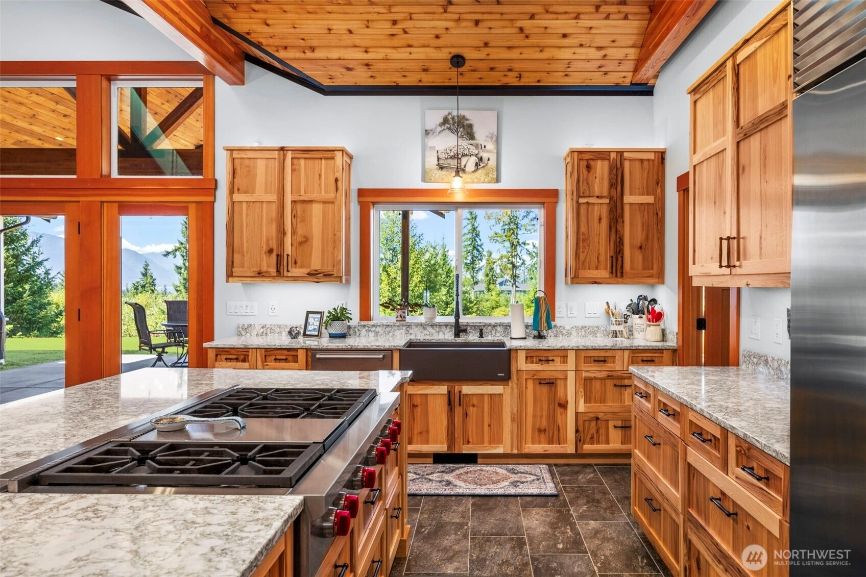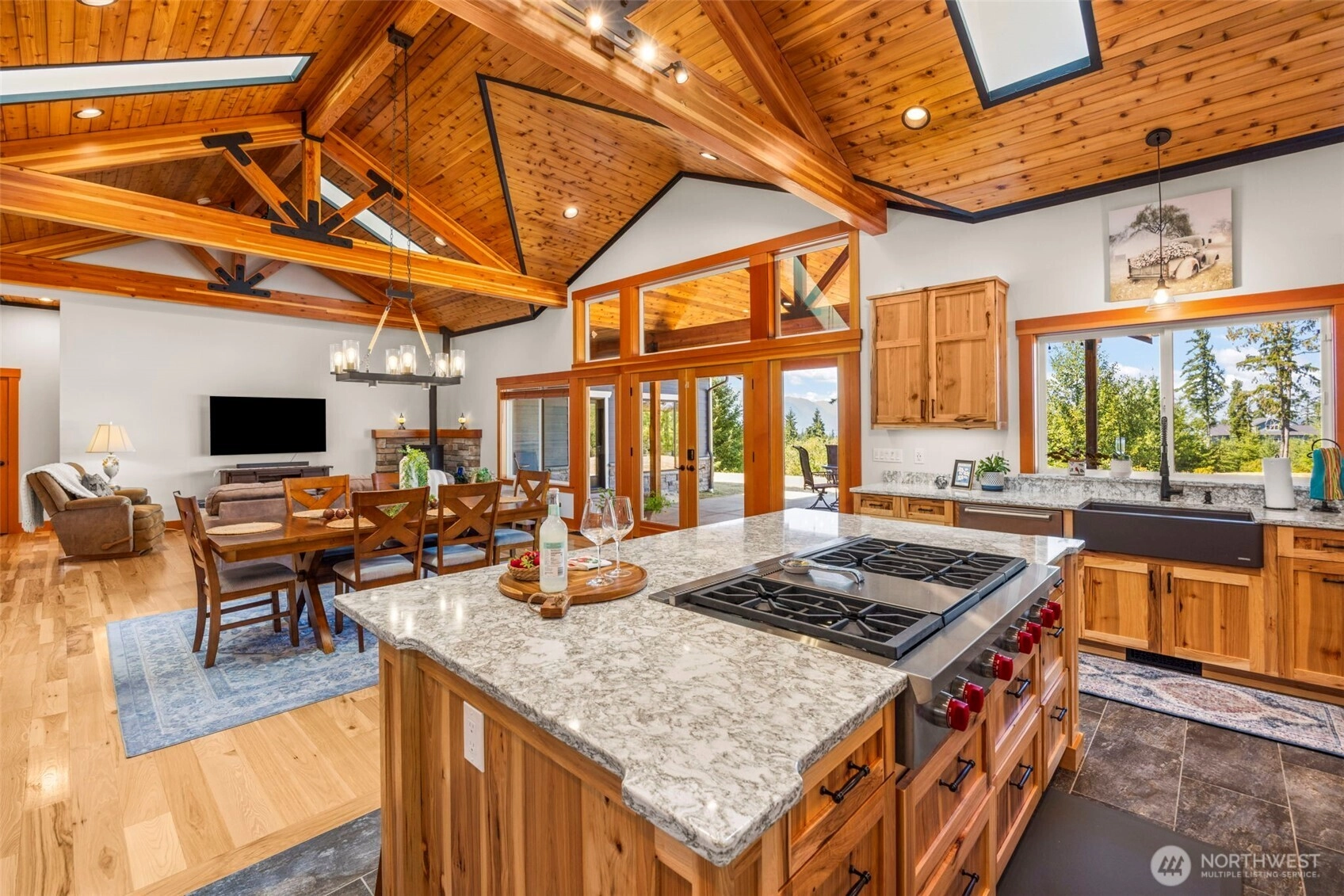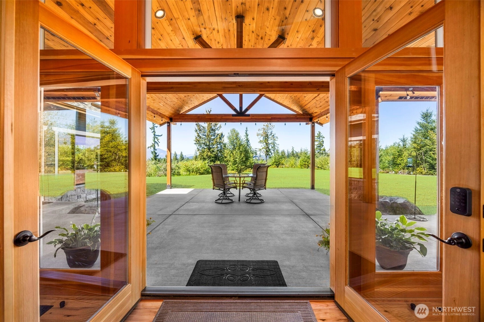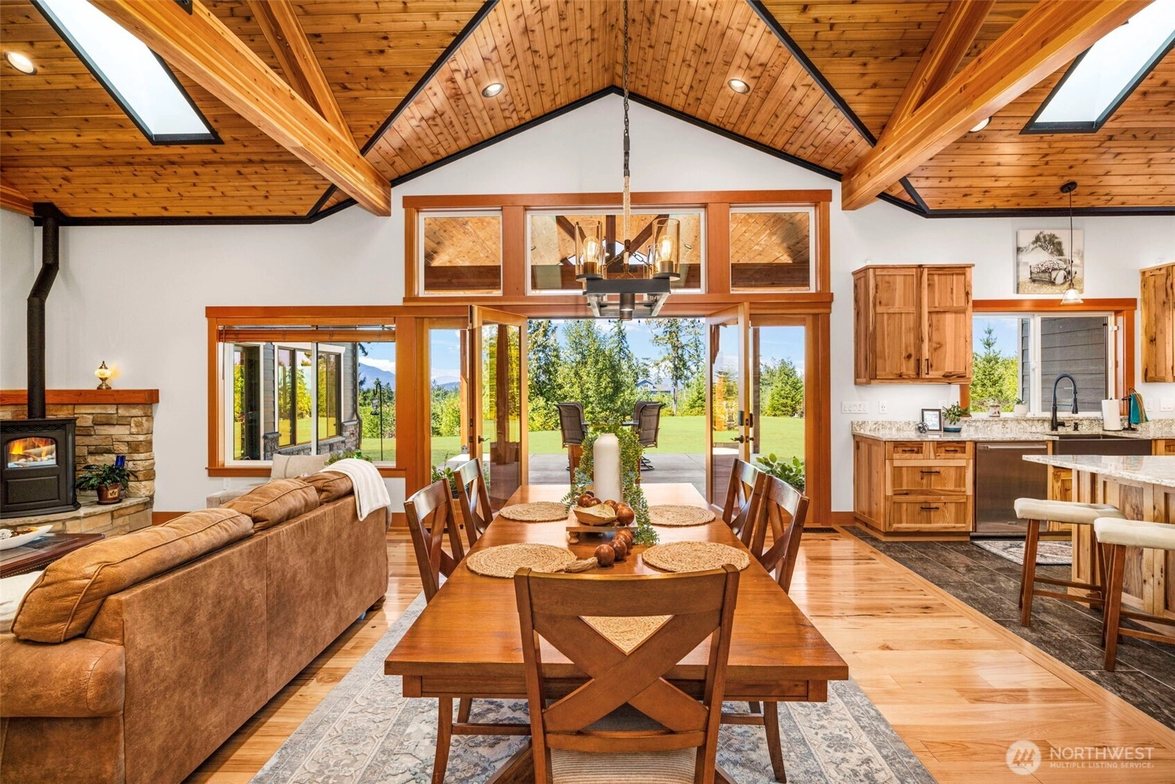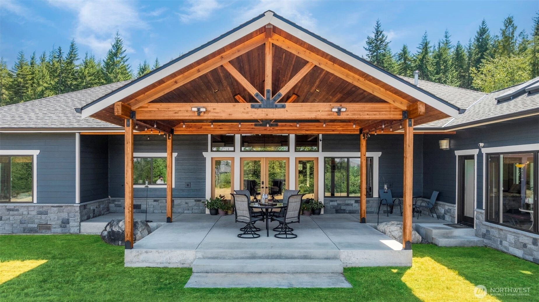 Meticulously crafted single-level home PLUS detached shop w/ guest quarters on 5 PRIVATE ACRES. Surrounded by picturesque water & mountain views. MAIN HOME consists of 3 bedrooms + office. Vaulted ceilings. French doors that open to covered patio - seamless indoor-outdoor living. Chef's kitchen equipped w/ Wolf appliances, custom cabinetry, double oven & spacious island, perfect for culinary creations. Retreat to the luxurious primary room complete w/ sunroom & gas fireplace. Spa-like ensuite bath w/ soaking tub, tile shower & extraordinary closet. Opposite side of the home you'll find two additional bedrooms w/ connected bathroom. Beautiful guest space sits atop the detached shop, complete w/ bathroom & bedroom. See attached video tour!