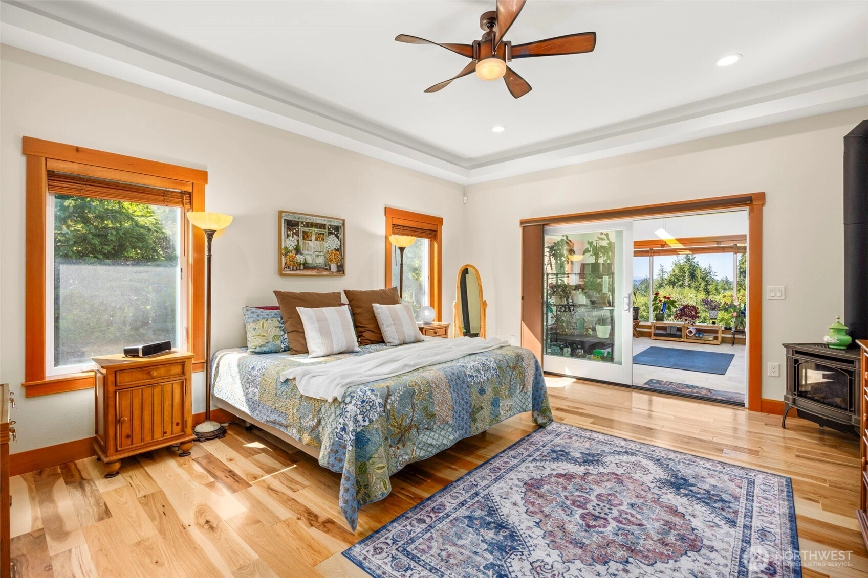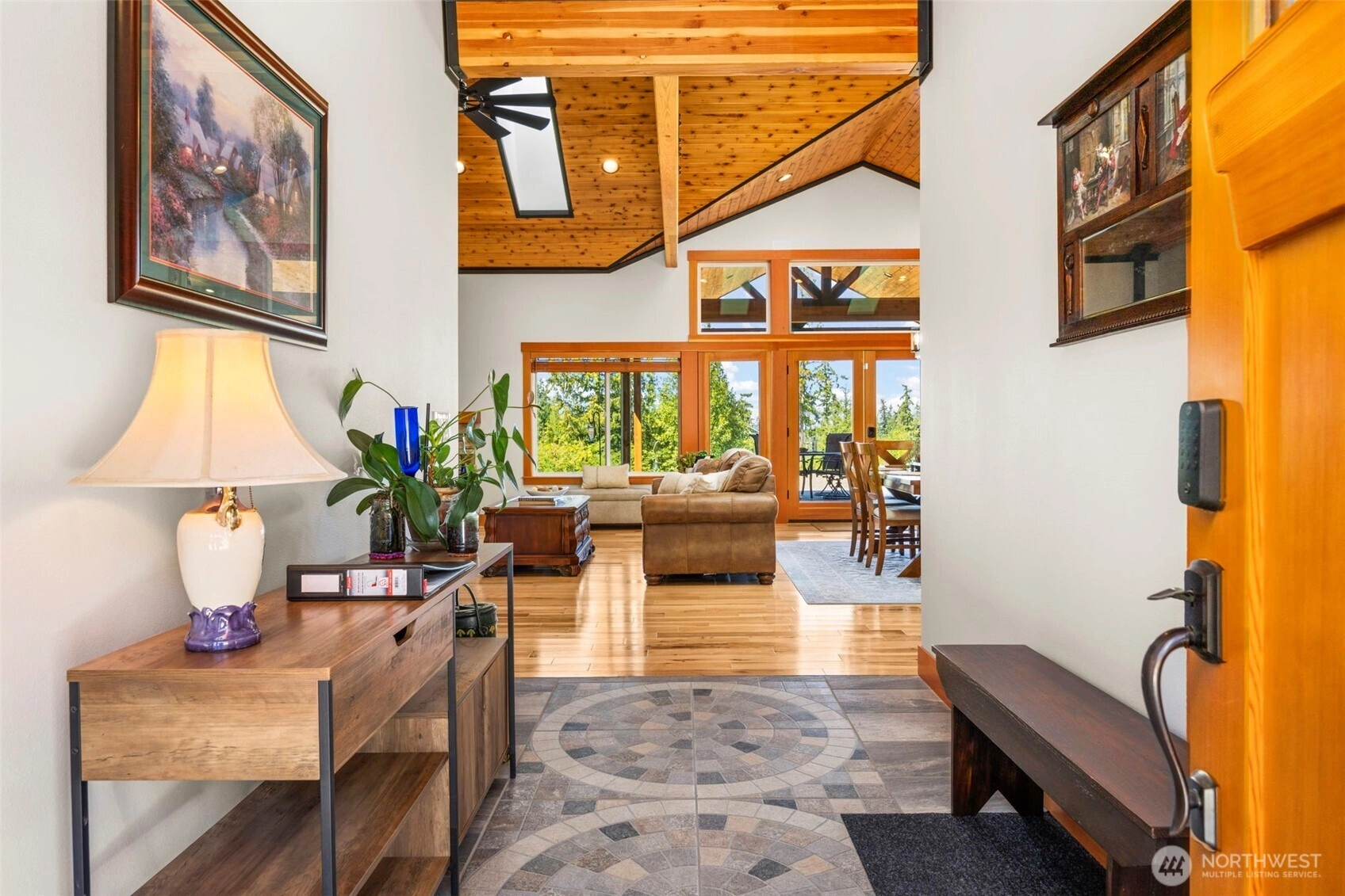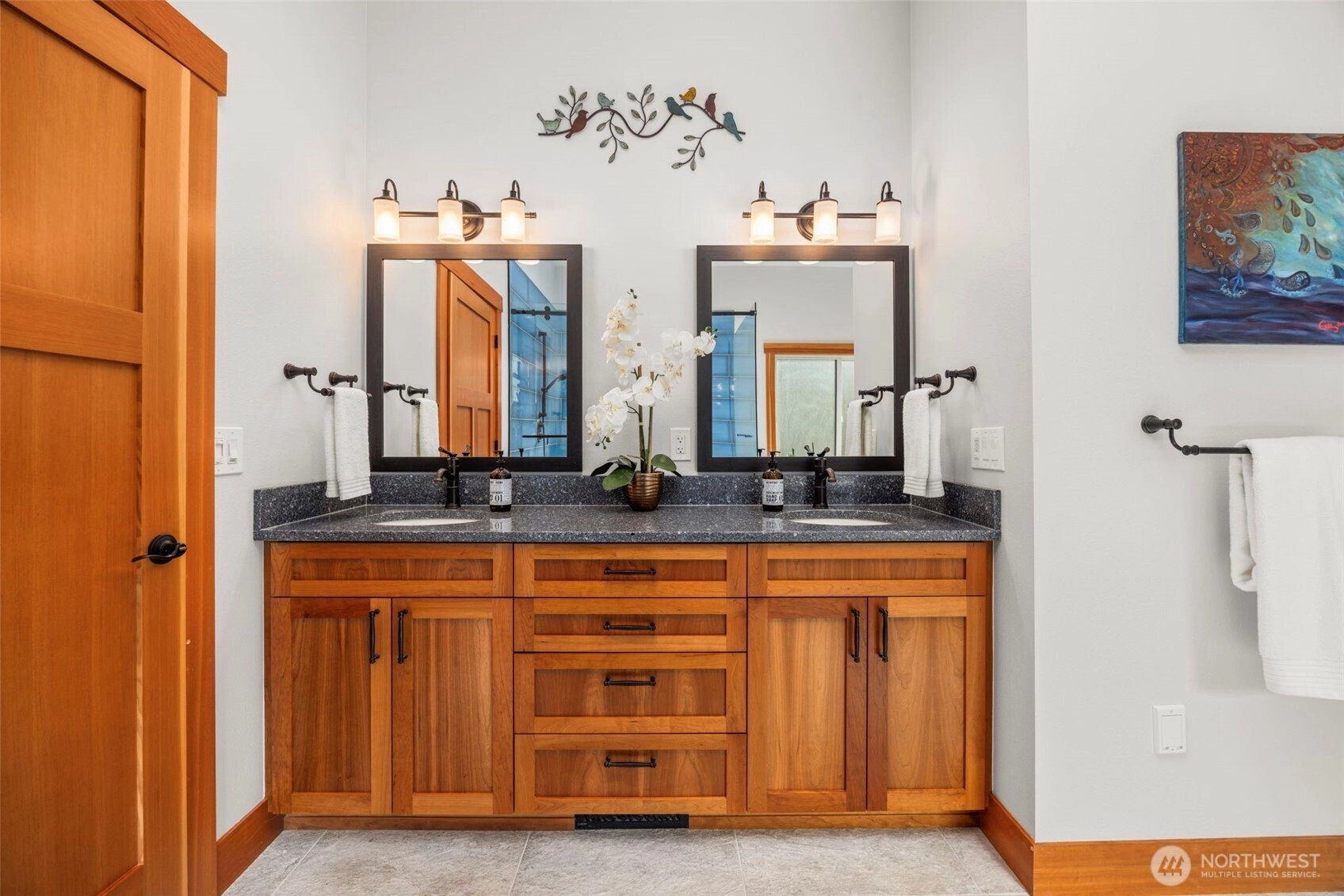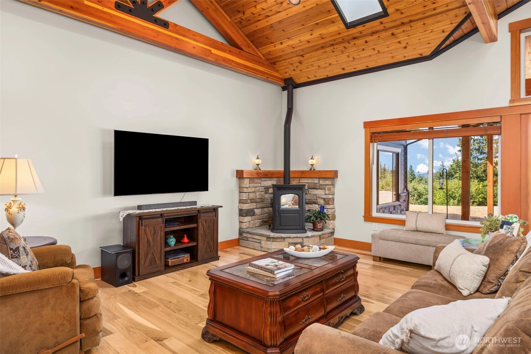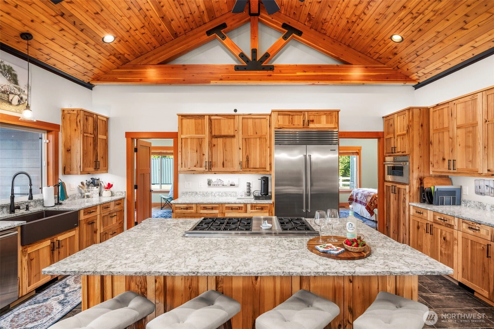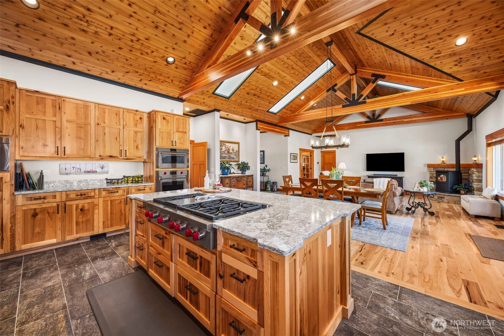Meticulously crafted single-level home PLUS detached shop w/ guest quarters on 5 PRIVATE ACRES. Surrounded by picturesque water & mountain views. MAIN HOME consists of 3 bedrooms + office. Vaulted ceilings. French doors that open to covered patio - seamless indoor-outdoor living. Chef's kitchen equipped w/ Wolf appliances, custom cabinetry, double oven & spacious island, perfect for culinary creations. Retreat to the luxurious primary room complete w/ sunroom & gas fireplace. Spa-like ensuite bath w/ soaking tub, tile shower & extraordinary closet. Opposite side of the home you'll find two additional bedrooms w/ connected bathroom. Beautiful guest space sits atop the detached shop, complete w/ bathroom & bedroom. See attached video tour!