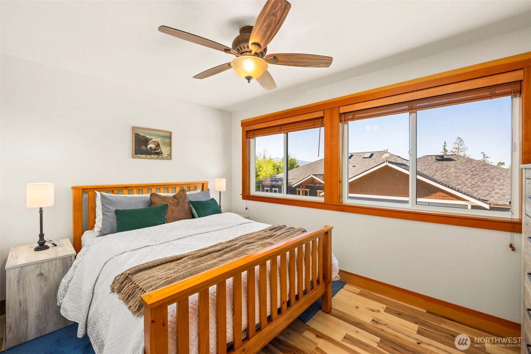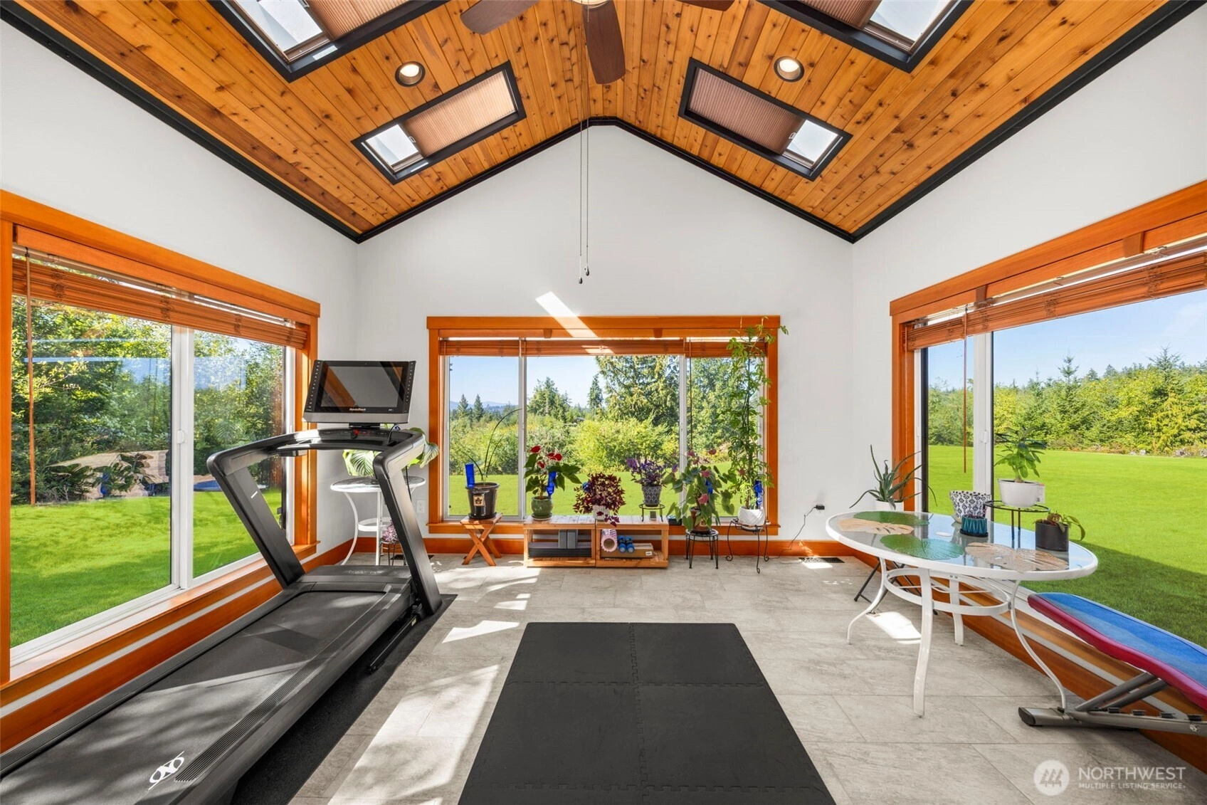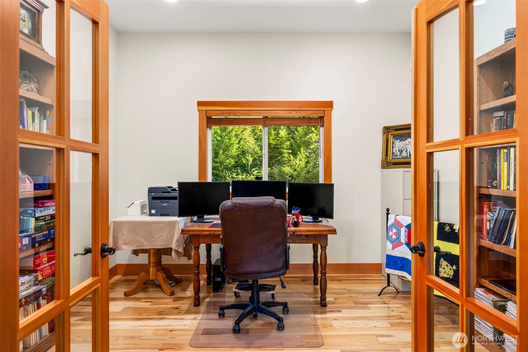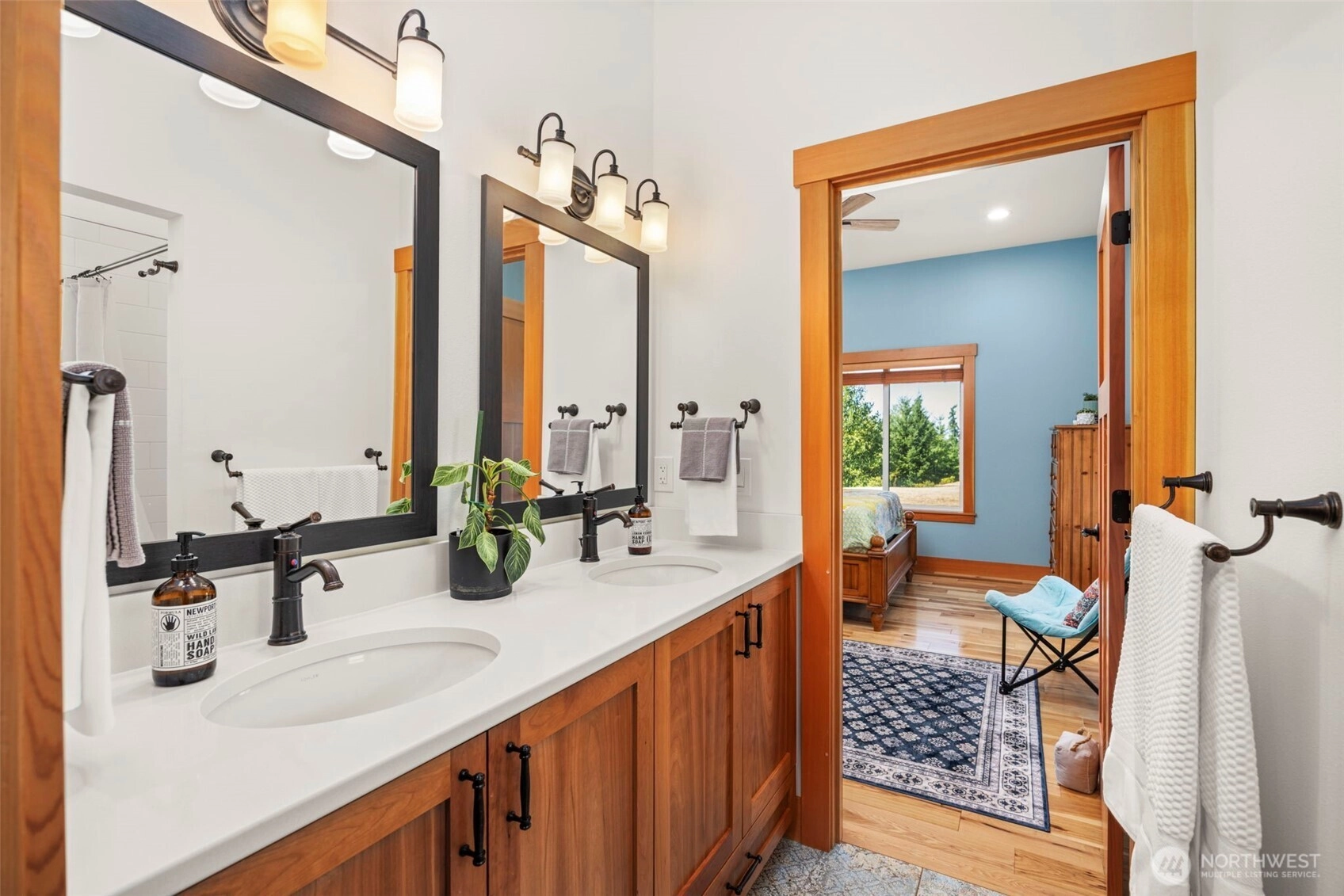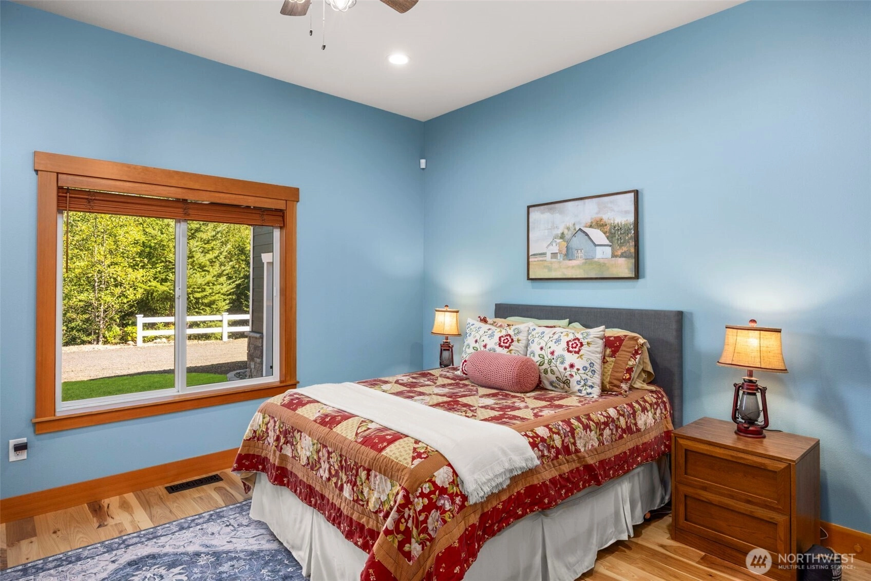 Meticulously crafted single-level home PLUS detached shop w/ guest quarters on 5 PRIVATE ACRES. Surrounded by picturesque water & mountain views. MAIN HOME consists of 3 bedrooms + office. Vaulted ceilings. French doors that open to covered patio - seamless indoor-outdoor living. Chef's kitchen equipped w/ Wolf appliances, custom cabinetry, double oven & spacious island, perfect for culinary creations. Retreat to the luxurious primary room complete w/ sunroom & gas fireplace. Spa-like ensuite bath w/ soaking tub, tile shower & extraordinary closet. Opposite side of the home you'll find two additional bedrooms w/ connected bathroom. Beautiful guest space sits atop the detached shop, complete w/ bathroom & bedroom. See attached video tour!