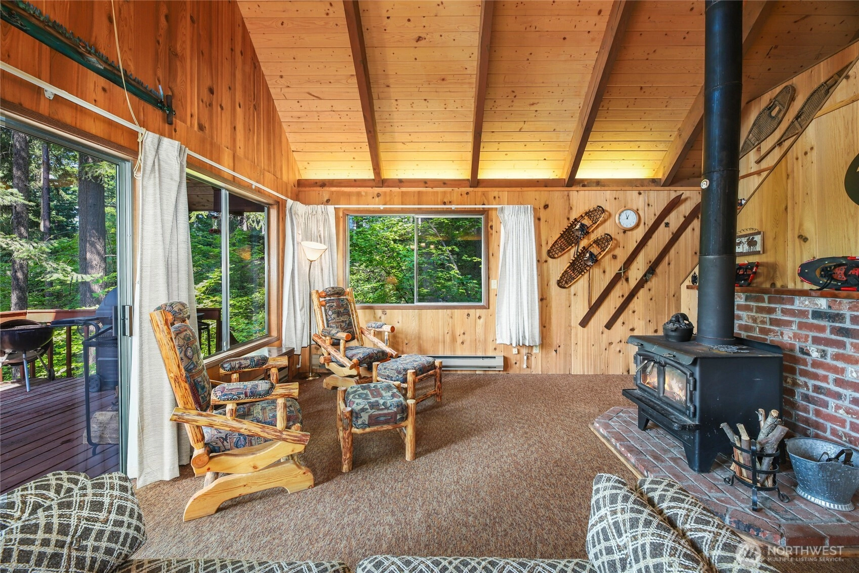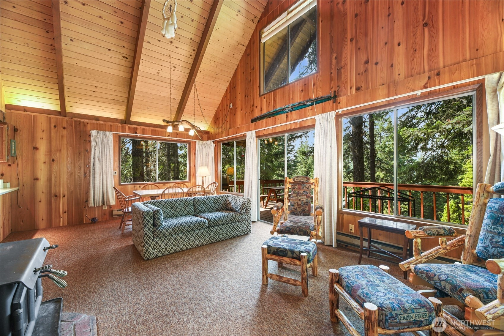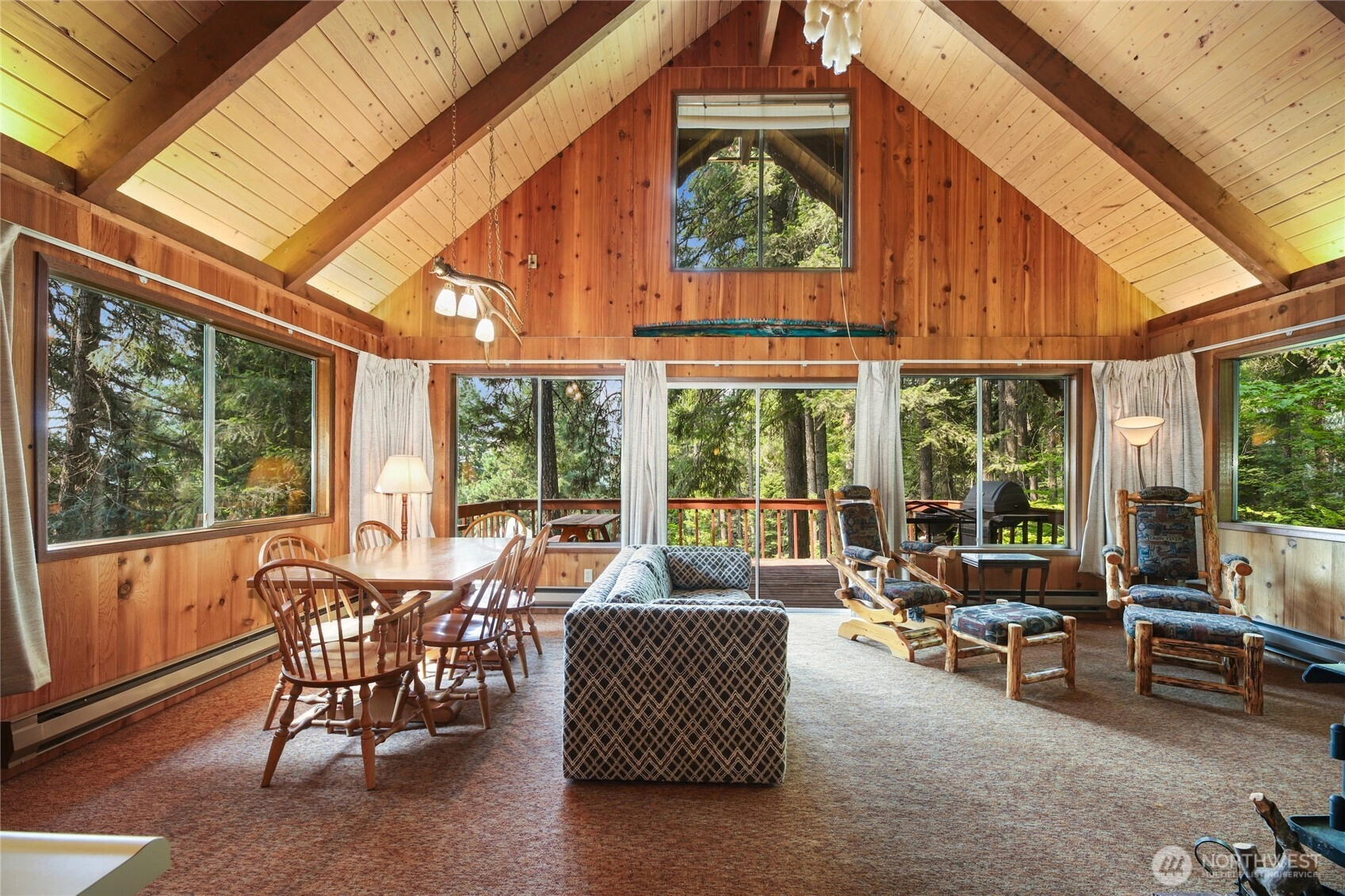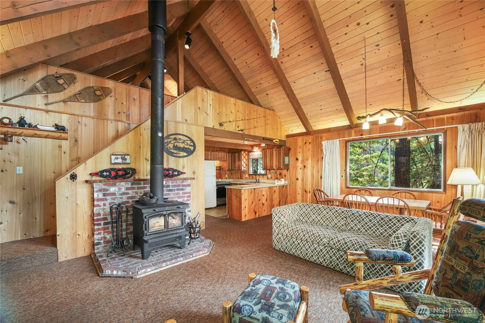 Discover the perfect blend of comfort and character in this inviting 2-bedroom, 1.5-bath home nestled in the desirable Pine Lock Sun community. Step inside to a spacious great room featuring vaulted ceilings, exposed beams, and a cozy wood stove—perfect for relaxing after a day outdoors. A versatile loft overlooks the main living space, offering a bedroom/sleeping space with room for multiple beds/guest or create a private primary.Enjoy the outdoors year-round with a large deck ideal for entertaining or taking in the surrounding natural beauty. The lower level includes a second living area—perfect as a media room, den, or guest space—as well as a large shop area in the basement for hobbies, storage, or your next creative project.