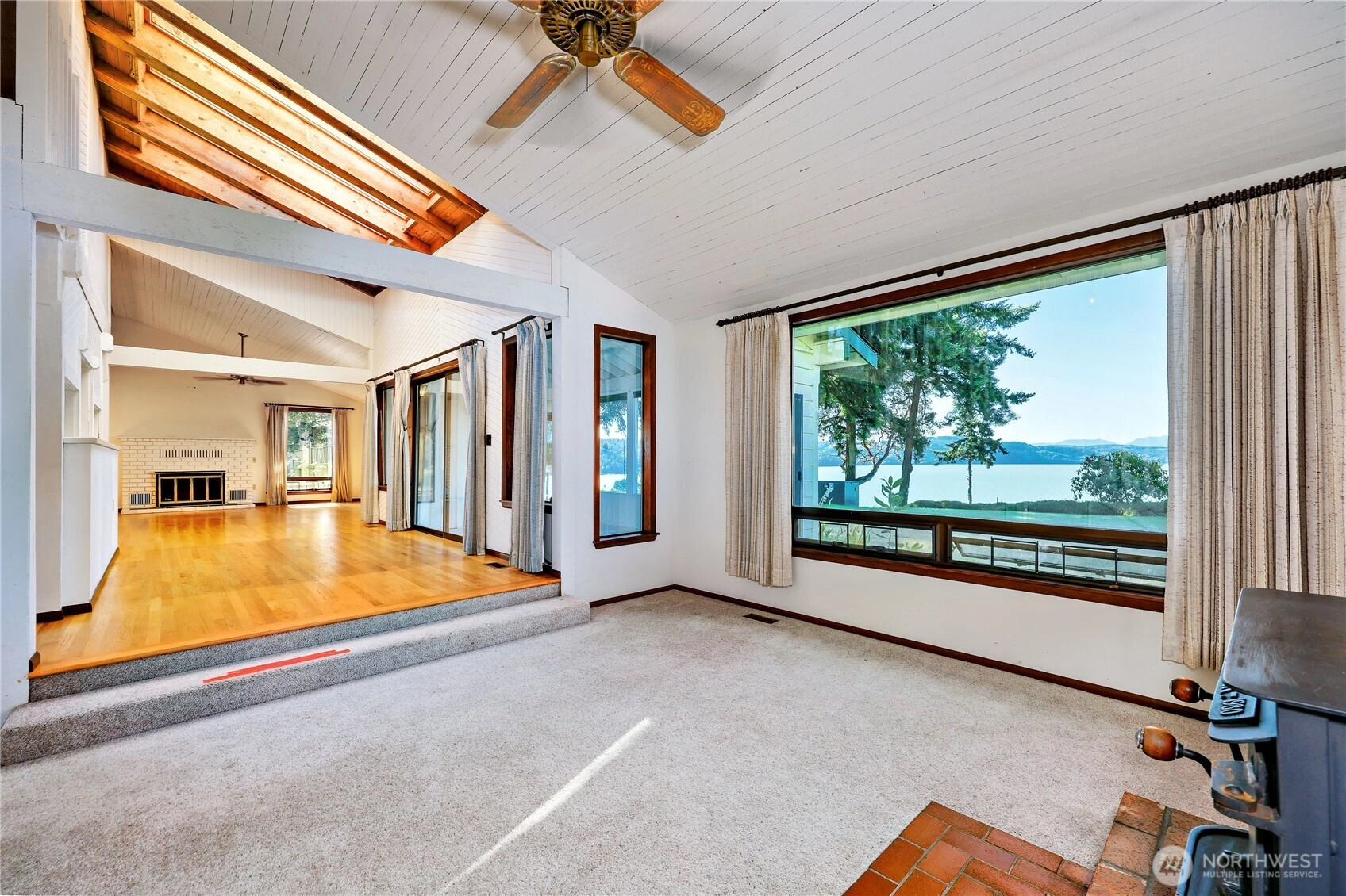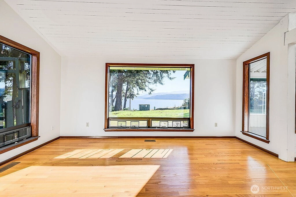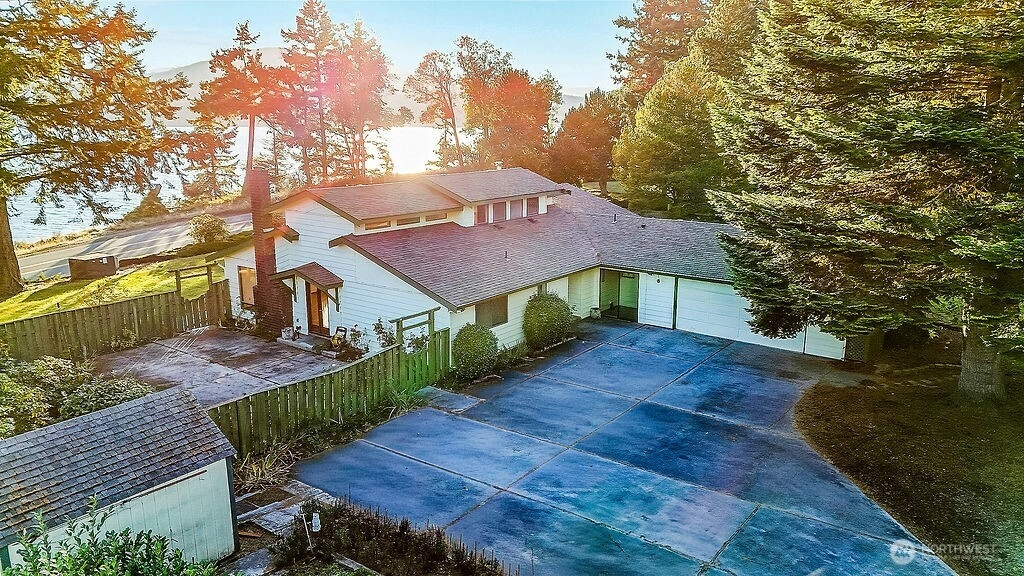 Imagine a view so stunning, it looks like you can reach out & touch the mountains and water. This gorgeous home sits on 1/2+ acres, with irrigated flower beds and mature trees. Solid hardwood floors, a fireplace, and a wood-burning stove are part of this well-built custom house, and the primary bathroom has wonderful natural light from the large wrap-around glass block window. There are breathtaking views from the entire South side of this home and beach access just a quick stroll away. A large 2-car garage and a storage shed keep your driveway open for guests or even an RV. Fresh air and beauty right outside your door will feel like paradise. You'll see it and realize why the homeowners held onto this gem for the past 40+ years.