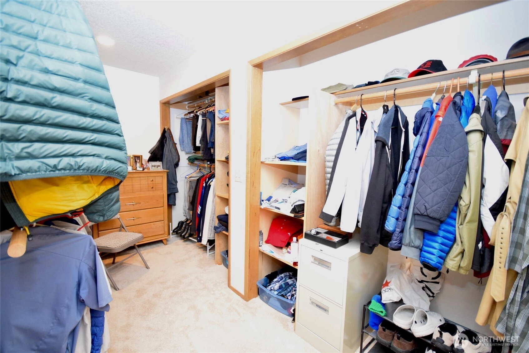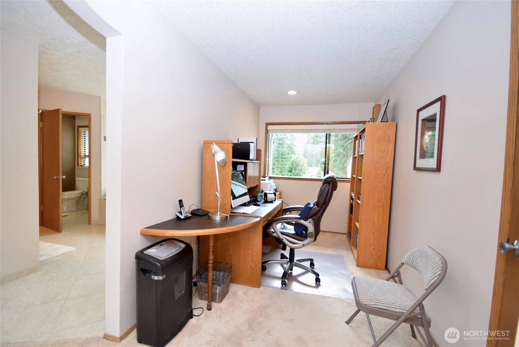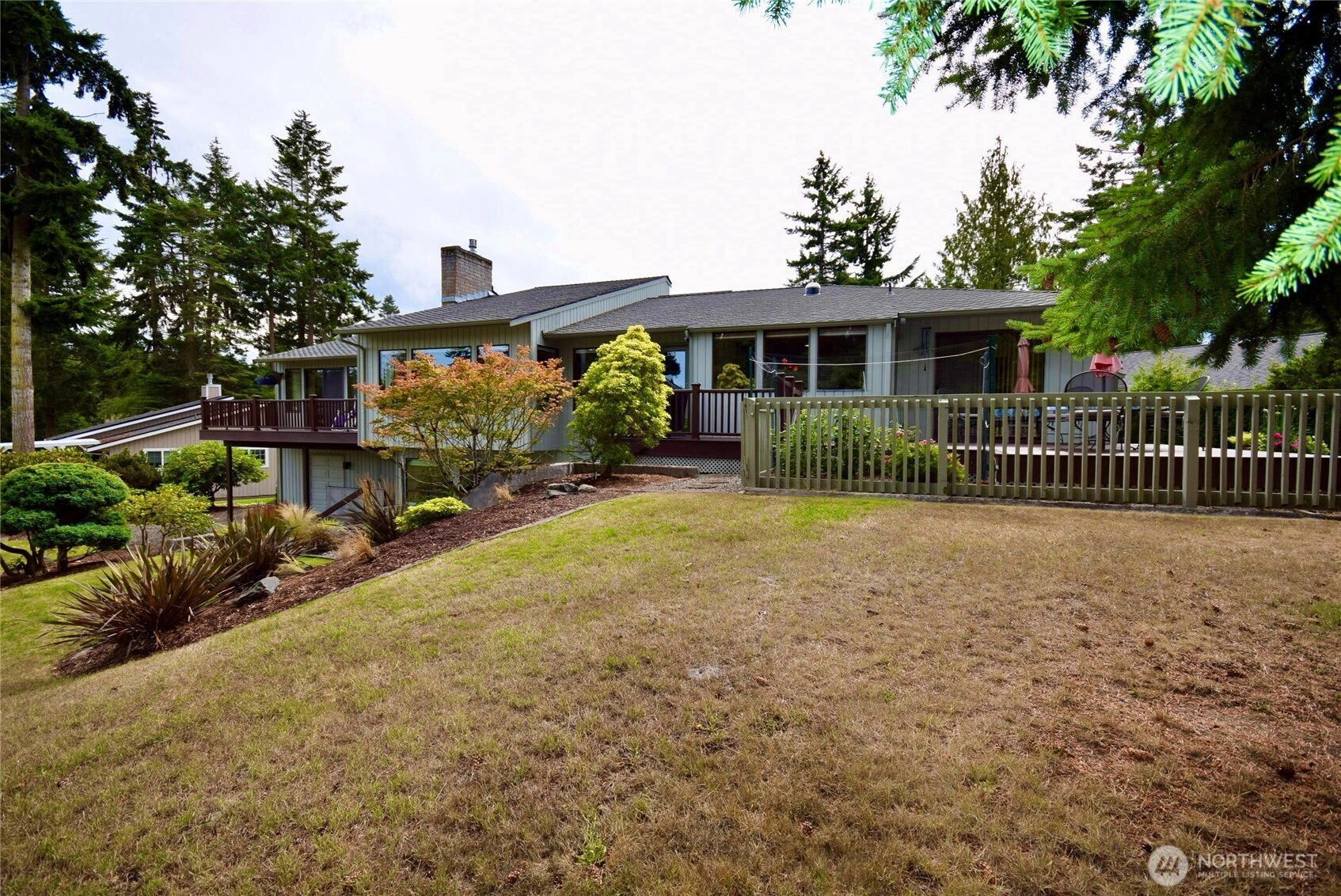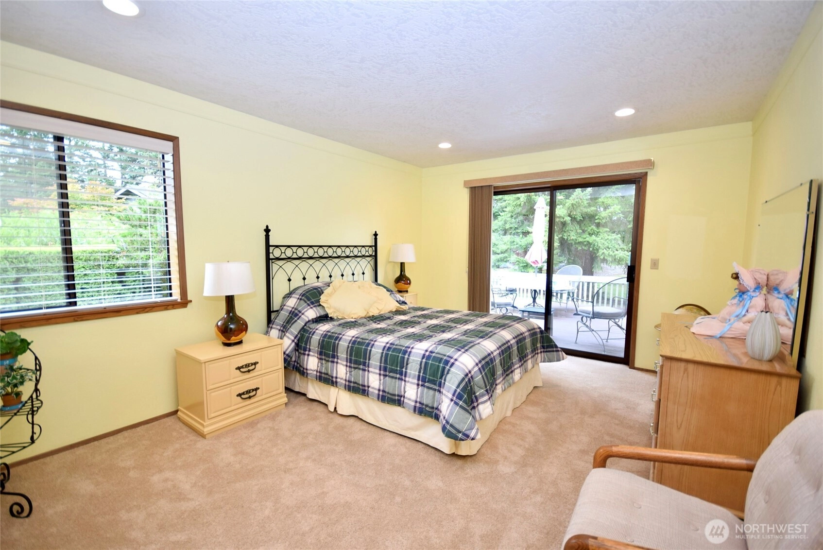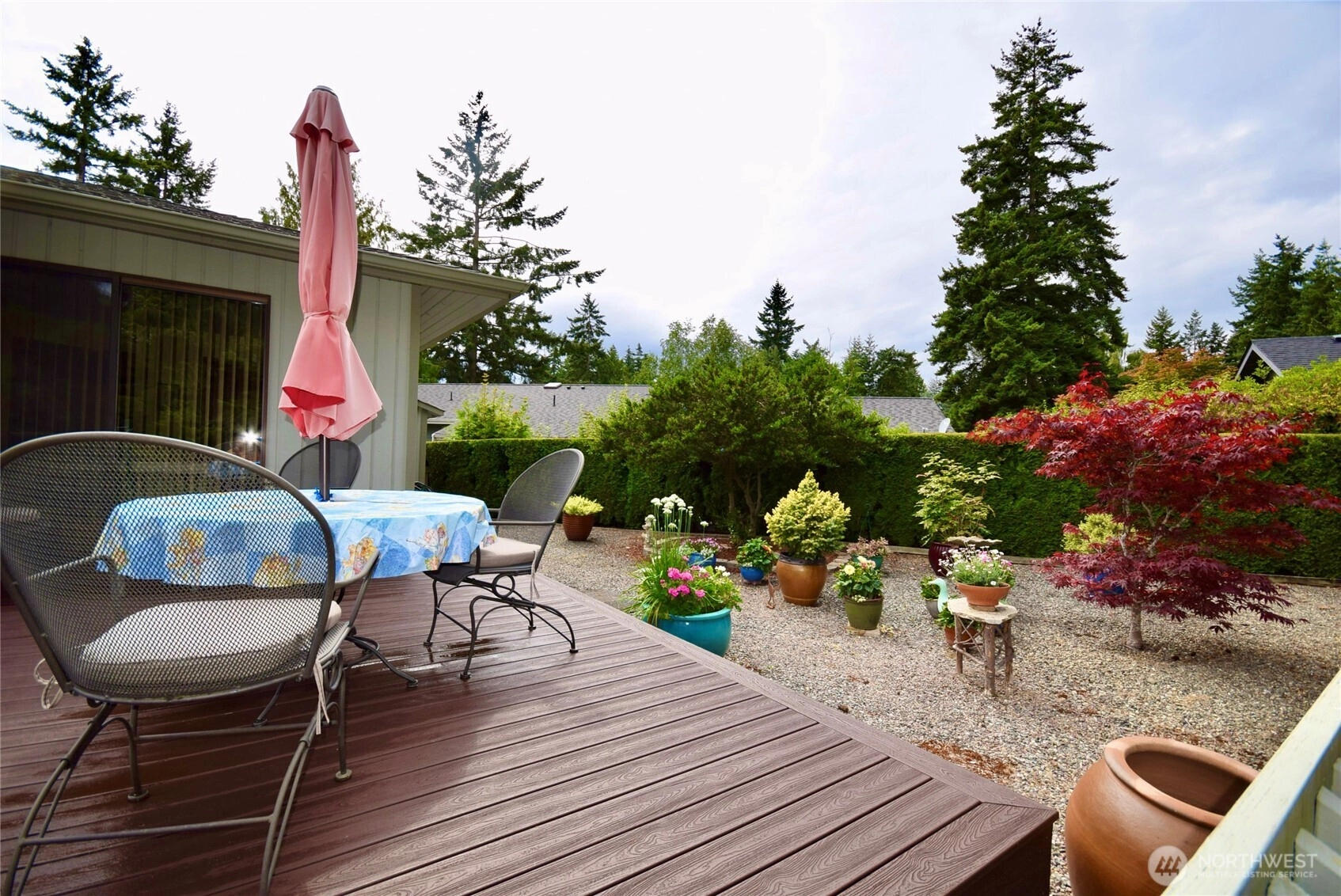 Stunning, contemporary house in Sunland, on premier lot with views of golf course, greenbelt & pond. Lots of windows for views & sun. Living room has vaulted fir ceiling with floor to ceiling fireplace. Fab kitchen updates. Two ensuite bedrooms. Primary bedroom has office space, walk-in closet, double wall closet, built-in dresser & private deck. Primary bath was completely remodeled with large walk-in shower, Thermo massage air jet tub, double sinks, heated floor & separate toilet. All rooms are oversized with lots of storage. Downstairs has rec room large enough for a pool table, built in desk & shelves, & wood stove. Large laundry room & storage closet under stairs are also downstairs. Garage has Penntek flooring & golf cart door.