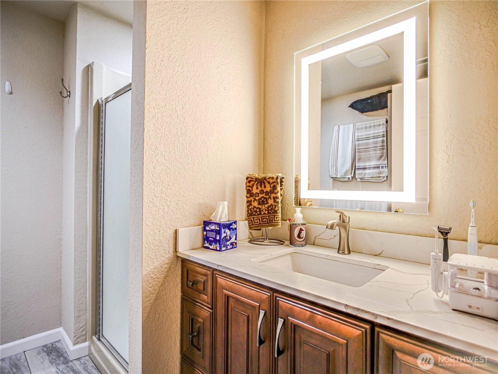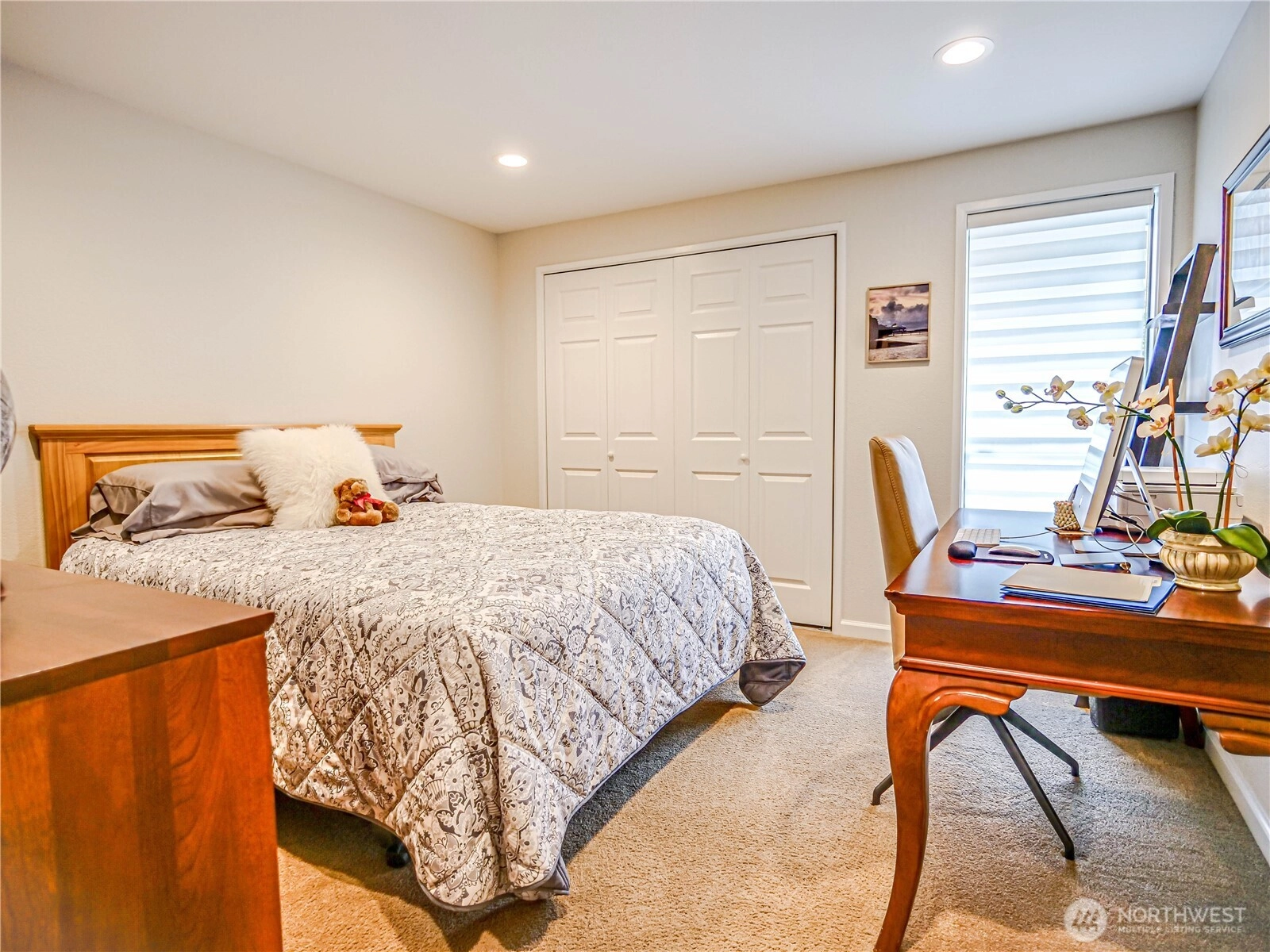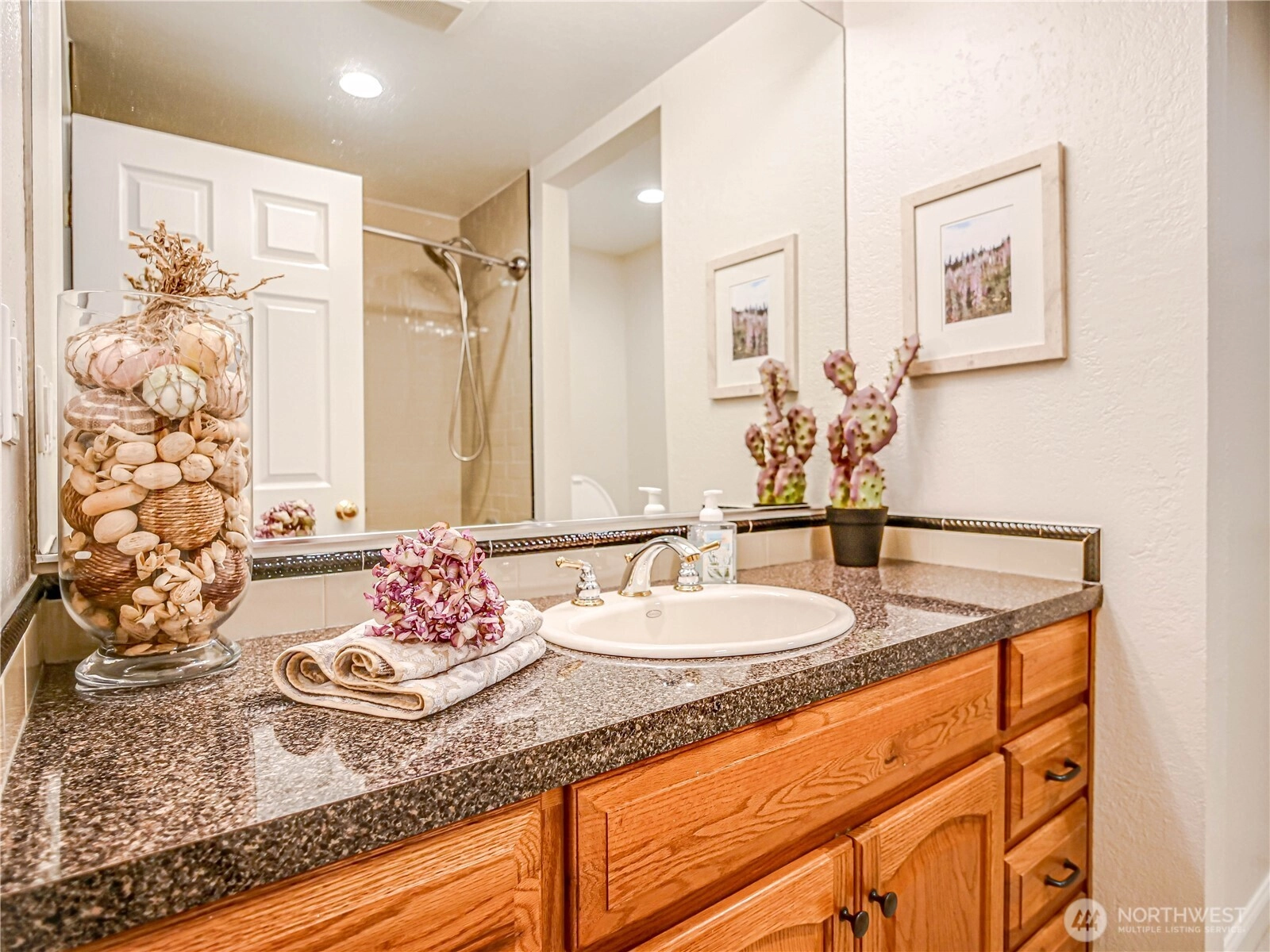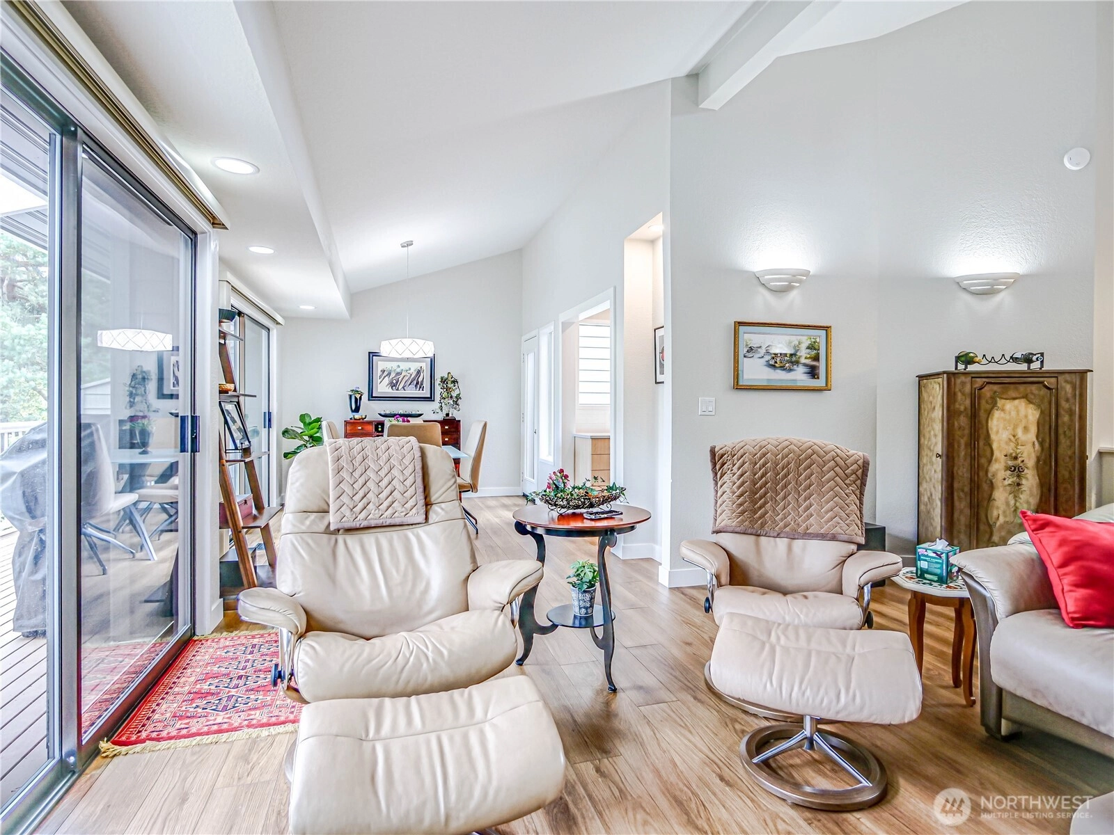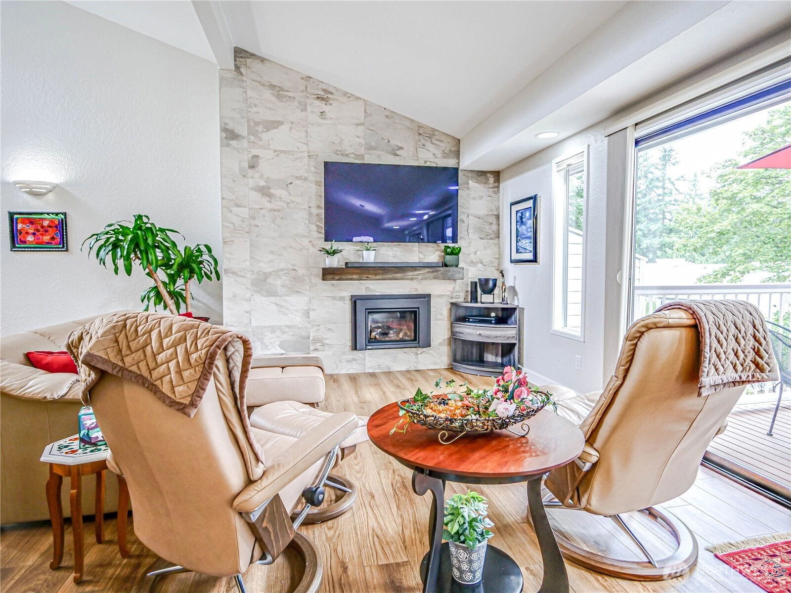Welcome to Fairway Village One! Luxury living in a mindfully updated home. Main floor features Primary Bedroom with walk in closet, lovely shower & dual sinks, heated towel rack. Open & bright living room w/vaulted ceilings & full wall gas FP. Cheerful kitchen w/high end appliances , open to Atrium, dining room w/patio doors to large deck, great for entertaining. Lower level offers a large family room w/kitchenette, 2nd gas FP, & the 3rd BR private guest suite w/two-person hot tub on patio. Oversized 2-car garage with workshop, extra Refrigerator & plenty of storage. This flexible floor plan ideal for entertaining or multi-generational living. Low interest assumable VA loan available to all Buyers.Mill Creek TC Golf Club, parks & trails.