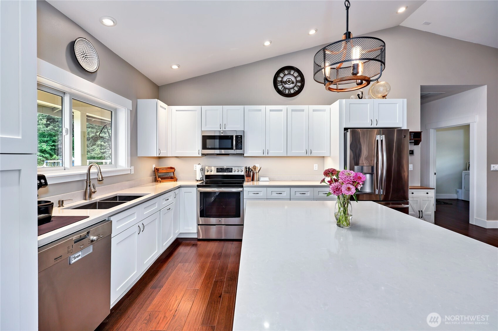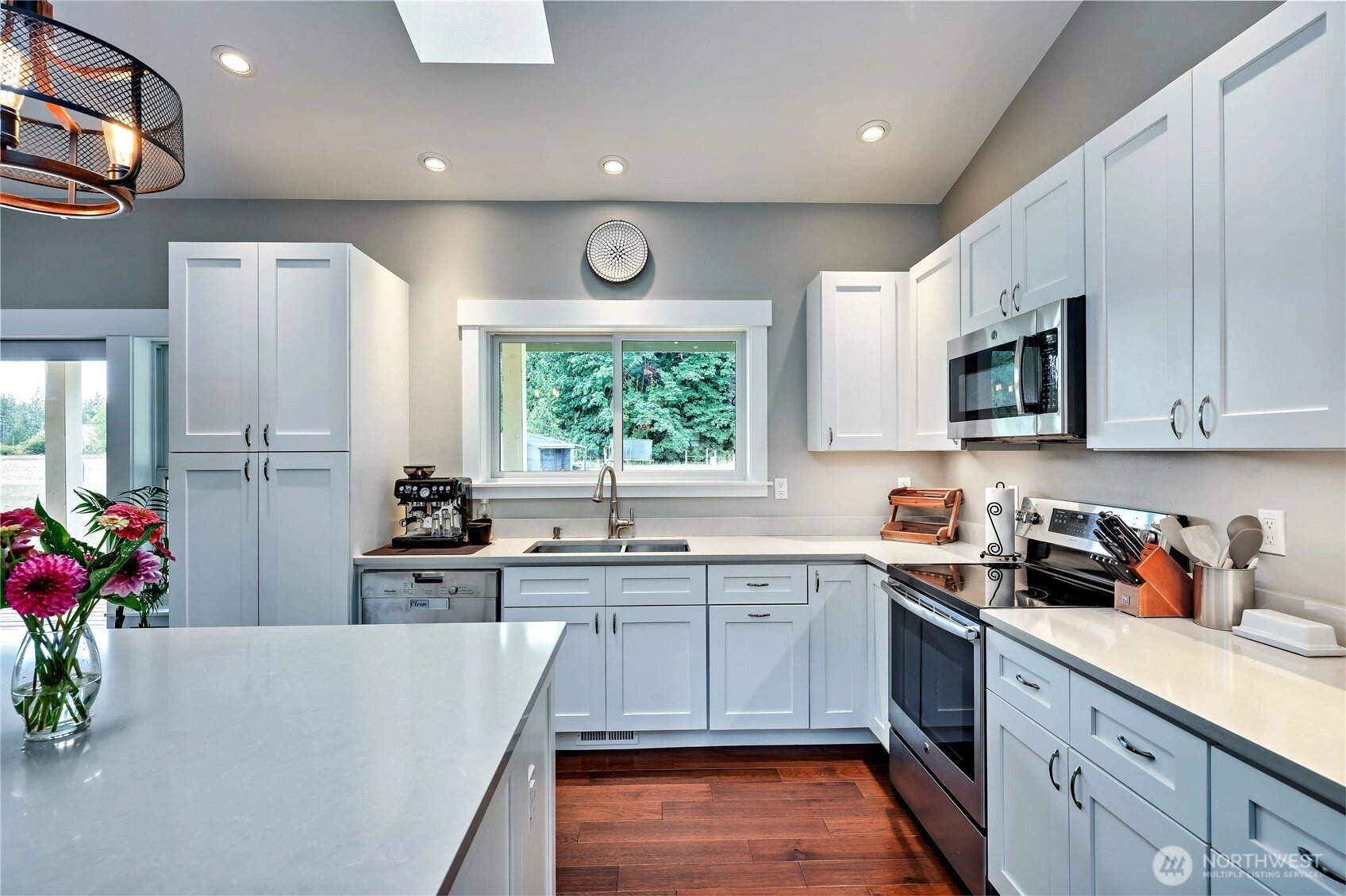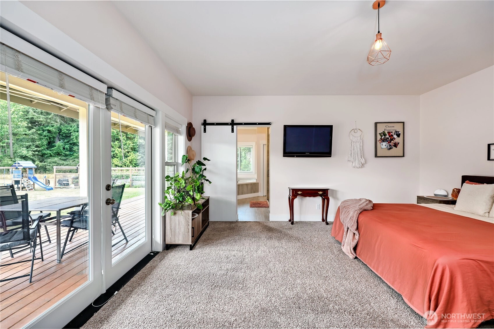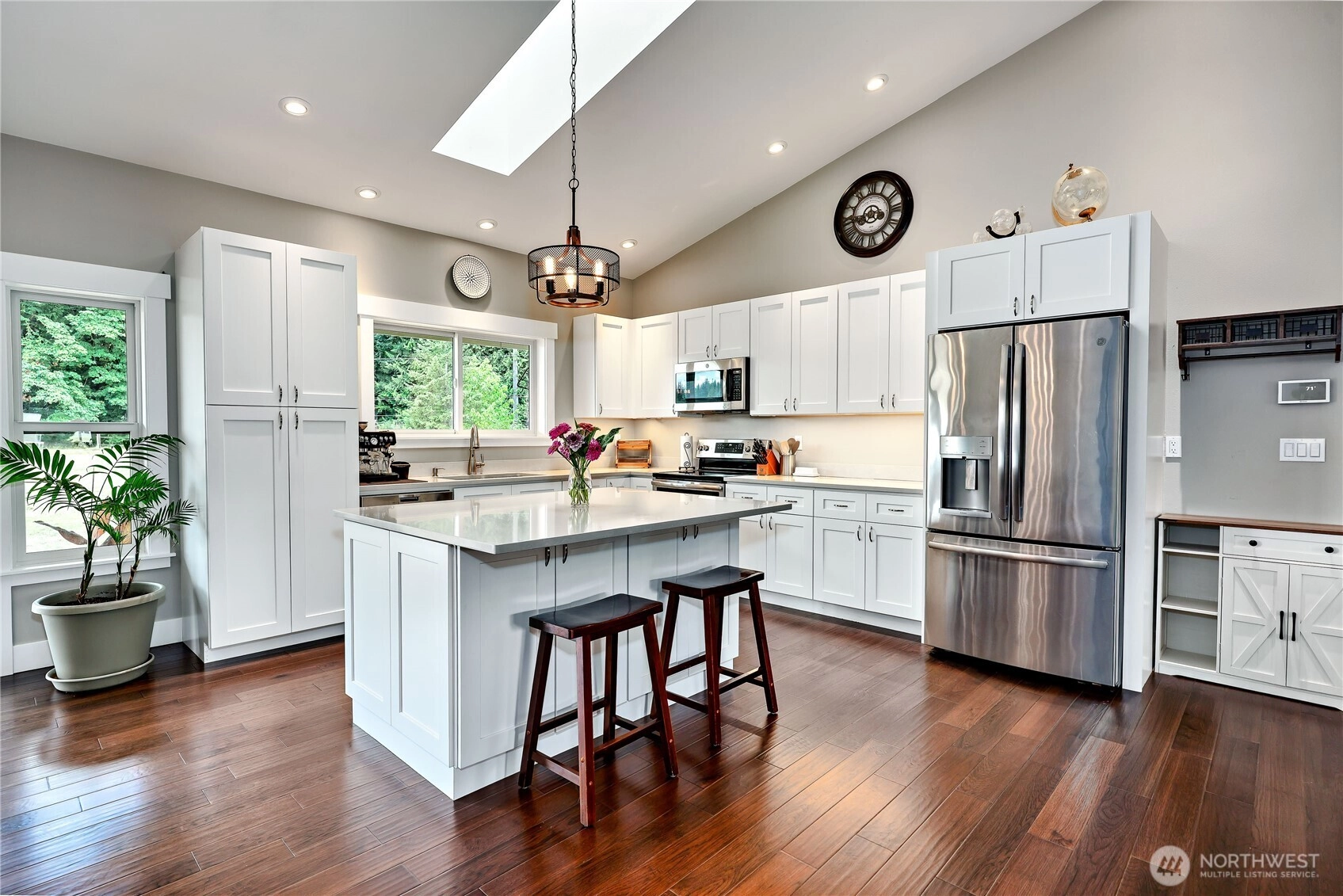 Welcome to your serene Poulsbo retreat! This charming rambler sits on 5 level and dry acres, perfect for your four-legged friends with a barn and fence already in place. Inside, offers a perfect blend of comfort and nature with vaulted ceilings and abundant natural light. The cozy wood stove, granite counters, large island, and stainless appliances make the kitchen a true standout. The oversized primary suite includes a 5-piece bath and a private deck. A separate guest cottage is perfect for multi-generational living or rental income. This property is your canvas for the best of PNW living—gardening, entertaining, or simply relaxing under the stars. With room to breathe and space to grow- don't miss this rare opportunity!