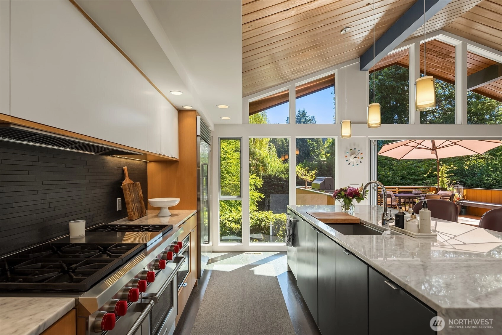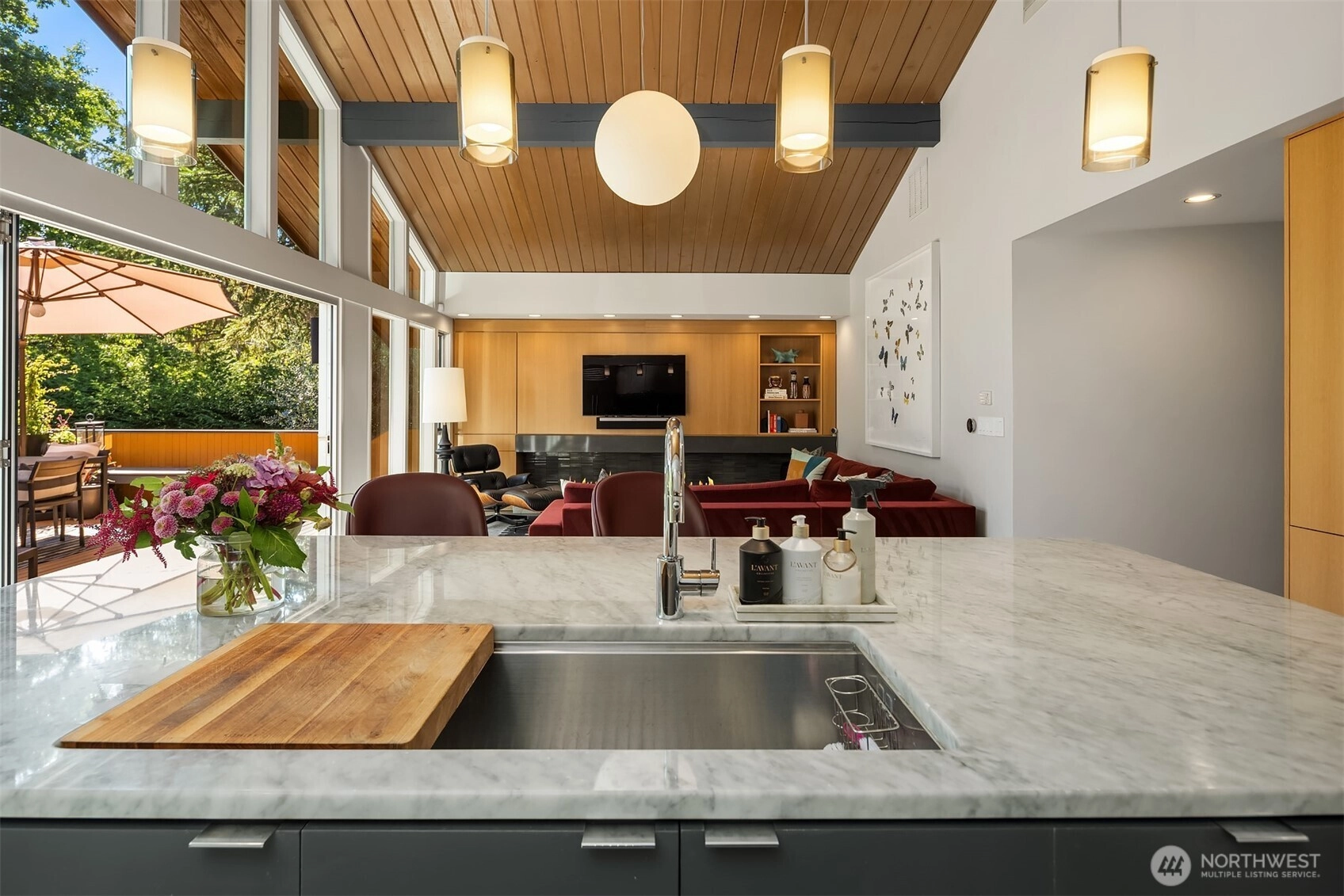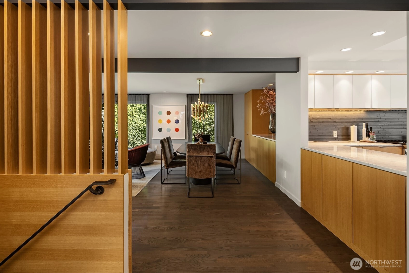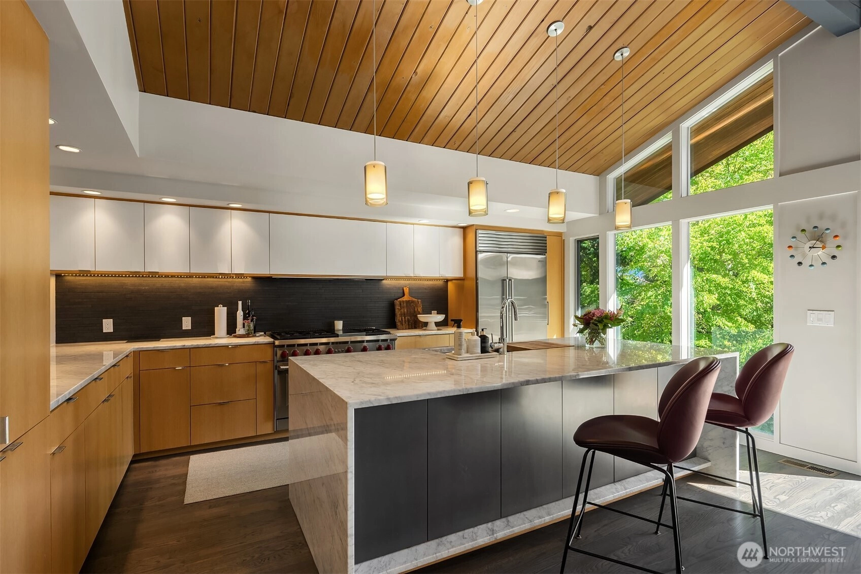 Tucked discreetly into an oversized private corner lot, this extensively-renovated MCM beauty is guaranteed to take your breath away. Everything is custom…thoughtfully conceived & masterfully executed, with classic materials like white oak & marble artfully arranged to create spaces that will always feel fresh AND timeless. Accordion doors connect the vaulted Kitchen/Family area to a spacious & sunny deck. Gracious Primary Suite with custom built-in cabinetry and walk-in closet opens to side patio. Large lower level with Family/TV room, full bath, 3rd bedroom, & office with door to lower yard. Lush landscaping front & back. EV plug, tankless hot H2O, smart lighting, new furnace - A/C, new electric/sub-panel, roof, etc...