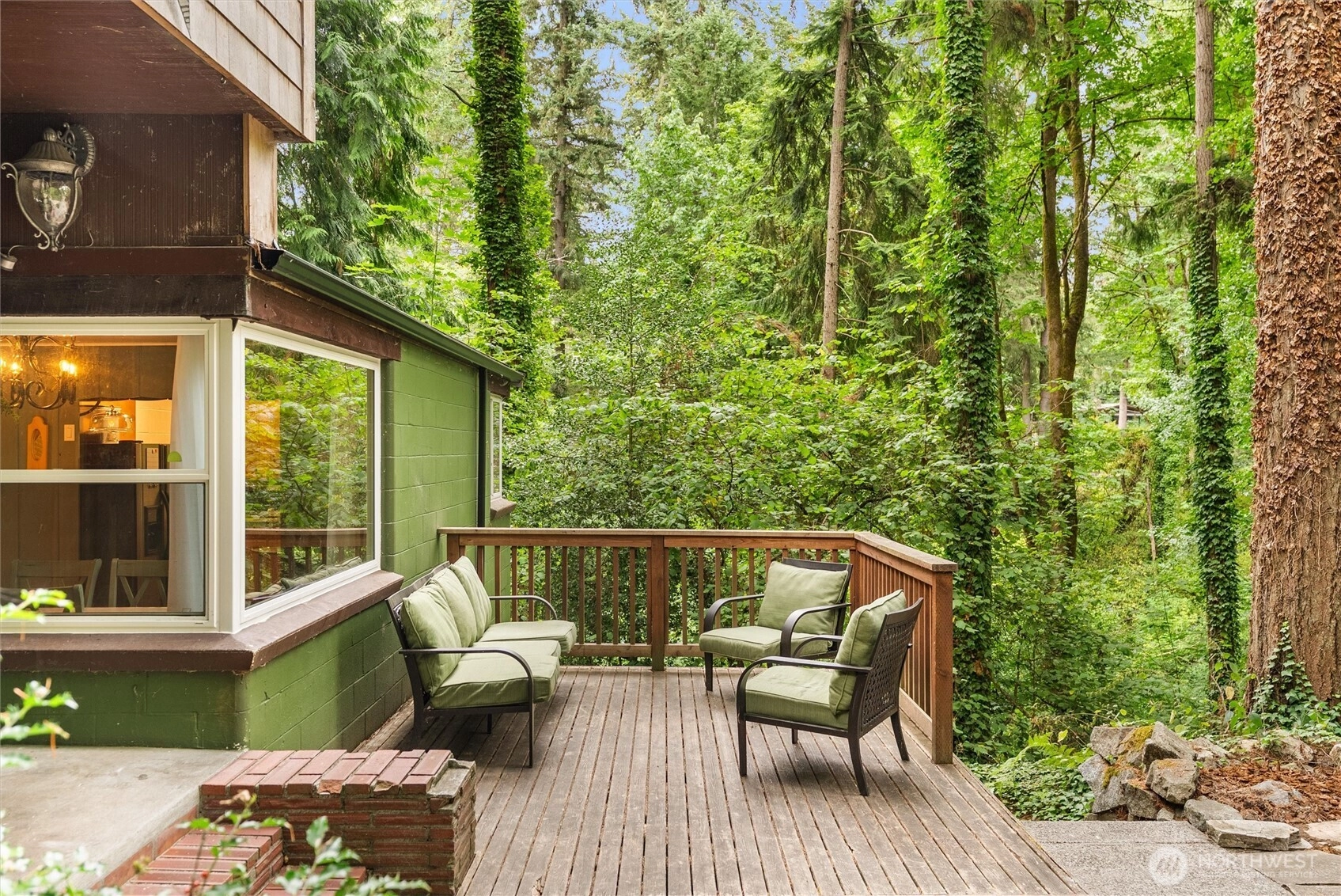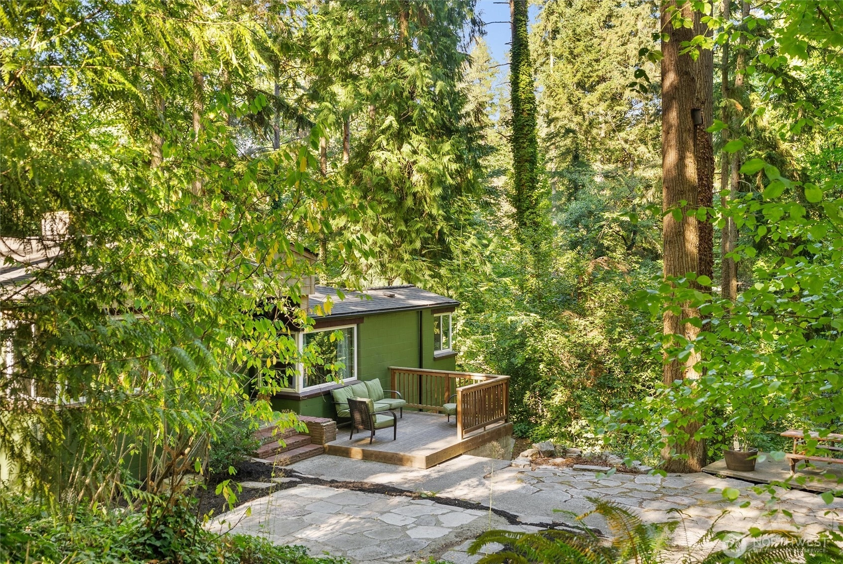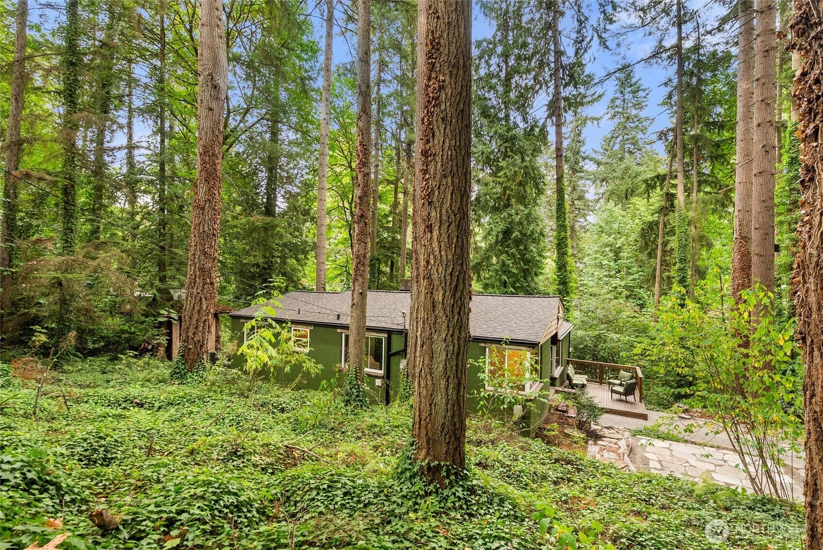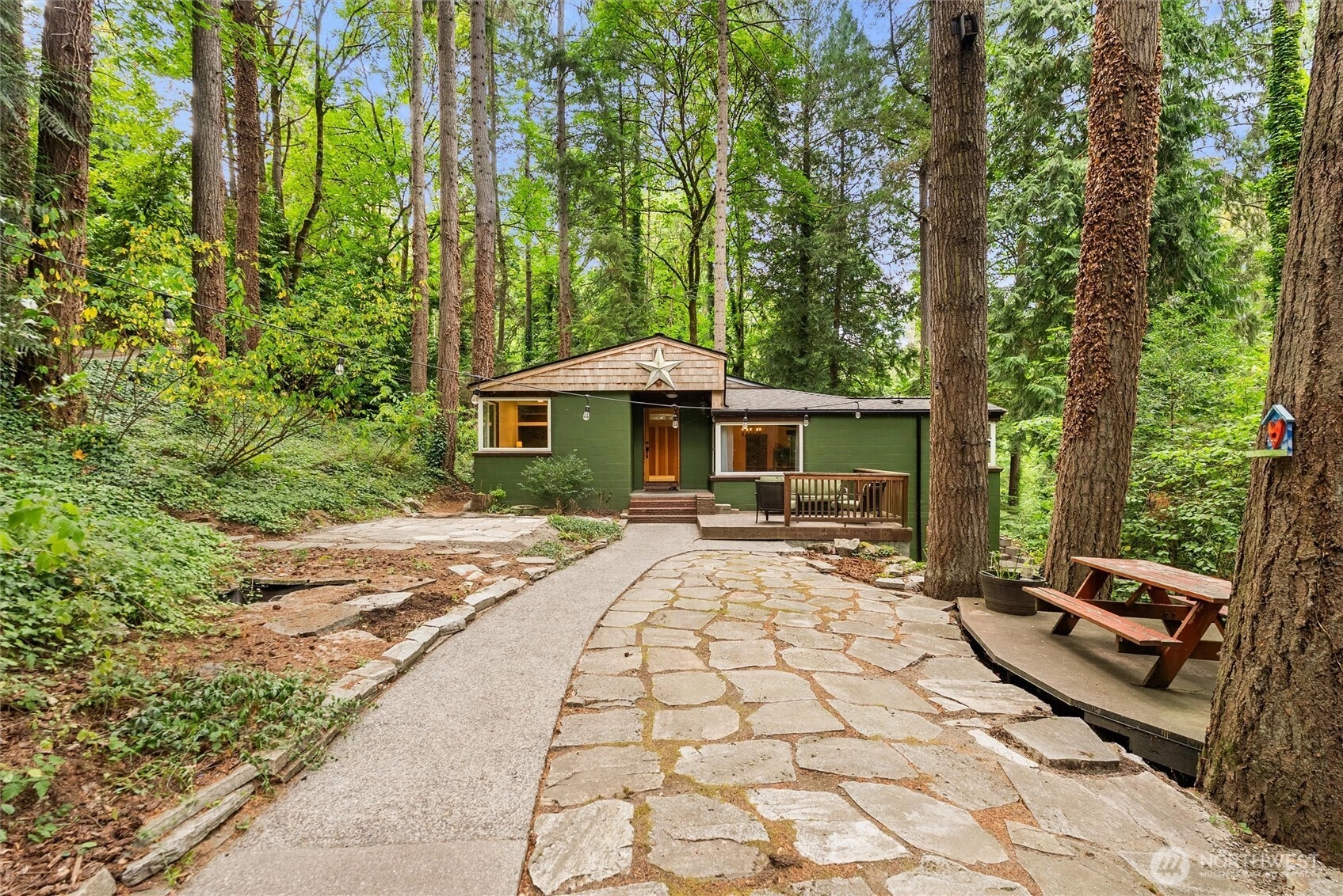 Picture this: Your home nestled on over 1.5 acres of verdant forest, with moss-dappled paths winding to a gentle creek—the sunlight filtering through towering cedars and firs, the soft rustle of leaves as wildlife visits, and the peaceful sound of flowing water. Inside, vaulted ceilings and wooden beams echo the exterior's rustic grace, with decks that blur the boundary between sheltered indoors and wild outside. This isn't just a home—it's a sanctuary rooted deeply in nature, community, and timeless Seattle-area charm.