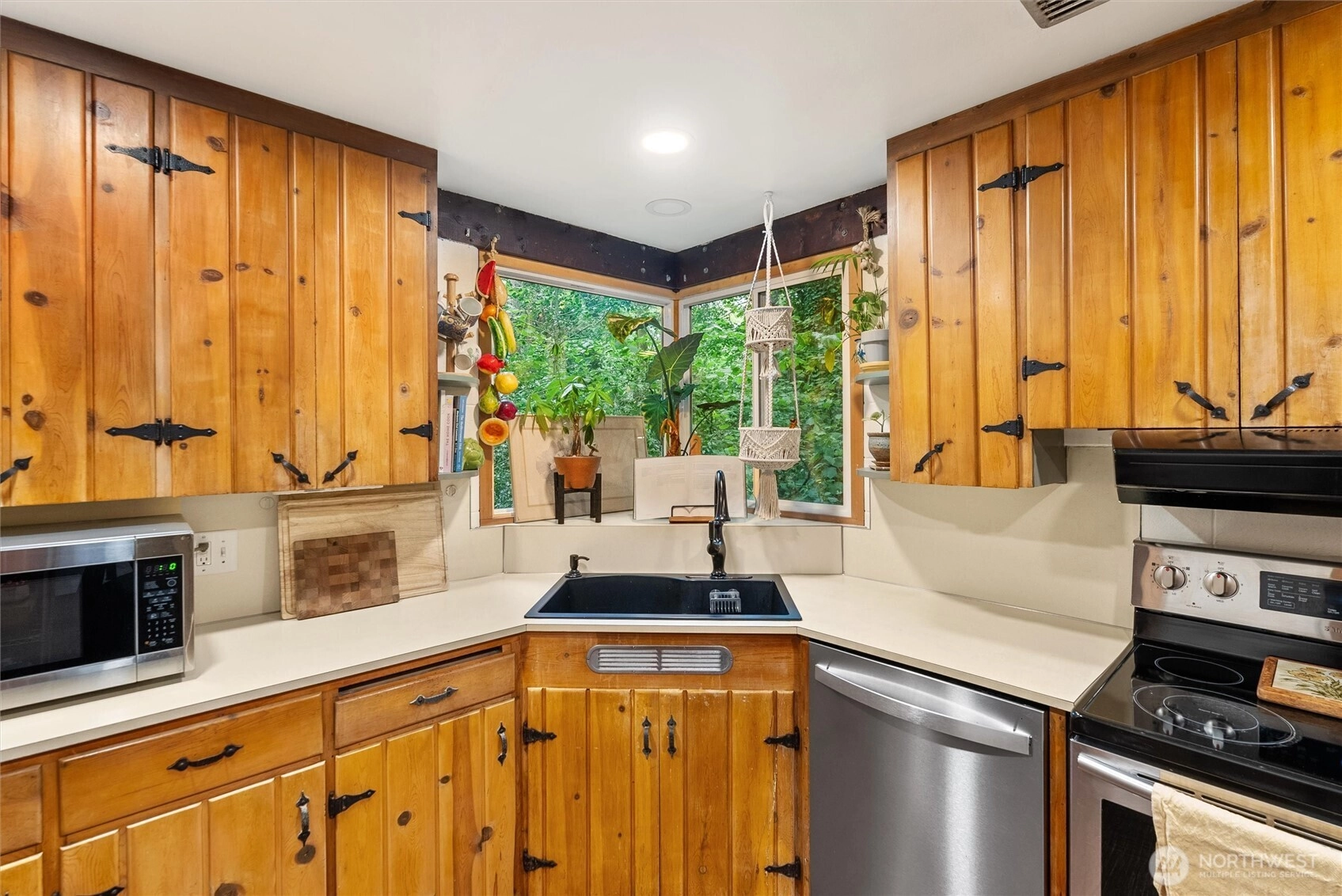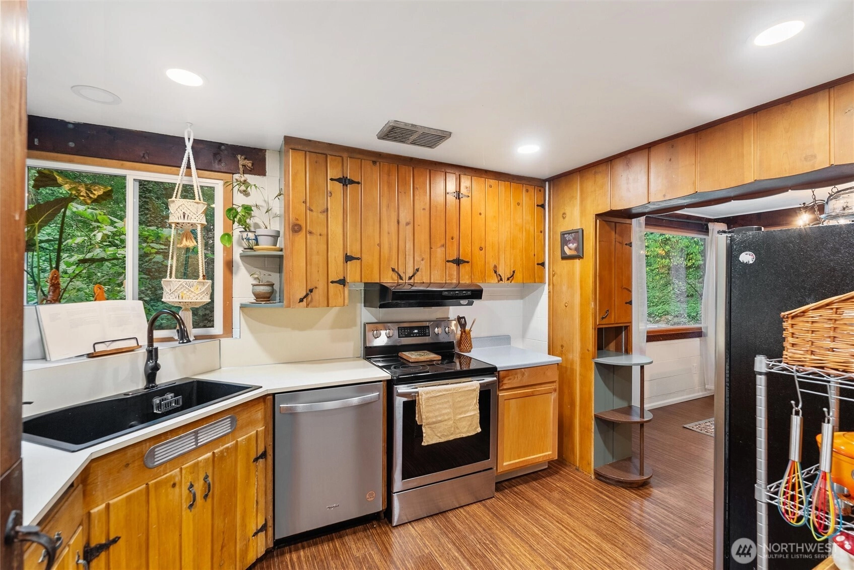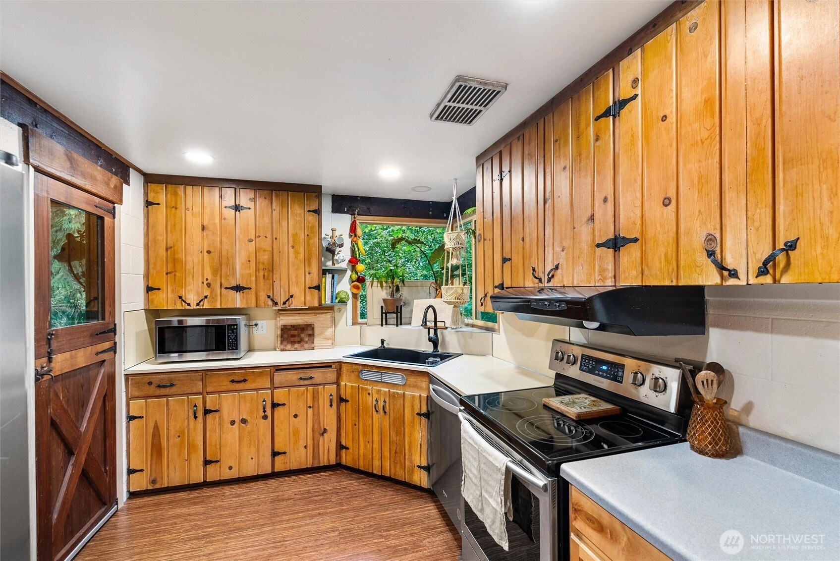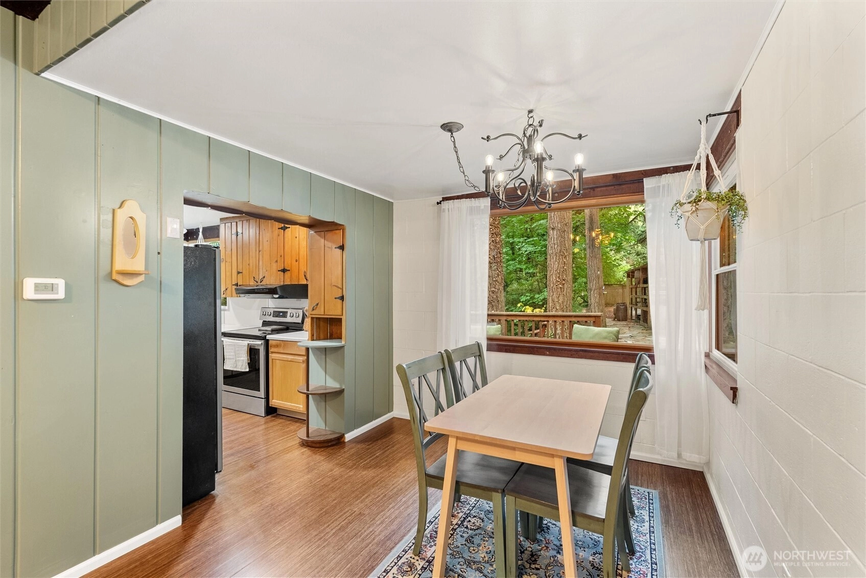 Picture this: Your home nestled on over 1.5 acres of verdant forest, with moss-dappled paths winding to a gentle creek—the sunlight filtering through towering cedars and firs, the soft rustle of leaves as wildlife visits, and the peaceful sound of flowing water. Inside, vaulted ceilings and wooden beams echo the exterior's rustic grace, with decks that blur the boundary between sheltered indoors and wild outside. This isn't just a home—it's a sanctuary rooted deeply in nature, community, and timeless Seattle-area charm.