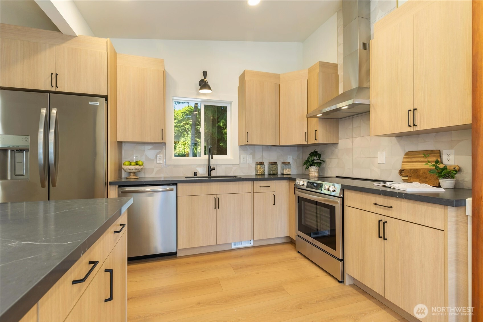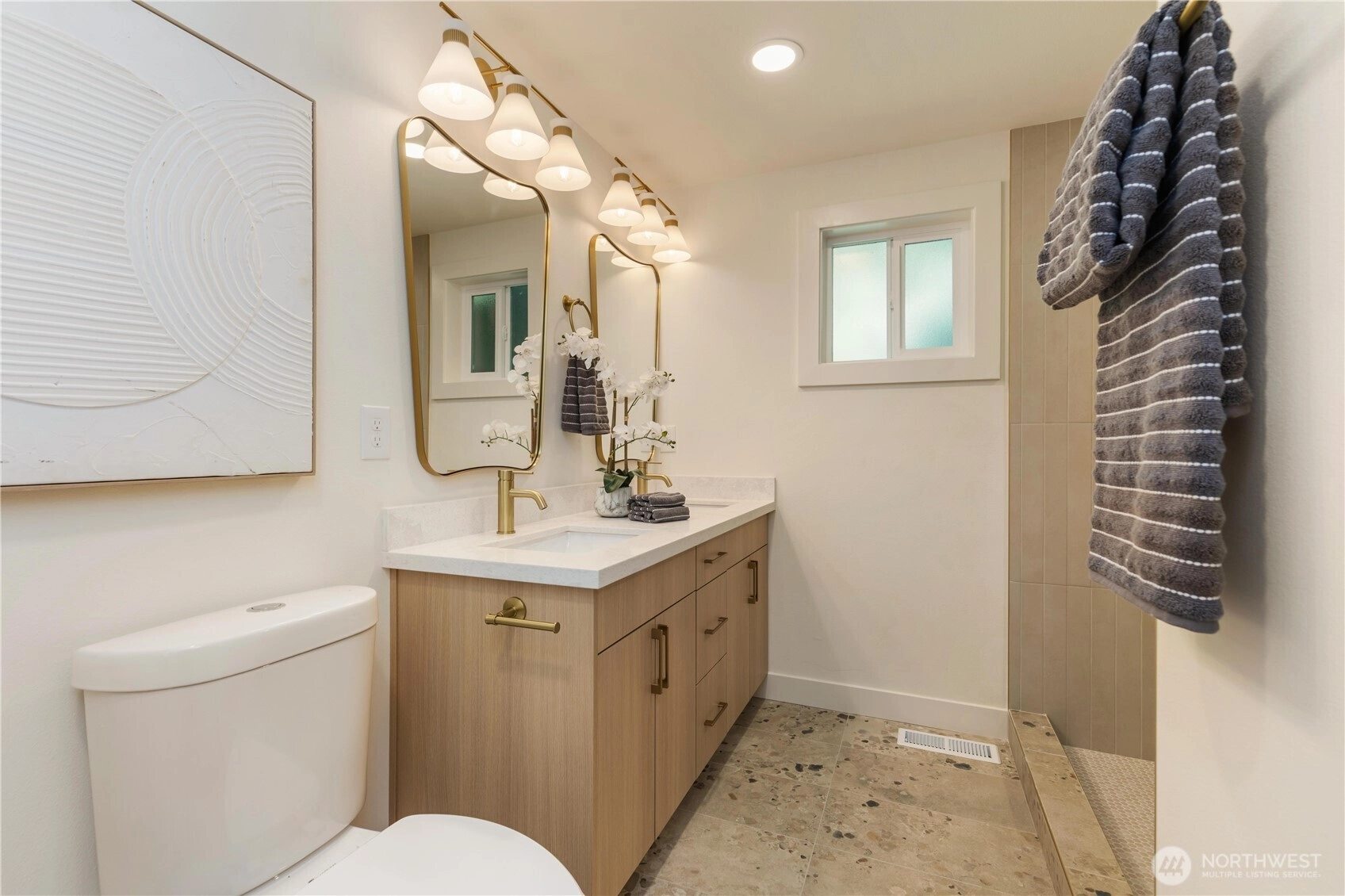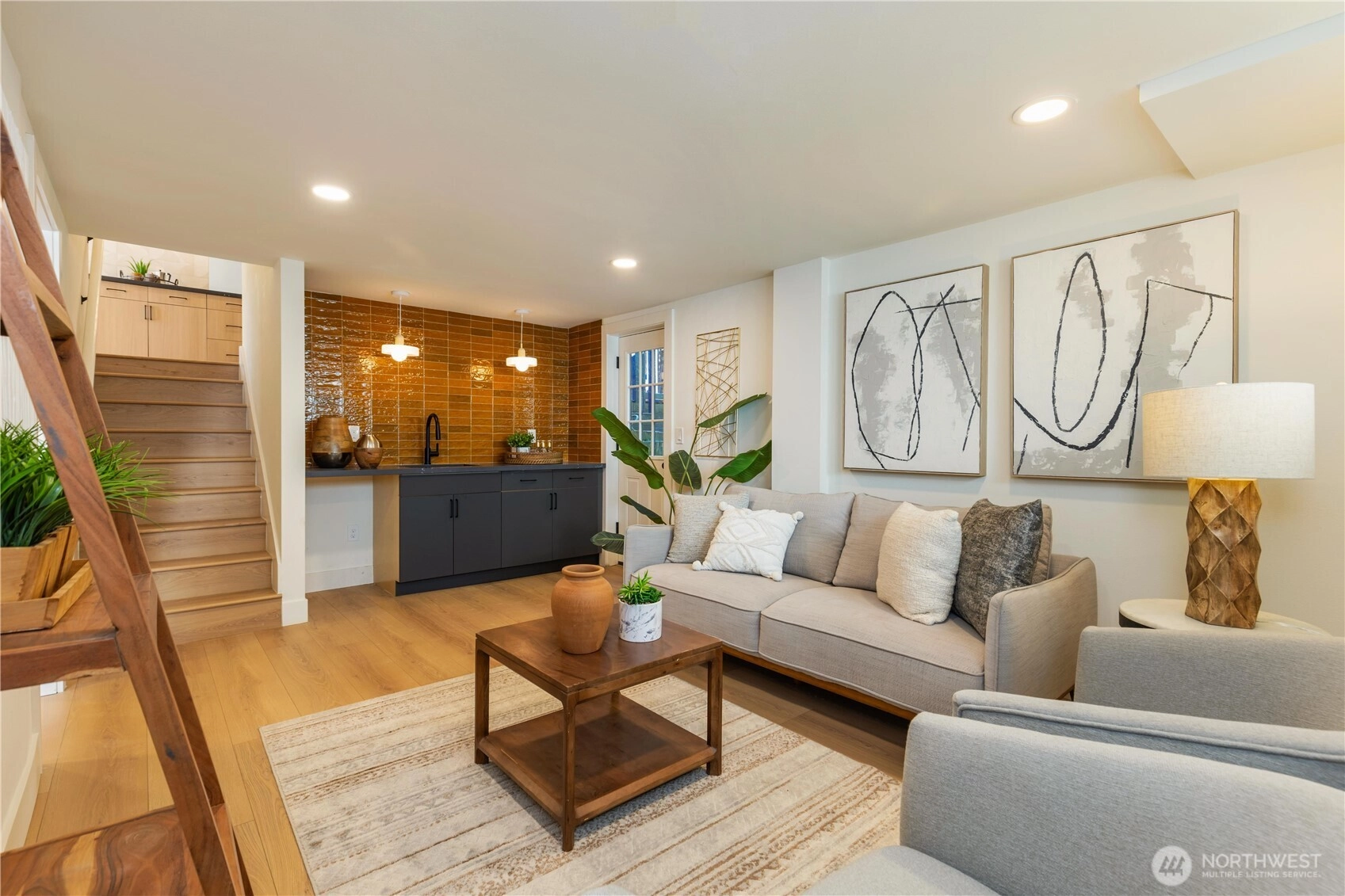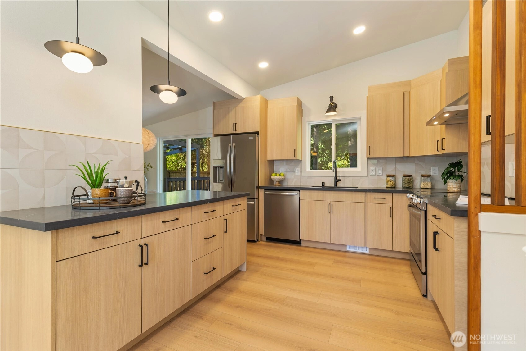 Updated stunner in the heart of Richmond Beach, just one block from Saltwater Park & mins to DT Edmonds! This chic 3 bed 2.75 BA home lives large! Featuring an airy layout w vaulted ceiling swept in natural light. Sleek brand new kitchen flows into dining w seamless access to the expansive back deck. Lower offers bonus space to relax complete w wet bar & easy access to expansive yard. Upstairs, primary suite boasts a spa-like ensuite w oversized shower, dbl vanity, built-ins plus walk-in. Outside offers a serene setting, freshly landscaped. One-car drive through garage—ideal for parking or reimagined as a gym, studio or bonus space that flows outdoors. Prime location w permitted thorough updates - plumbing, electrical & so much more!