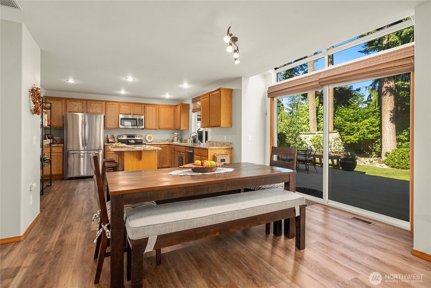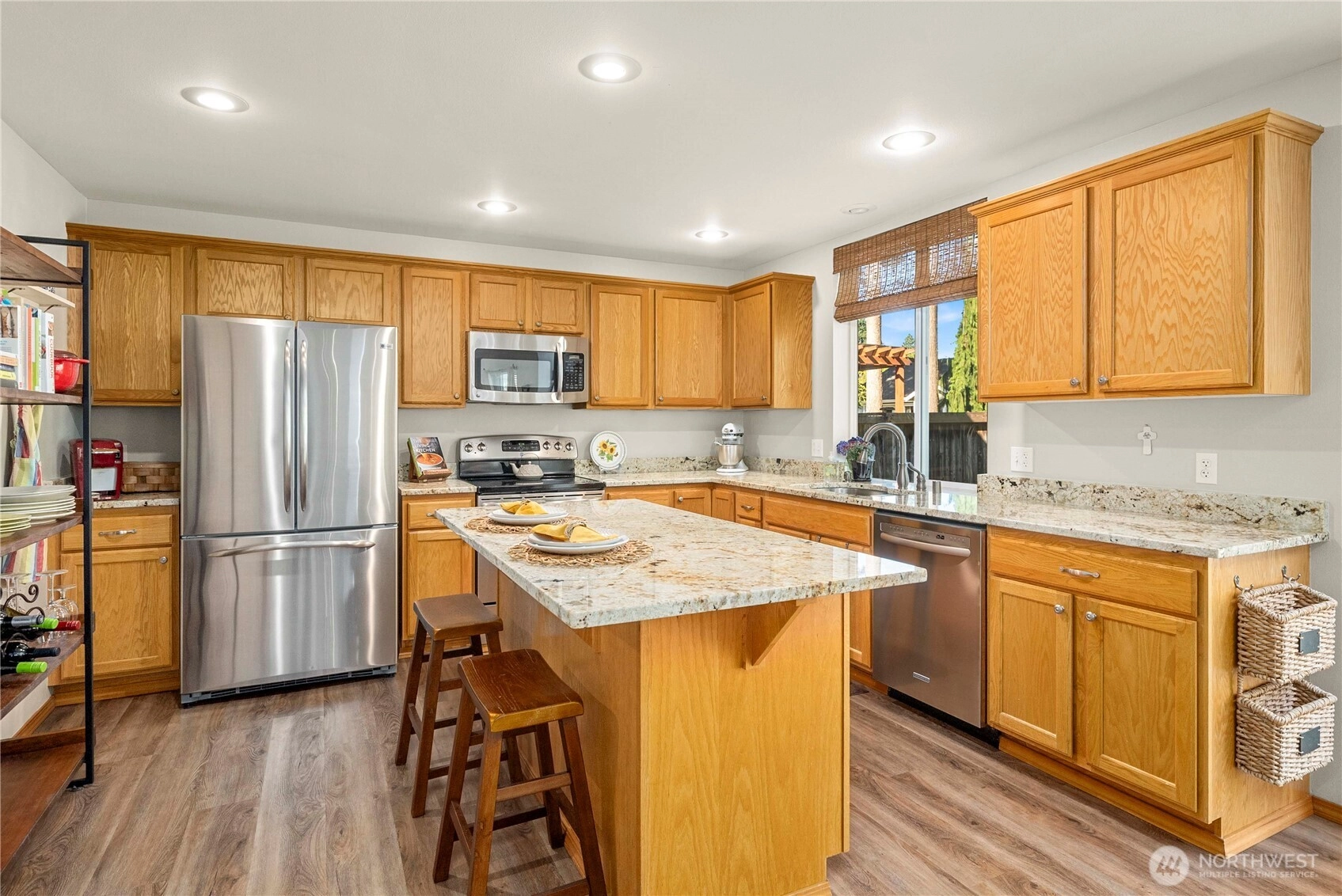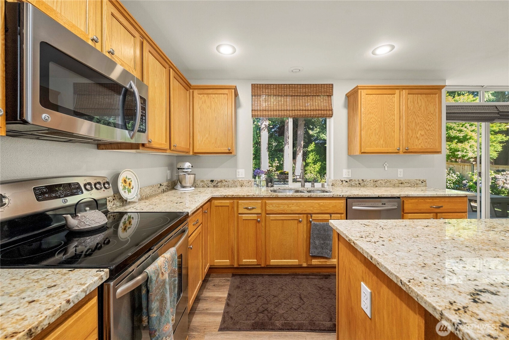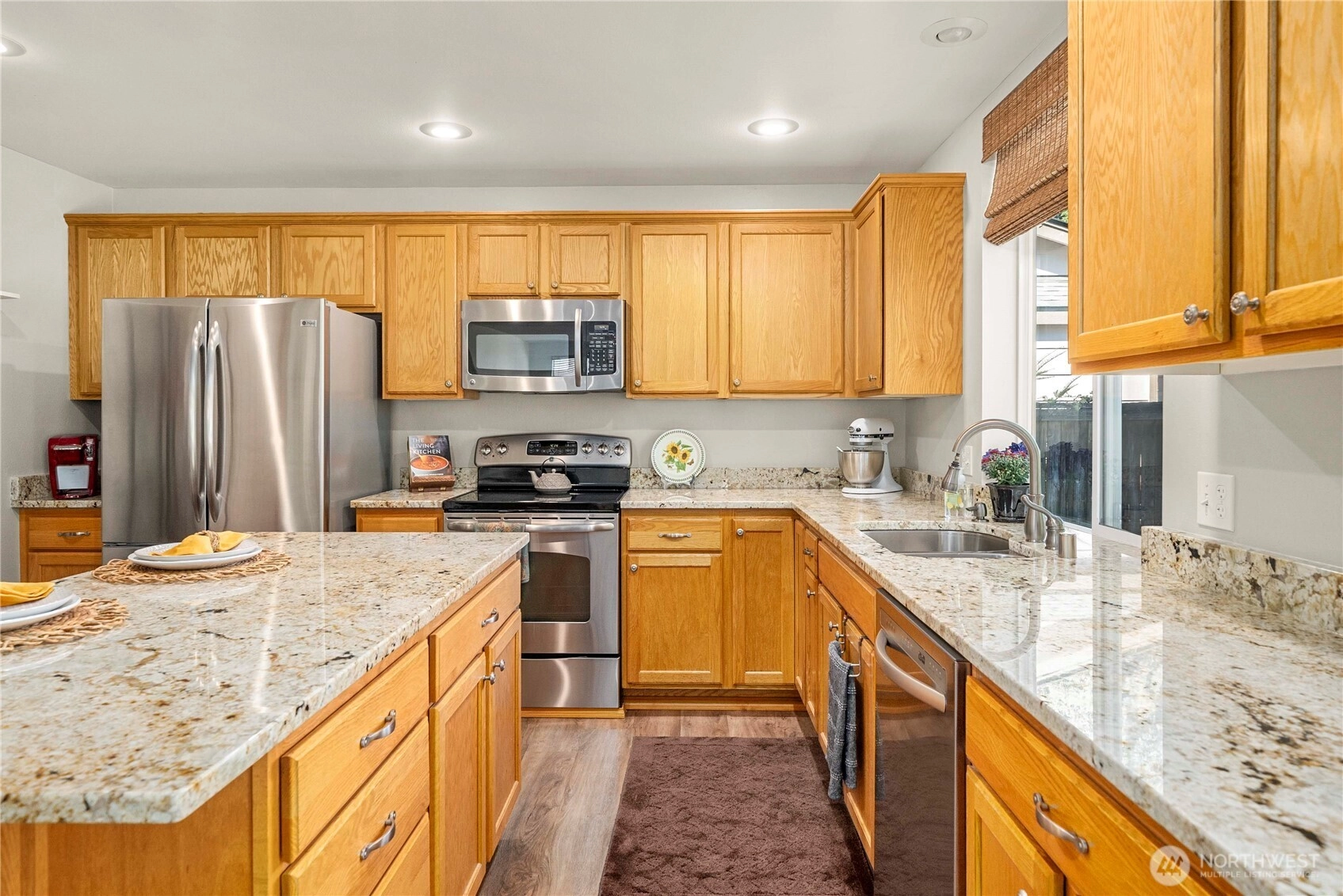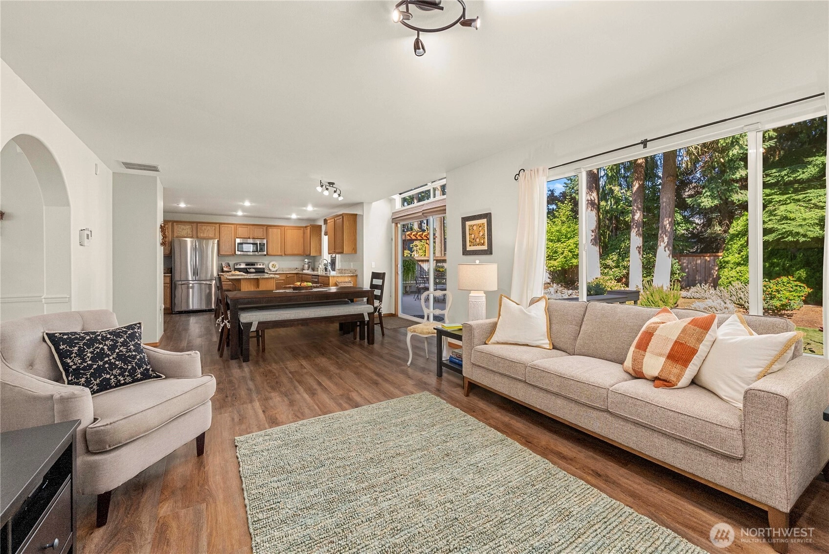 Nestled on a quiet cul-de-sac in Valley Green, this beautifully cared-for home stands out with several key updates added over the past five years, including a new roof, furnace, water heater, carpeting, deck, and more. The open great room flows seamlessly into a well-appointed kitchen, while the versatile front room offers the perfect spot for a home office or formal living area. Luxury vinyl plank flooring and fresh paint enhance the inviting interiors, showcasing pride of ownership throughout. Private backyard oasis with lush landscaping, a composite front deck, and roughed-in sprinkler system. Everyday living is made easier with a widened driveway-nearby trails, shops, and convenient highway access in this north Maple Valley location.