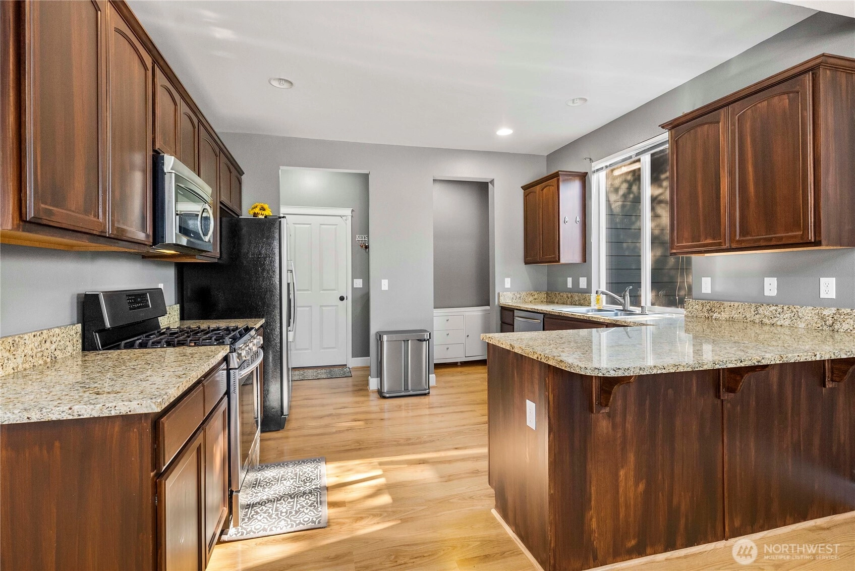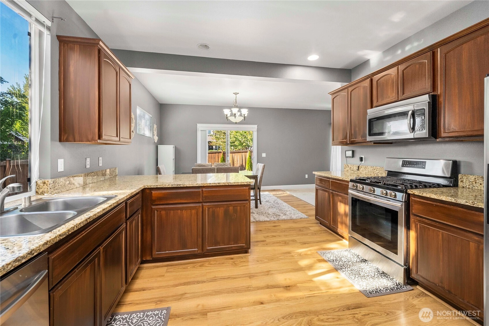Welcome to Sunridge at Elk Run, a quiet cul-de-sac community surrounded by parks, sports courts, trails, and the new Tahoma High School. This quality Schneider-built home showcases timeless details including white millwork, hardwood floors, and thoughtful finishes. The chef’s kitchen is a highlight with slab granite countertops, stainless appliances, and a gas range. An open great room with a cozy gas fireplace flows seamlessly to the spacious, fenced backyard featuring privacy trees, a patio, and garden space. Retreat to the inviting primary suite with a 5-piece bath and walk-in closet. Additional well-sized bedrooms and a full bath complete the upstairs. Rare oversized 3-car garage with extra storage. Walkable access to schools & parks!