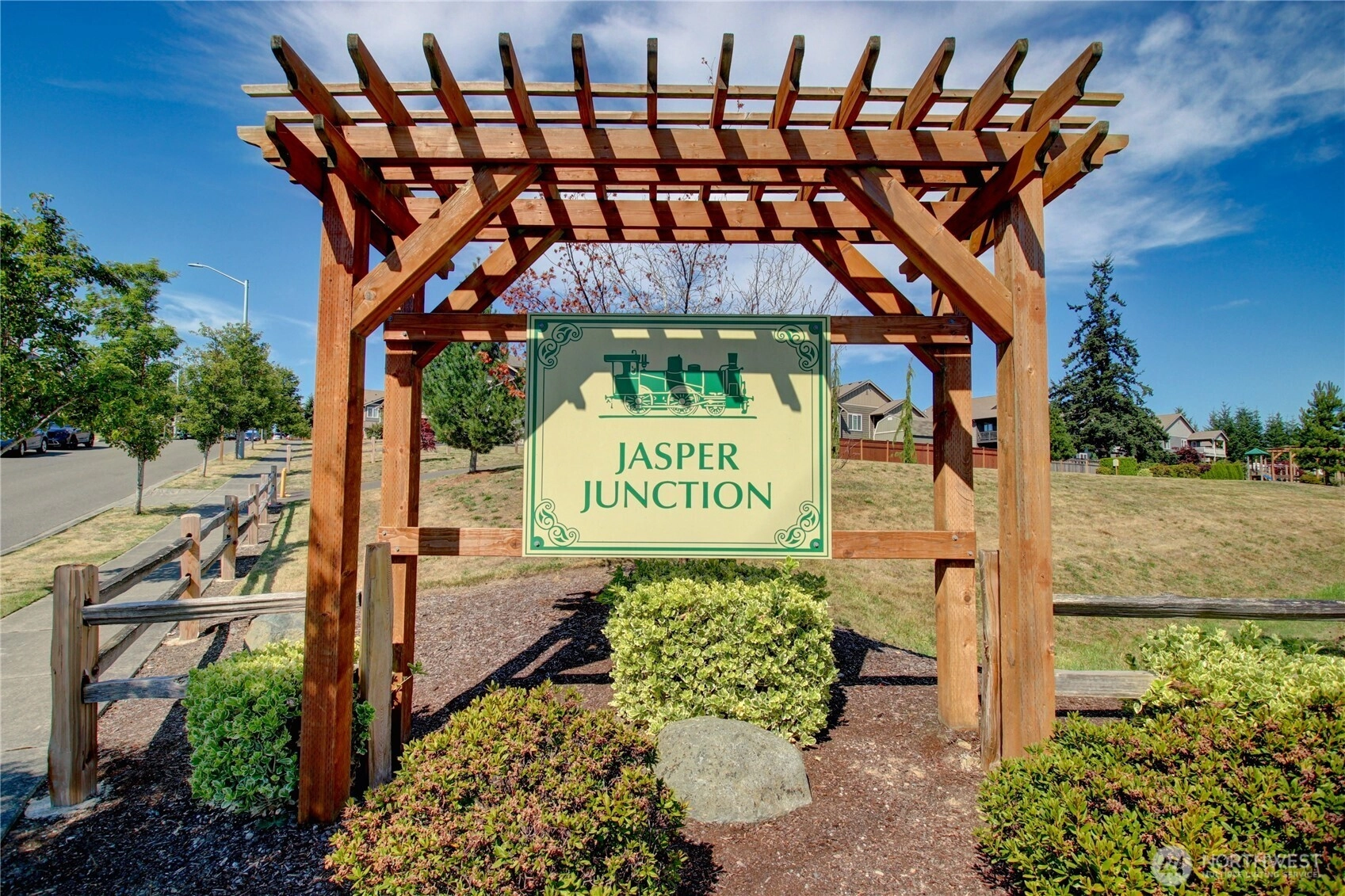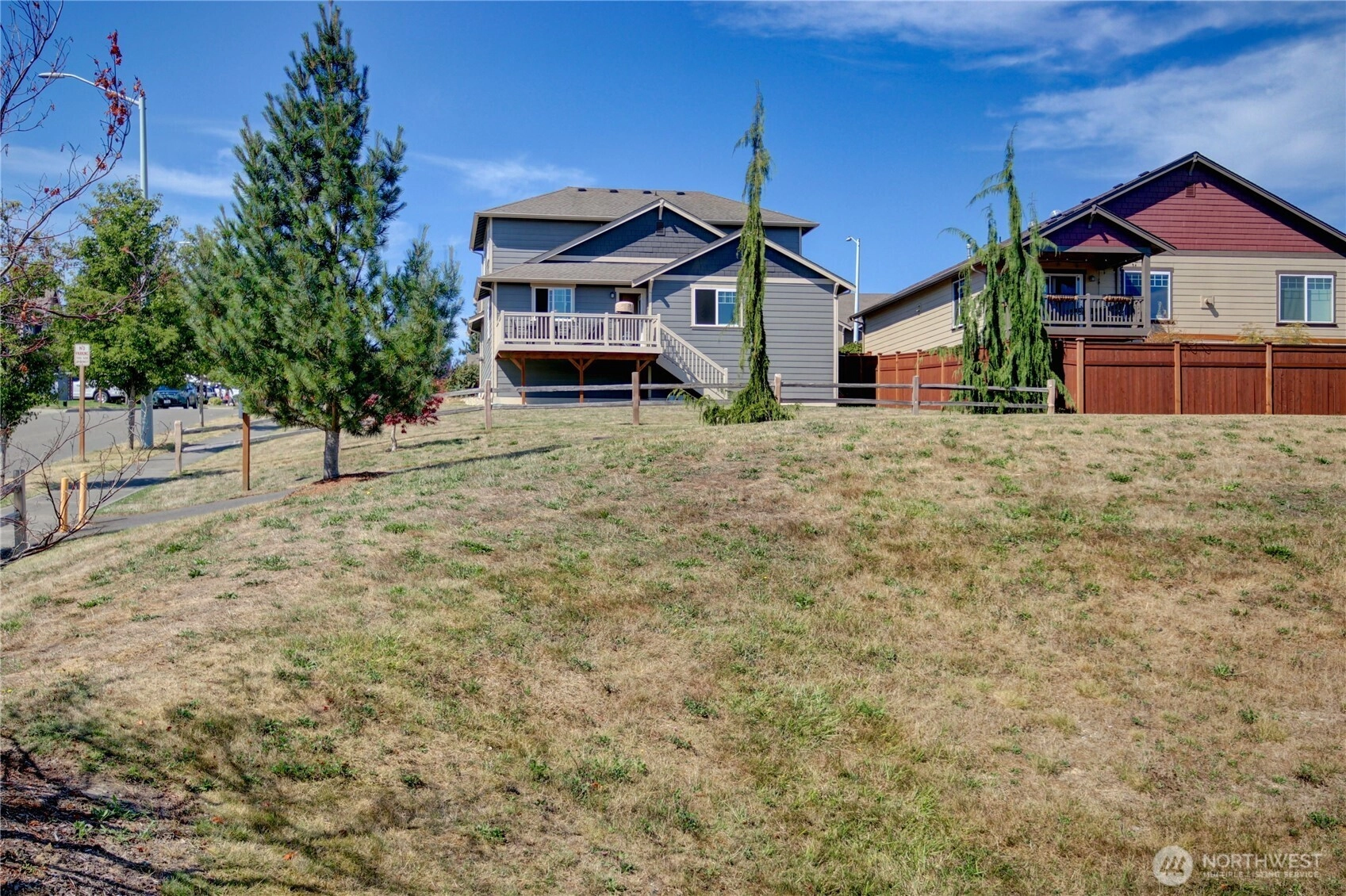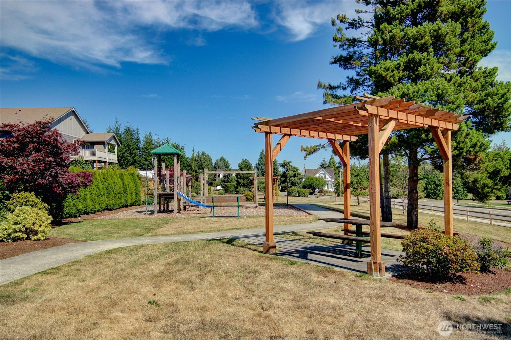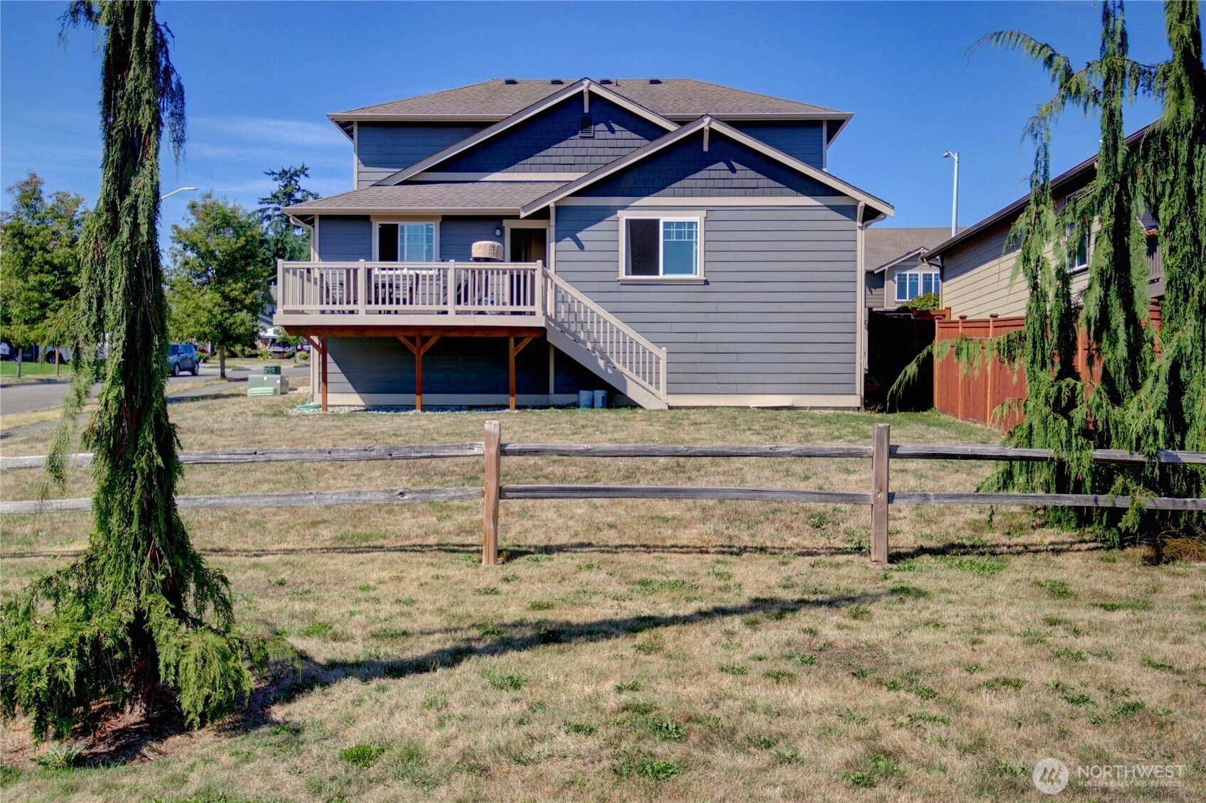 Delightful well maintained Jasper Junction 2 story home on spacious corner lot overlooking community park and play area. Lovely views of the Cascade Mountains capture the rural atmosphere of this Stanwood community. A block away to the elementary school and close to all city services this home offers charm and convenience. The gas fireplace welcomes you to the living and dining area. Ideal kitchen with granite counters, stainless appliances and walk in pantry. Deck off kitchen. Special feature is the primary bedroom located on the main level complete with 5 piece bath. Upstairs are 2 bdrms, bath, laundry plus office or entertainment area. The community park and play area that adjoins this property expands your space for fun and gatherings