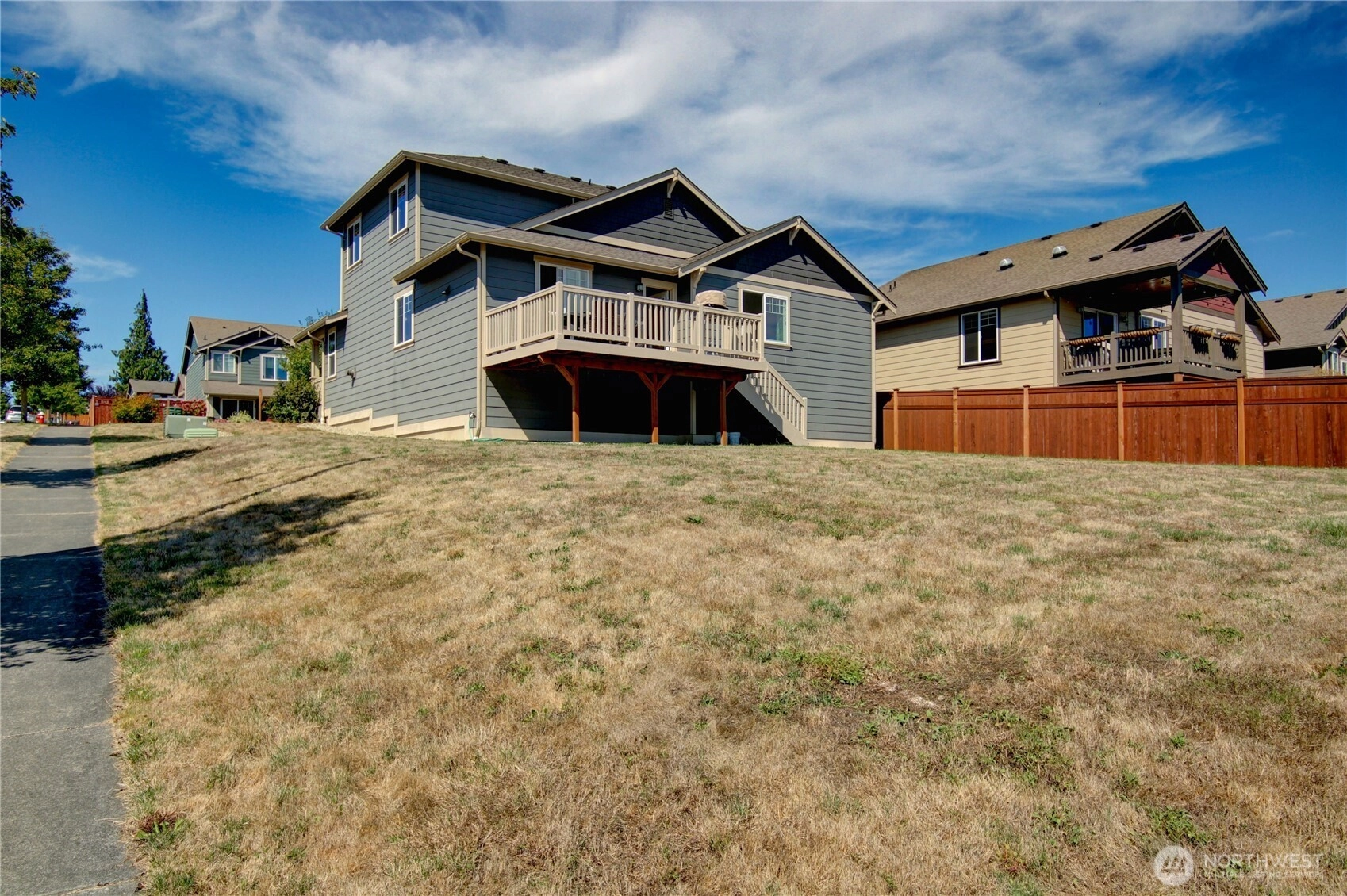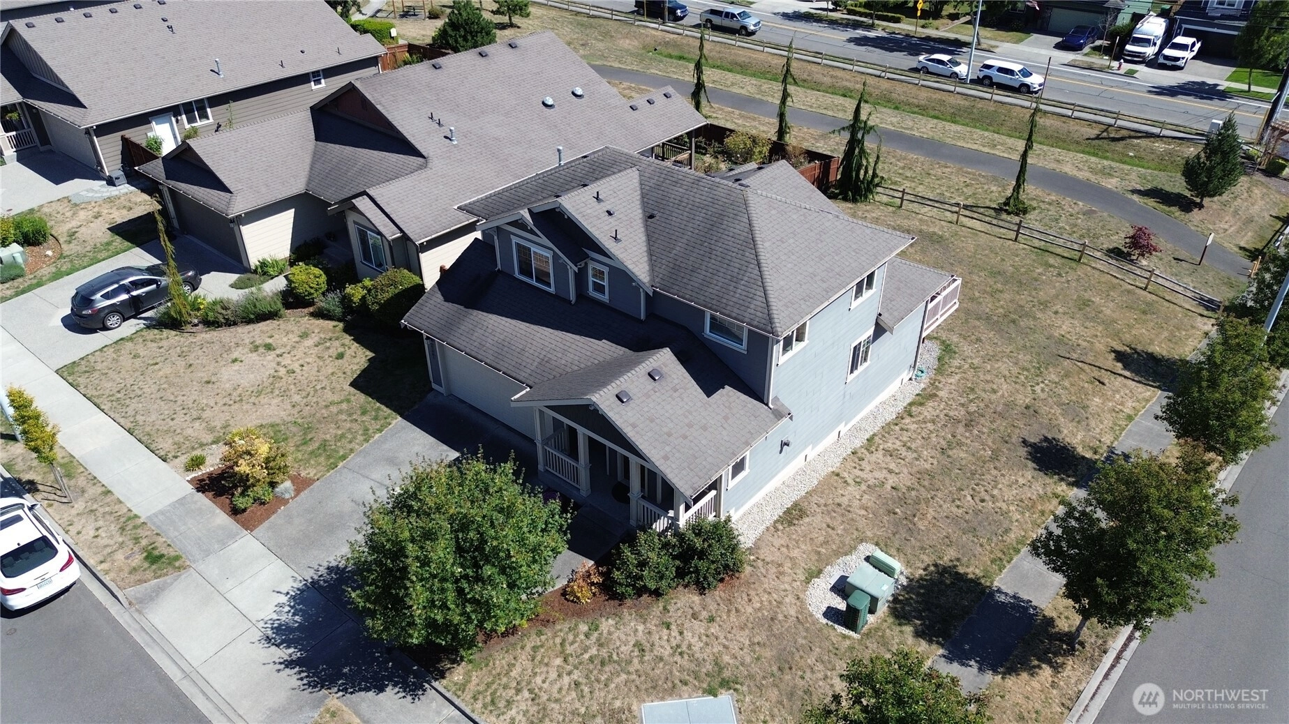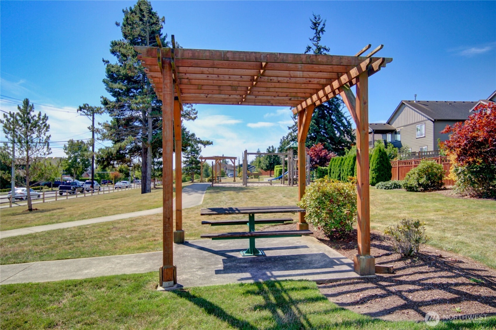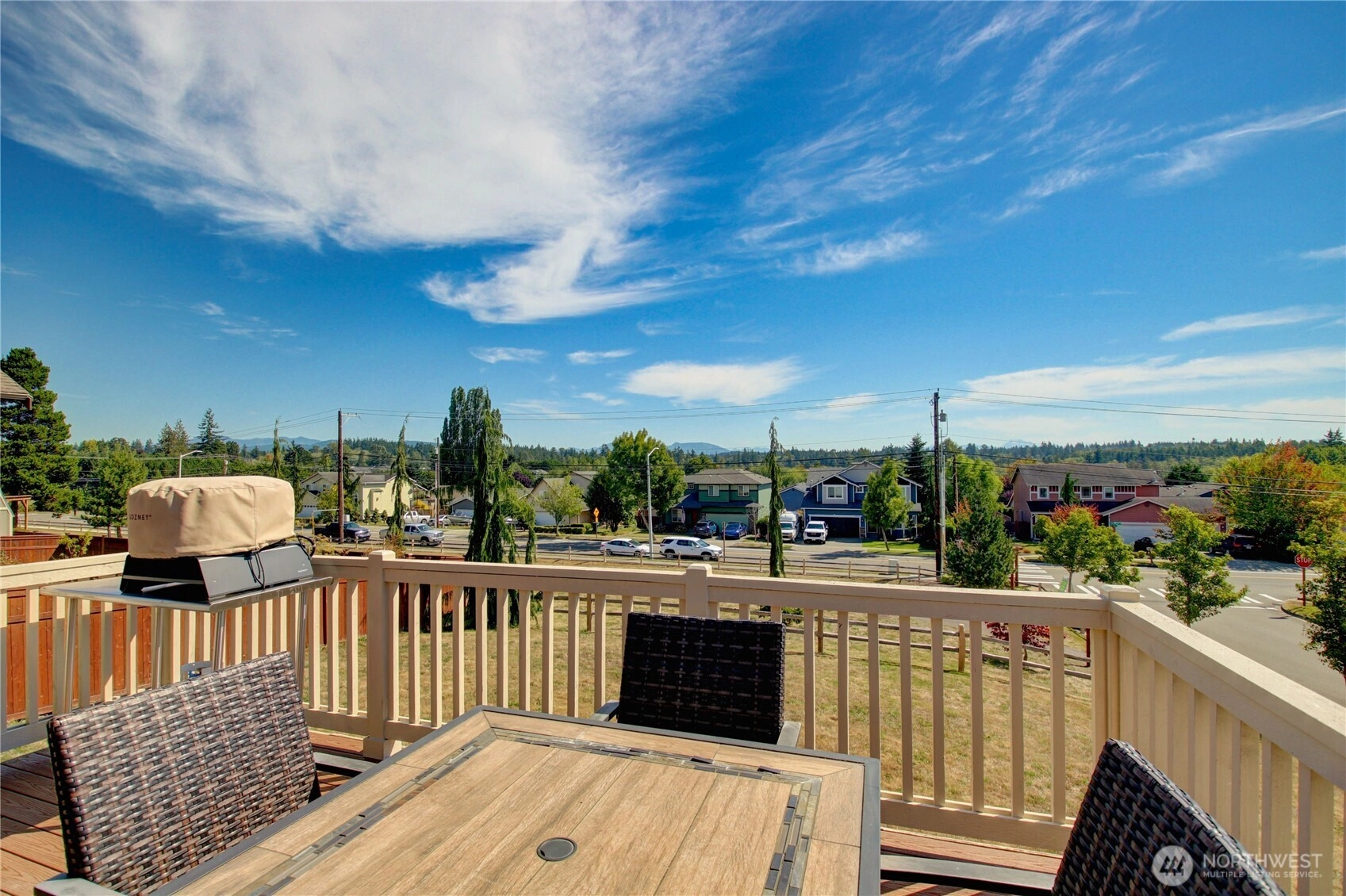 Delightful well maintained Jasper Junction 2 story home on spacious corner lot overlooking community park and play area. Lovely views of the Cascade Mountains capture the rural atmosphere of this Stanwood community. A block away to the elementary school and close to all city services this home offers charm and convenience. The gas fireplace welcomes you to the living and dining area. Ideal kitchen with granite counters, stainless appliances and walk in pantry. Deck off kitchen. Special feature is the primary bedroom located on the main level complete with 5 piece bath. Upstairs are 2 bdrms, bath, laundry plus office or entertainment area. The community park and play area that adjoins this property expands your space for fun and gatherings
