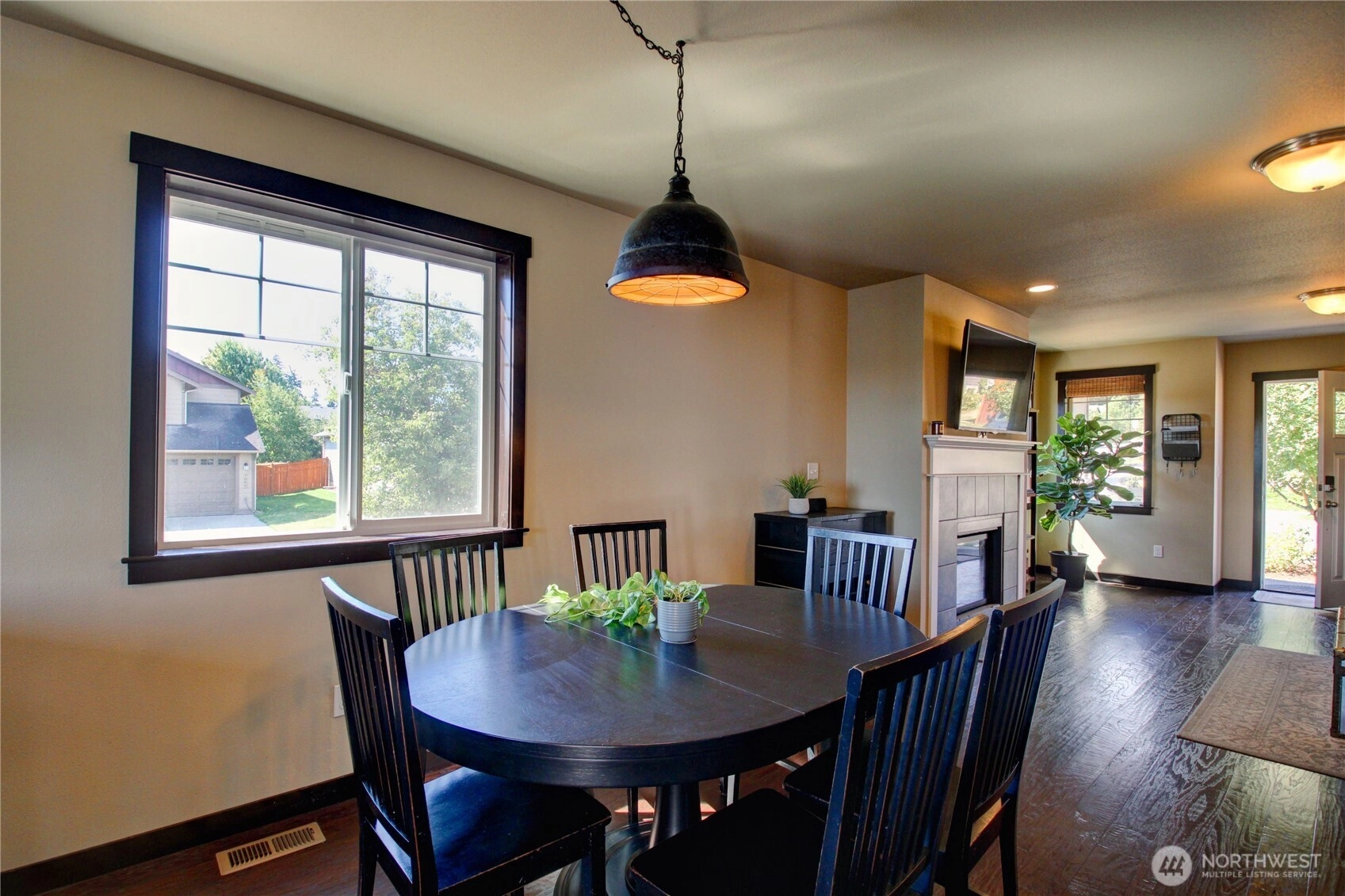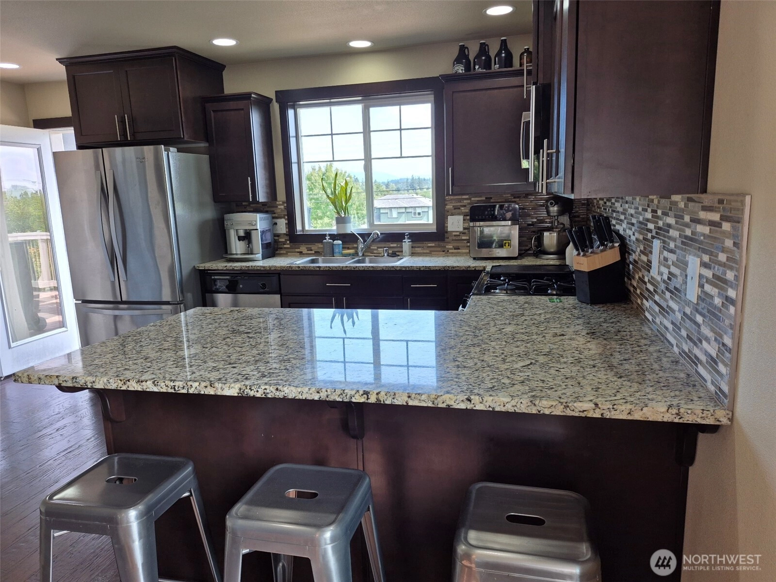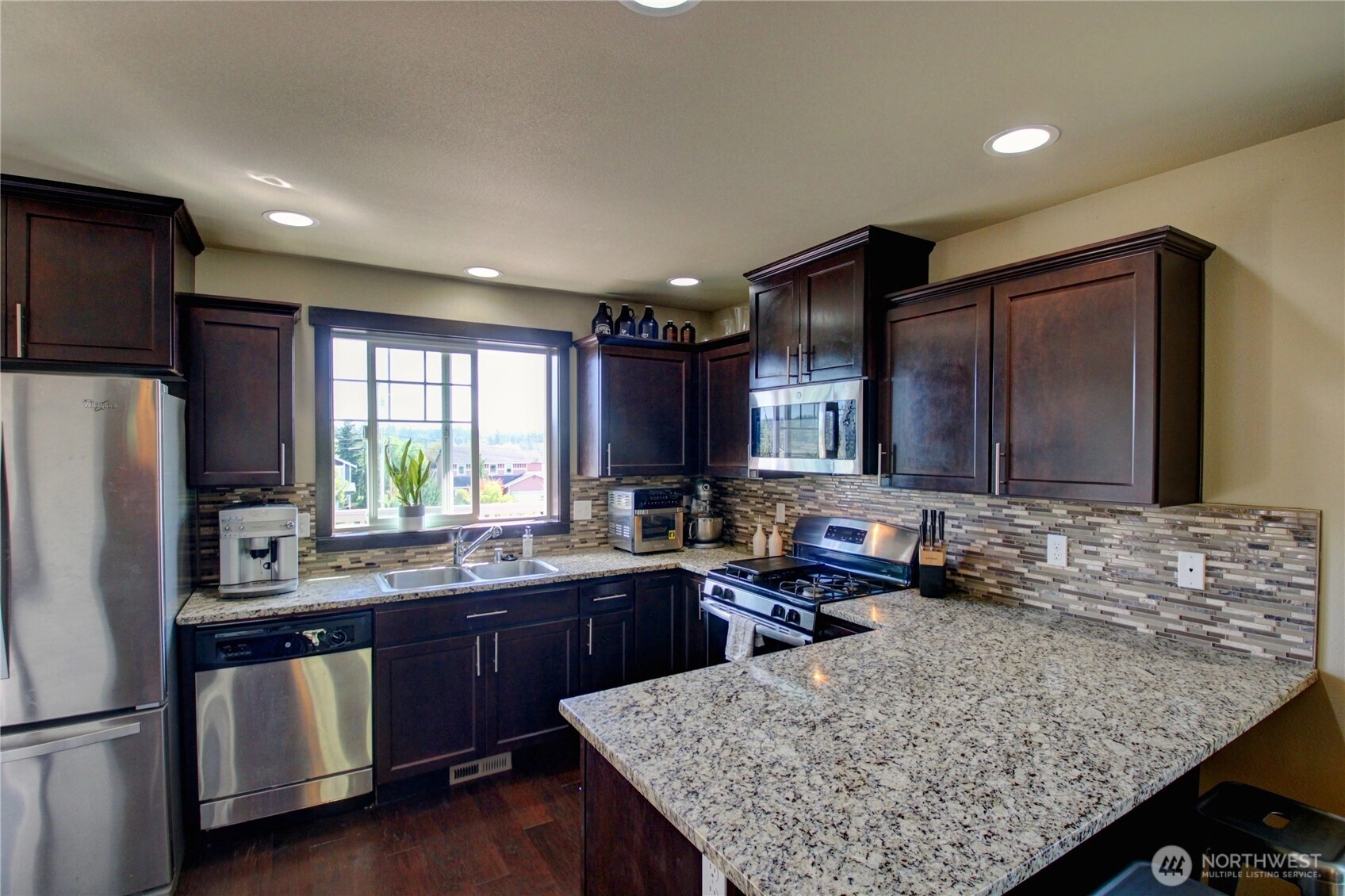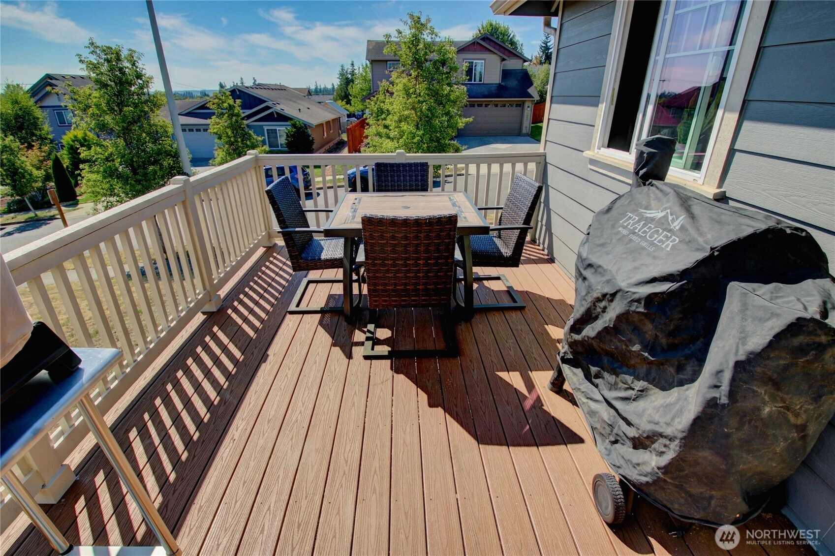Delightful well maintained Jasper Junction 2 story home on spacious corner lot overlooking community park and play area. Lovely views of the Cascade Mountains capture the rural atmosphere of this Stanwood community. A block away to the elementary school and close to all city services this home offers charm and convenience. The gas fireplace welcomes you to the living and dining area. Ideal kitchen with granite counters, stainless appliances and walk in pantry. Deck off kitchen. Special feature is the primary bedroom located on the main level complete with 5 piece bath. Upstairs are 2 bdrms, bath, laundry plus office or entertainment area. The community park and play area that adjoins this property expands your space for fun and gatherings