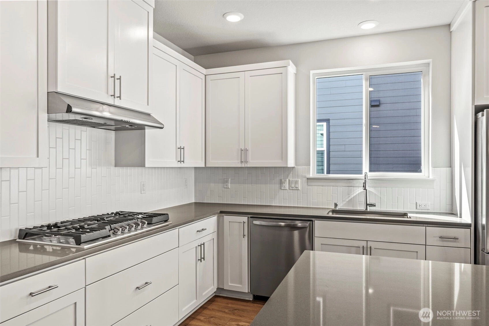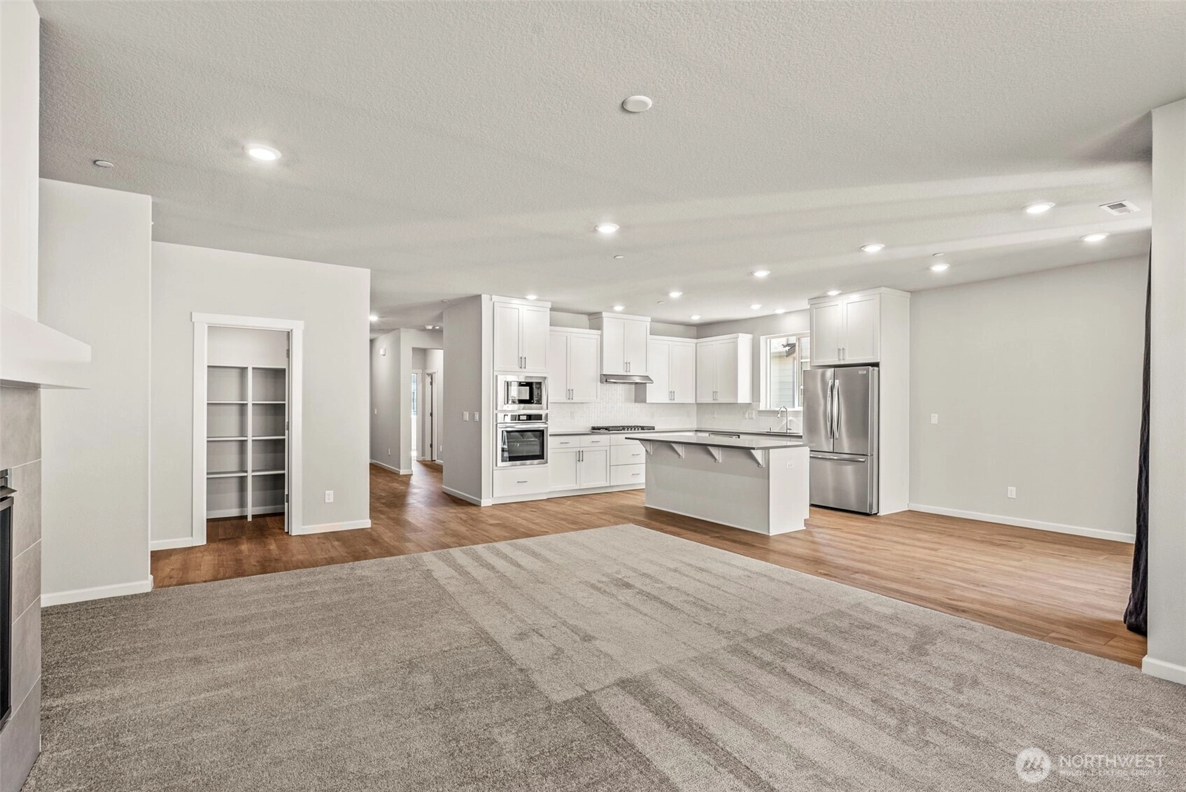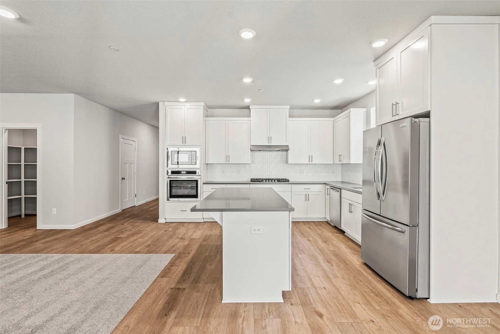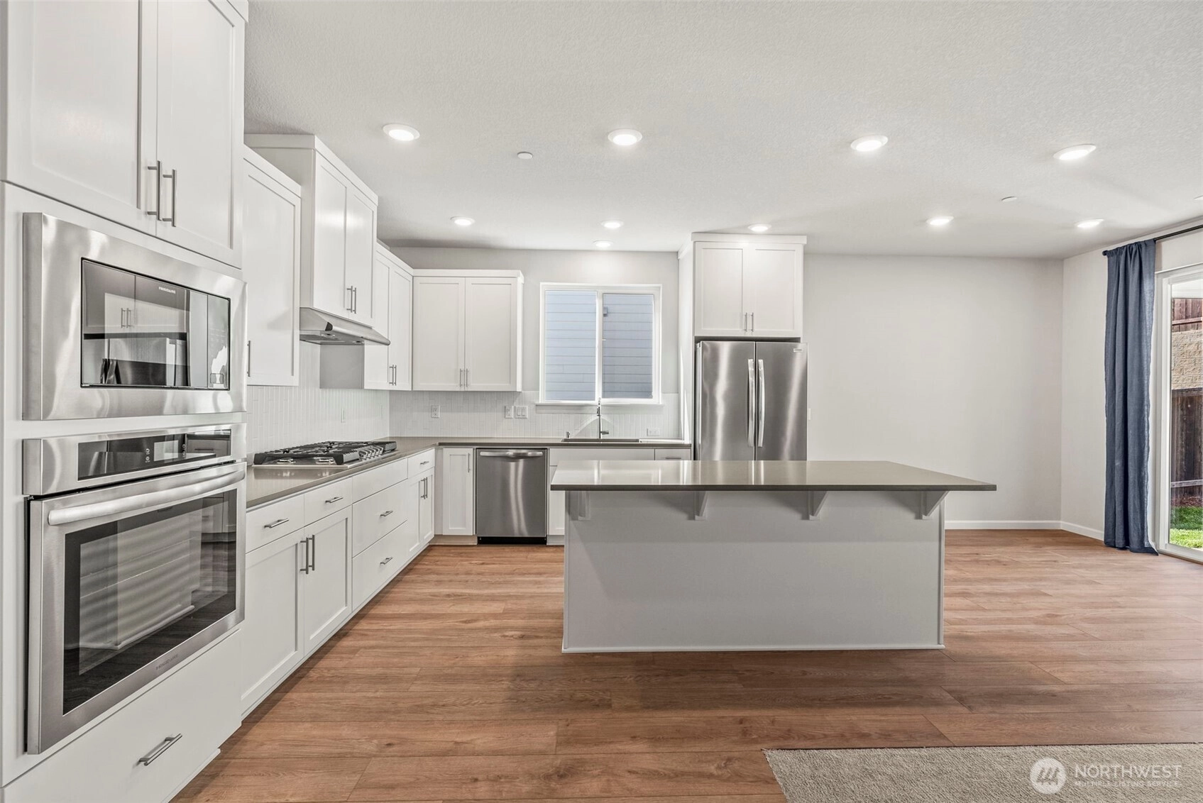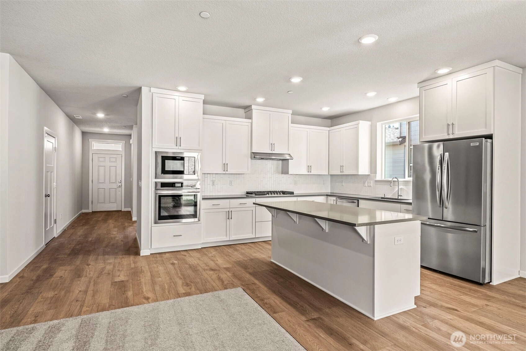 Stunning one-level model home w/spacious 3 bay garage with opener, ample lighting, and room for your toys!Step into the tall foyer graced with/wide hallways that lead to double door bedroom#2, a full bathroom with quartz counters, and bedroom #3 up front with a sunny southern-facing window. Modern quartz kitchen with stainless steel appliances (including the refrigerator), gas cooktop, and built-in convection oven, overlooks spacious Great Room with gas fireplace, custom paint, and wall decor. Just around the corner is the lavish primary suite with a gorgeous bathroom, tiled shower, tiled soaking tub, and walk-in closet with wood shelving. Professionally installed ship lap, brand new washer/dryer. The home has never been lived in.