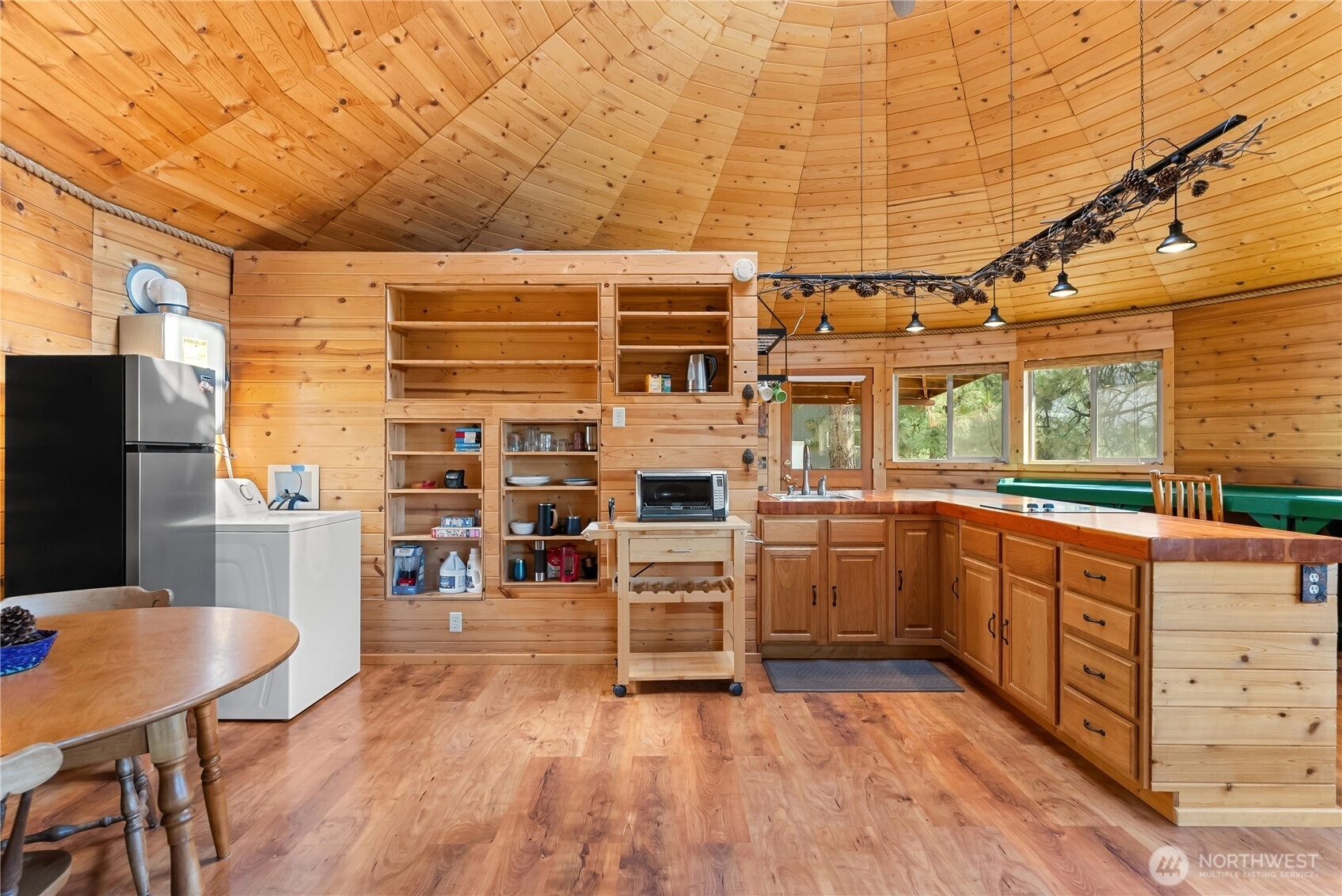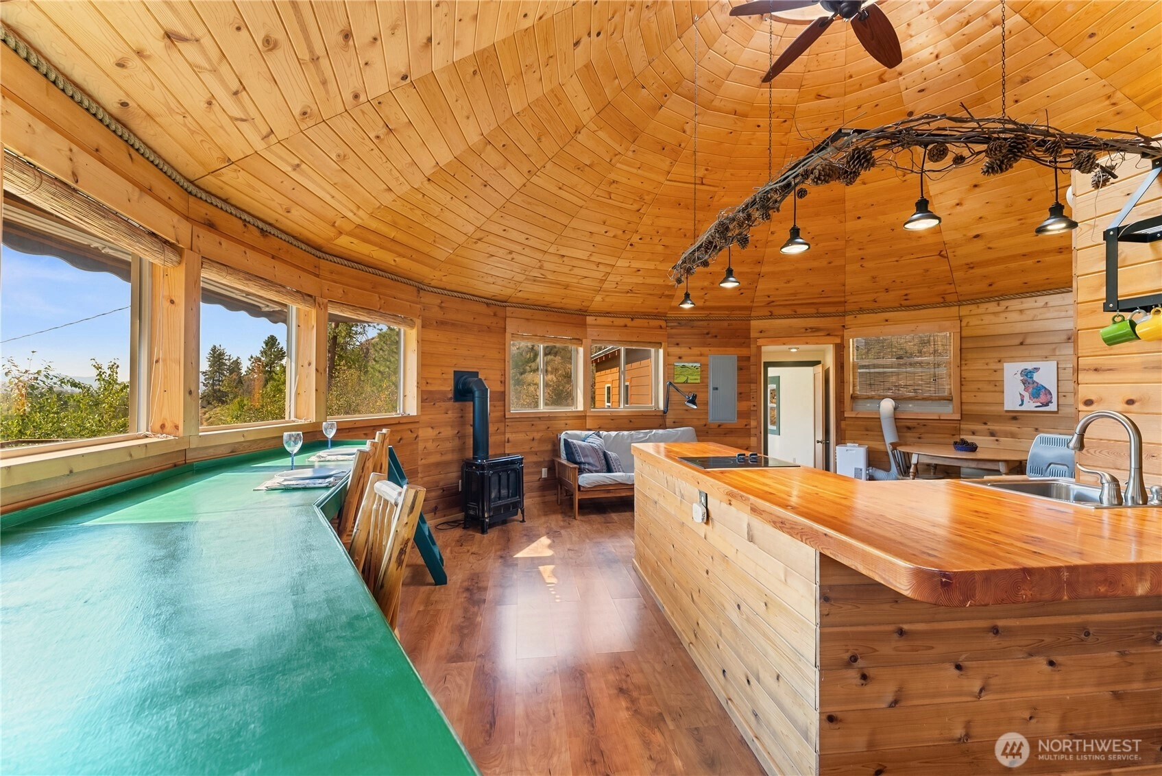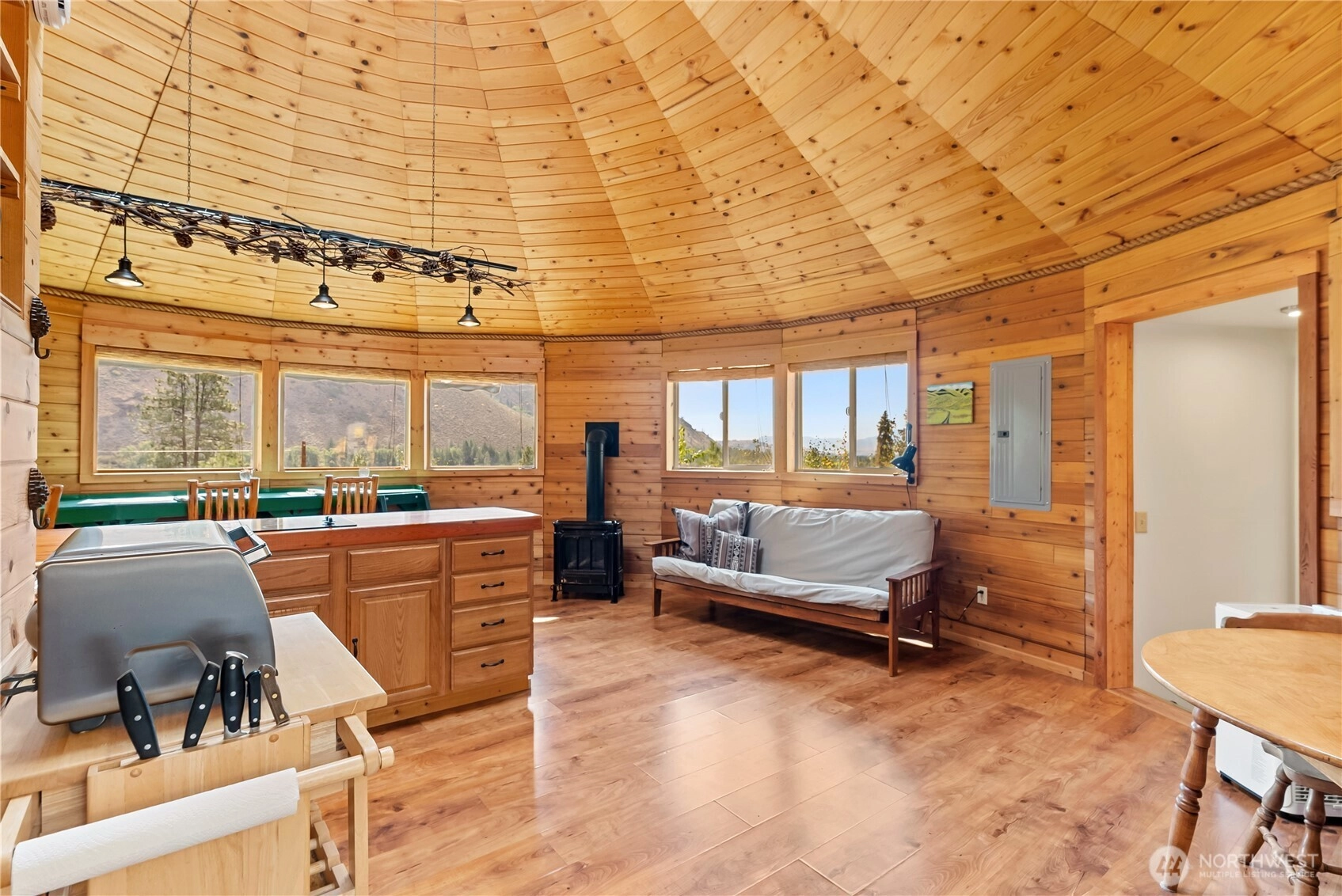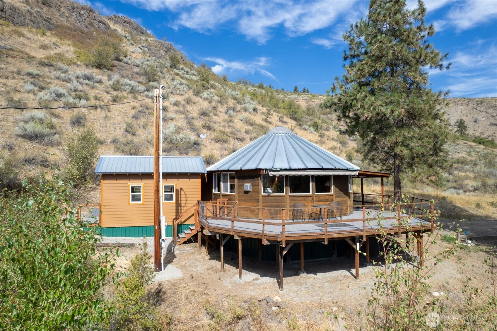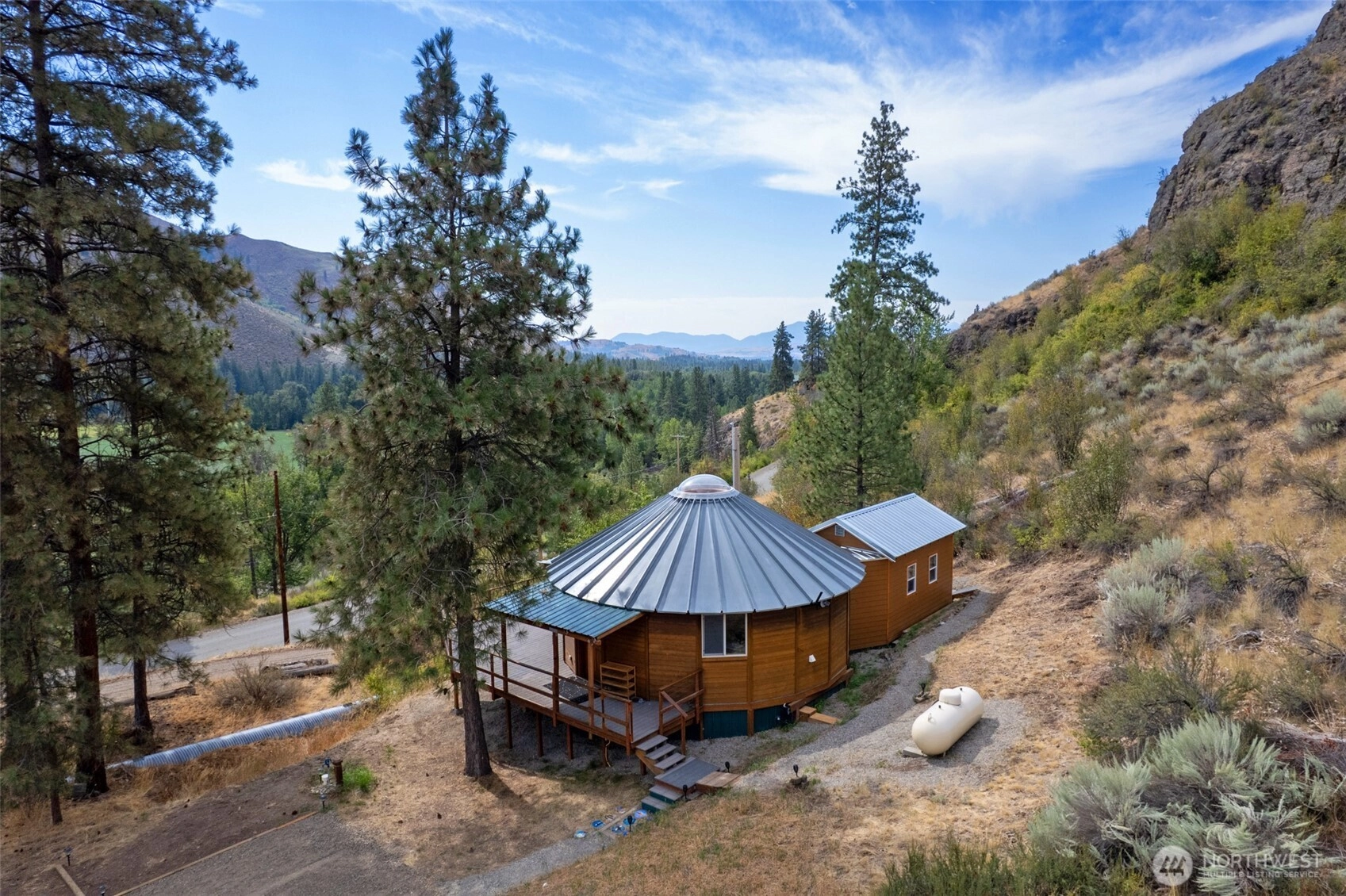Unique 672 sf 1 bed, 1 bath round house with warm wood finishes, cozy propane fireplace, on-demand hot water, and east-facing windows that flood the space with natural light. Enjoy a wraparound deck and sweeping, permanently protected views of the West Chewuch river valley. A 1,350 sf, three-level insulated pole barn offers a concrete floor, RV parking, workshop, and abundant storage. Just 6 miles from Winthrop and Falls Creek Falls in the Okanogan National Forest—ideal for endless recreation or quick trips to town. Your Methow Valley adventure base starts here.