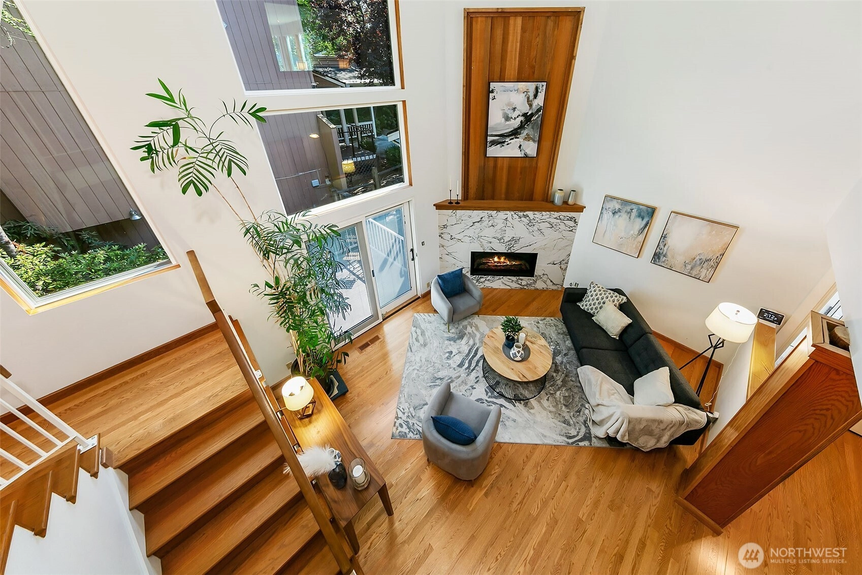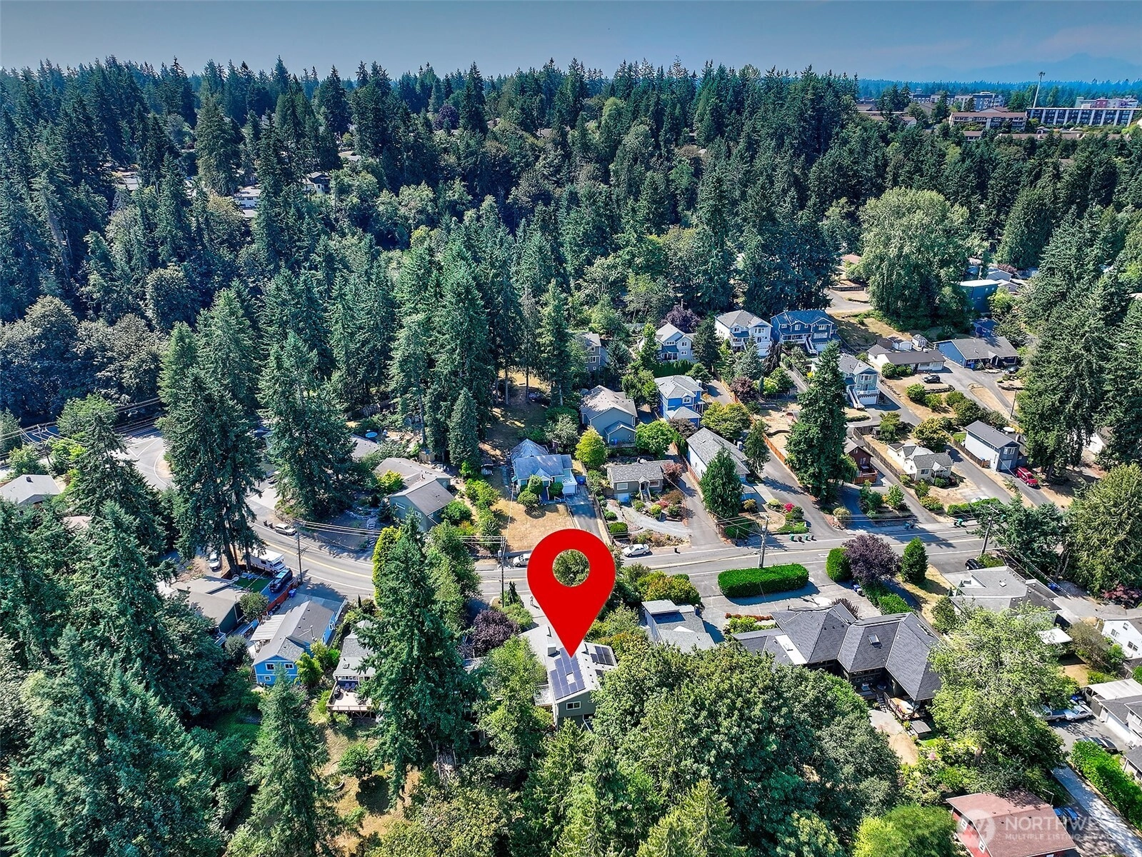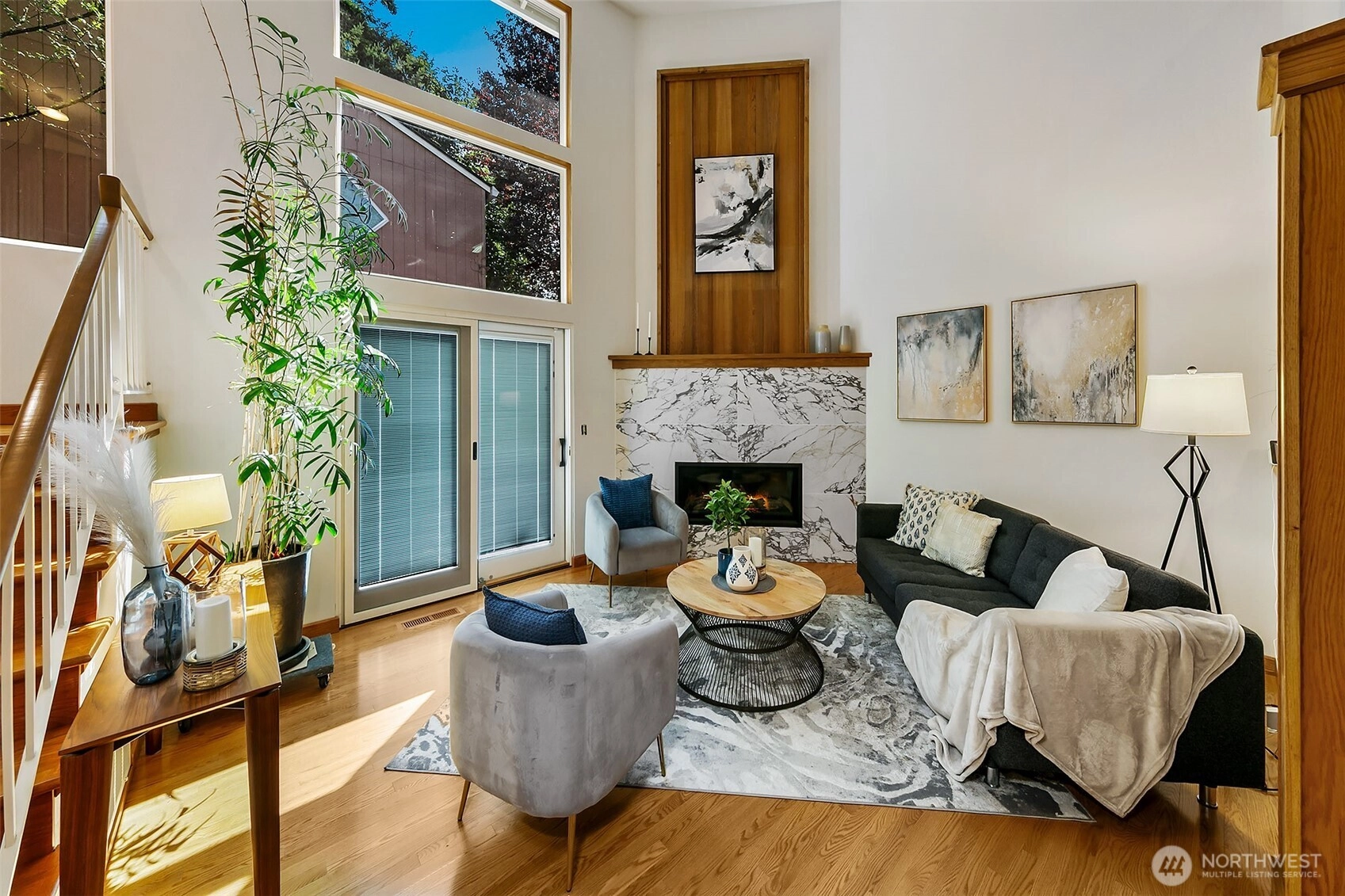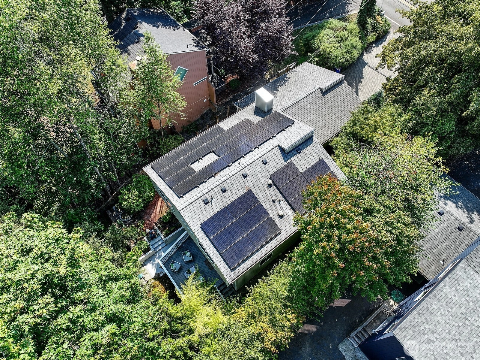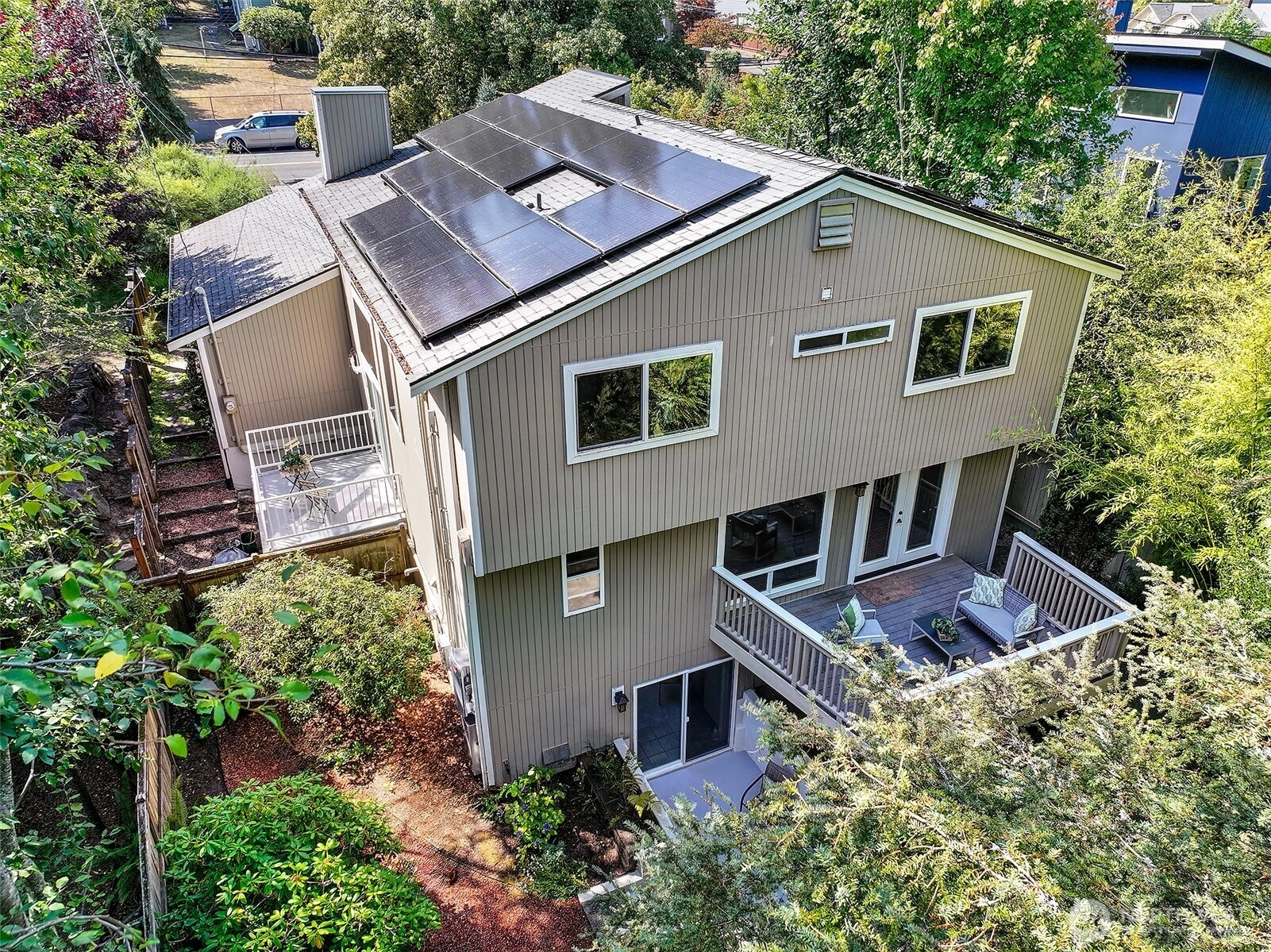 NW Contemporary Stunner is an in-city retreat! Sun drenched living room, cathedral ceilings, lovely gas fireplace, gleaming hardwoods & South facing deck. French doors lead to formal dining room. ½ bath with new vanity. Kitchen with Viking range, eating space adj. to huge deck in private sylvan setting. Upper: 3 spacious bedrooms, including Primary Suite with walk-in closet & custom tile shower. 2nd bath with jetted tub & both baths have heated floors & towel rack! Lower: new carpet, home office, tons of storage & lovely media room. Gas furnace, 2 car garage & solar panels. One-of-a-kind setting feels like country but is just minutes to North City, LFP shops & restaurants,185th Light Rail & easy commute Downtown. Excellent Shoreline Schools