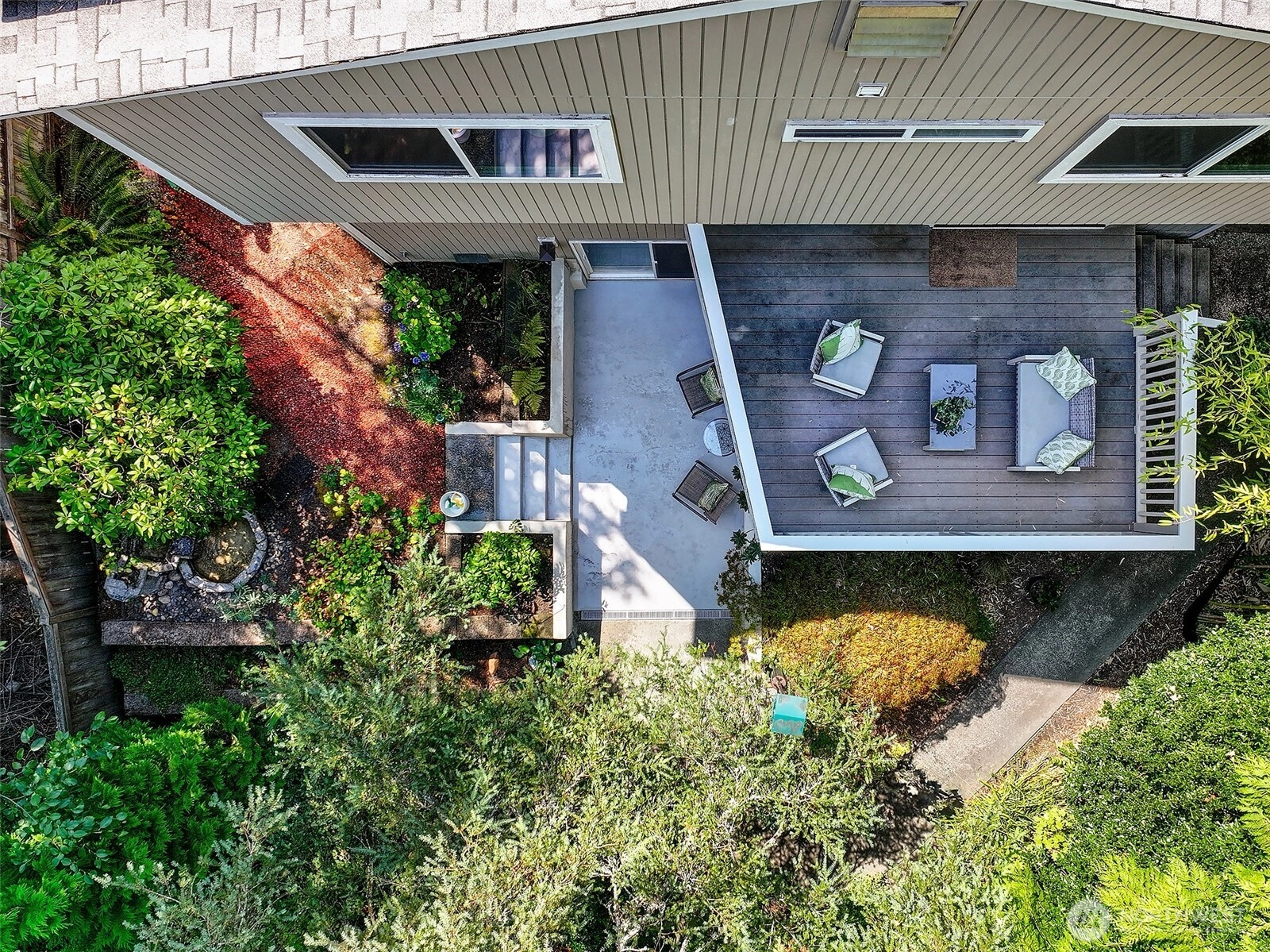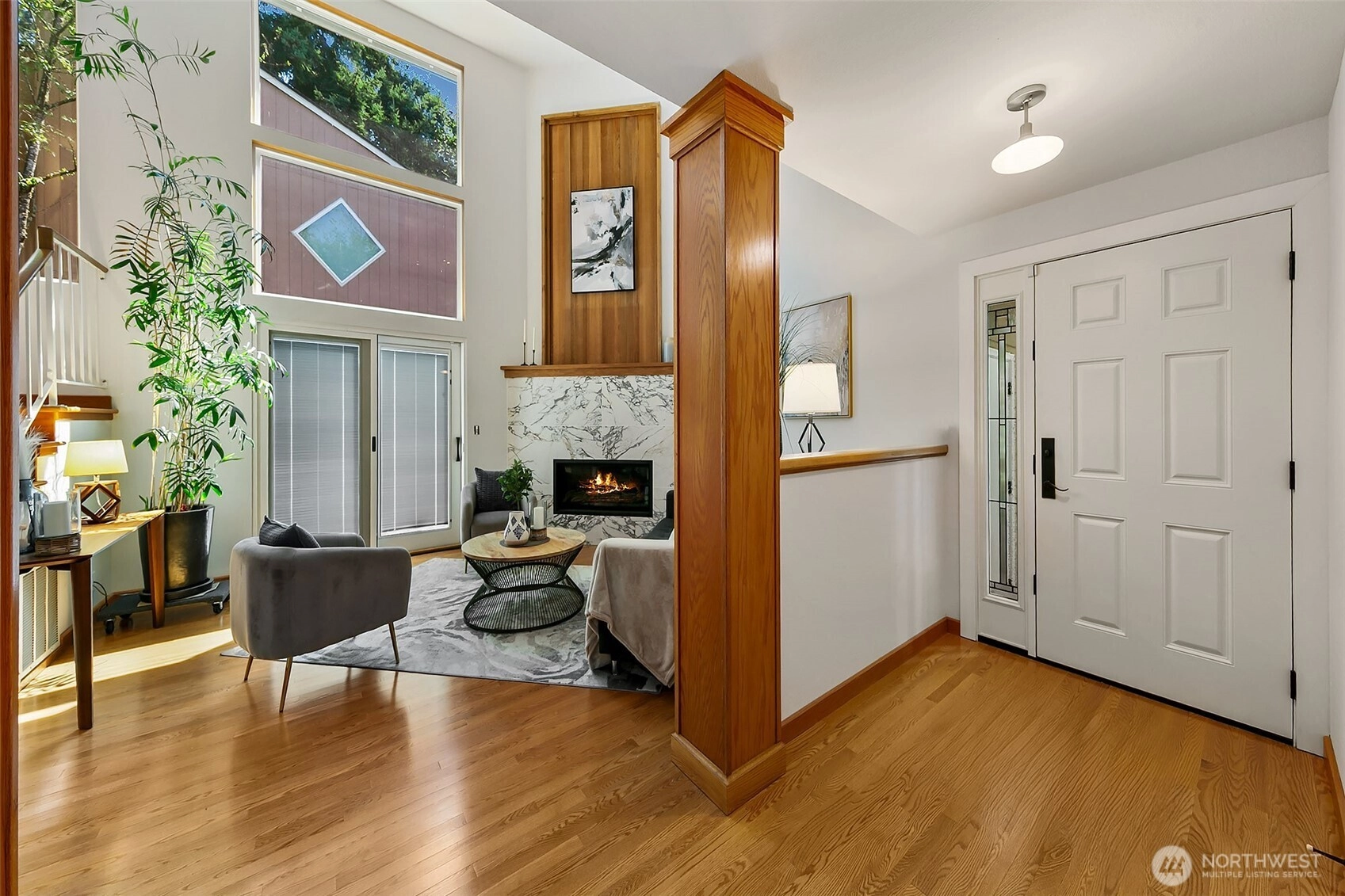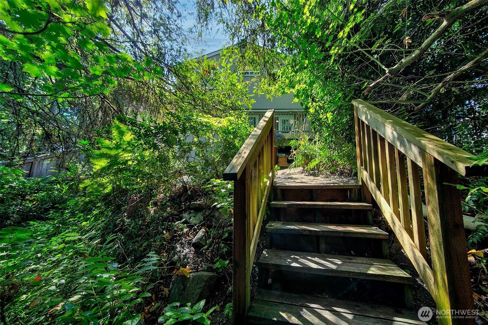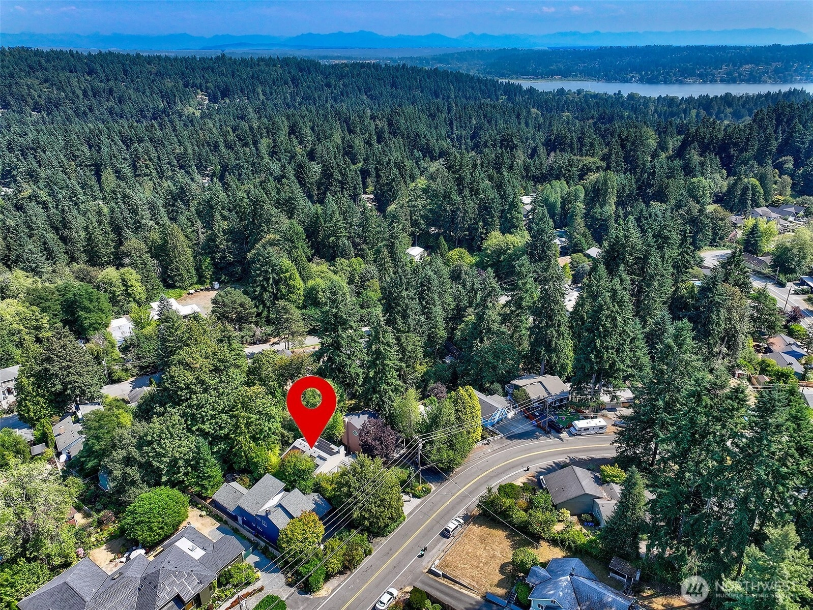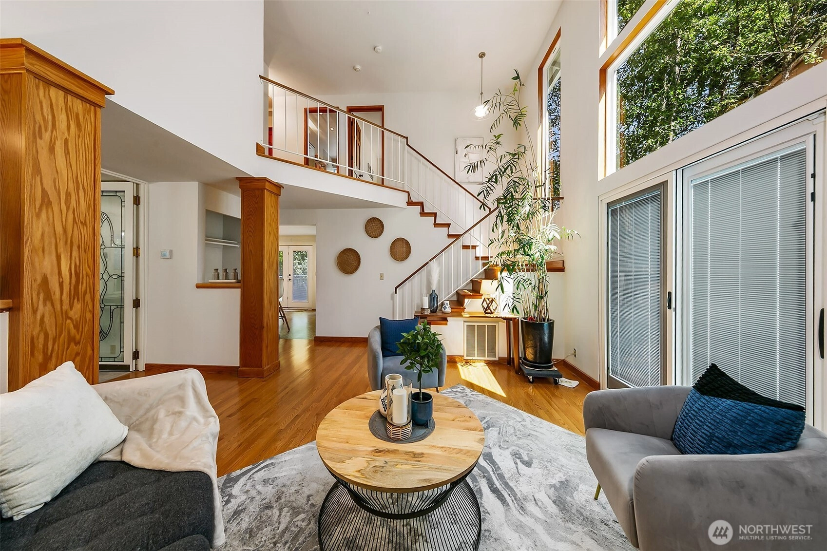 NW Contemporary Stunner is an in-city retreat! Sun drenched living room, cathedral ceilings, lovely gas fireplace, gleaming hardwoods & South facing deck. French doors lead to formal dining room. ½ bath with new vanity. Kitchen with Viking range, eating space adj. to huge deck in private sylvan setting. Upper: 3 spacious bedrooms, including Primary Suite with walk-in closet & custom tile shower. 2nd bath with jetted tub & both baths have heated floors & towel rack! Lower: new carpet, home office, tons of storage & lovely media room. Gas furnace, 2 car garage & solar panels. One-of-a-kind setting feels like country but is just minutes to North City, LFP shops & restaurants,185th Light Rail & easy commute Downtown. Excellent Shoreline Schools