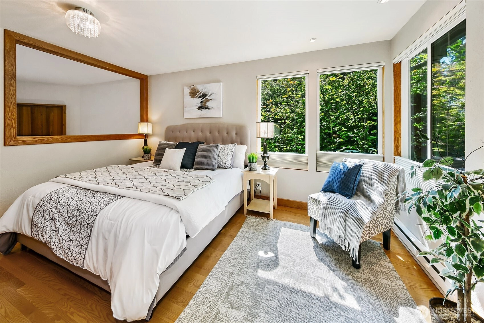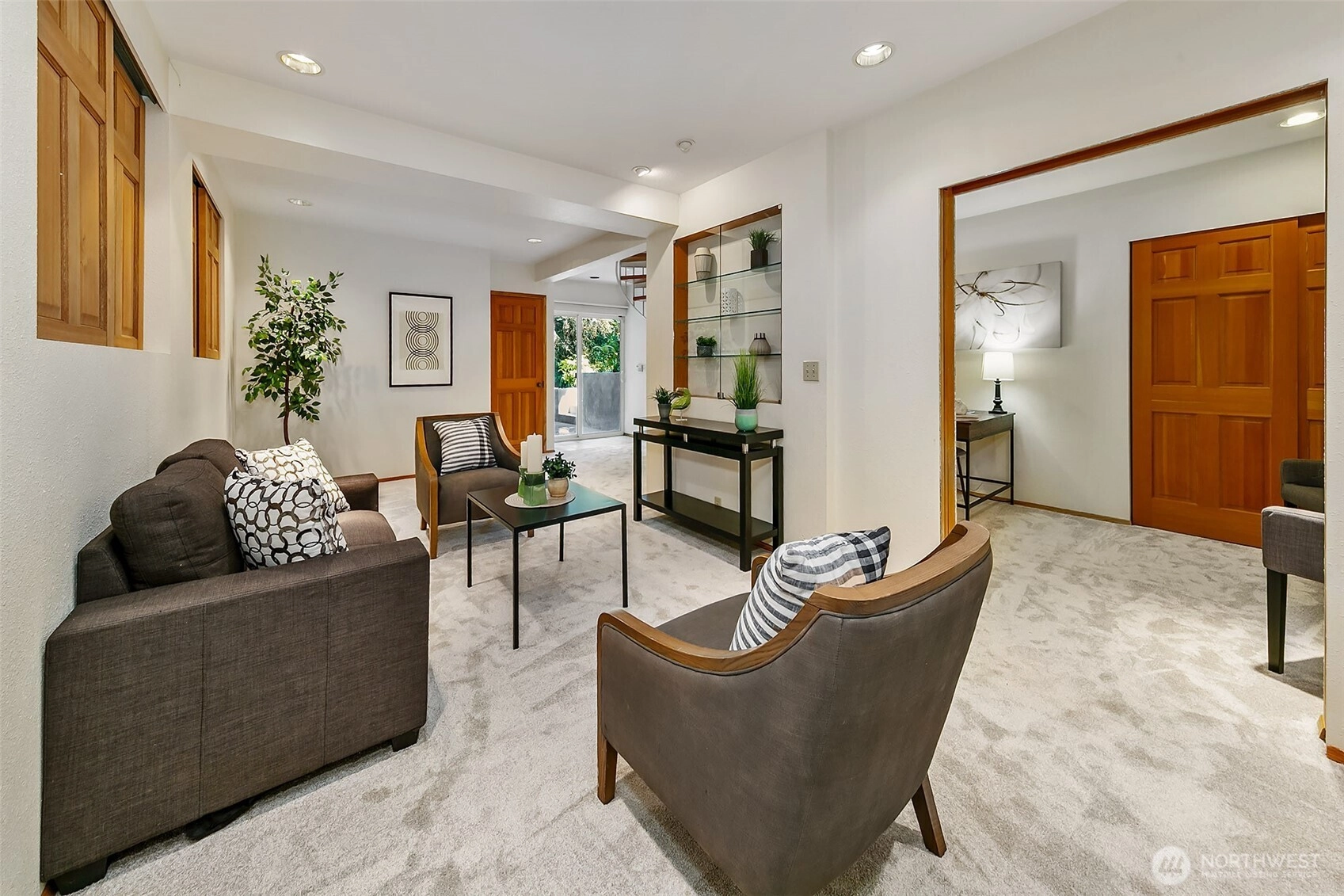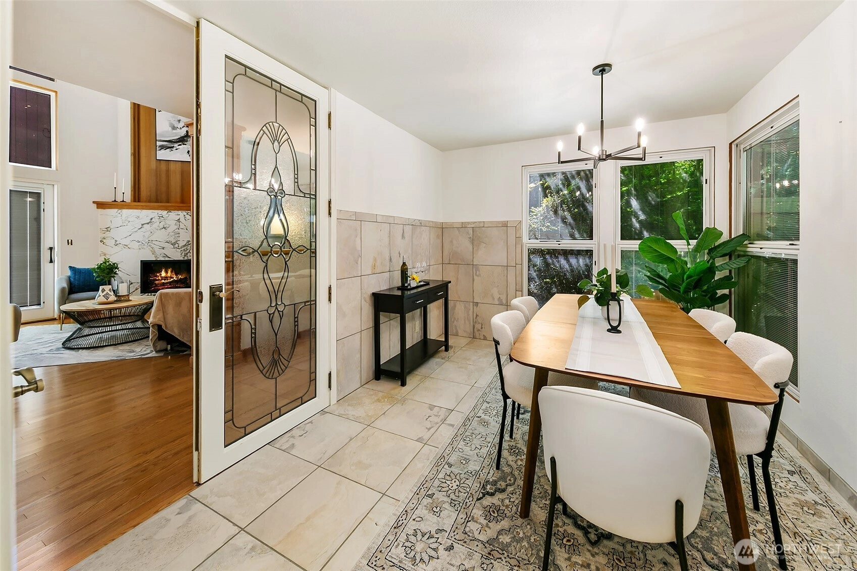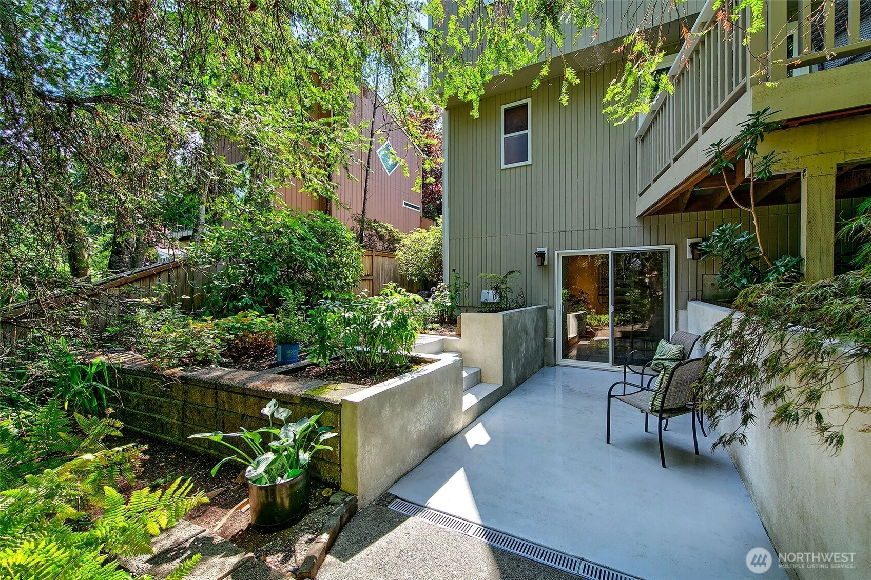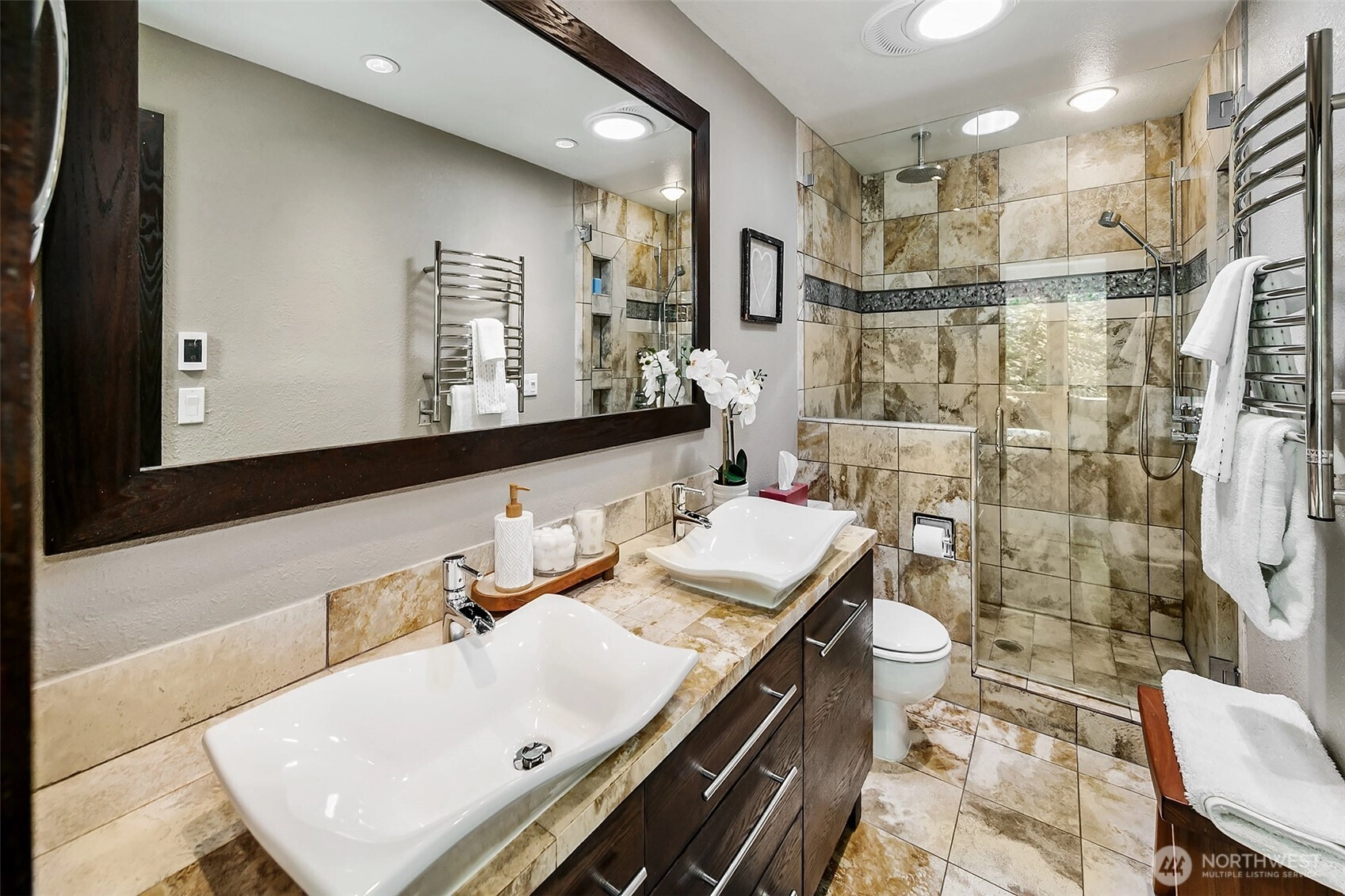 NW Contemporary Stunner is an in-city retreat! Sun drenched living room, cathedral ceilings, lovely gas fireplace, gleaming hardwoods & South facing deck. French doors lead to formal dining room. ½ bath with new vanity. Kitchen with Viking range, eating space adj. to huge deck in private sylvan setting. Upper: 3 spacious bedrooms, including Primary Suite with walk-in closet & custom tile shower. 2nd bath with jetted tub & both baths have heated floors & towel rack! Lower: new carpet, home office, tons of storage & lovely media room. Gas furnace, 2 car garage & solar panels. One-of-a-kind setting feels like country but is just minutes to North City, LFP shops & restaurants,185th Light Rail & easy commute Downtown. Excellent Shoreline Schools