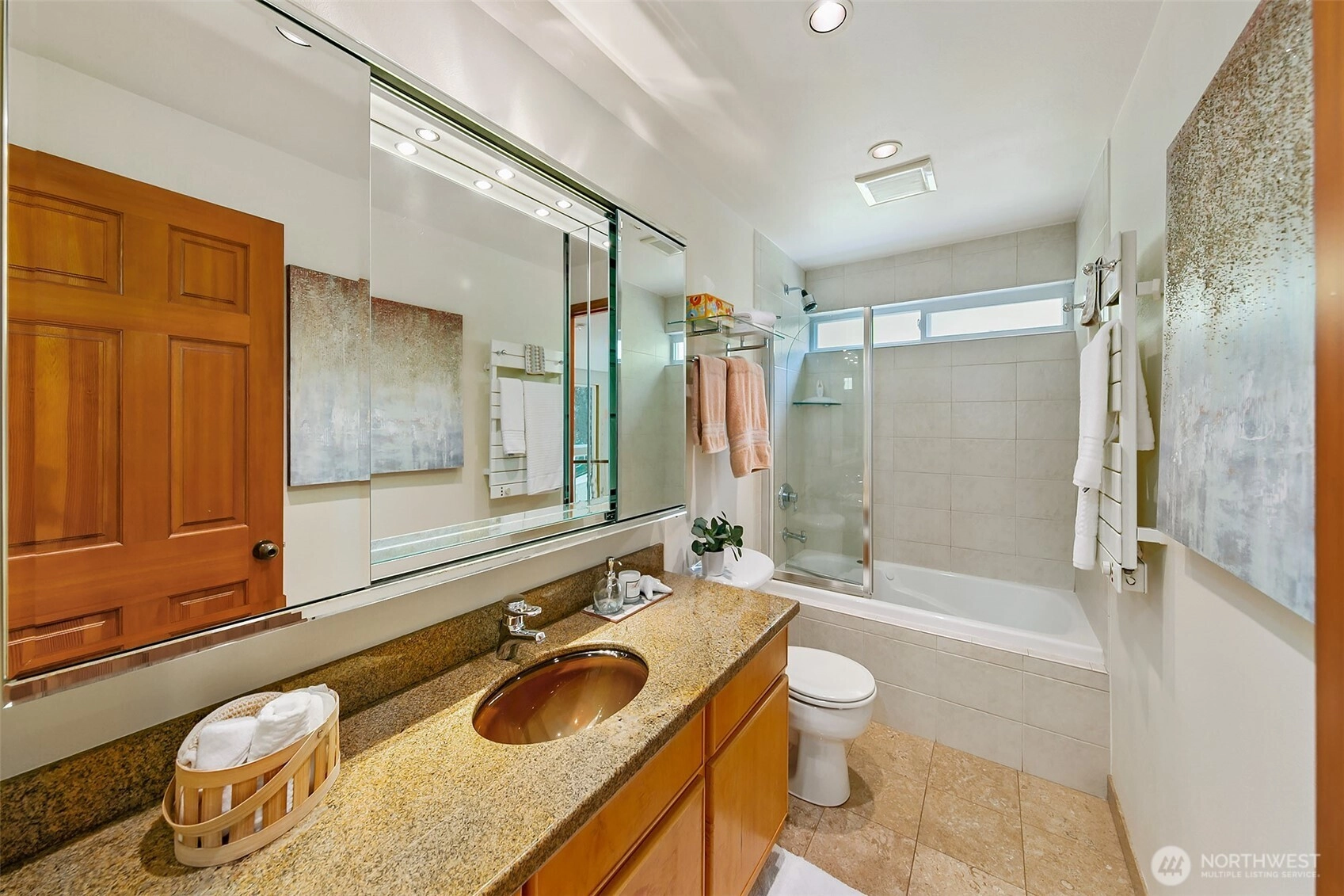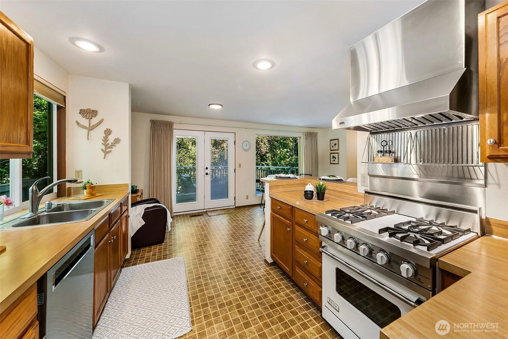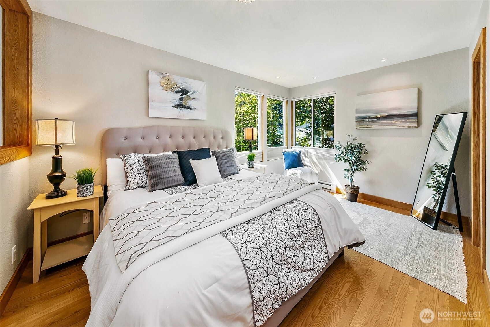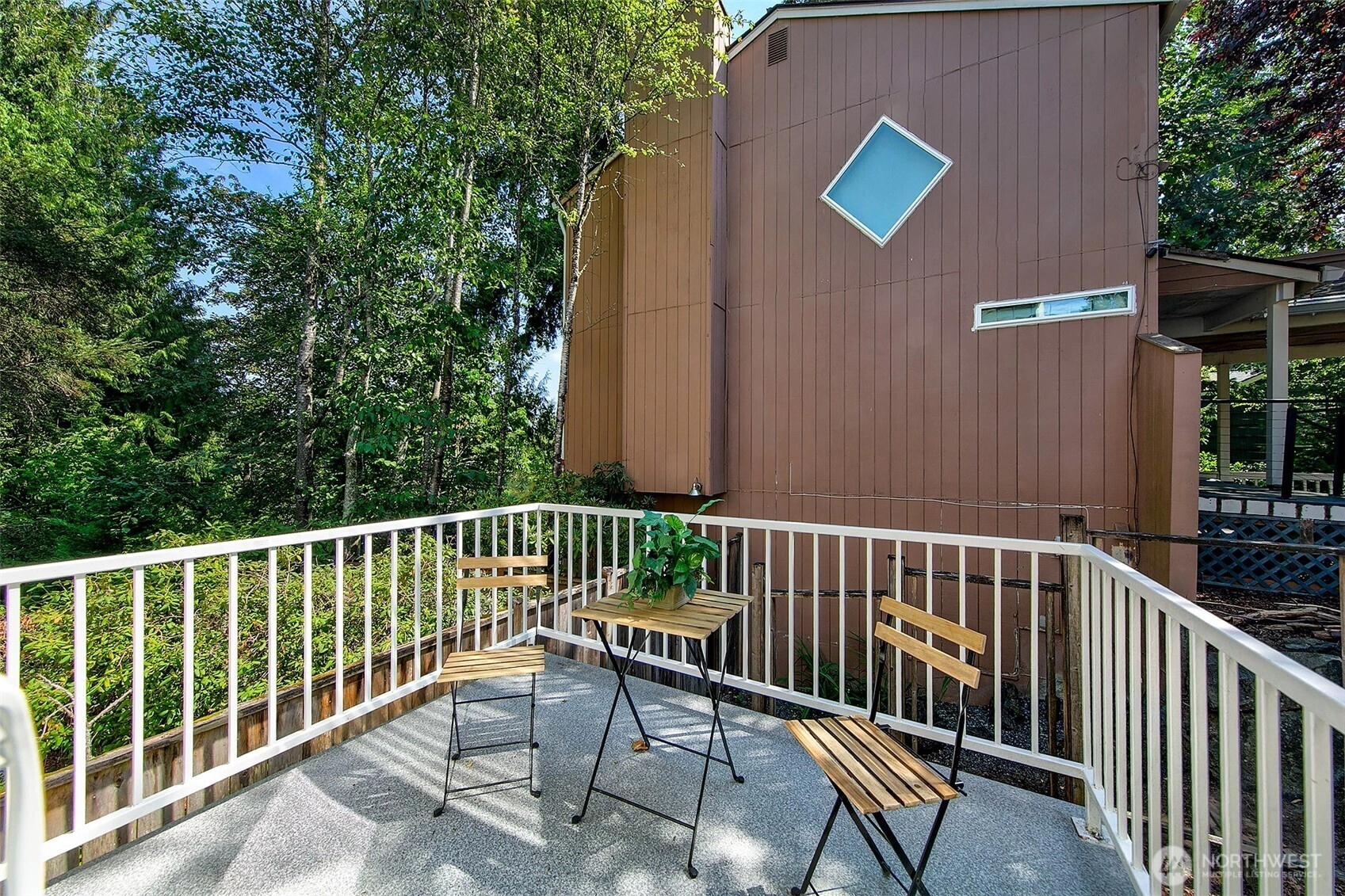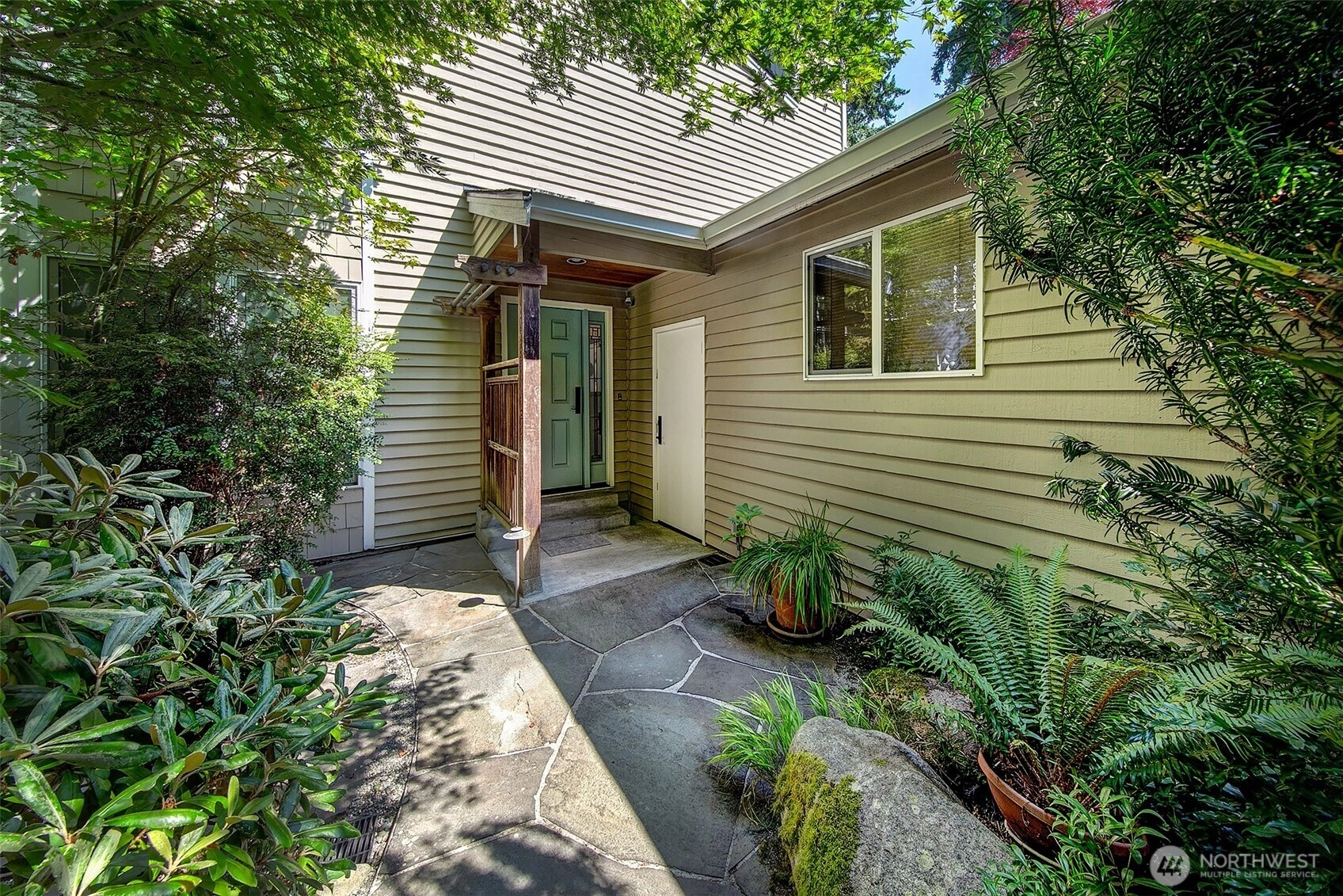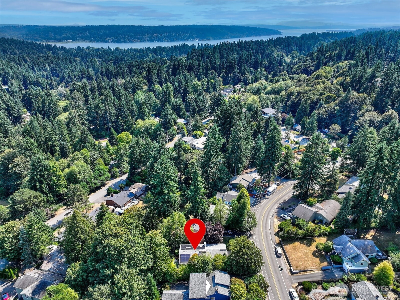 NW Contemporary Stunner is an in-city retreat! Sun drenched living room, cathedral ceilings, lovely gas fireplace, gleaming hardwoods & South facing deck. French doors lead to formal dining room. ½ bath with new vanity. Kitchen with Viking range, eating space adj. to huge deck in private sylvan setting. Upper: 3 spacious bedrooms, including Primary Suite with walk-in closet & custom tile shower. 2nd bath with jetted tub & both baths have heated floors & towel rack! Lower: new carpet, home office, tons of storage & lovely media room. Gas furnace, 2 car garage & solar panels. One-of-a-kind setting feels like country but is just minutes to North City, LFP shops & restaurants,185th Light Rail & easy commute Downtown. Excellent Shoreline Schools