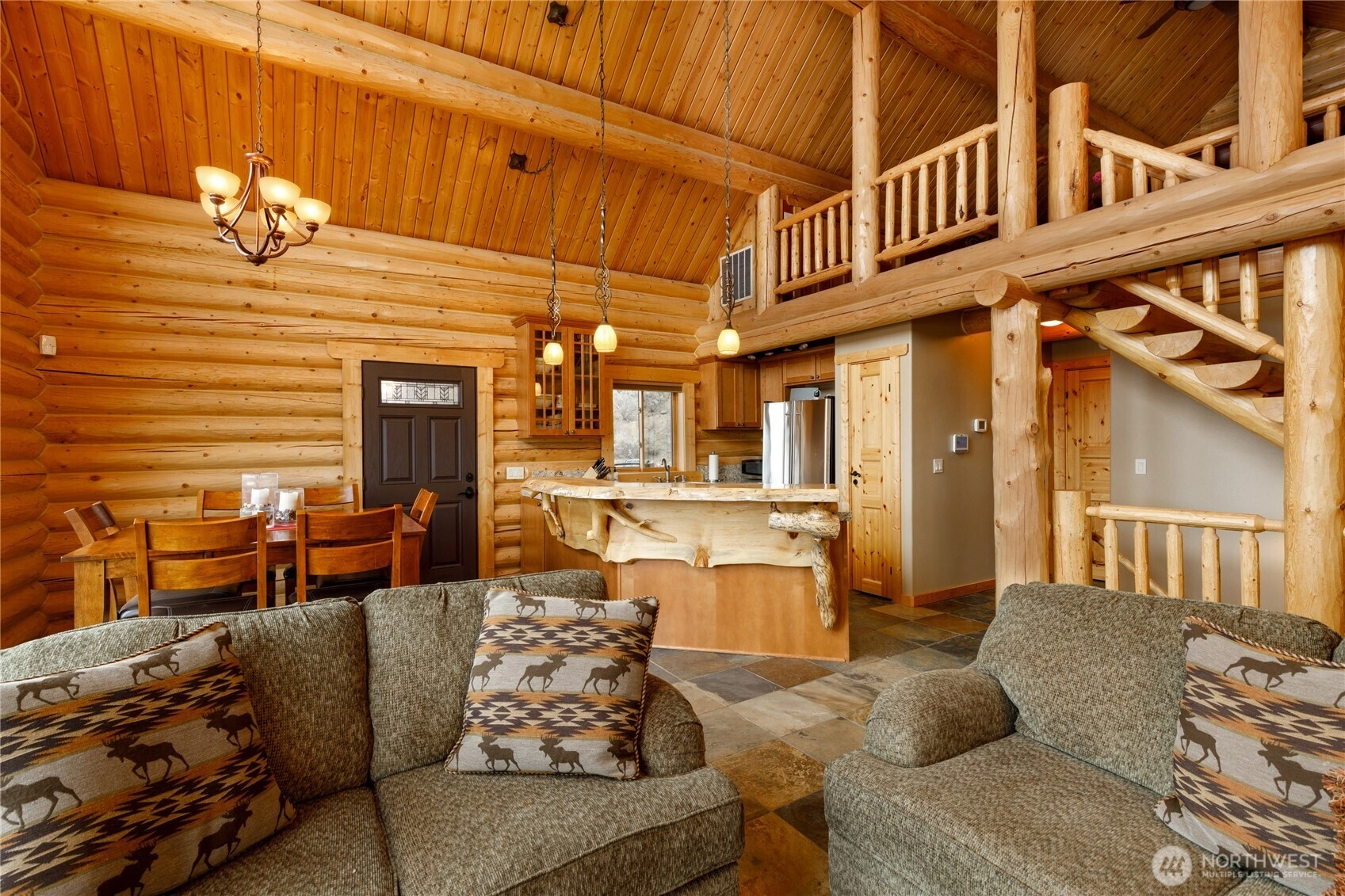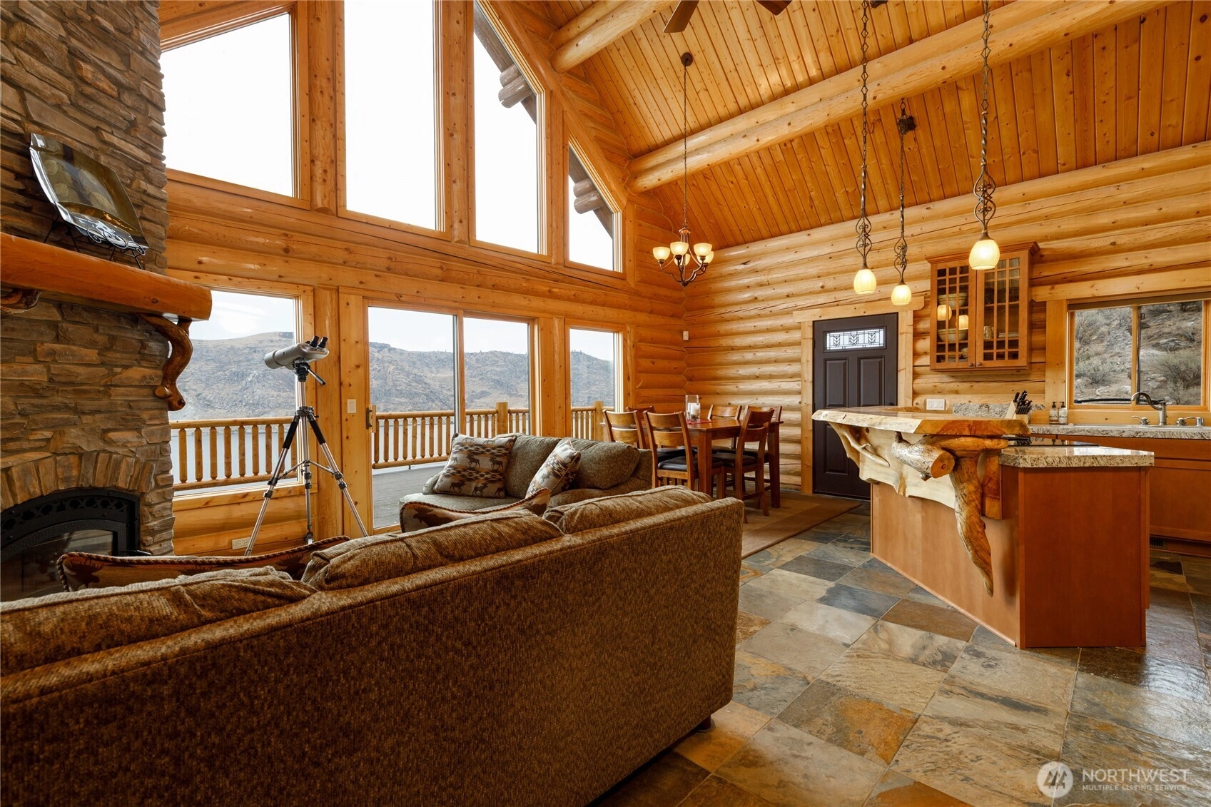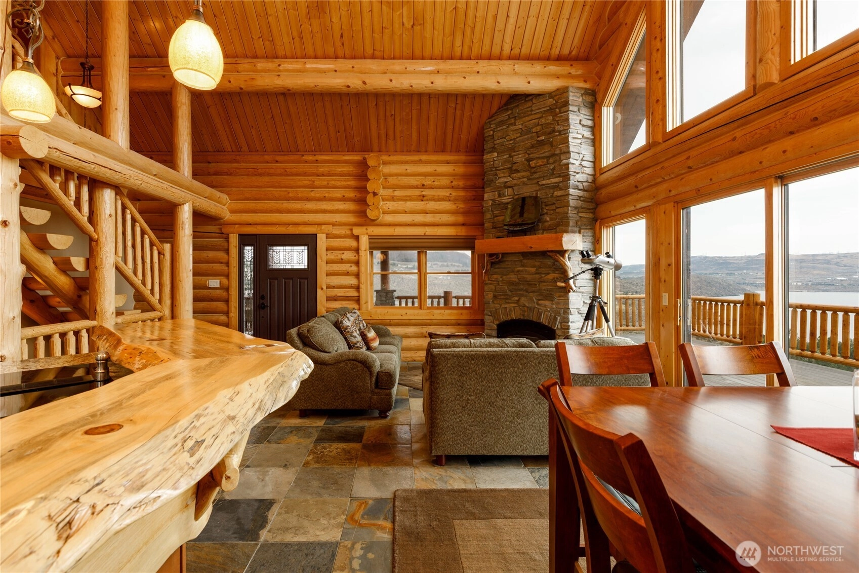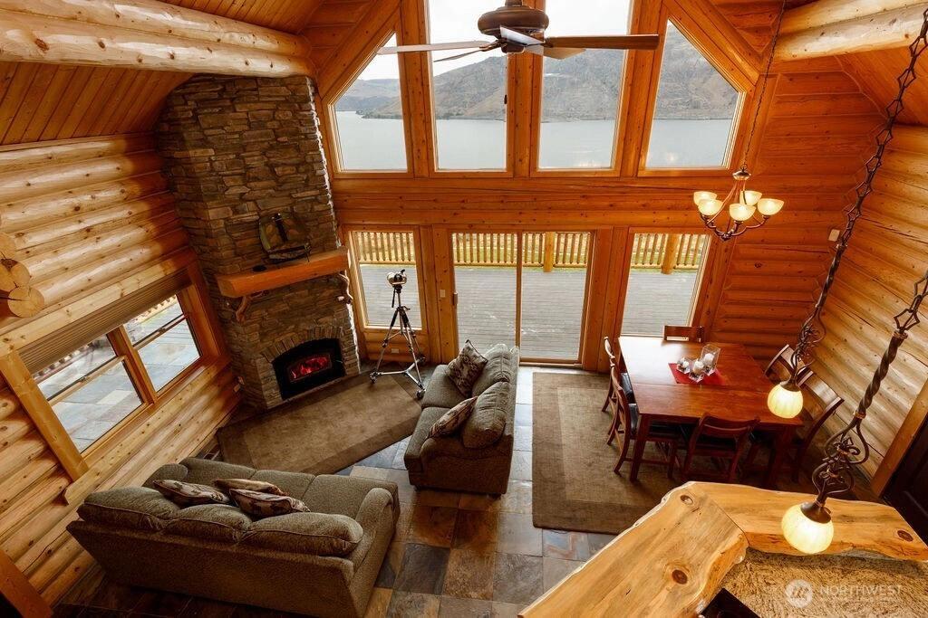 Breathtaking lodge style log home with sweeping Lake Roosevelt views! Built in 2009 from lodgepole pine and Engelmann spruce, this 3 bed, 2.5 bath in the main house and 2 bed 1 bath in the detached ADU - main house features 21’ vaulted ceilings, an open kitchen, main floor master, loft bedroom, and a daylight basement with another livingroom and wet bar. The 2011 detached shop includes the 2 bed, 1 bath ADU with its own HVAC perfect for guests, rentals or multi gen living. Whether full time, vacation, or investment, this property combines rustic beauty with modern comfort.