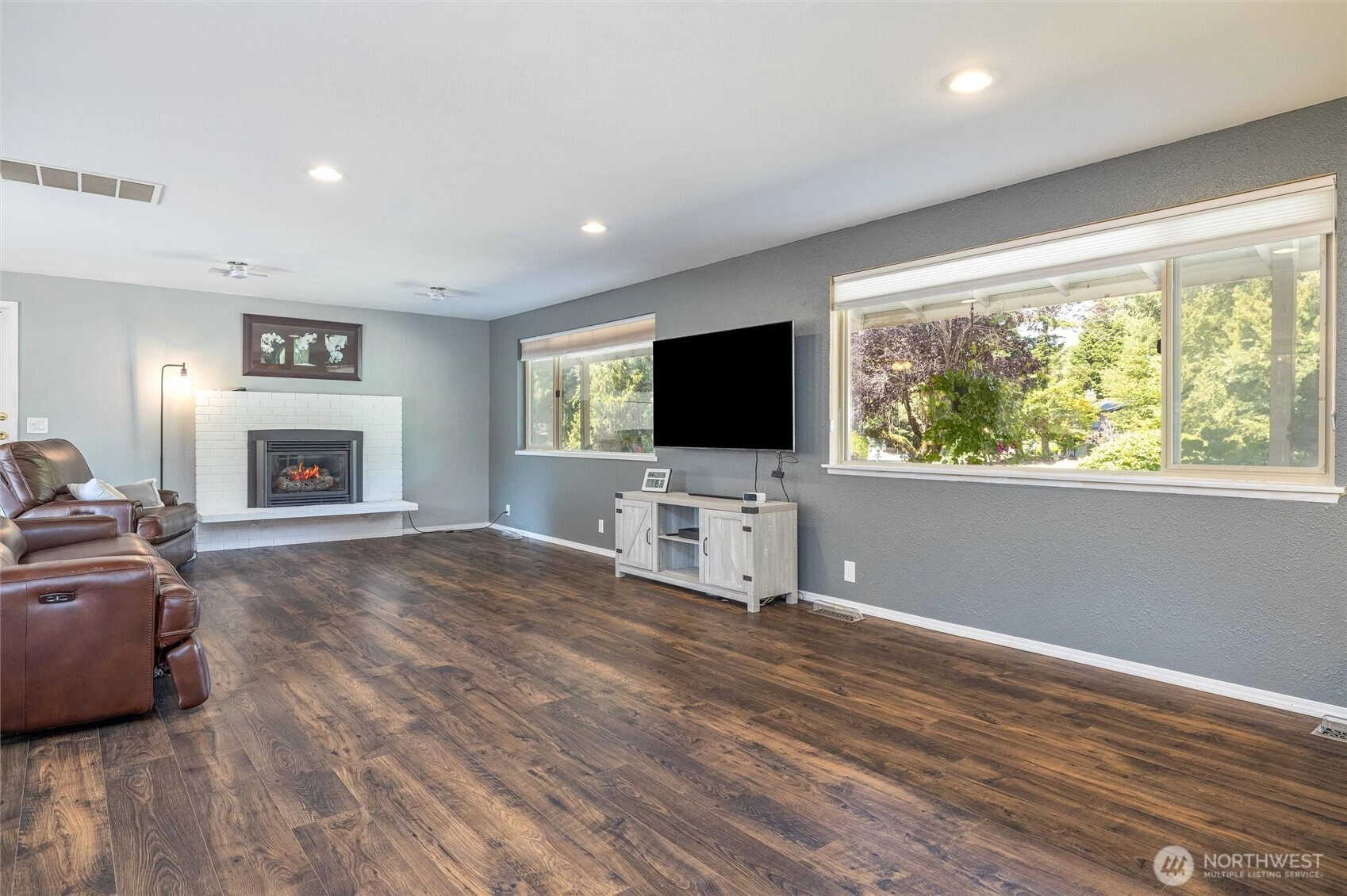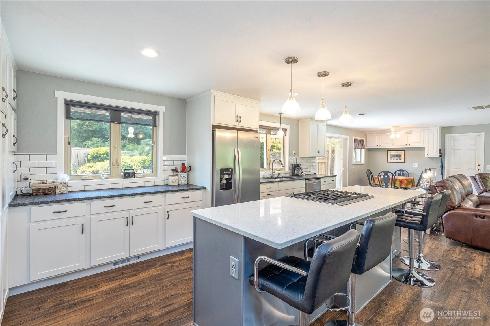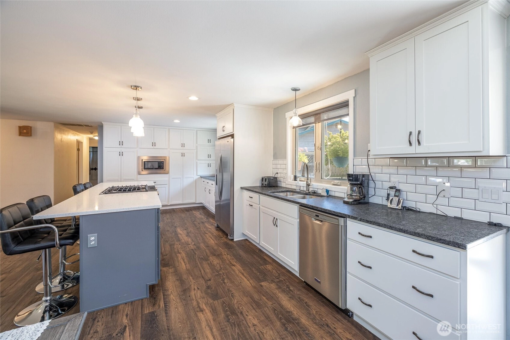 Wonderful home in a quiet, established neighborhood. This newly remodeled 3-bed,1.75-bath home has a flowing open floor plan. The kitchen has been fully updated w/ quartz counters, new SS appliances, plenty of cabinet storage w/ soft close doors. Eating space off the kitchen's large breakfast bar & spacious family room making this home perfect for entertaining. The primary bathroom has been fully remodeled with a large shower & vanities. Fully sheet-rocked garage with W/D hookups. Gas Heat Pump furnace & A/C. Extra space for 2nd Car Garage/Shop if needed. Located on a fenced, well-kept, 15,246 sf lot and a dead end street and cul-de-sac. Fruit trees too. Close to schools, parks, shopping, restaurants & less than 15 min to Bellingham.