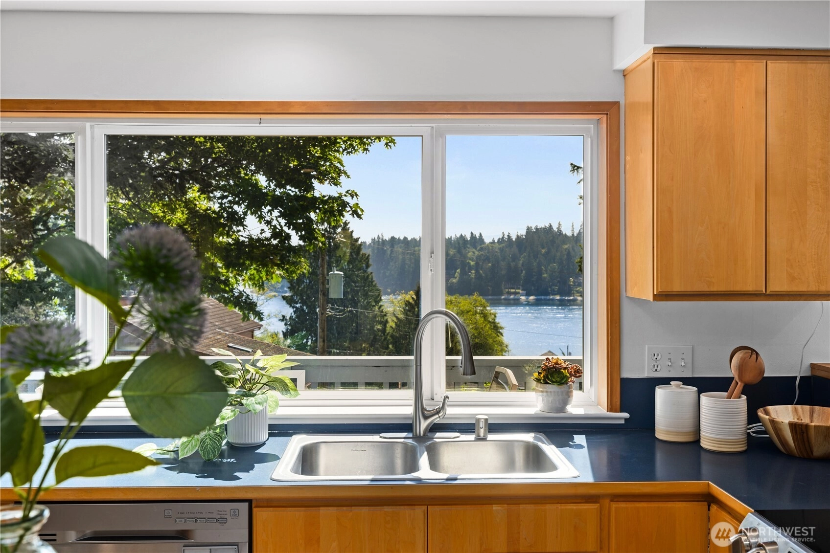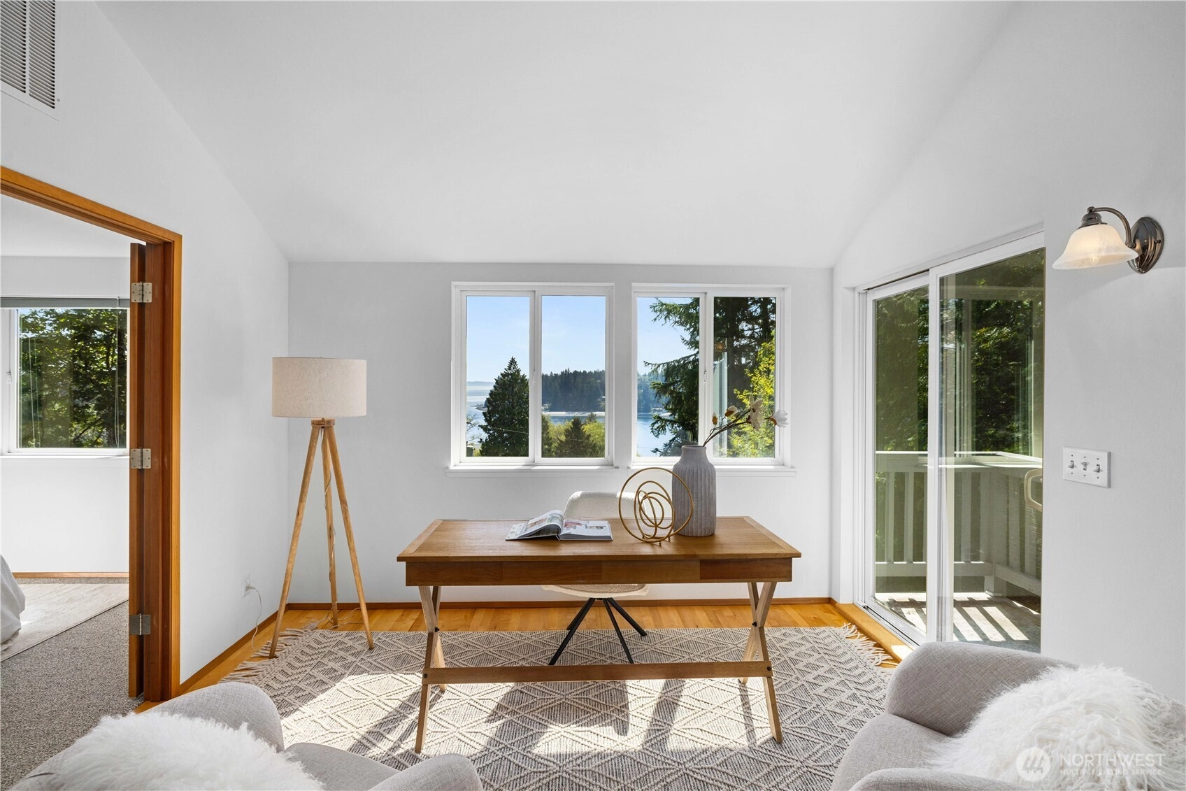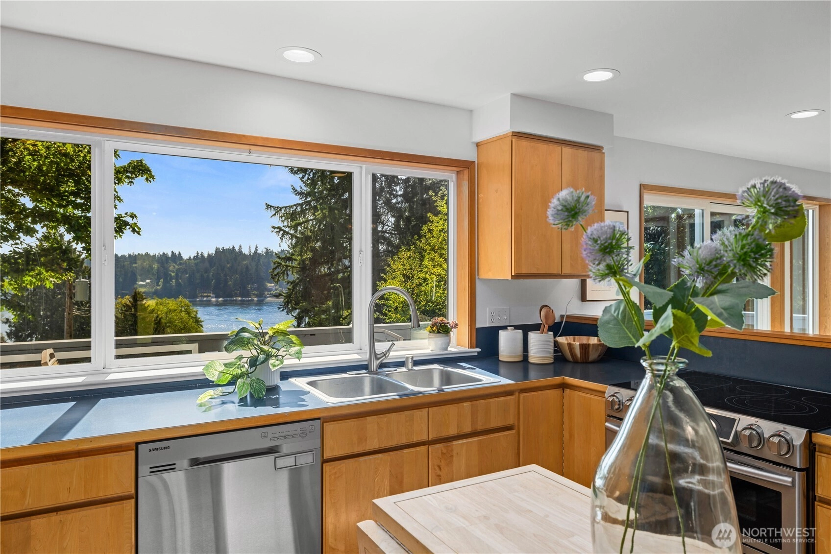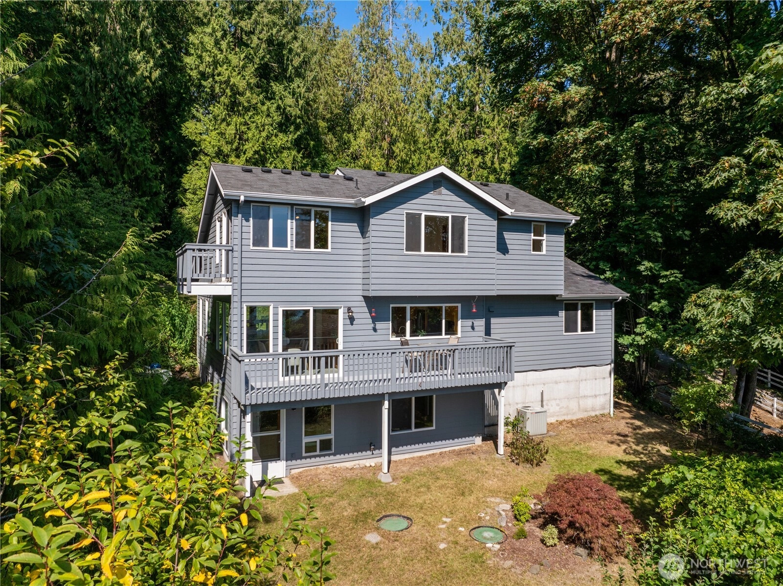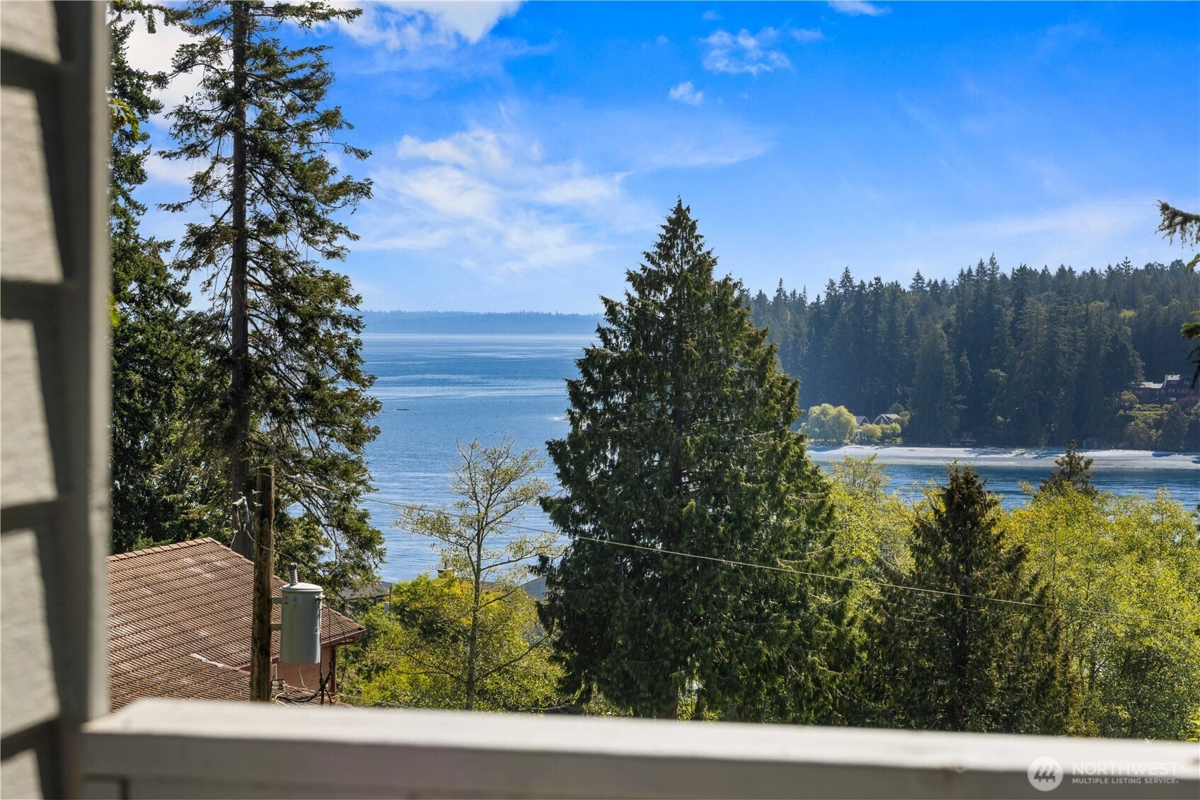 Soak in breathtaking views of Agate Pass, Puget Sound & mountains from nearly every room of this beautifully maintained home. Features & updates include vaulted ceilings, custom double-sided gas fireplace, hardwoods, new interior/exterior paint and new carpet. The kitchen & dining room w/ custom built cabinetry flow to deck overlooking garden & spectacular Sound view. The spacious, light & bright loft w/views and private deck leads to primary suite & ensuite bath & 2nd bedrm. Lower level w/ kitchenette, bedrm & separate entrance ideal as a guest suite. Property includes adjacent .08 acre parcel w/ trail to Division Ave. A short stroll leads to the community beach & sport court. This is Pacific Northwest living at it's finest - welcome home!
